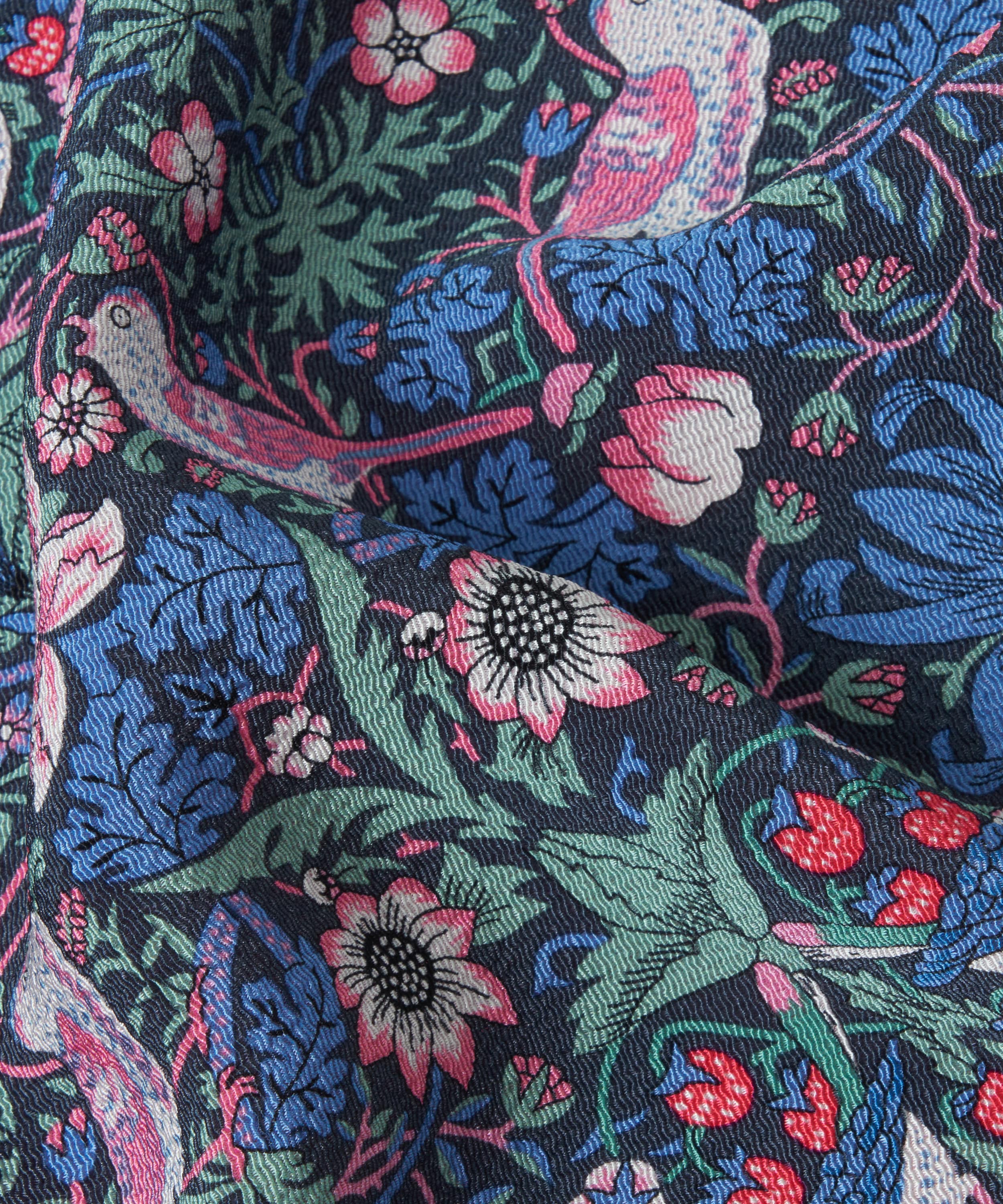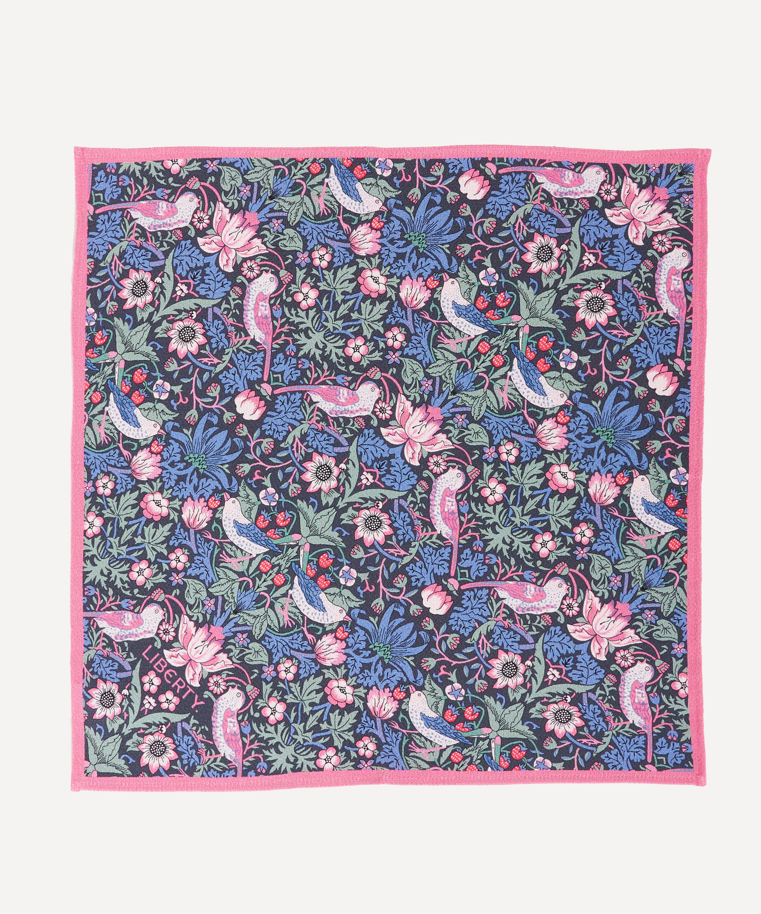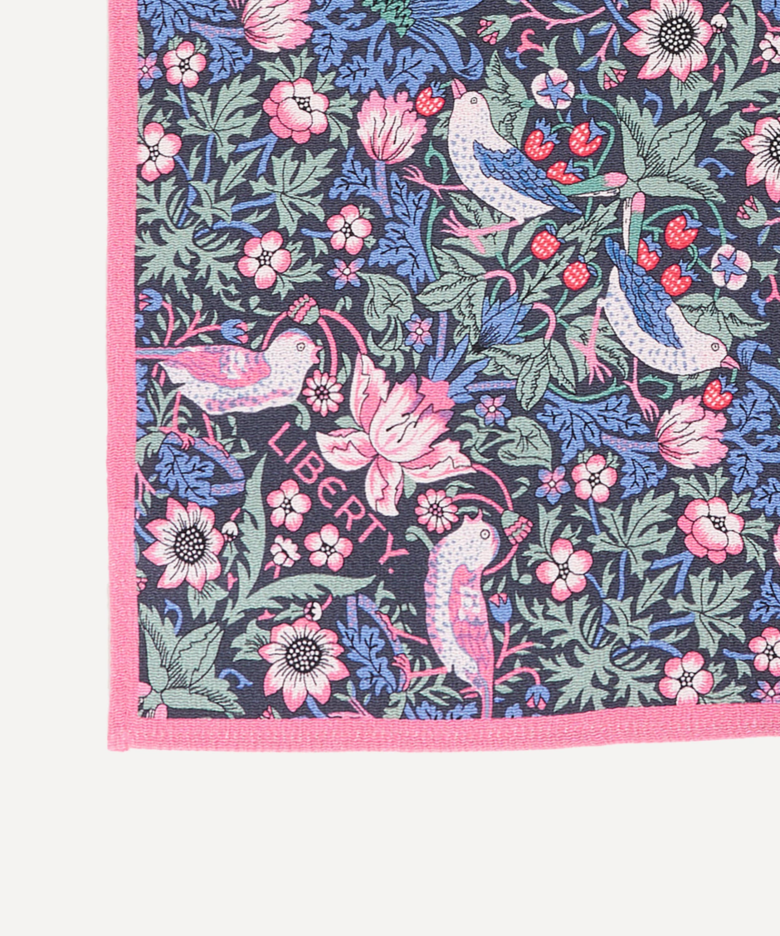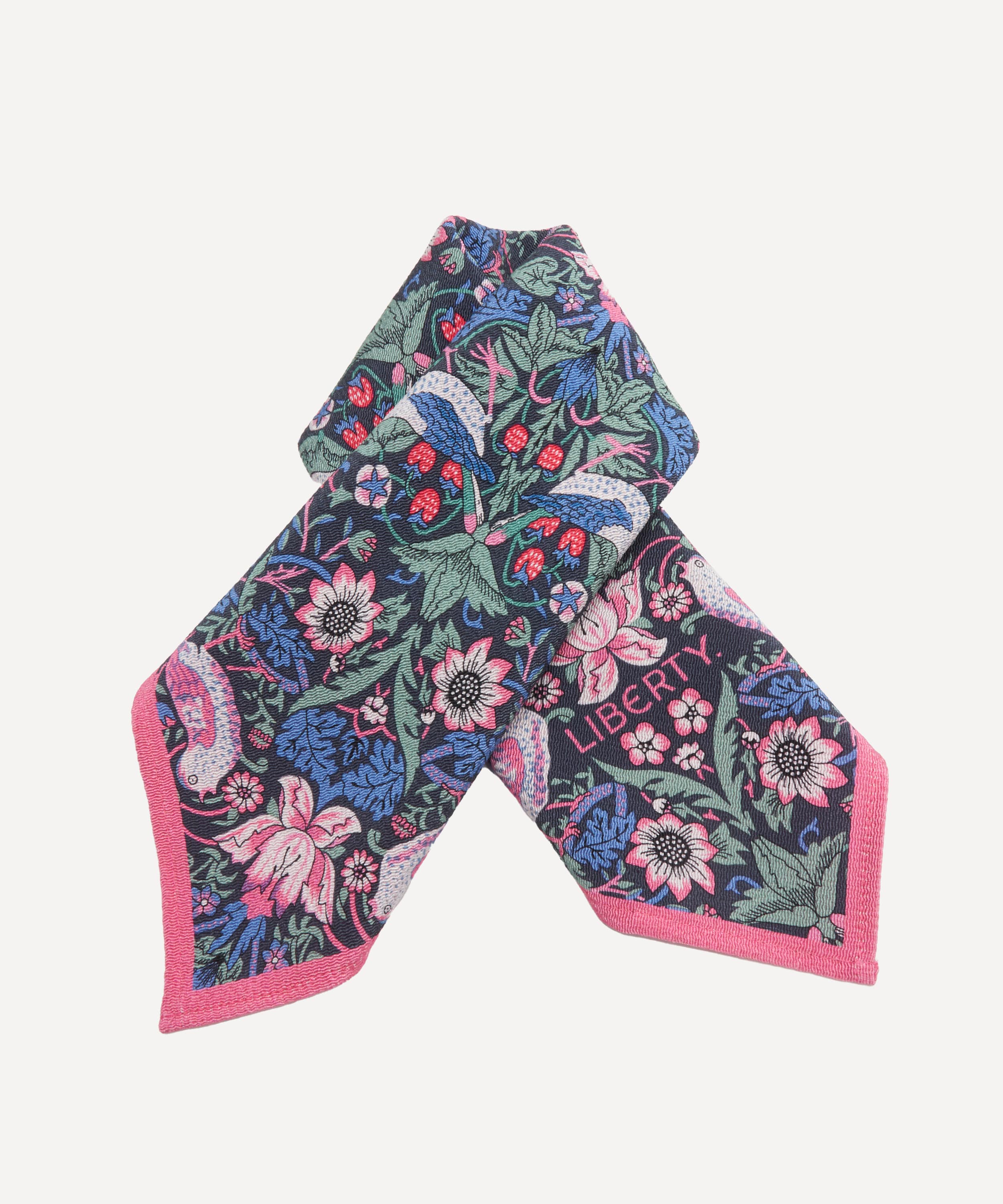 デザインは、長年リバティプリントとしても愛されている「ストロベリー・シーフ」と、2025年の新作「フローラル・ミューズ」の2柄。シルクスカーフにも用いられるデジタルメソッドによる両面プリントで、美しい柄を余すことなく楽しめます。