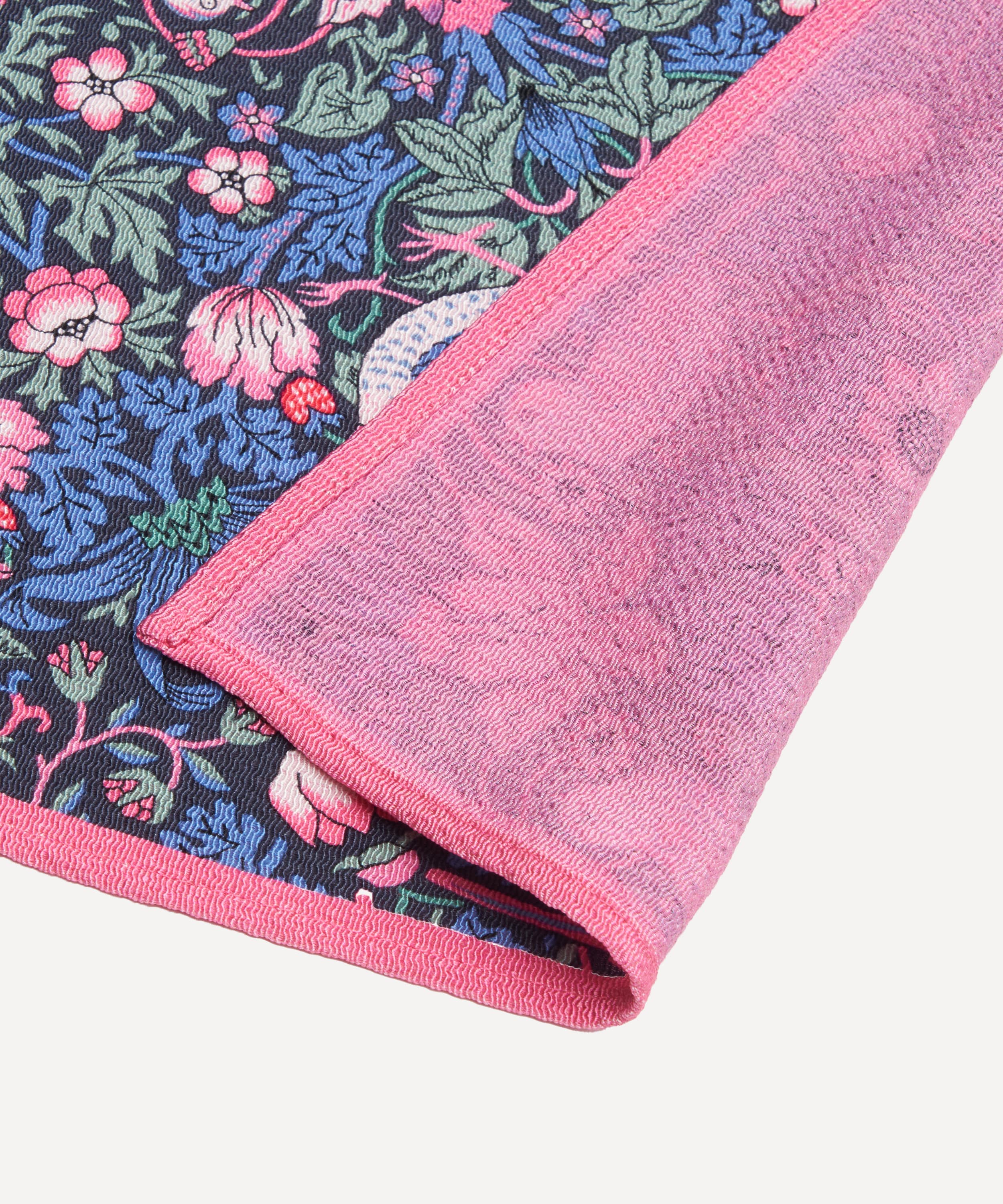 きっかけは、大阪・関西万博に向けたプロジェクト。リバティのチームが丸仙の工房を訪れ、丹後ちりめんの美しさに魅了されたことから、このコラボレーションが実現しました。使用しているのは、リバティにとっても象徴的な素材であるシルク。強い撚りから生まれる丹後ちりめん特有の“しぼ”が、ふっくらとした質感と奥行きのある発色を生み出し、リバティプリントの繊細な色柄をより一層引き立てます。深みのある色合いと上質な光沢は、まさに特別な一枚。