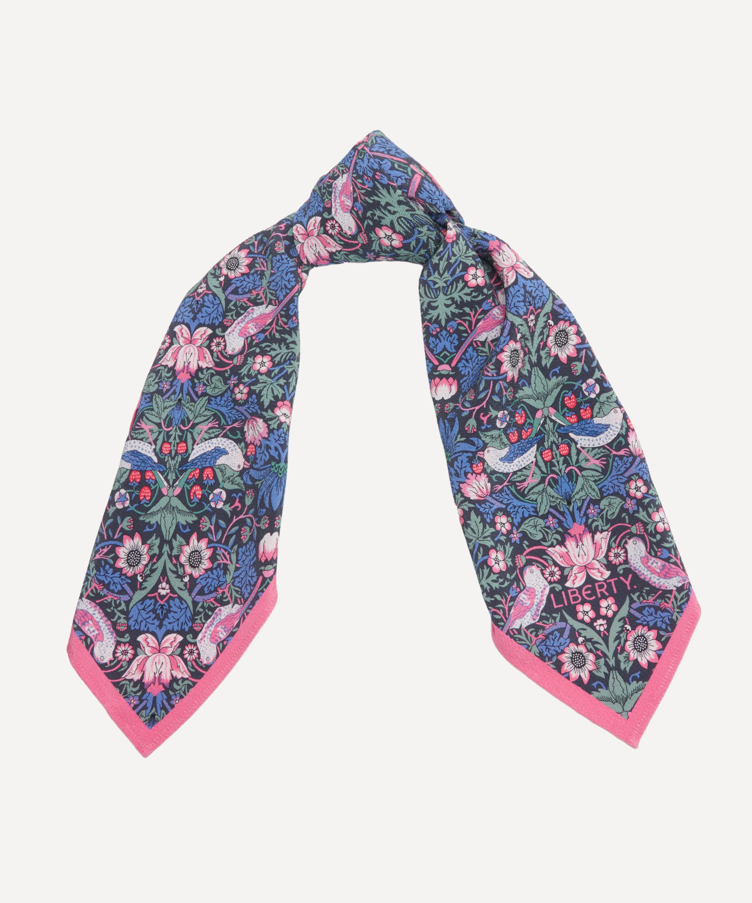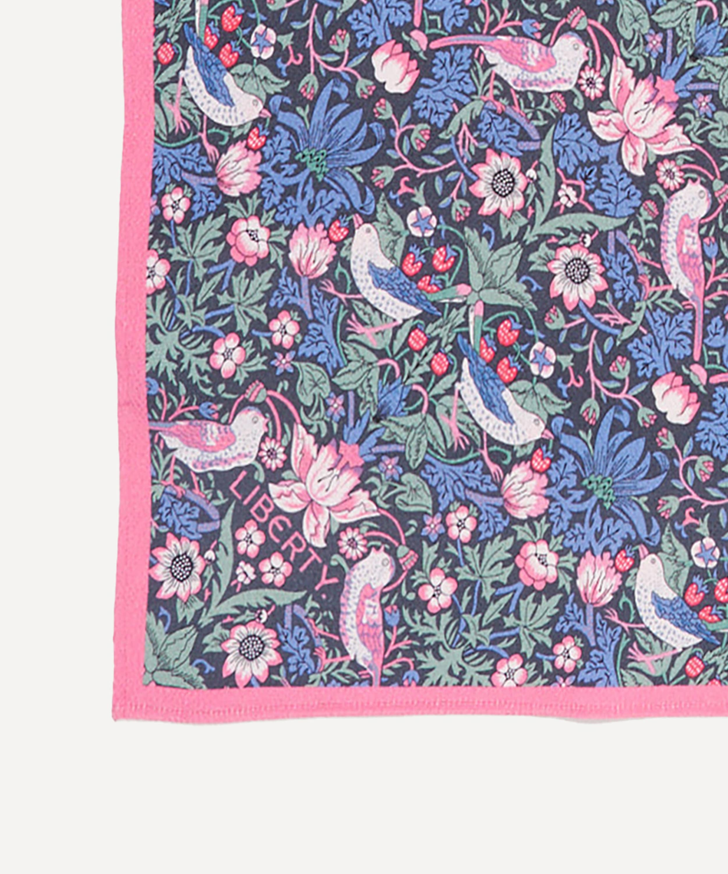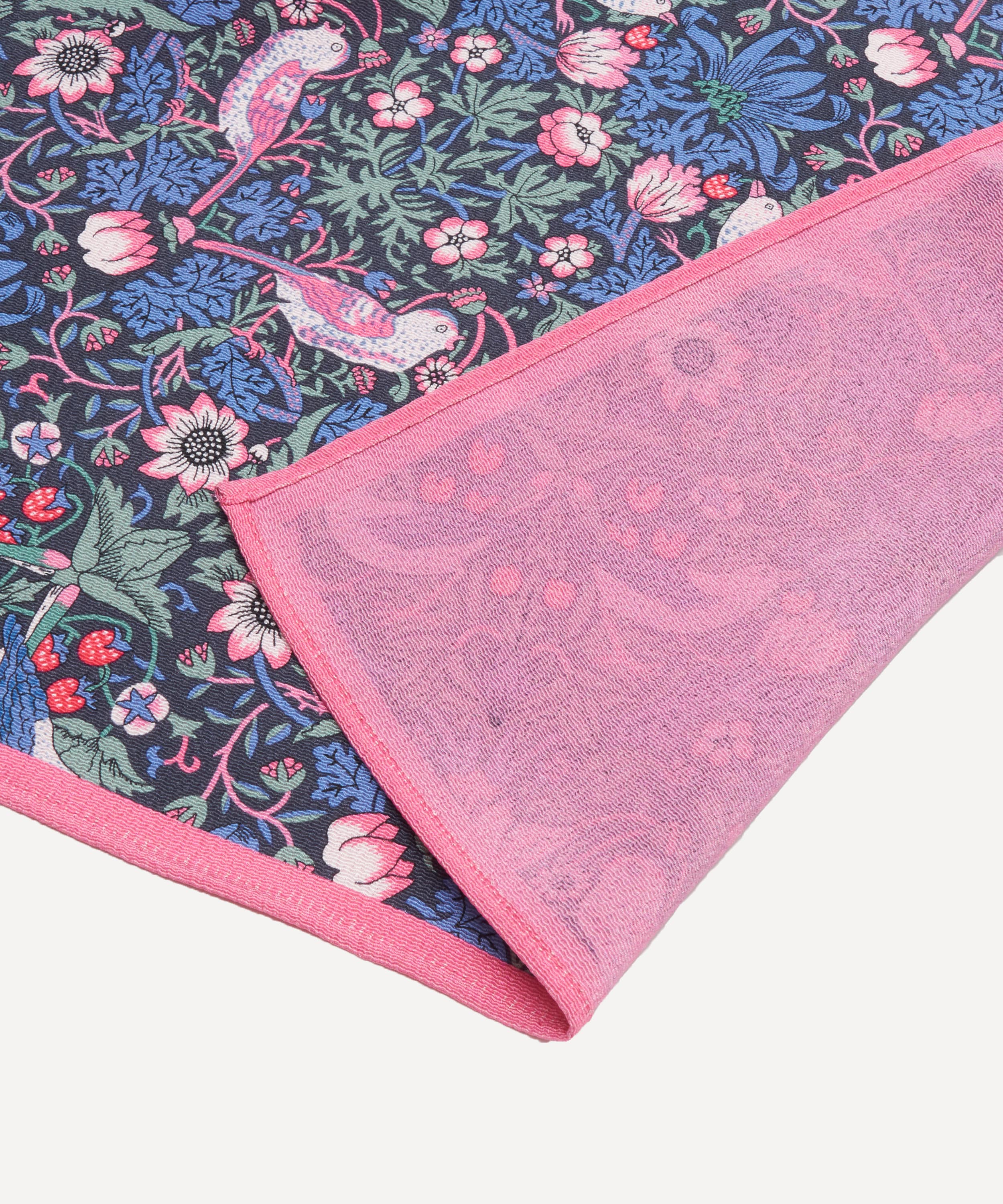 デザインは、長年リバティプリントとしても愛されている「ストロベリー・シーフ」と、2025年の新作「フローラル・ミューズ」の2柄。シルクスカーフにも用いられるデジタルメソッドによる両面プリントで、美しい柄を余すことなく楽しめます。