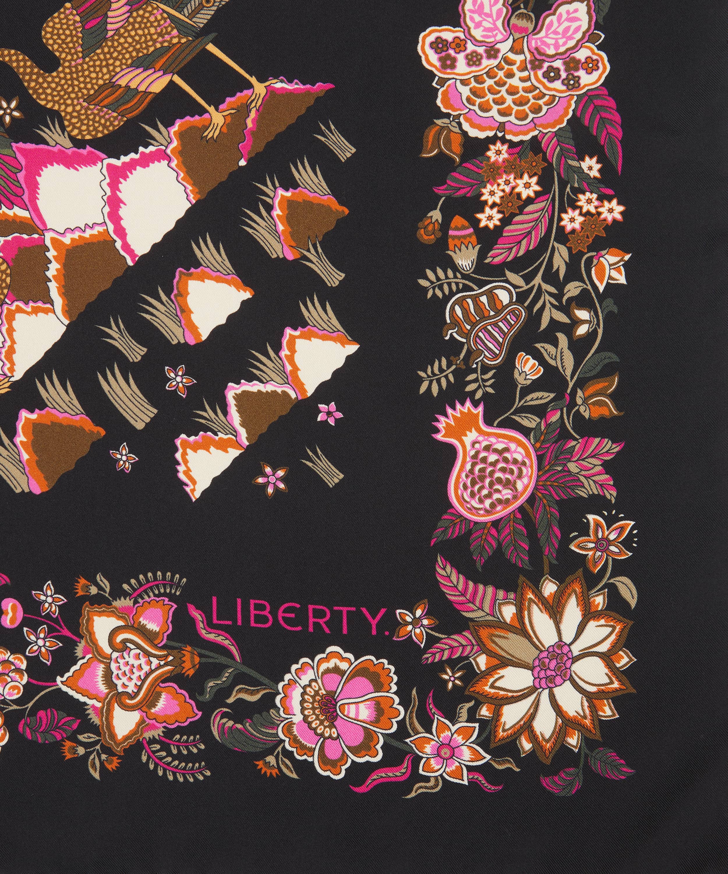 しなやかで上質なシルクツイルを使用し、イタリアで丁寧に織り上げ・プリントされた本製品は、両面プリント仕様の「トロピカル・ツリー・オブ・ライフ」柄をあしらっています。17世紀後半にインドチンツとして制作され、ペルシャの伝統的な図案をもとにヨーロッパ市場向けにアレンジされたオリジナルの「ツリー オブ ライフ」を、トロピカルな果実や花々、生き物を添えて新たに再構築。歴史と自然美が融合したリバティらしい意匠です。鮮やかな色彩と生命力にあふれるこのスカーフは、軽やかなテーラードスタイルにさらりと羽織ったり、首元に差し色として結んだり、髪に編み込んだりと、スタイリングの幅を広げてくれるタイムレスなアクセサリーです。