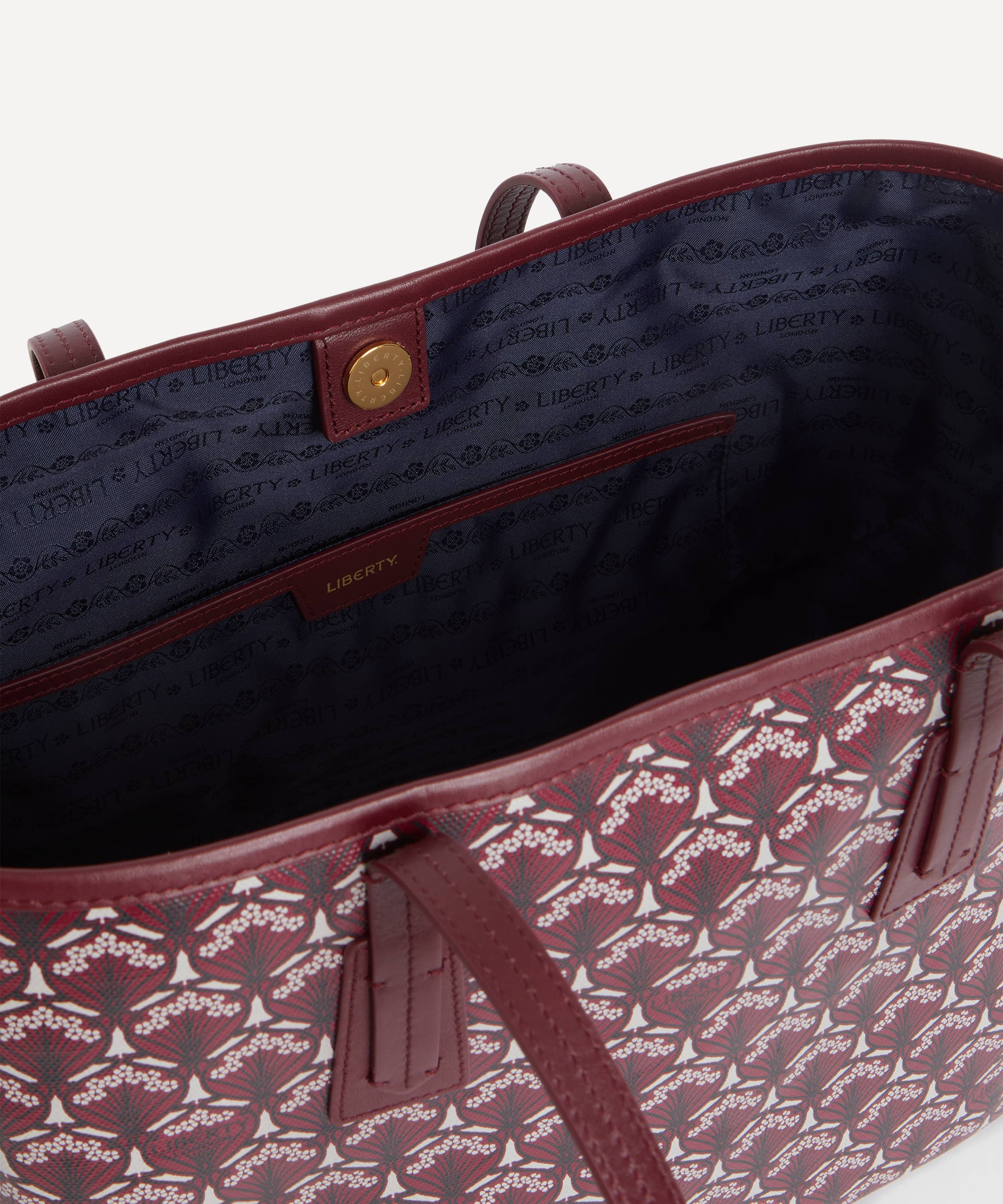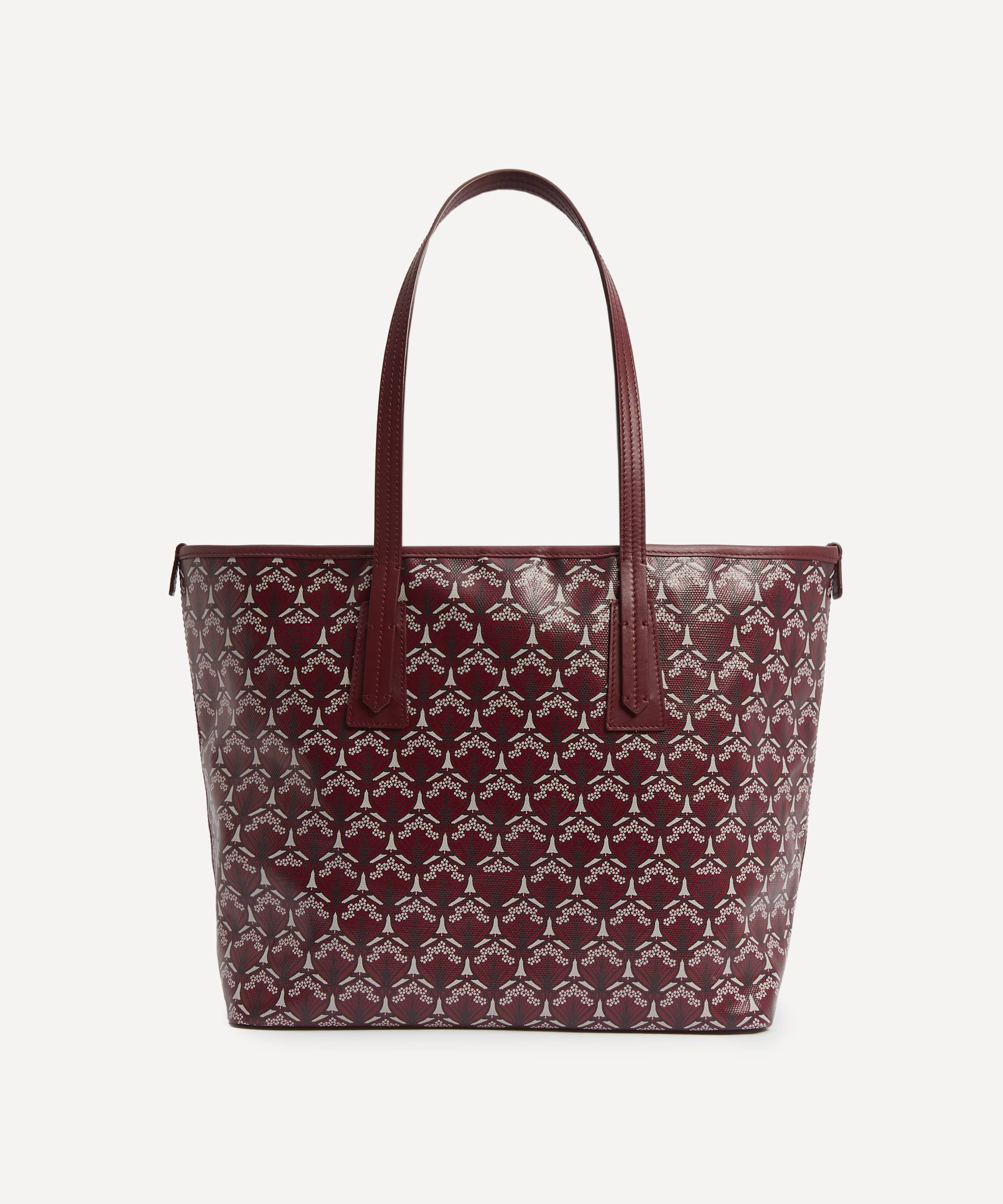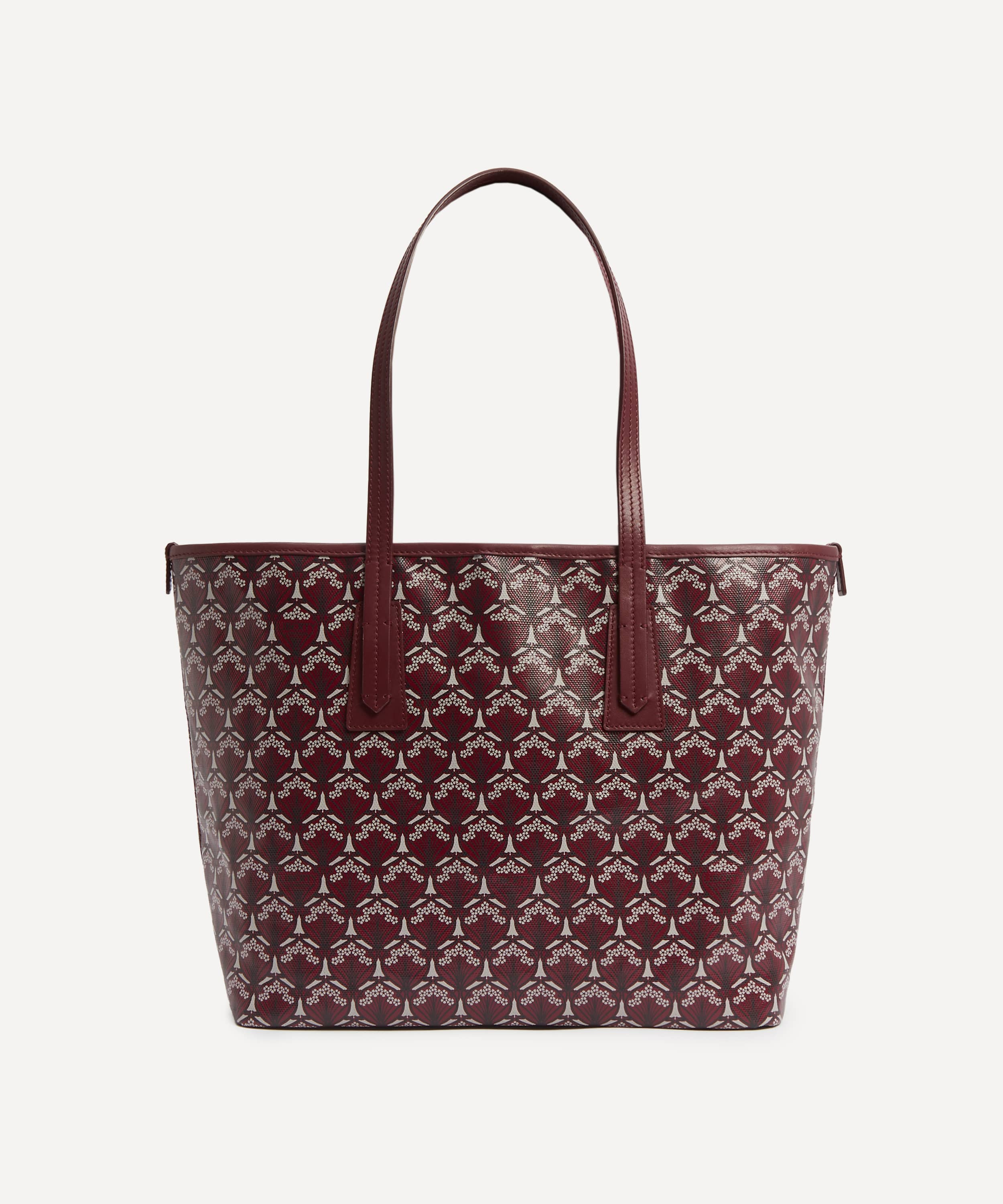 バーガンディのアイフィスプリント / コットンリネンキャンバス製 / ツートップハンドル /マグネットスナップ開閉 / 内ポケット付き / イタリア製スクリーンプリント / リバティ ロンドン スタジオ デザイン / 保護用ダストバッグ付き / お手入れ方法:柔らかく乾いた布で優しく拭いてください