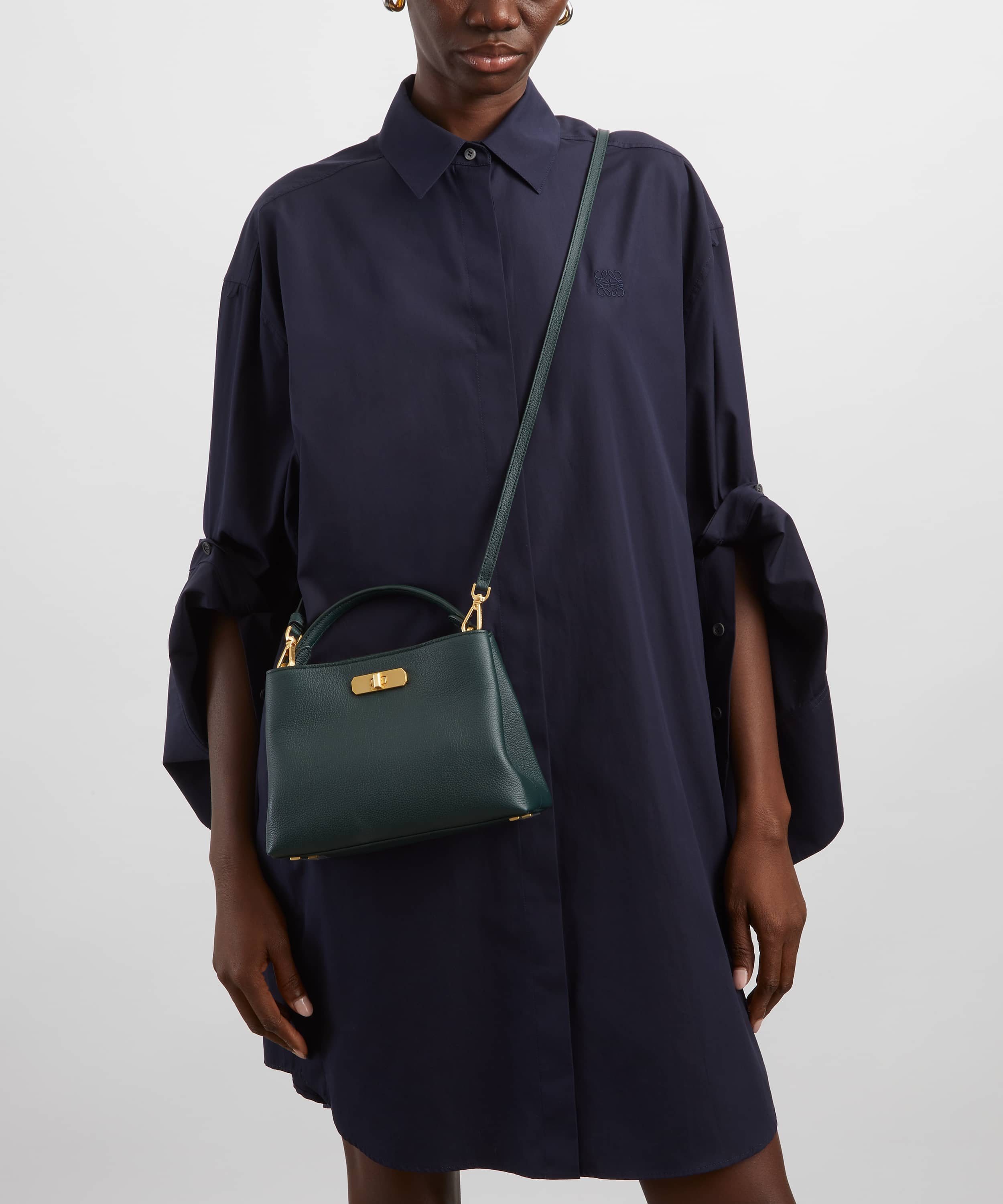 美しく丈夫なレザーを使用し、上品なボックスシルエットに仕立てたデザインは、カジュアルにもワークスタイルにも品よくマッチ。ふたつのメインコンパートメントはマグネットとターンロックでしっかりと開閉でき、リバティ百貨店のアトリウムから着想を得たディテールがさりげないエレガンスを添えます。 内側にはアイフィスプリントのキャンバスをあしらい、構築的でありながらリバティらしい遊び心を感じさせる仕上がりに。ショルダーにもクロスボディにも使える調節可能なストラップ付きで、季節を超えて永く愛用できるラグジュアリーなバッグです。
