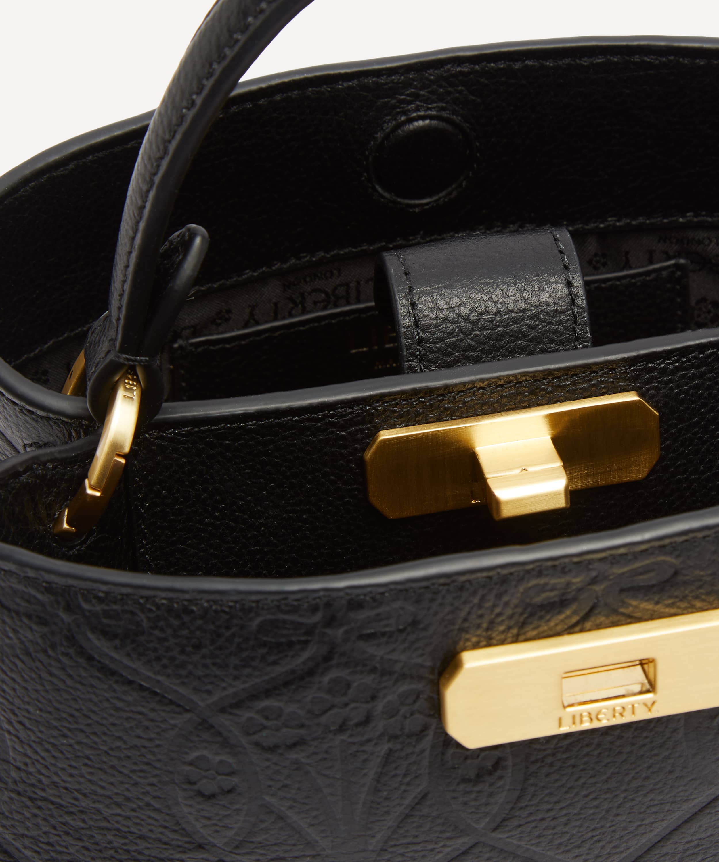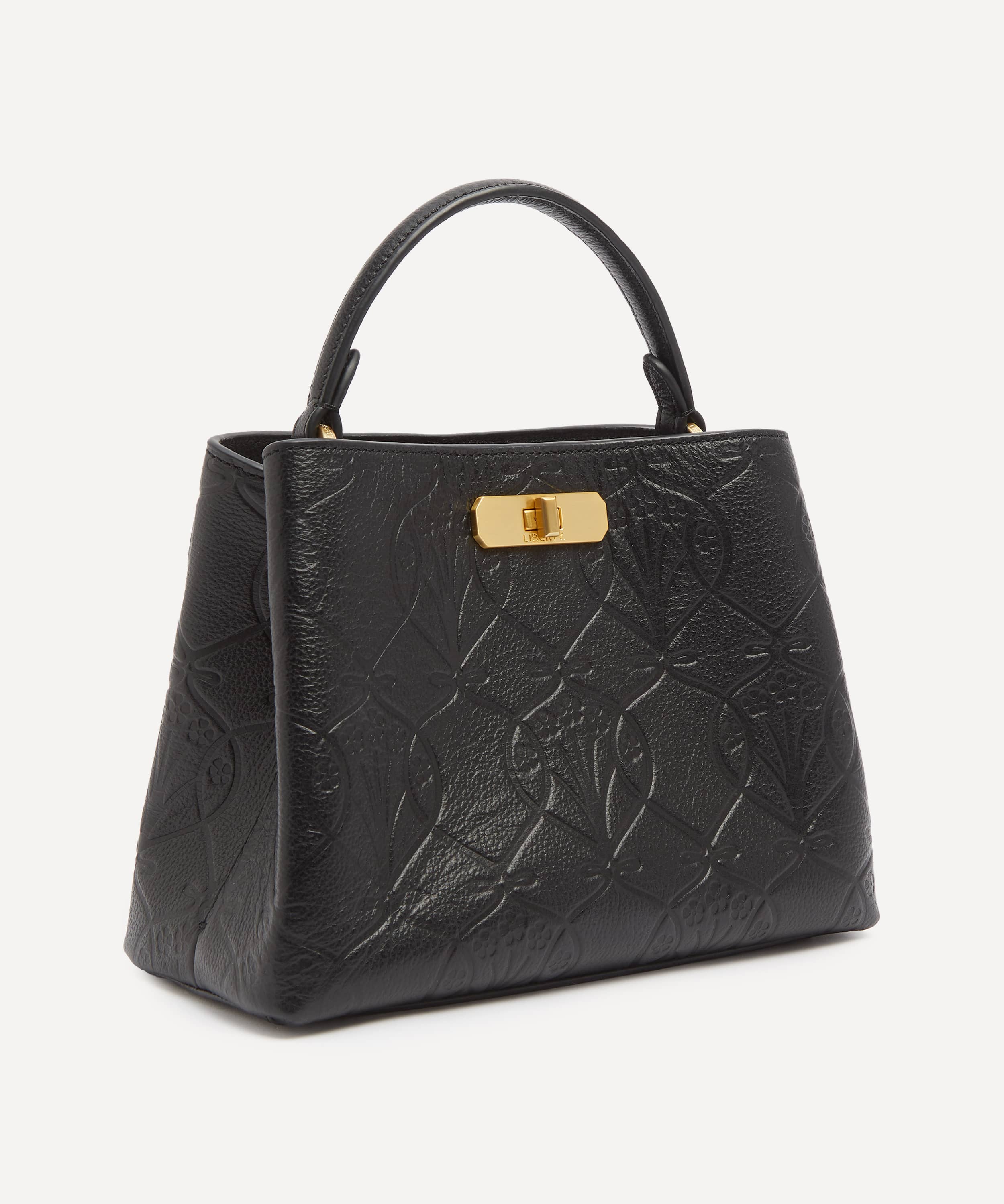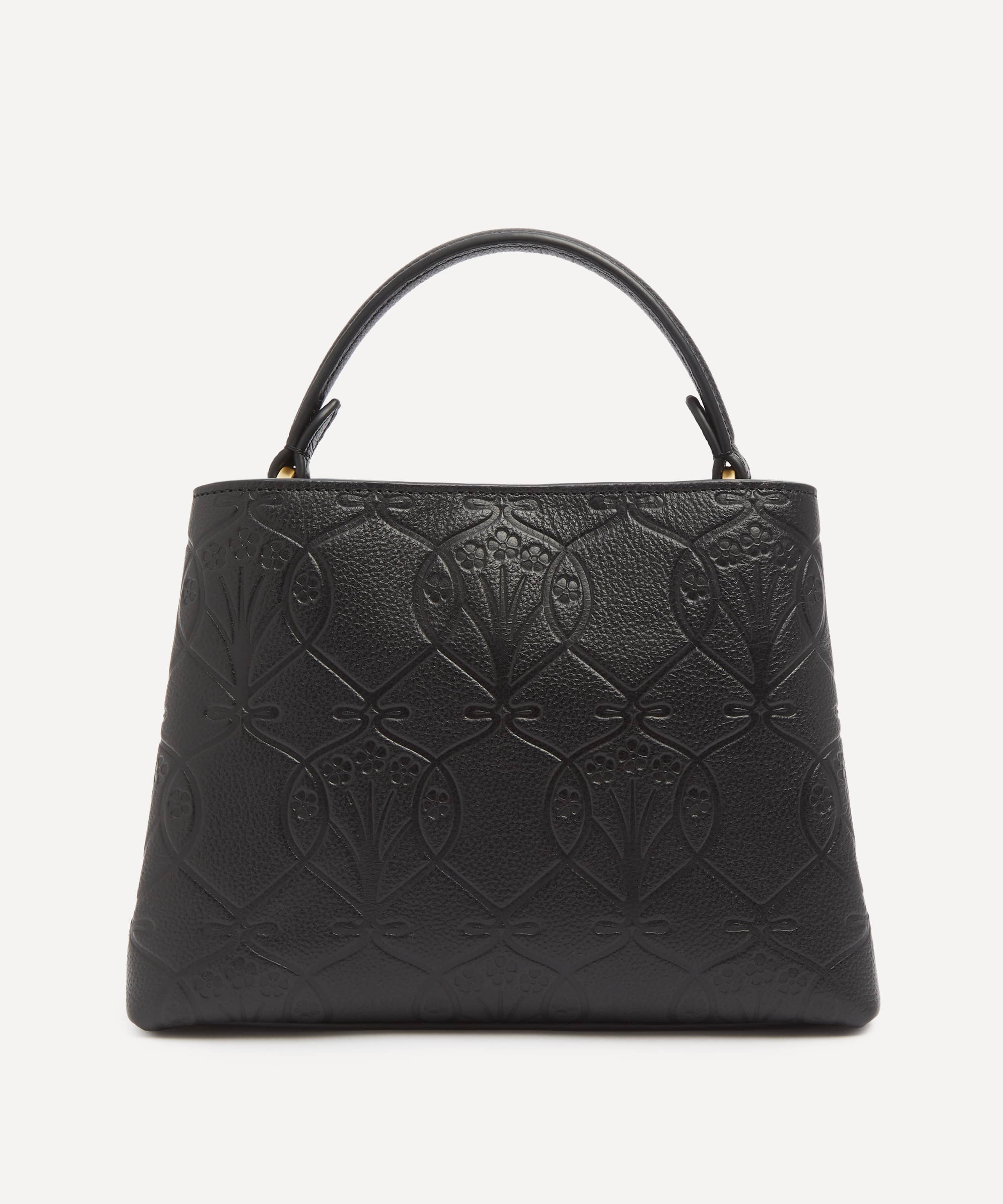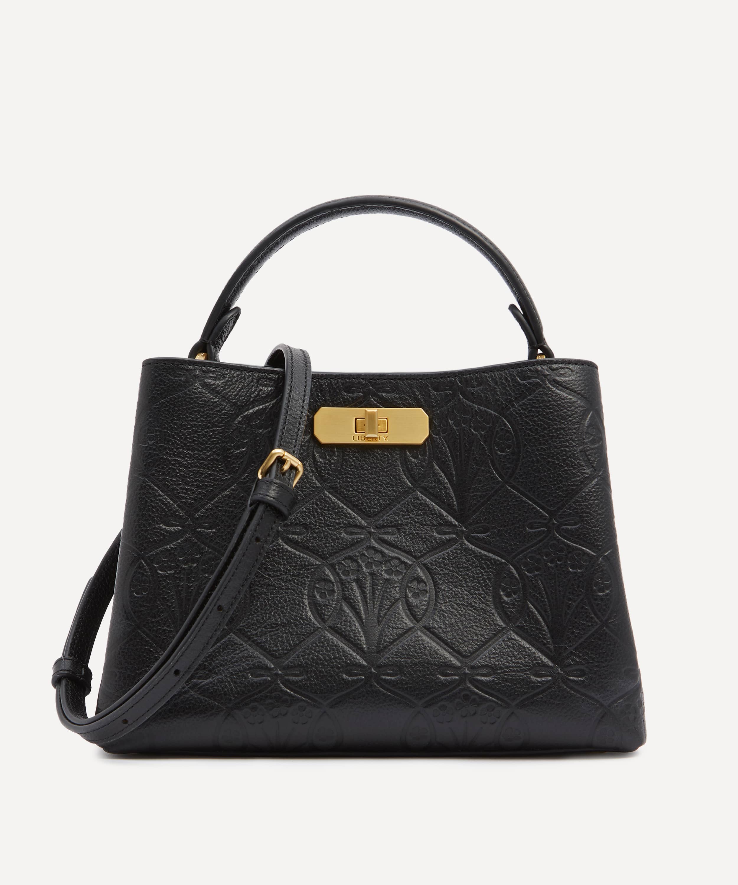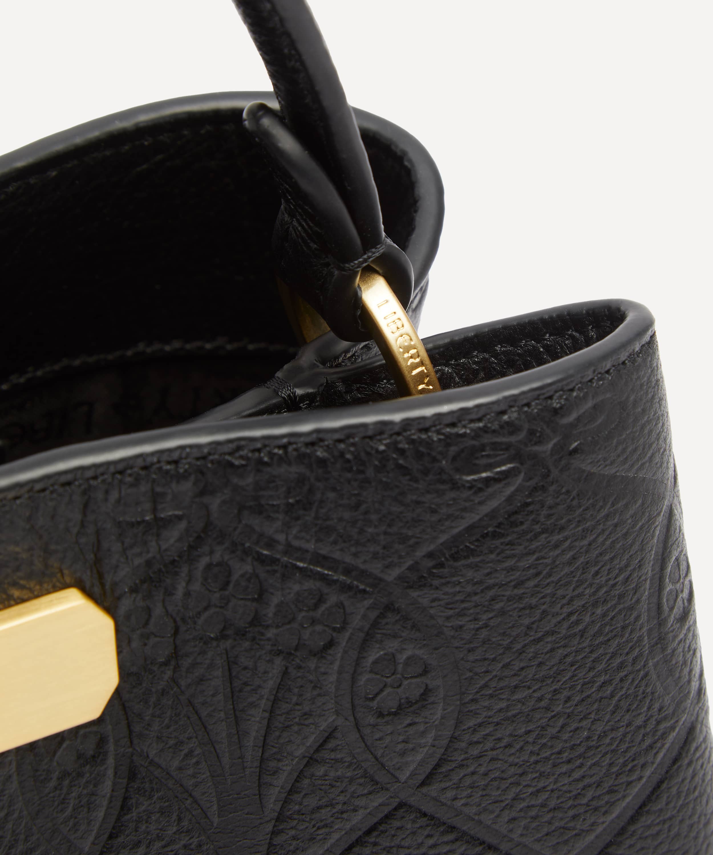 ミニ トップハンドルバッグ / エンボスレザー / アイフィスプリント / メインコンパートメント×2 / 中央マグネットクロージャー / フロントコンパートメントにターンロック付き / 軽くパッドの入ったトップハンドル / 長さ調整可能なショルダーストラップ / 内側カードスロット / リバティのロゴ入り金具(ブラッシュドゴールド仕上げ) / お手入れ方法:やわらかい乾いた布で軽く拭いてください