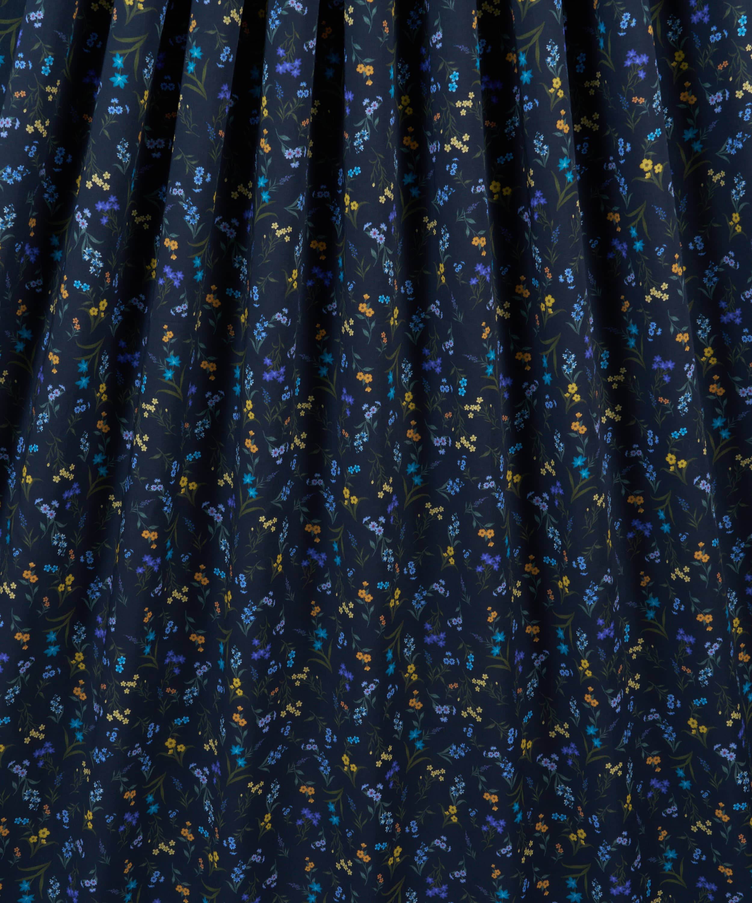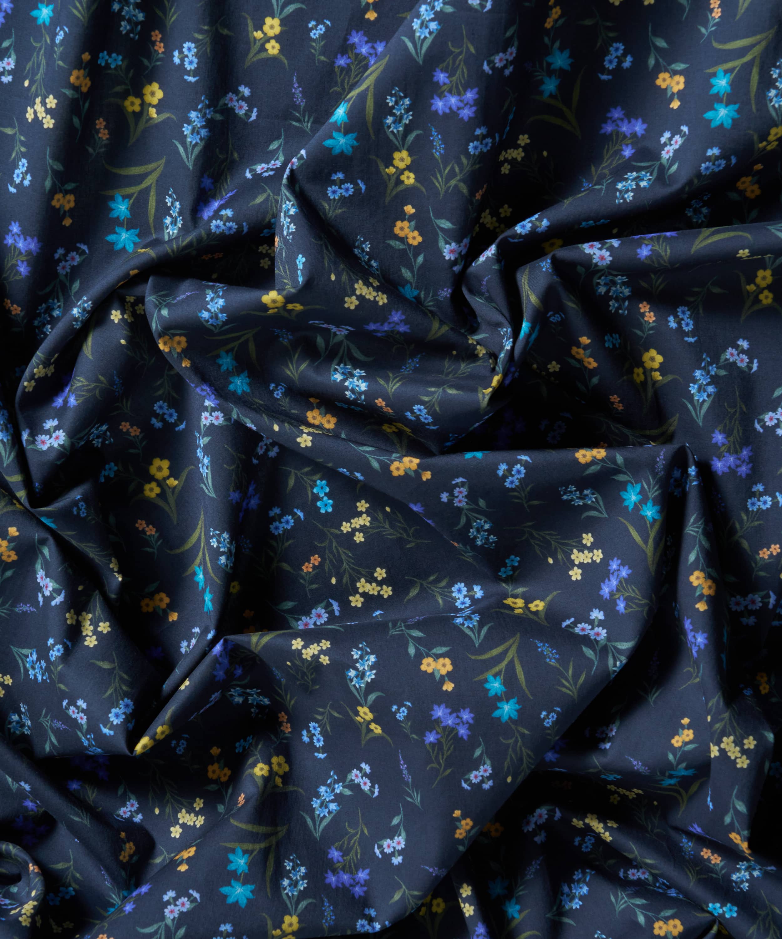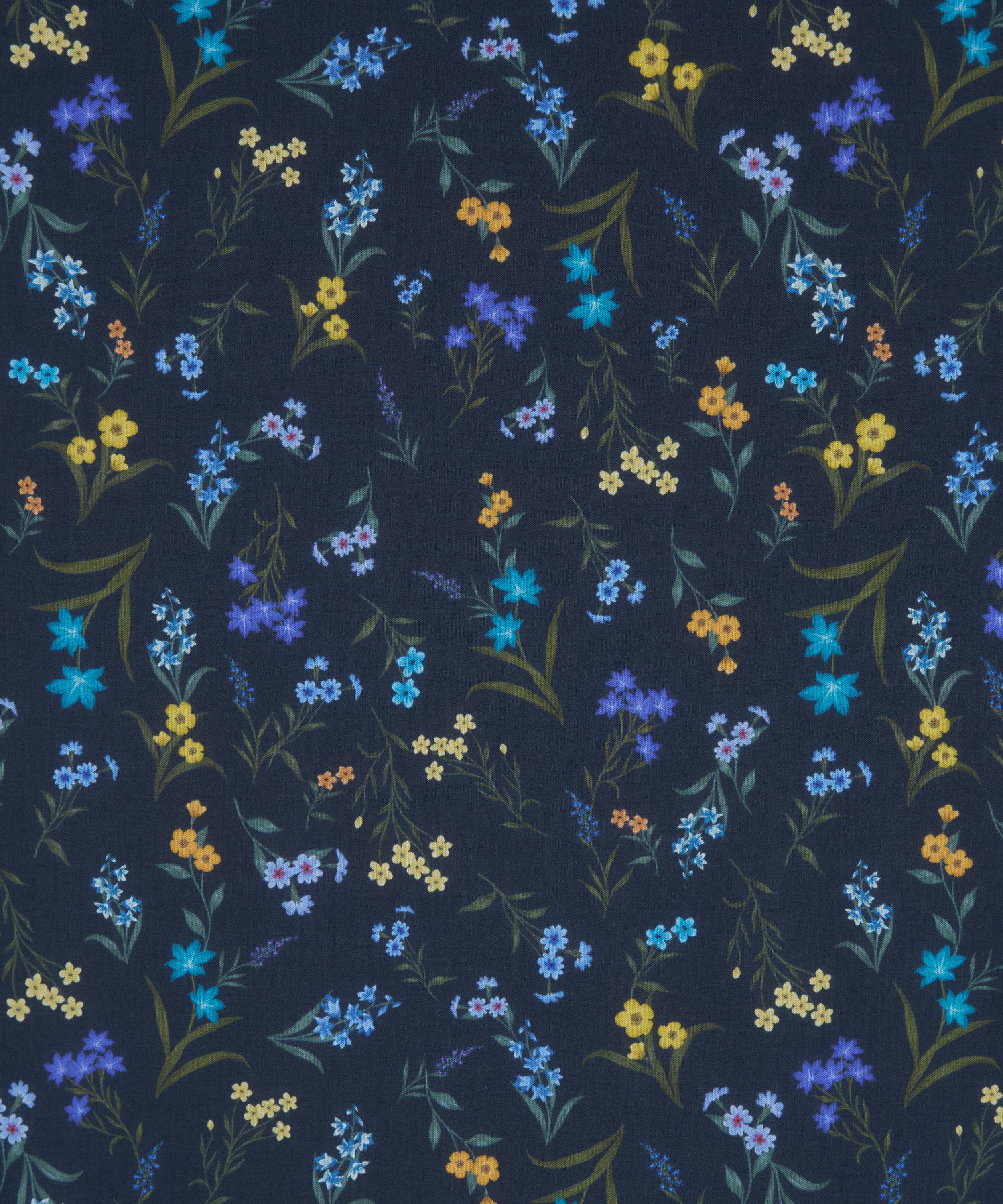 水彩絵の具で描かれた小さな花々を、繊細に配置した多方向のボタニカルなデザインです。イトシャジン、亜麻、ハナタネツケバナ、マンテマ、ツルニチニチソウ、ハコベ、クレイトニア・シビリカなどが描かれています。