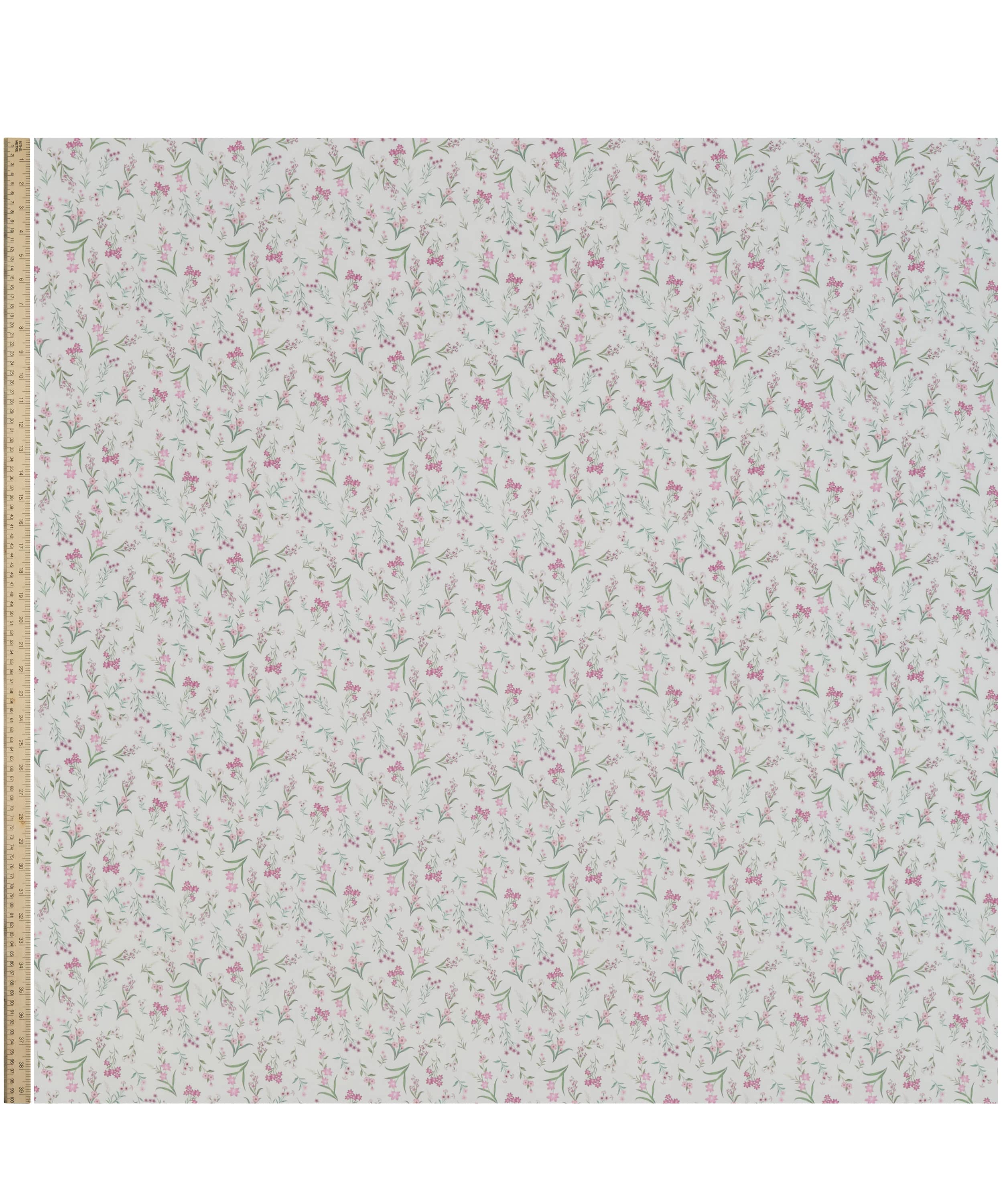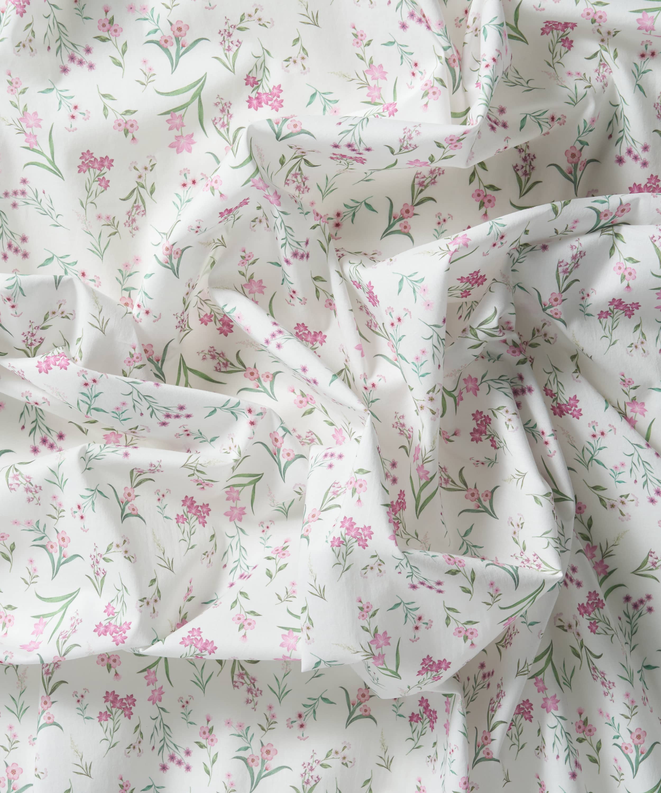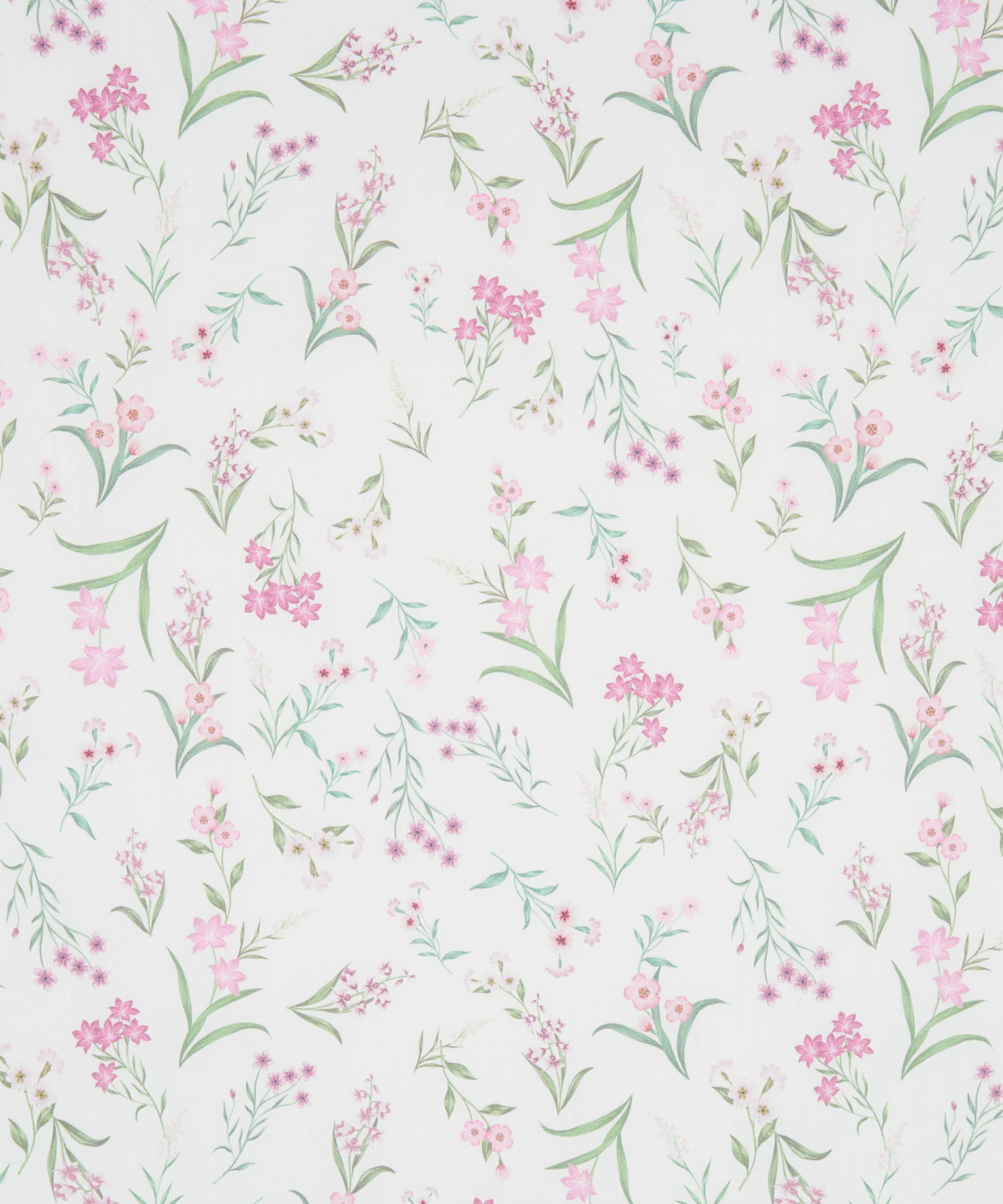 水彩絵の具で描かれた小さな花々を、繊細に配置した多方向のボタニカルなデザインです。イトシャジン、亜麻、ハナタネツケバナ、マンテマ、ツルニチニチソウ、ハコベ、クレイトニア・シビリカなどが描かれています。