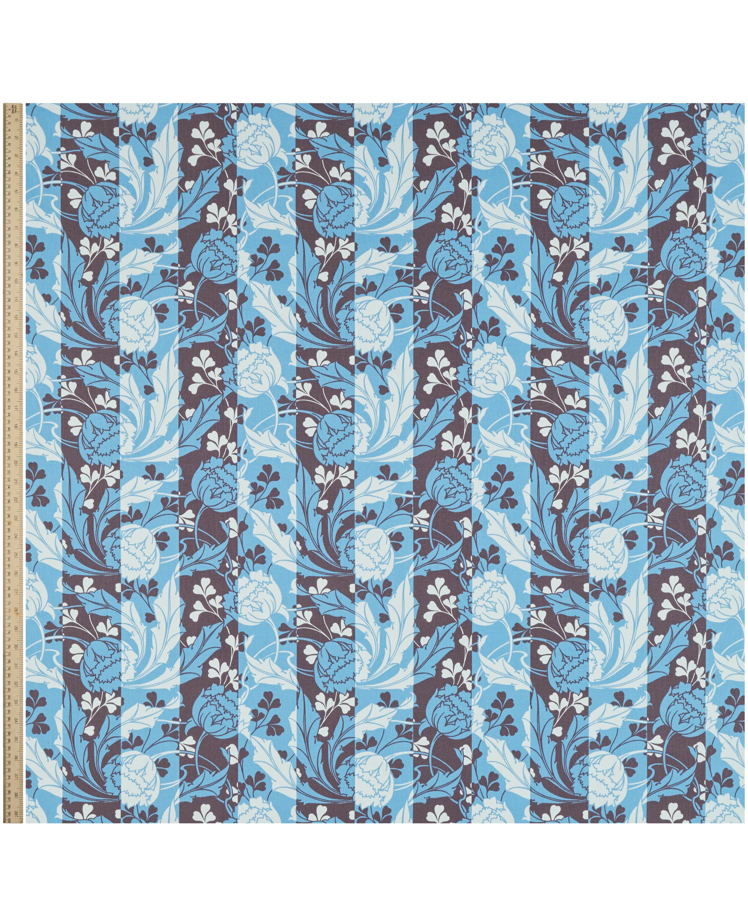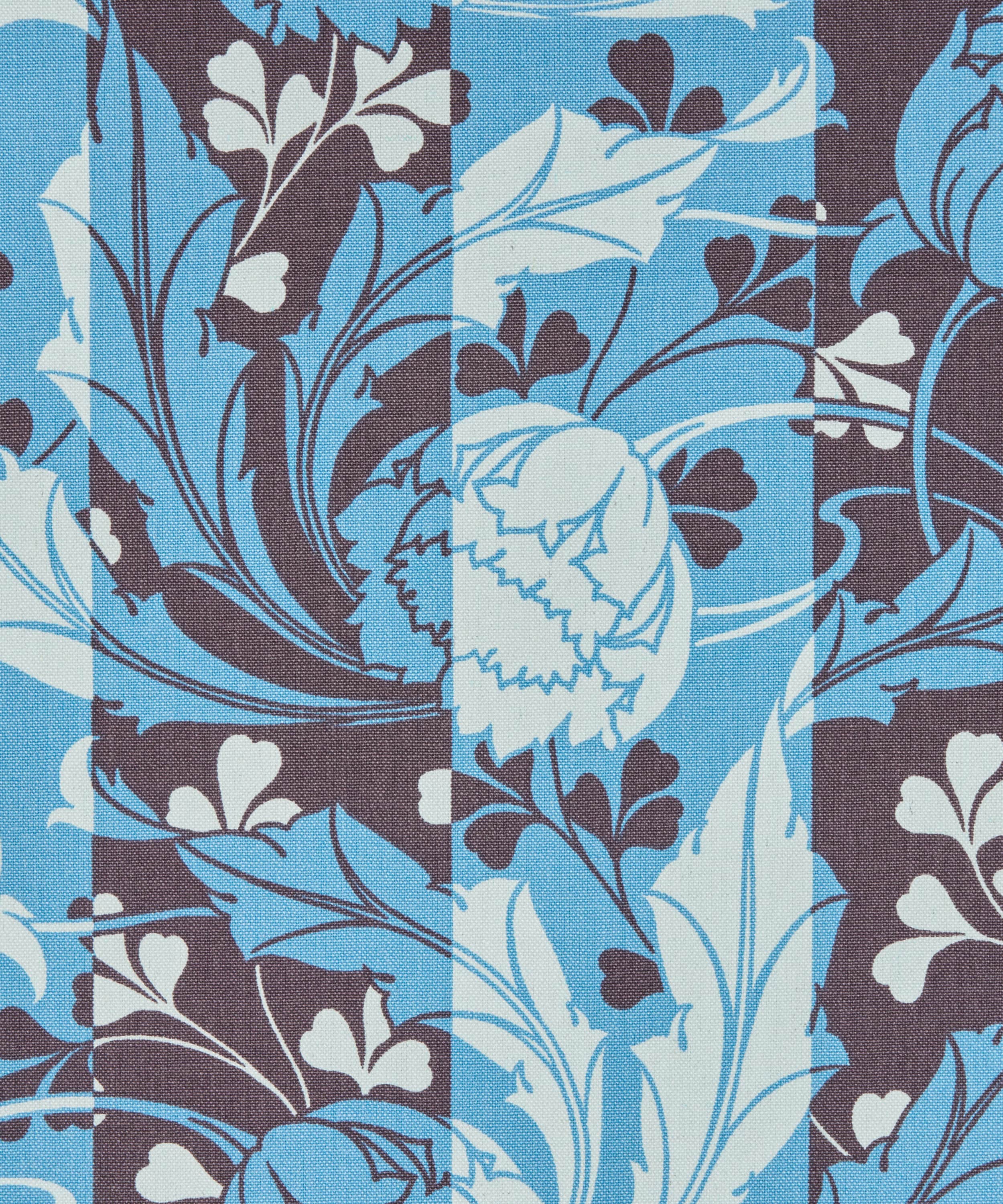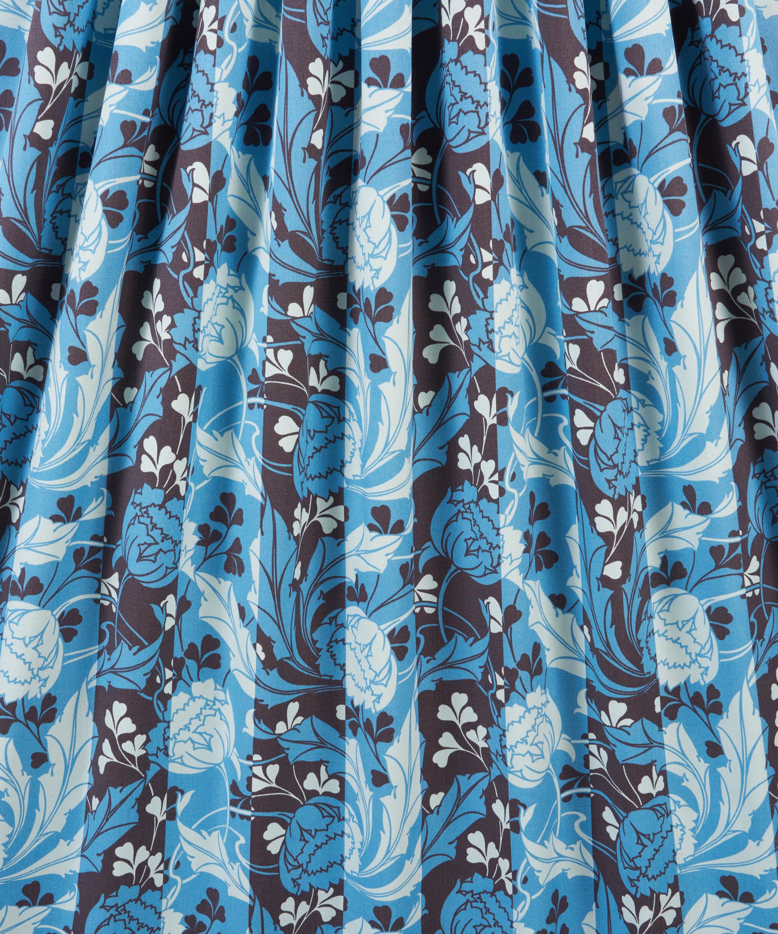 リバティのアーカイブから発見されたアール・ヌーヴォーのアートワークをベースにした、「部分的な繰り返し」のコンセプトを体現するチューリップと葉の印象的なデザインです。手描きパートが部分的に彩色され、鉛筆で描かれた部分や 「未完成」の部分と並べられ、最終的なプレビューの役割を果たします。鮮やかなストライプがカラーブロッキングの概念を大胆に取り入れ、印象的なポジとネガのシャドー効果によって強調された超モダンな美学を表現しています。