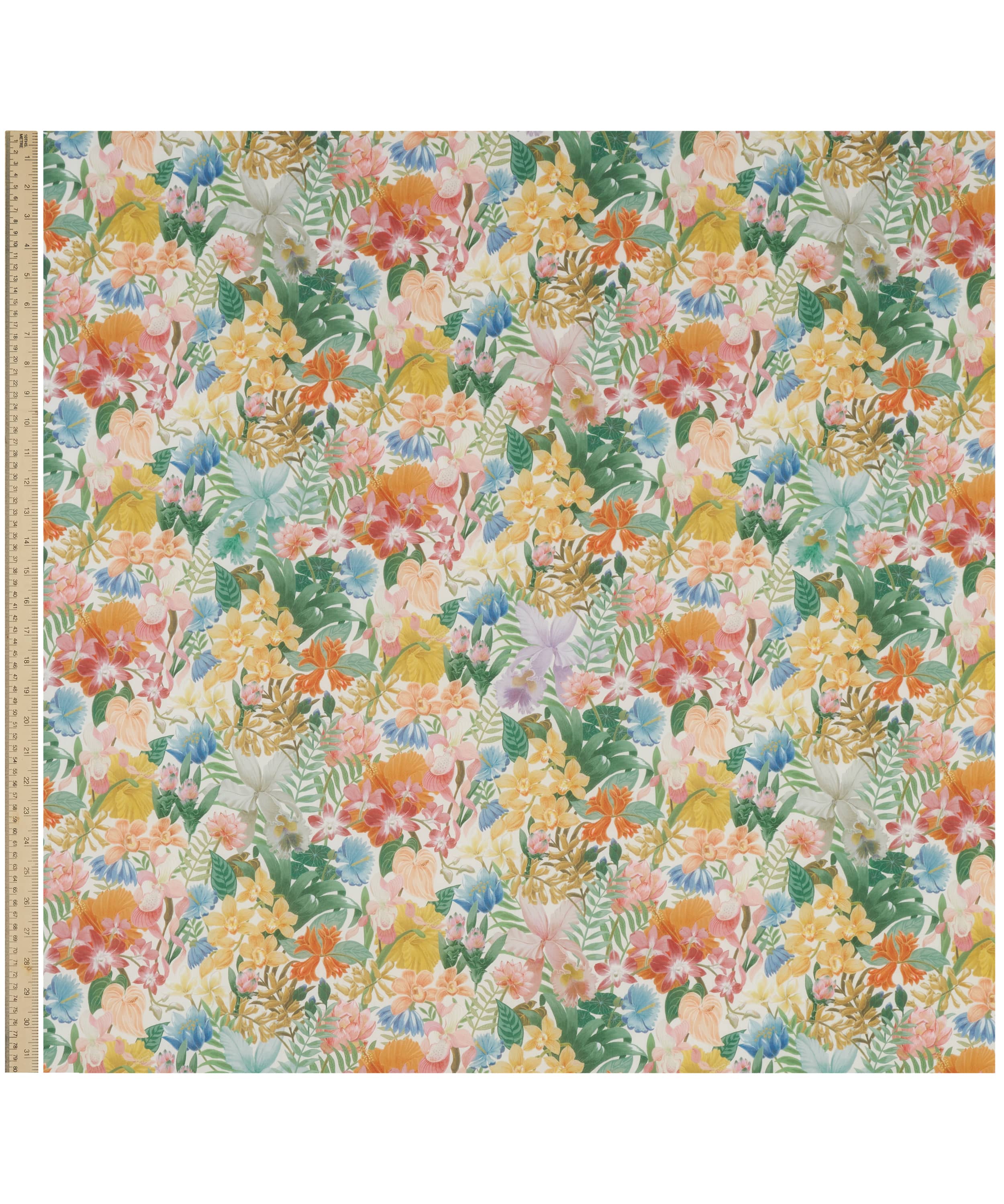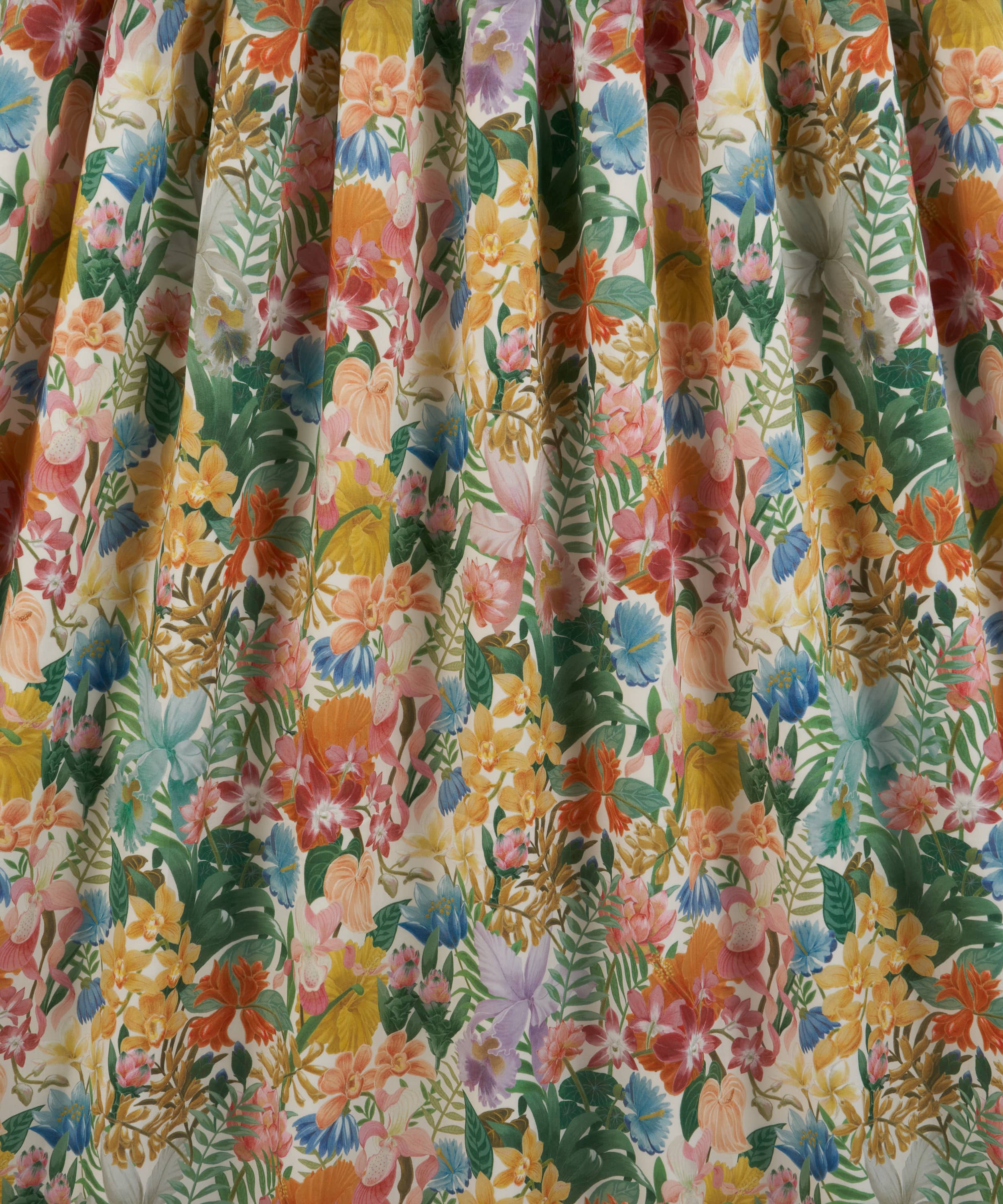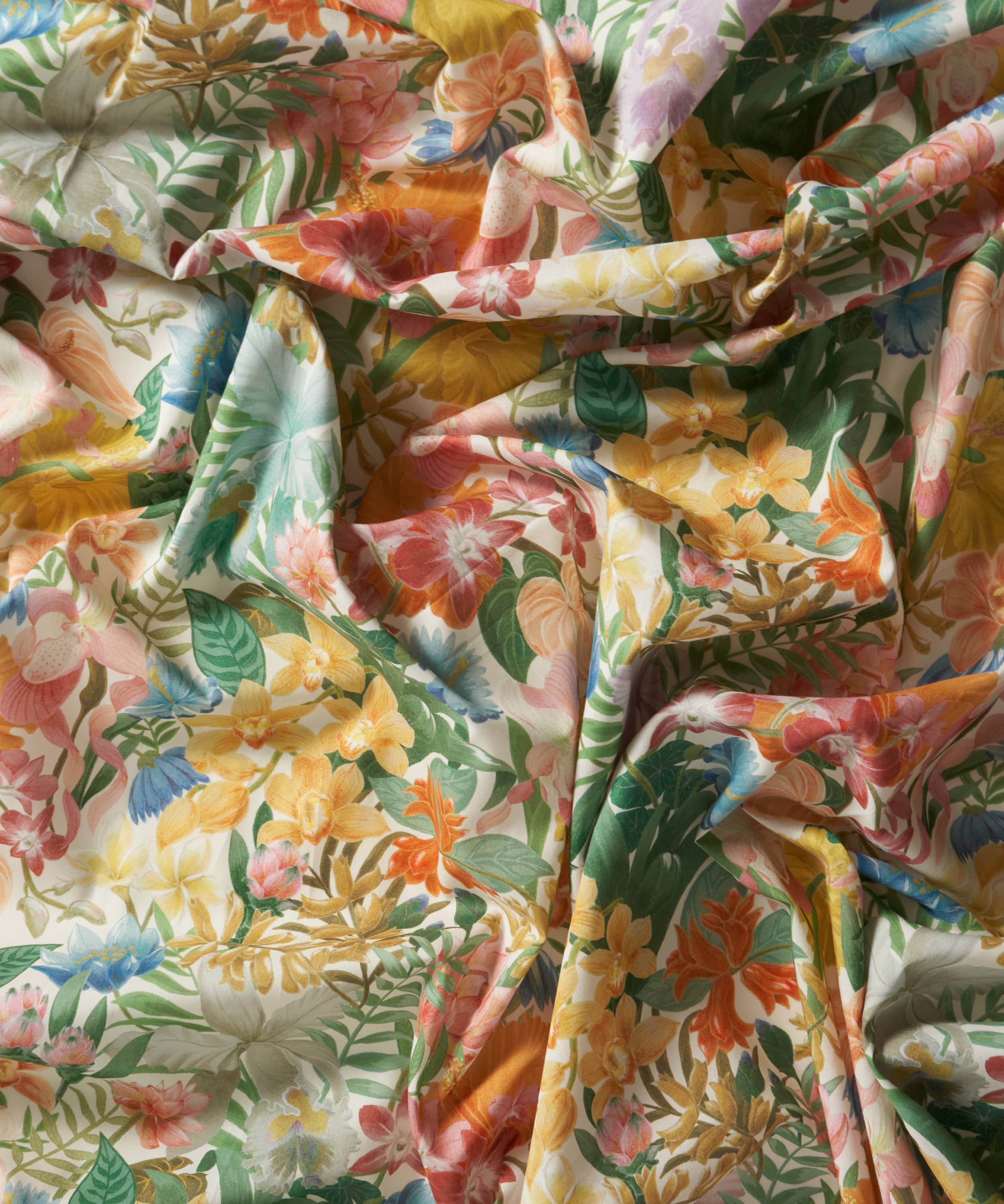 「グリーンハウス・トロピック」は、1940年代のリバティのアーカイブデザインの融合からインスピレーションを得て、植物モチーフを現代的に再解釈した一枚です。デザインスタジオでは、一つひとつの花を細かく観察し、サイズを調整しながら丁寧に描き直すことで、鮮やかでリアルな質感を追求しました。さらに深みと豊かさを際立たせるため、追加の花や葉を織り交ぜ、壮麗なトロピカル・オアシスへと昇華させています。