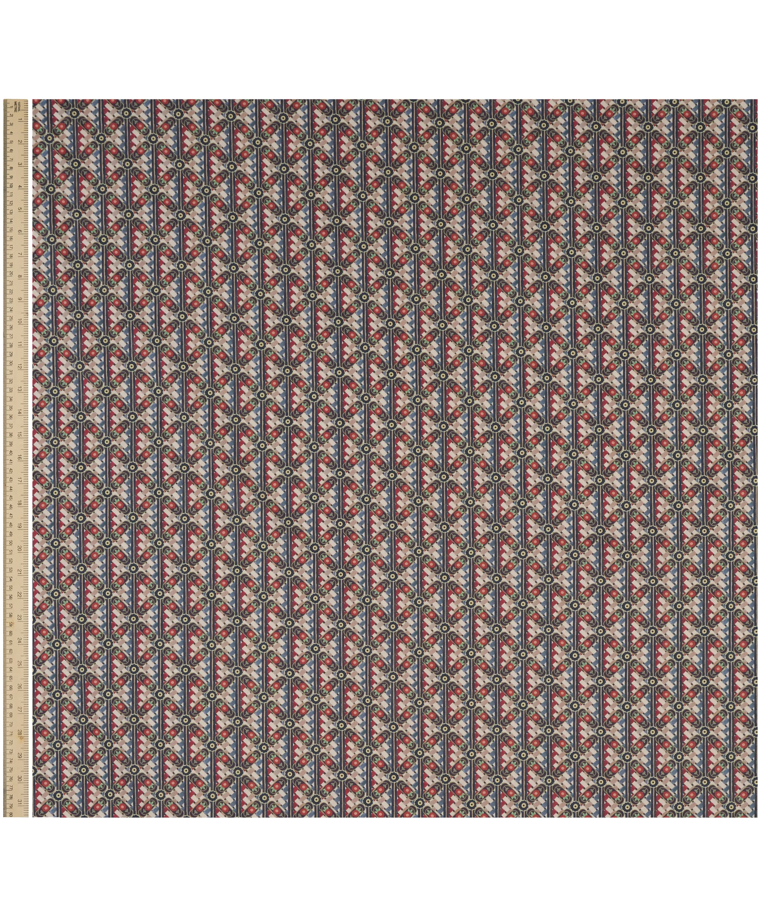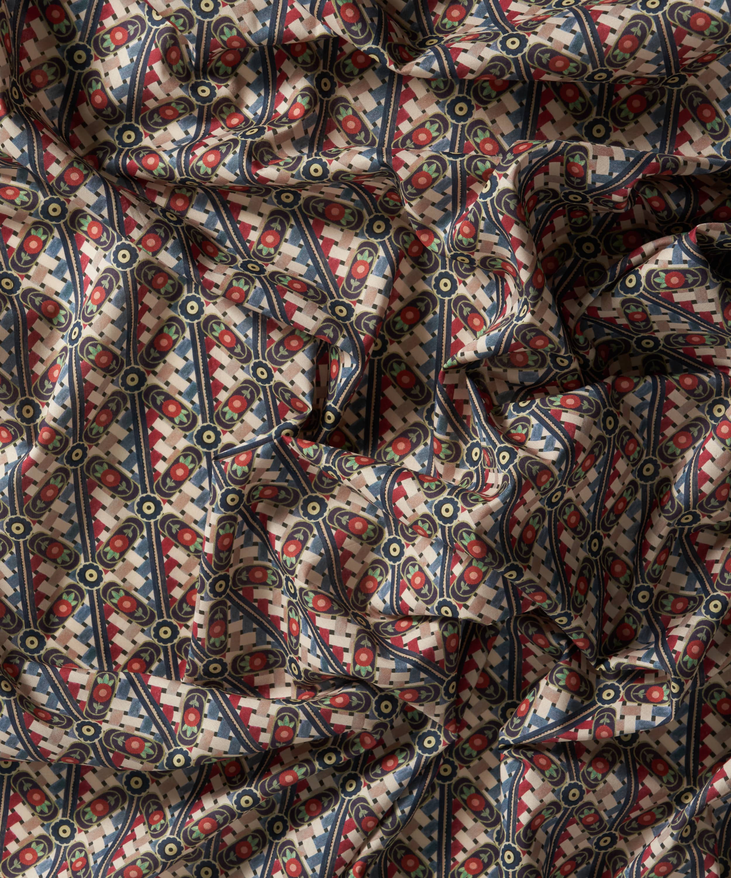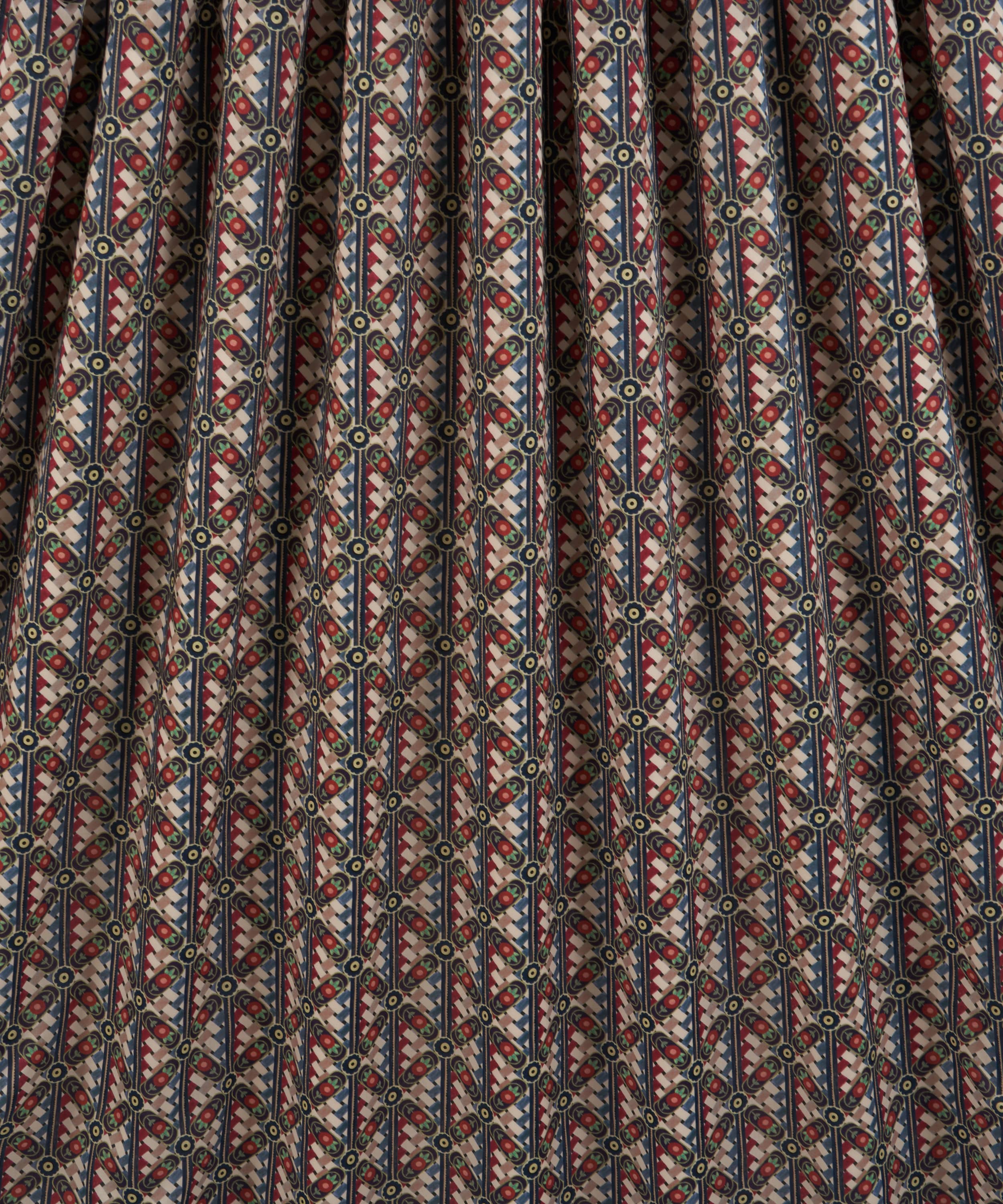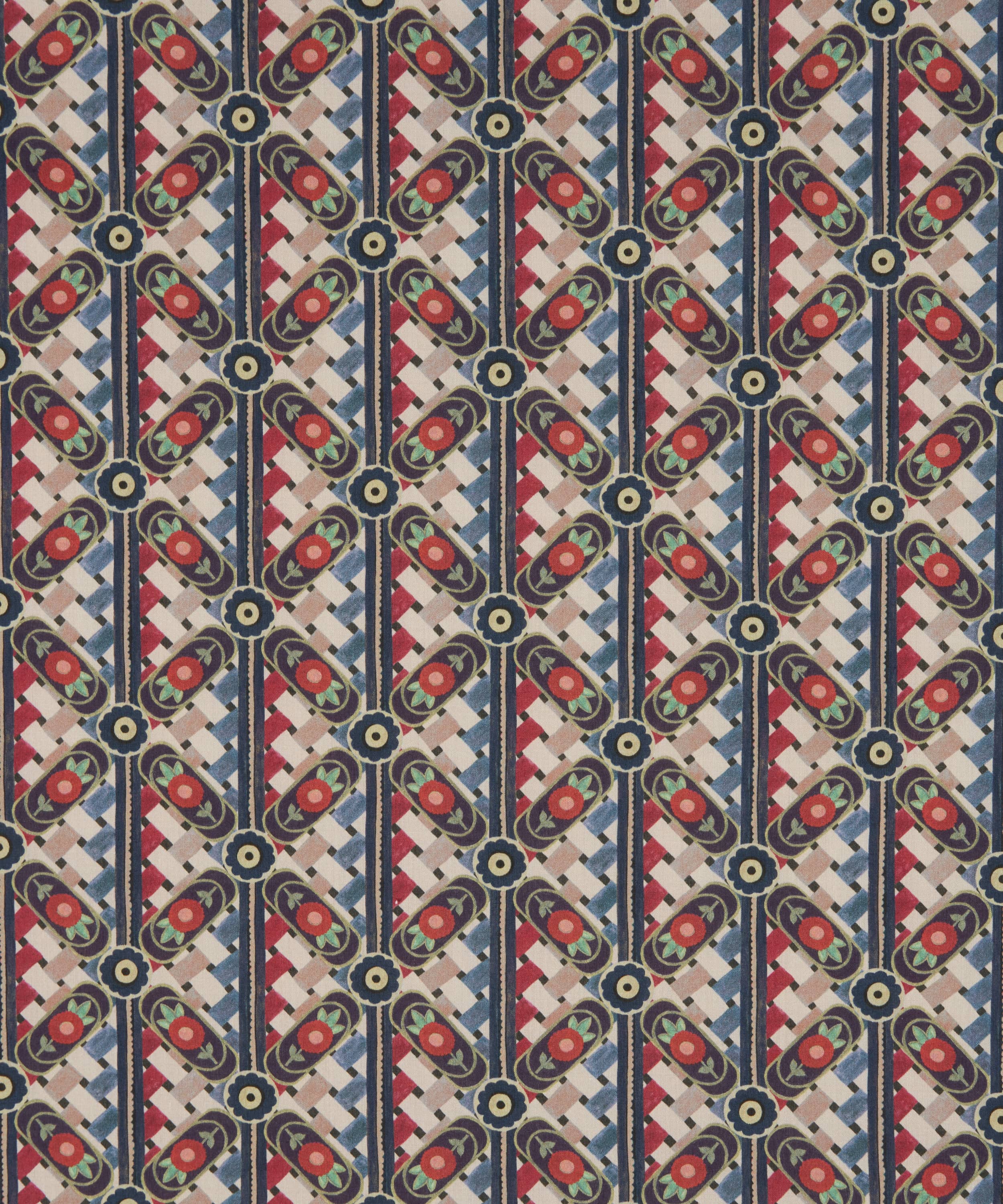 「ノコ・ウィーブ」は、1971年のリバティ・アーカイブスカーフに着想を得て、幾何学模様と繊細な花柄を見事に融合させたデザインです。複数のアーカイブデザインから重ねられた要素が、斜めに走るチェッカーパターンを生み出し、深みと複雑さを加えています。リバティのスタジオで質感豊かなガッシュ絵具を用いて手描きされたこの柄は、籠細工のような緻密な職人技を感じさせます。