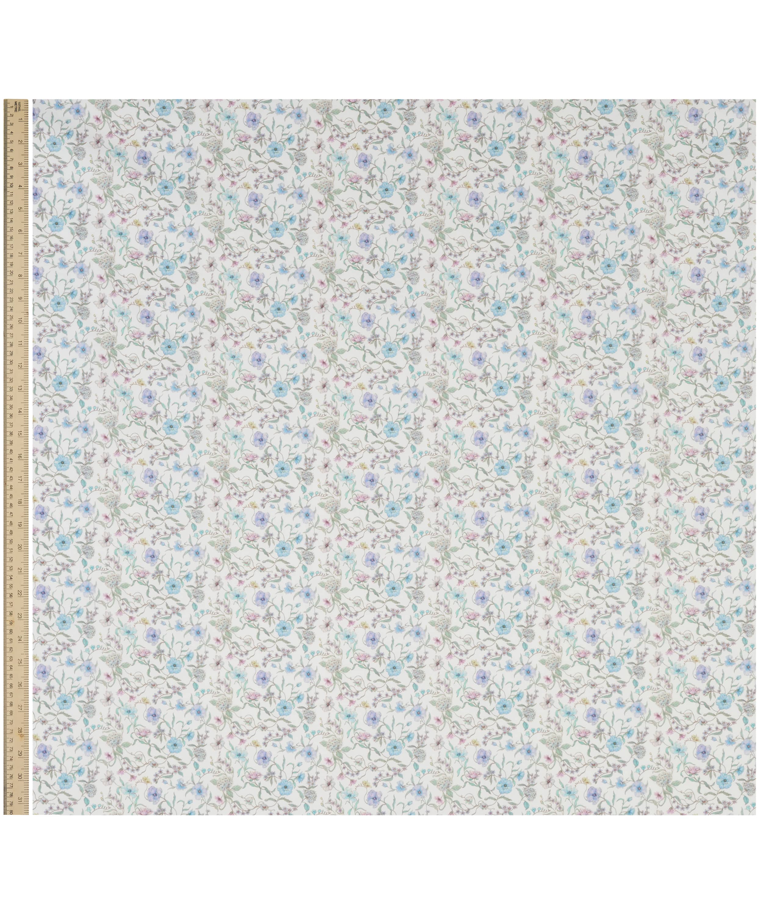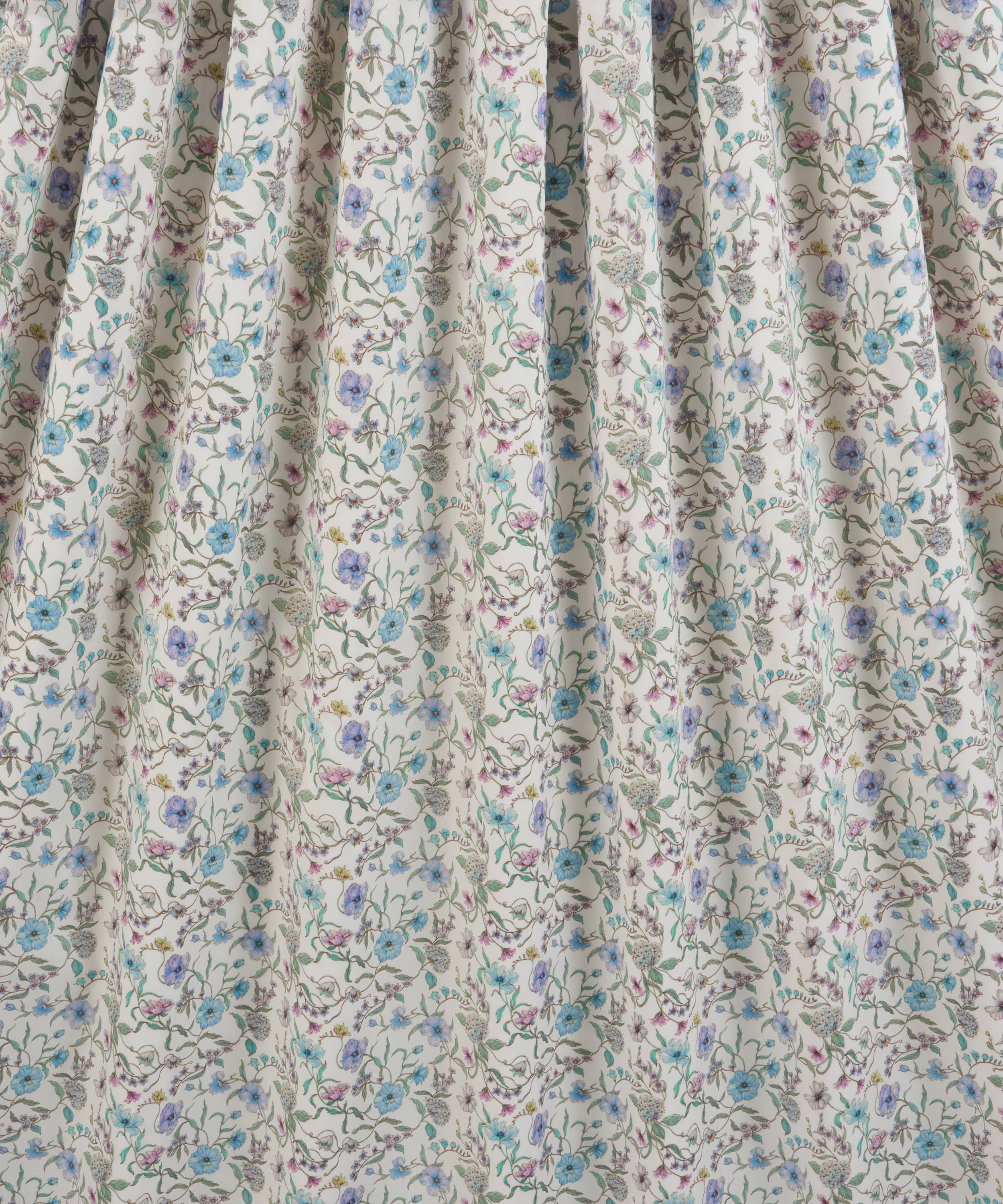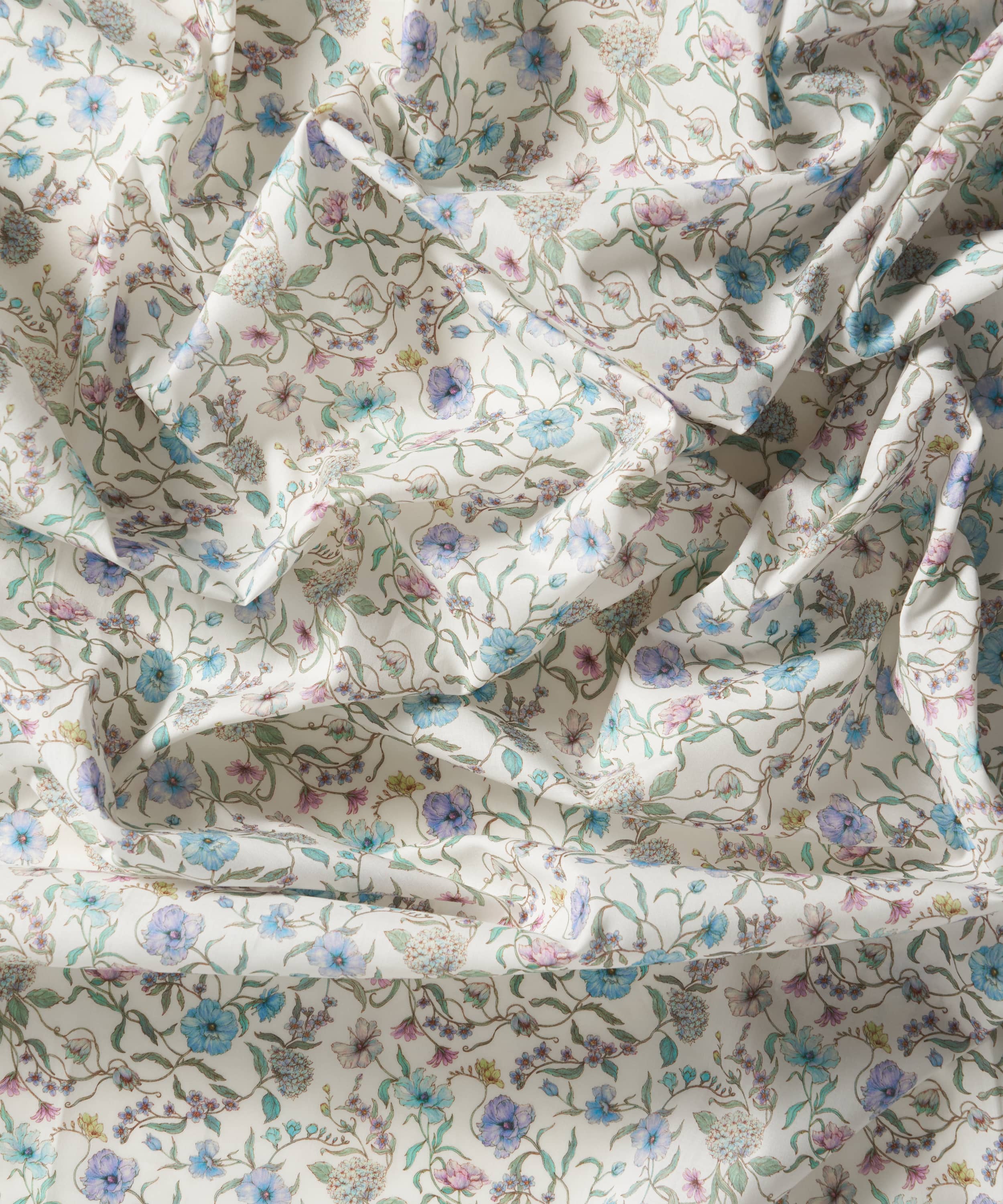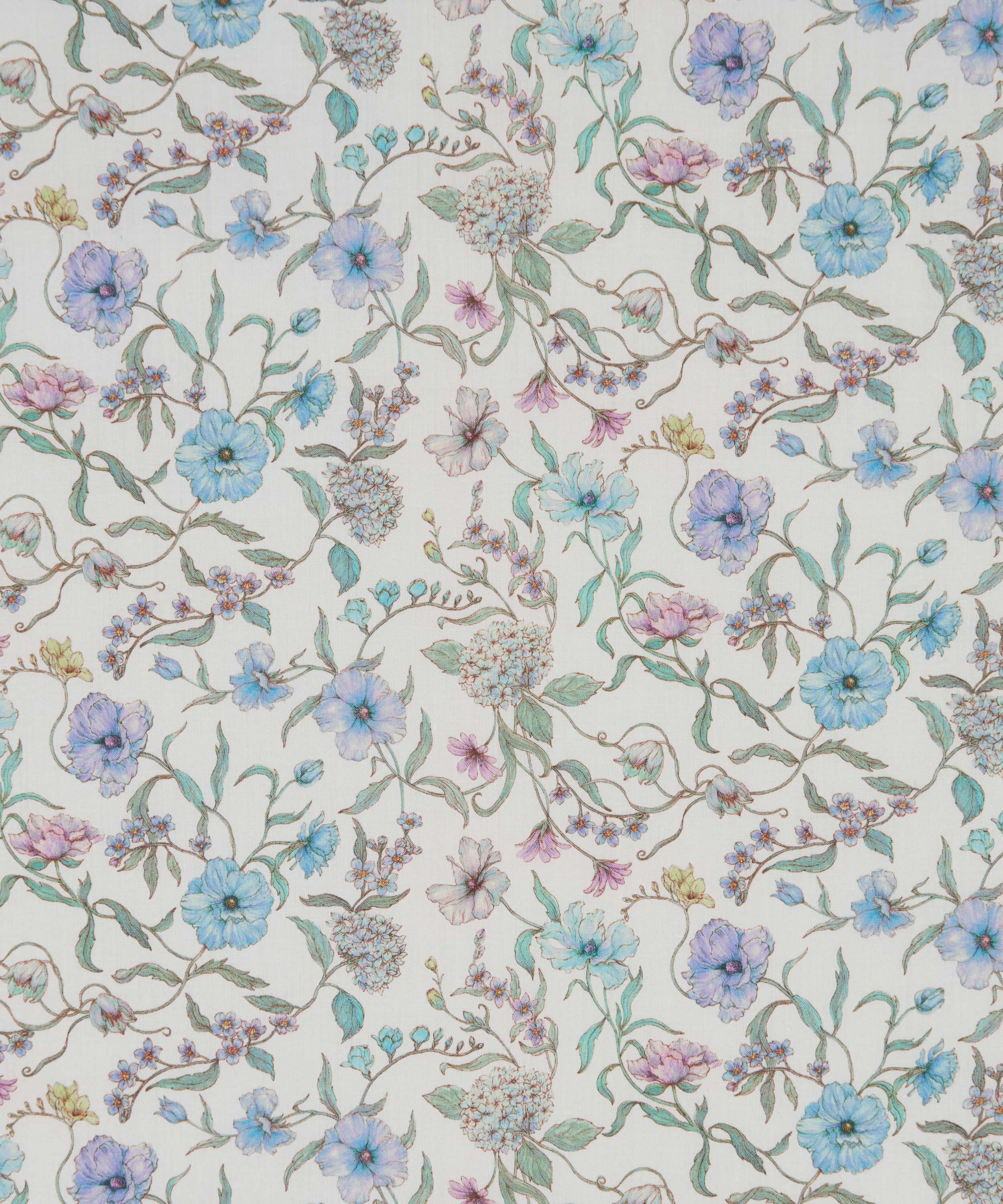 「バタシー・ブルームズ」は、リバティの1990年代アーカイブスカーフから着想を得たデザインで、アーツ・アンド・クラフツ様式を反映した、浮遊するような巻き毛状の植物モチーフが特徴です。鉛筆と水彩で手描きされており、アロウウッド、ブルースター、チックウィード、フリージア、フリチラリー、ワスレナグサ、そしてバターカップなど、春の訪れを待ちわびる花々が生き生きと咲き誇ります。