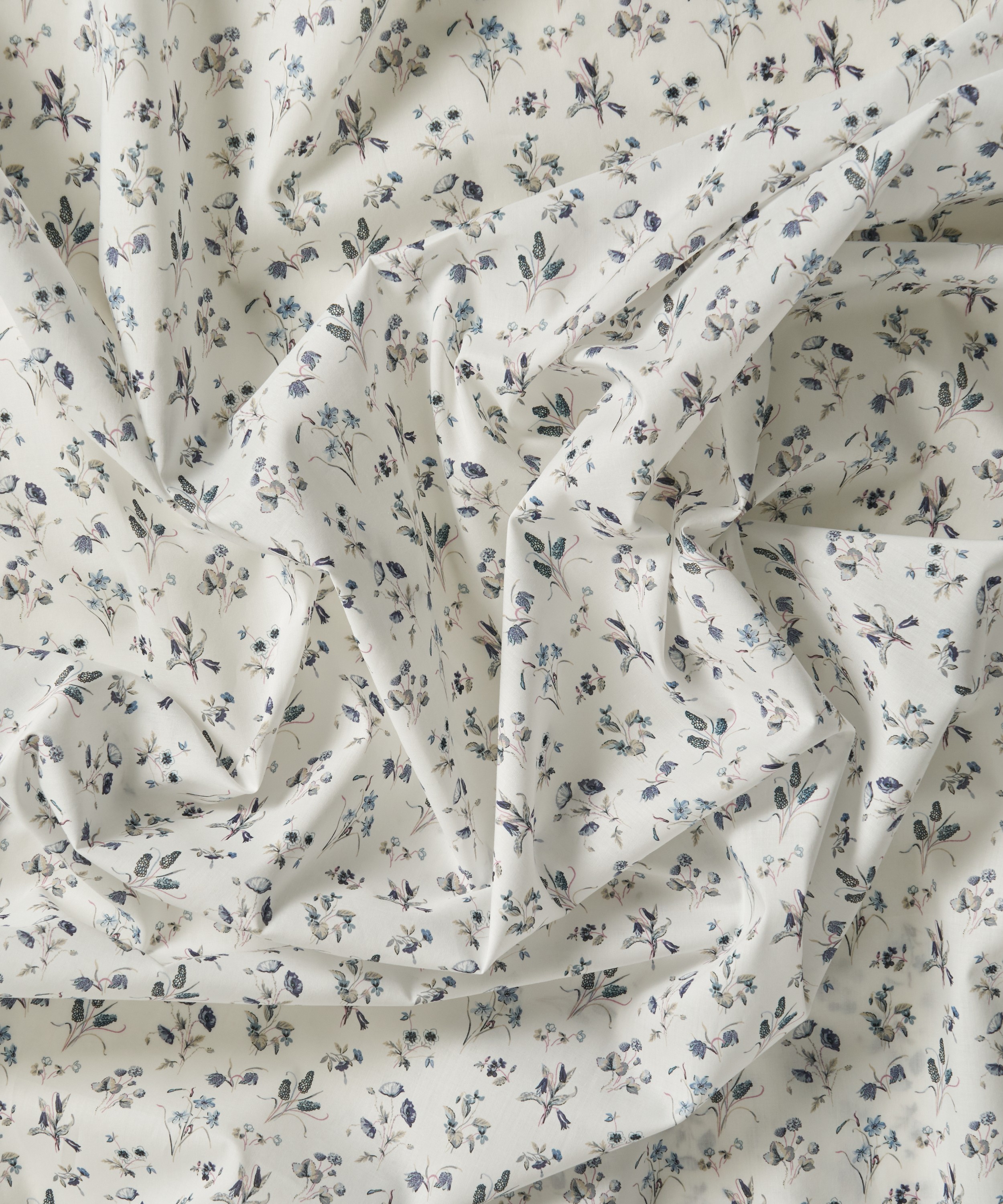 リバティのアーカイブに残るハンドペイントのアートワークに着想を得たデザインです。フリティラリアやポピー、ツリガネソウ、スイセン、ヒヤシンスといった季節の可憐な花々が軽やかに散りばめられ、春の草原のやわらかな空気感を表現しています。繊細なディテールで描かれた優美な小花は、色調の微妙な変化を映し出し、それぞれの花のやわらかな陰影を際立たせています。