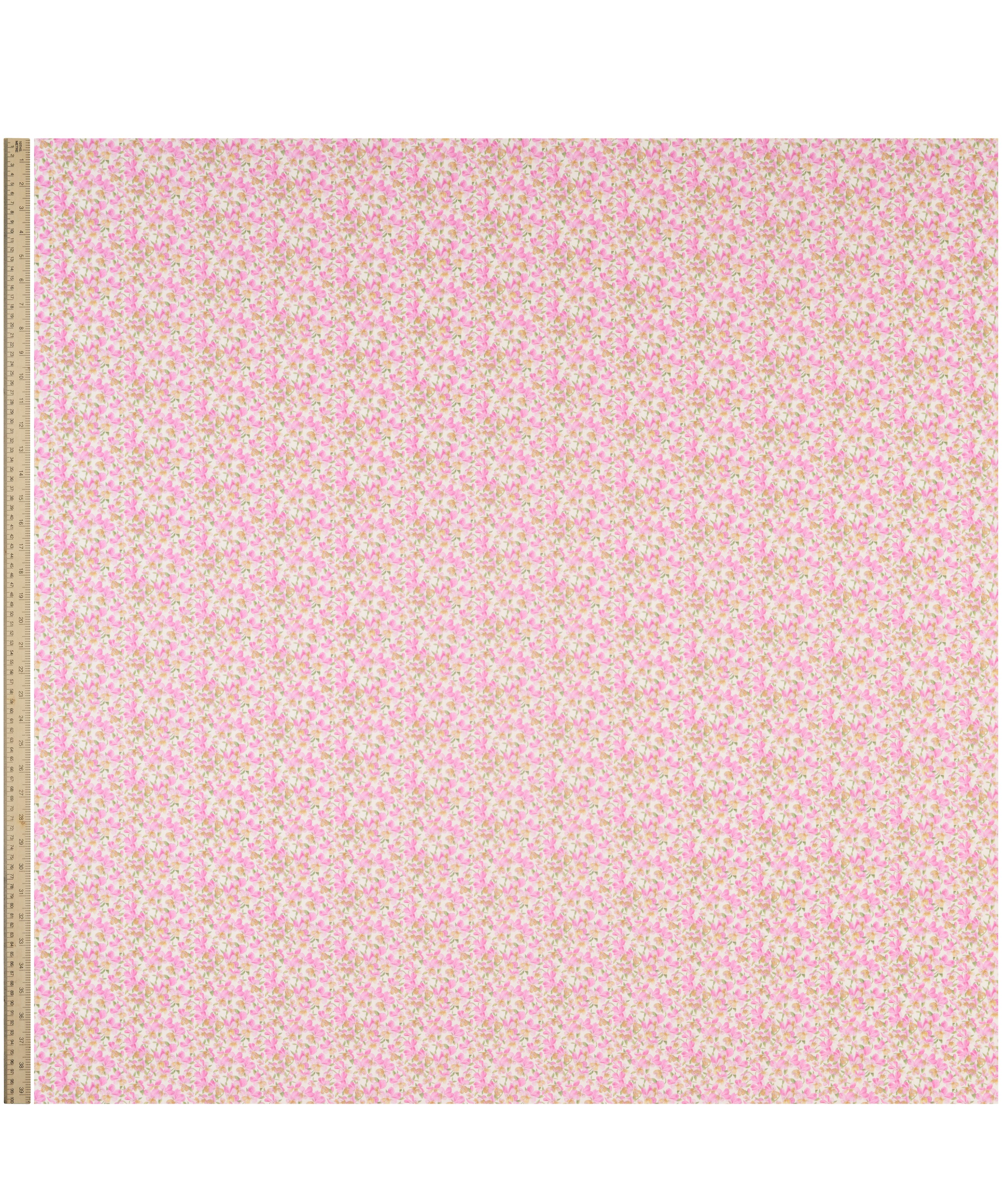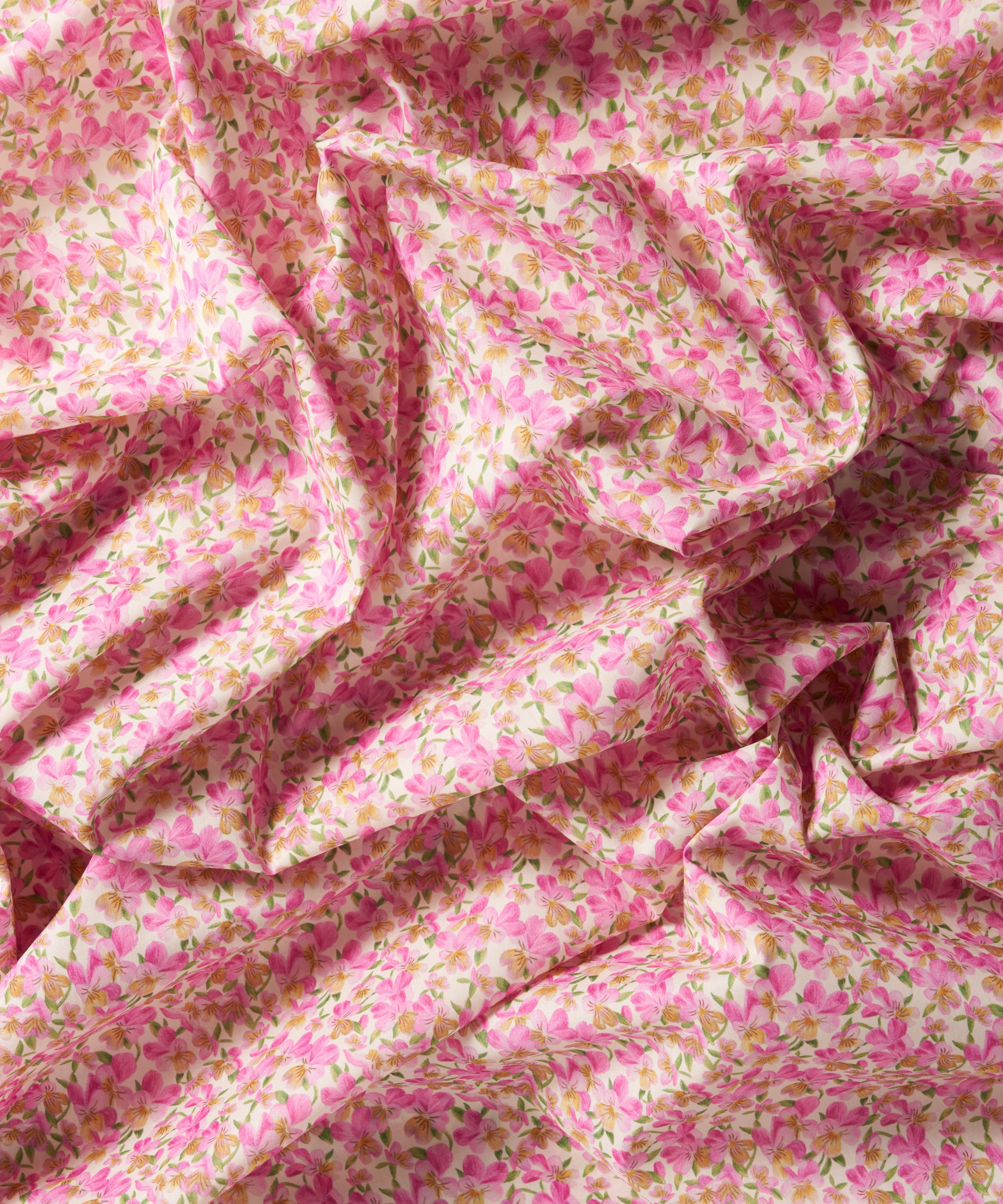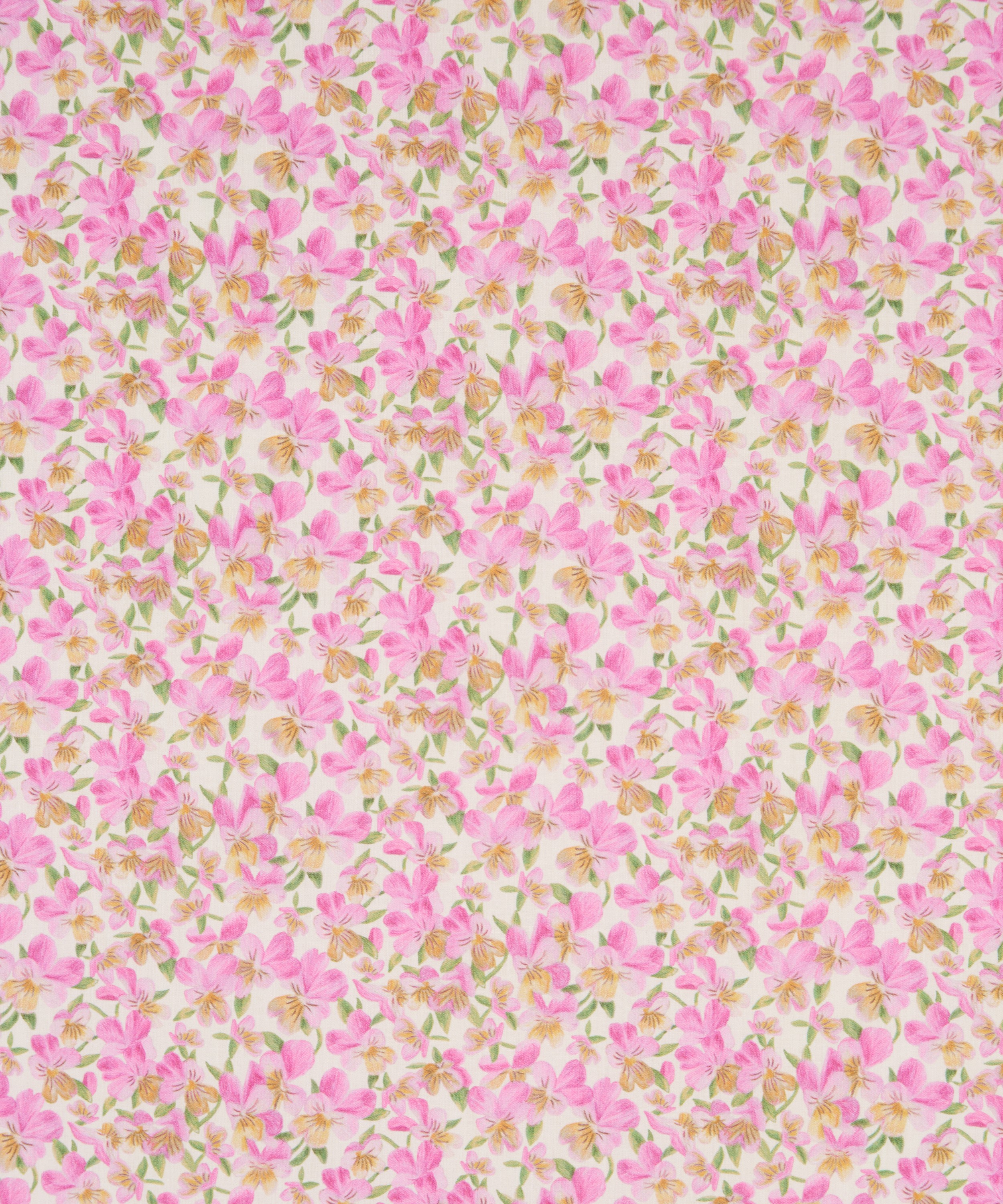 リバティのスタジオで、発色豊かな色鉛筆を用いて手描きされたデザインです。パンジーとビオラが一面に咲き広がるボタニカルパターンを描き出し、そのやわらかな花びらが布の上を舞うように表現されています。繊細な陰影と重ねられた色彩によって、これらの親しまれてきた花々が持つ、儚くも美しい表情とベルベットのような質感を丁寧に捉えています。