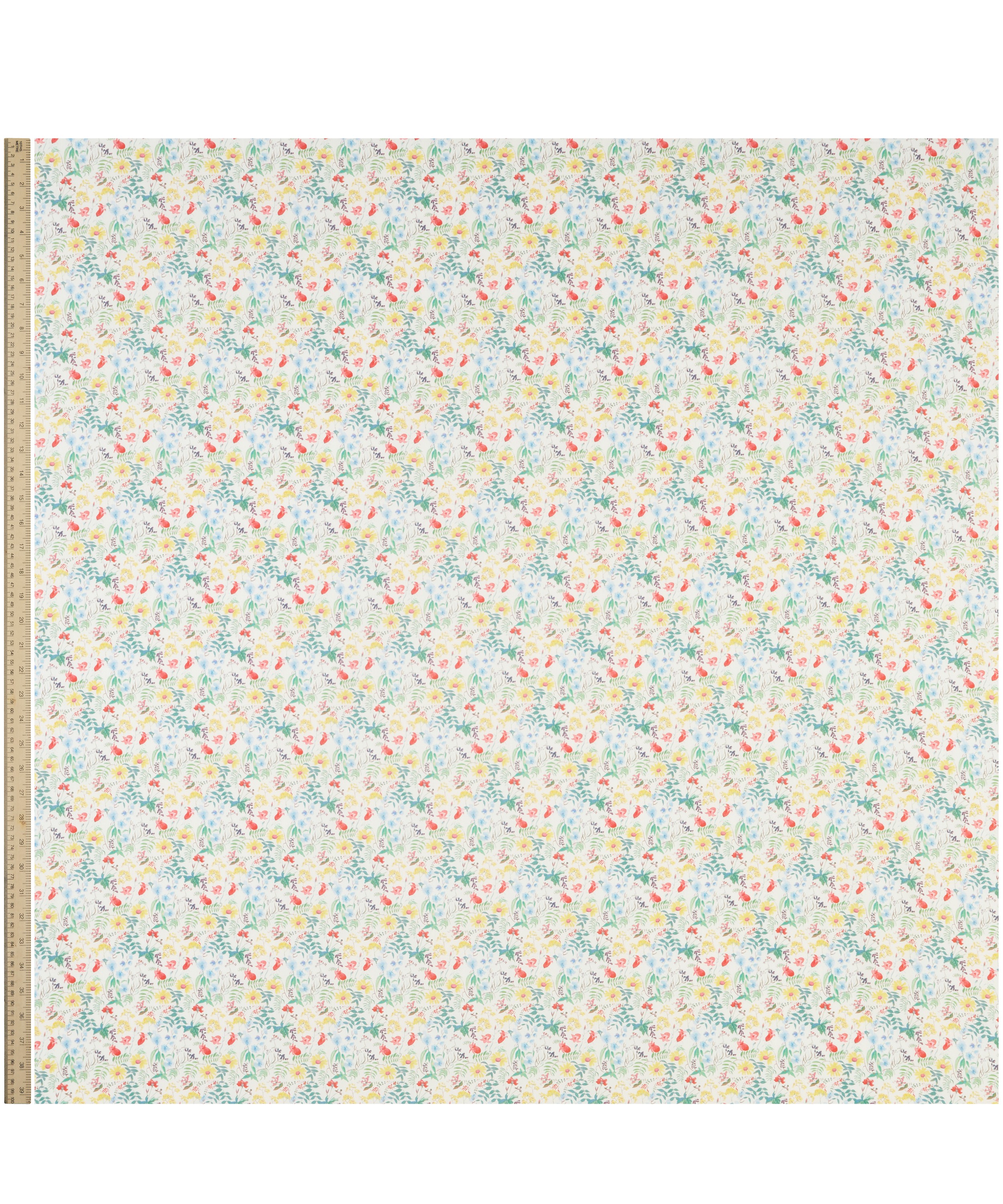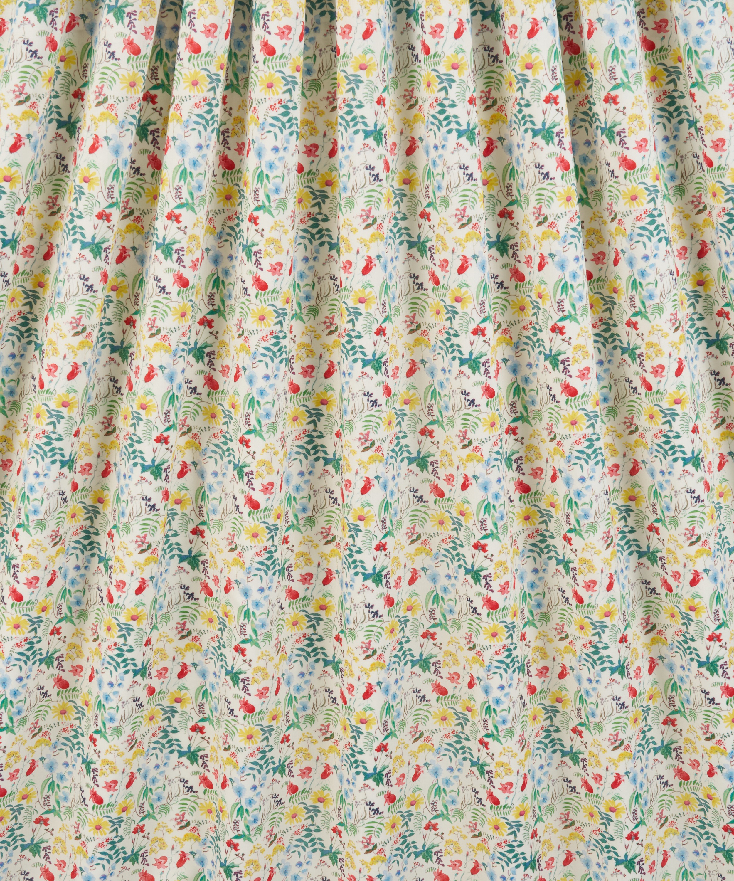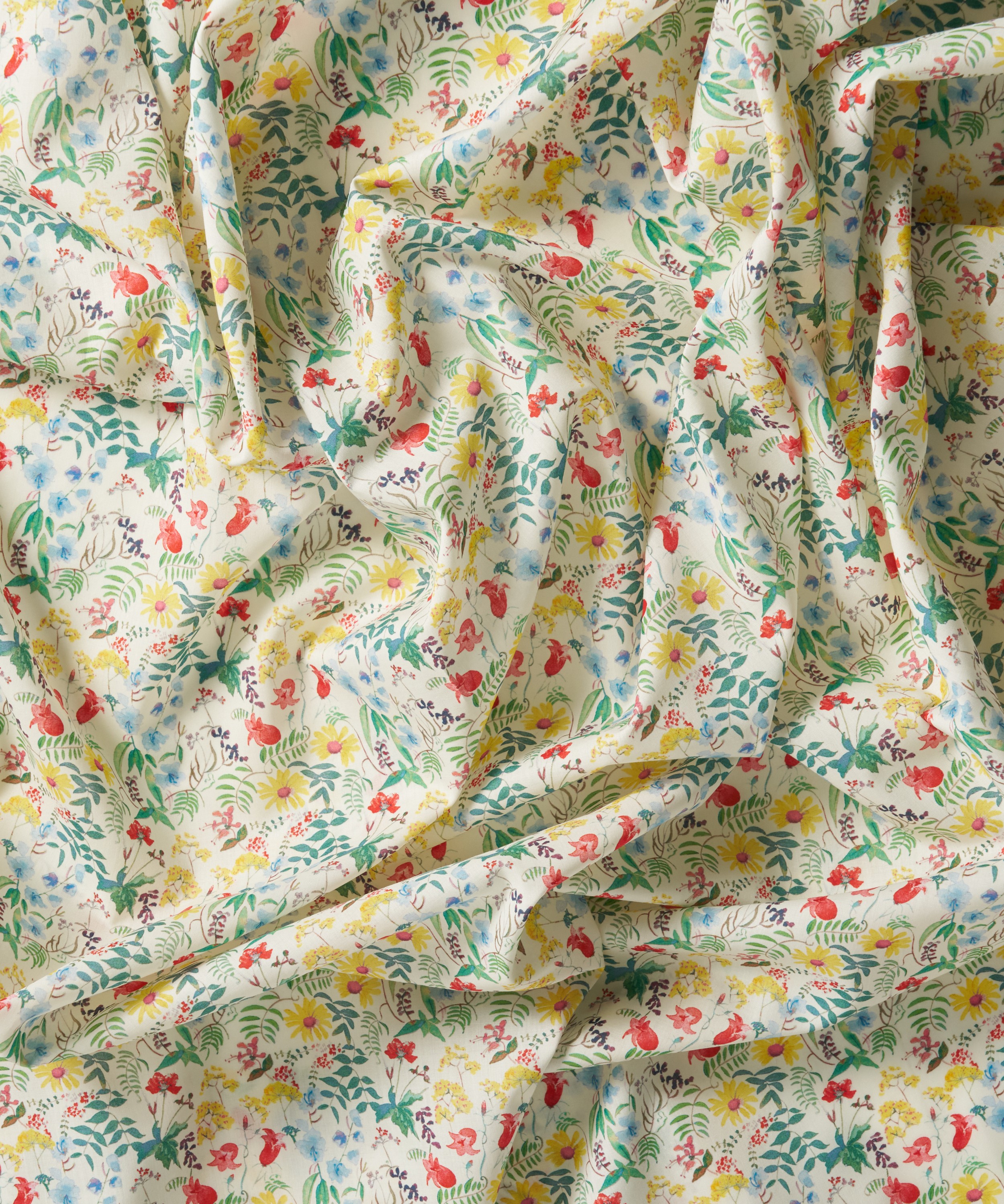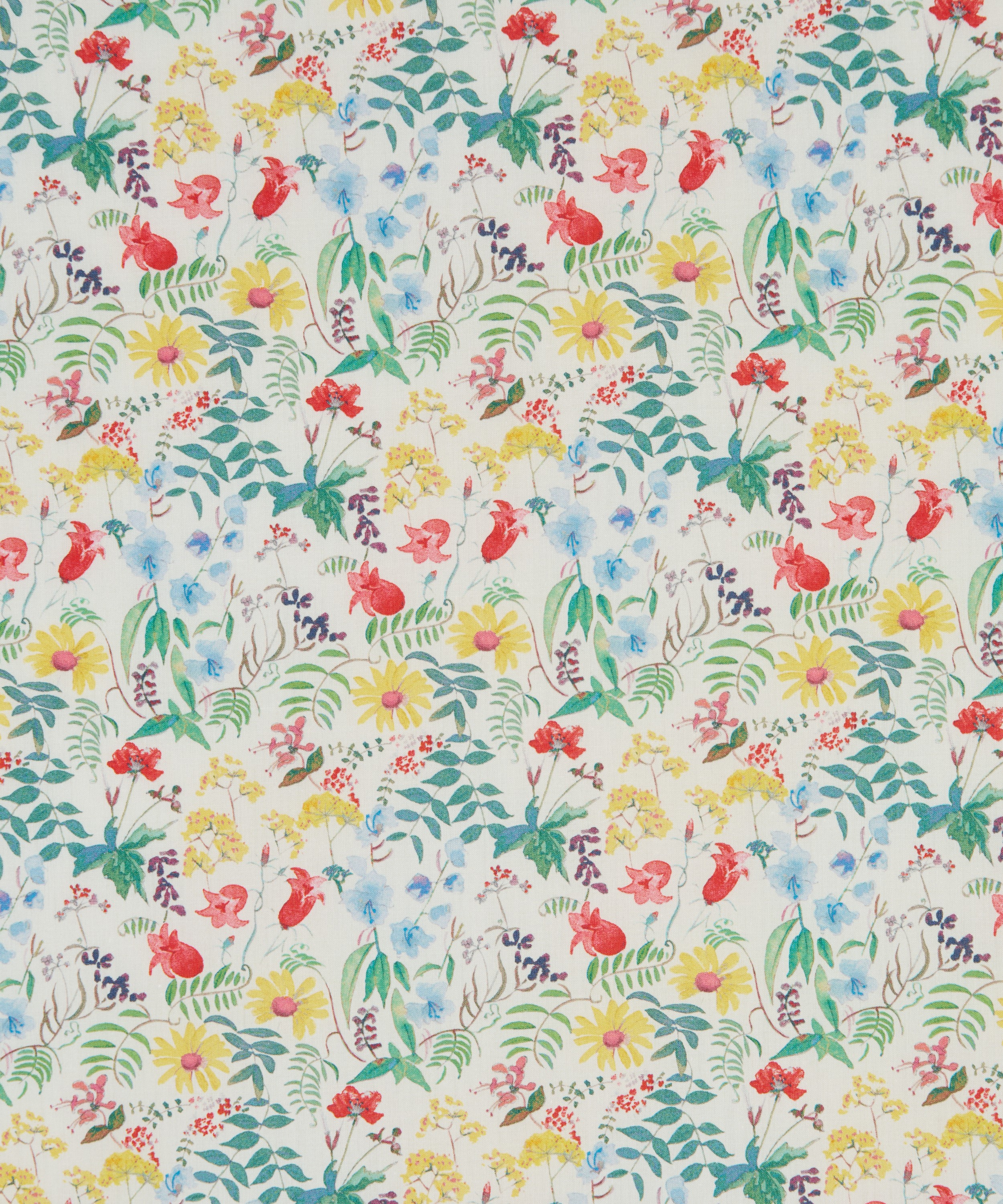 リバティのアーカイブから見出された2点の水彩画を組み合わせて生まれたデザインです。野の花々やシダ、葉の広がりの中に、ブルーベルやシクラメン、デイジー、カウパセリなどが軽やかに広がります。生き生きとしたアレンジメントによって、花々が重なり合い、豊かな広がりを感じさせます。