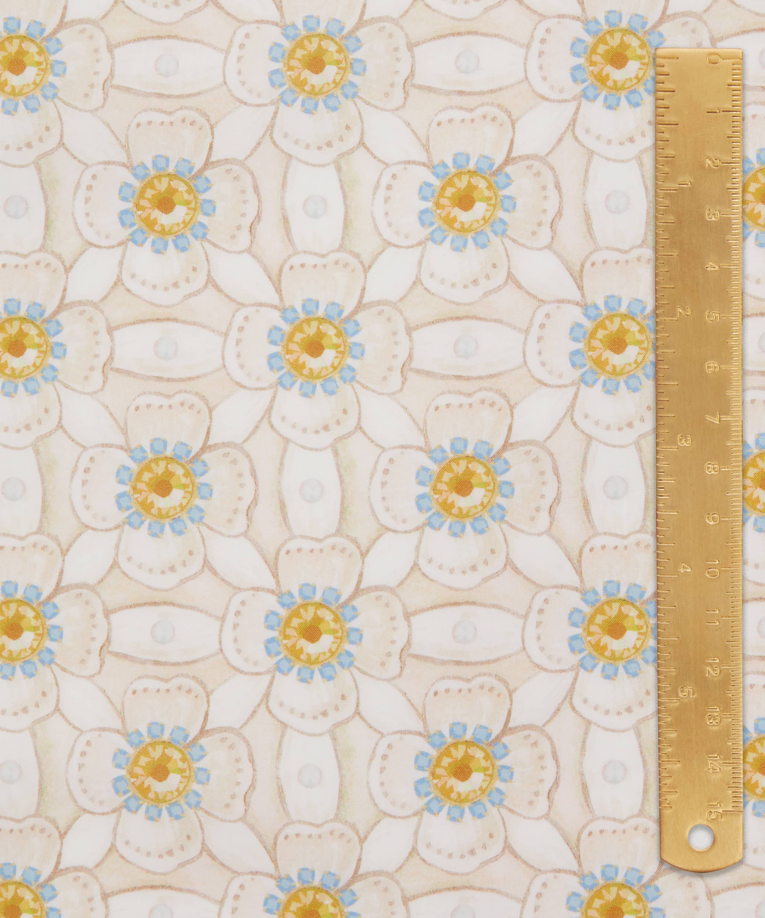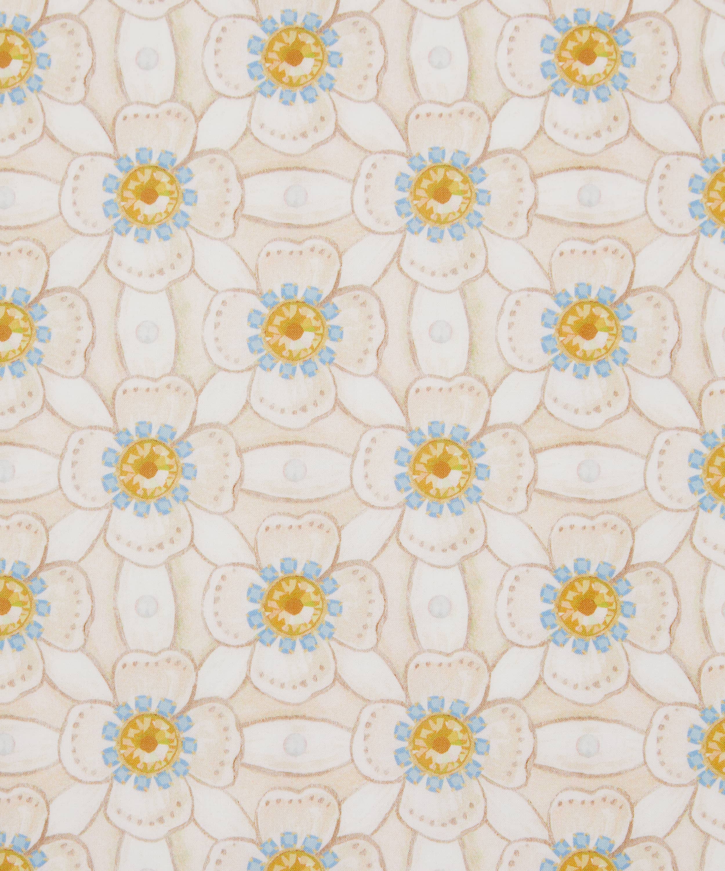 エリザベス1世がオックスフォード近くのディッチリーで過ごした時間を記念した有名な肖像画「ディッチリーポートレート」にインスパイアされた「ロイヤル・ジュエル」。ガッシュで手描きされ、金と銀のメタリックペイントでアクセントを加えたこのパターンは、王室の装飾された衣服の豪華さを反映し、女王のドレスに見られる花びらのような布の扱いを表現しています。