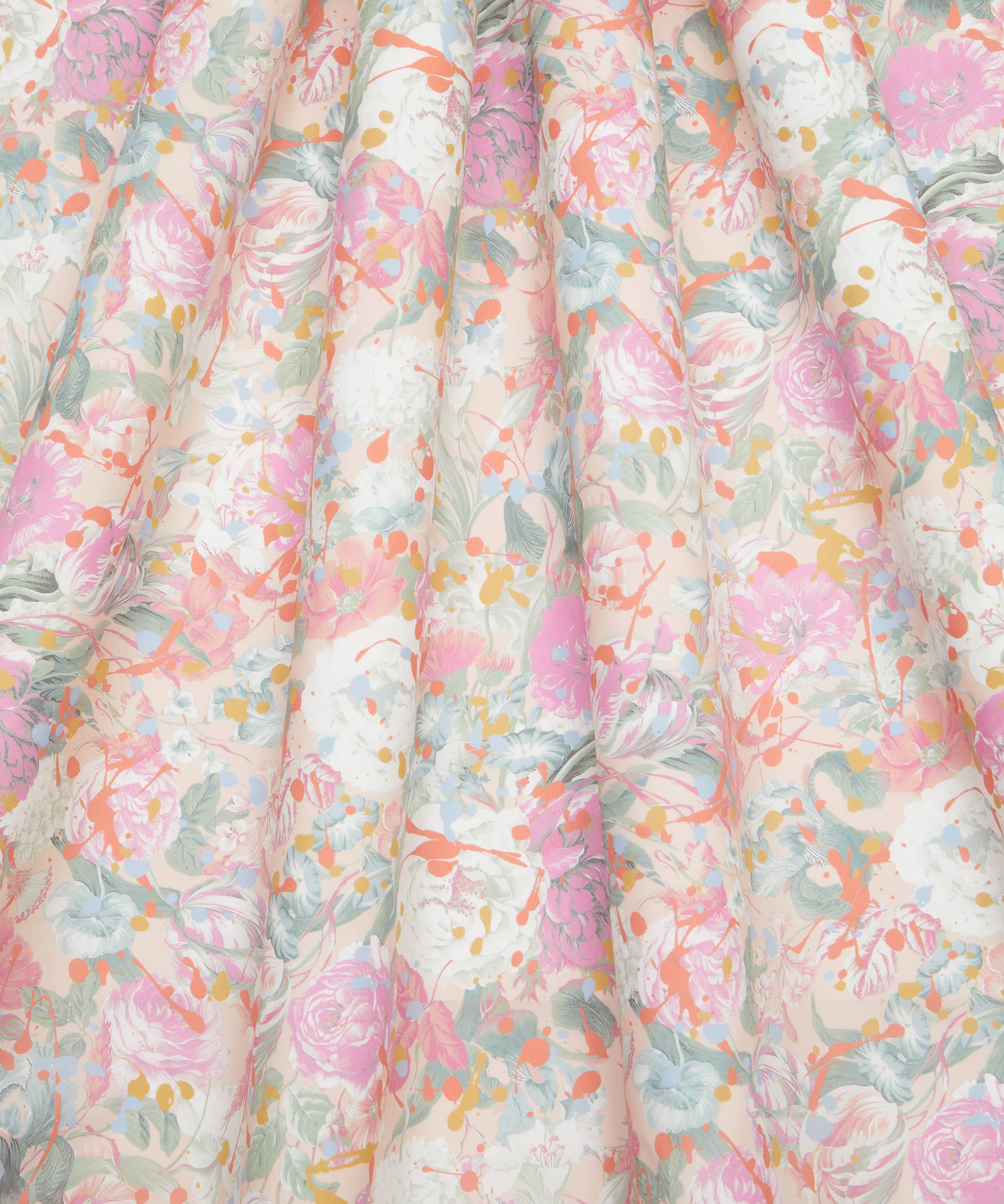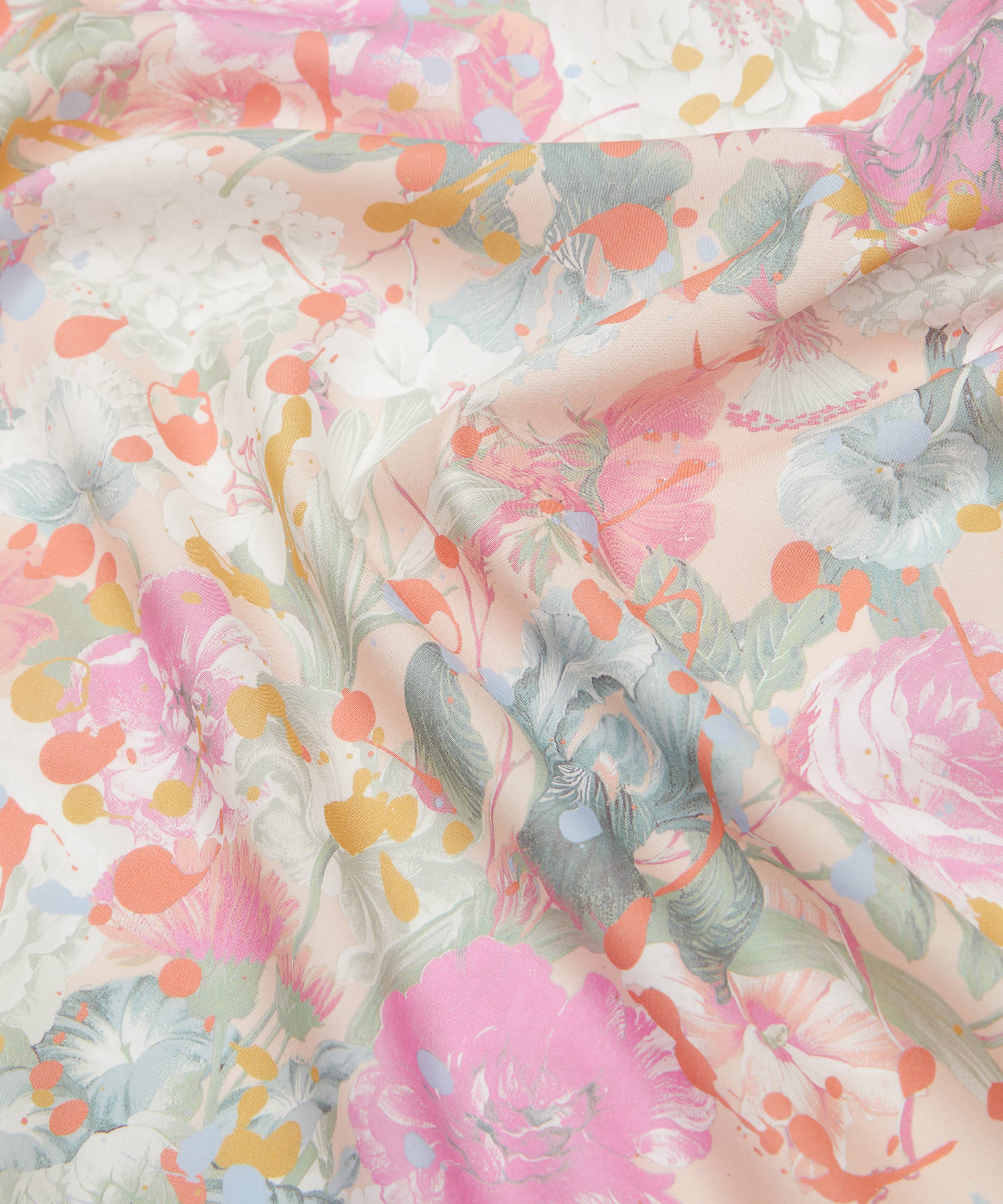 反骨精神を表現したこのデザインは、リバティデザインチームがオリジナルの手描きスカーフを再構築し、強烈な印象を与えるパターンへと変貌させました。伝統的な花柄の上に大胆でダイナミックなペイントの飛び散りが施された「パンク・ポゥジー」は秩序と混沌の境界を曖昧にし、リバティの豊かな歴史と反抗的な現代的エッジを融合させています。