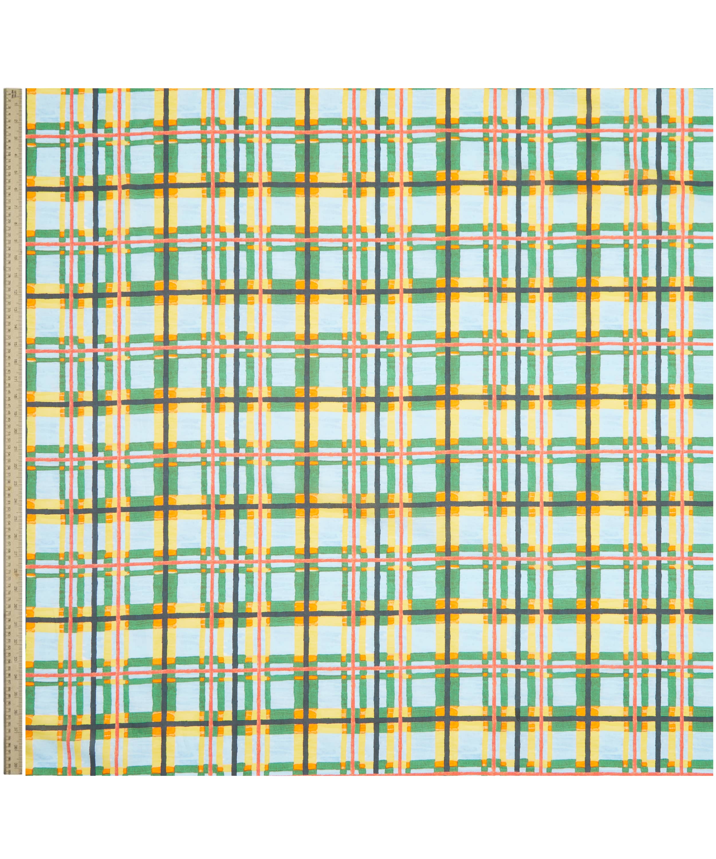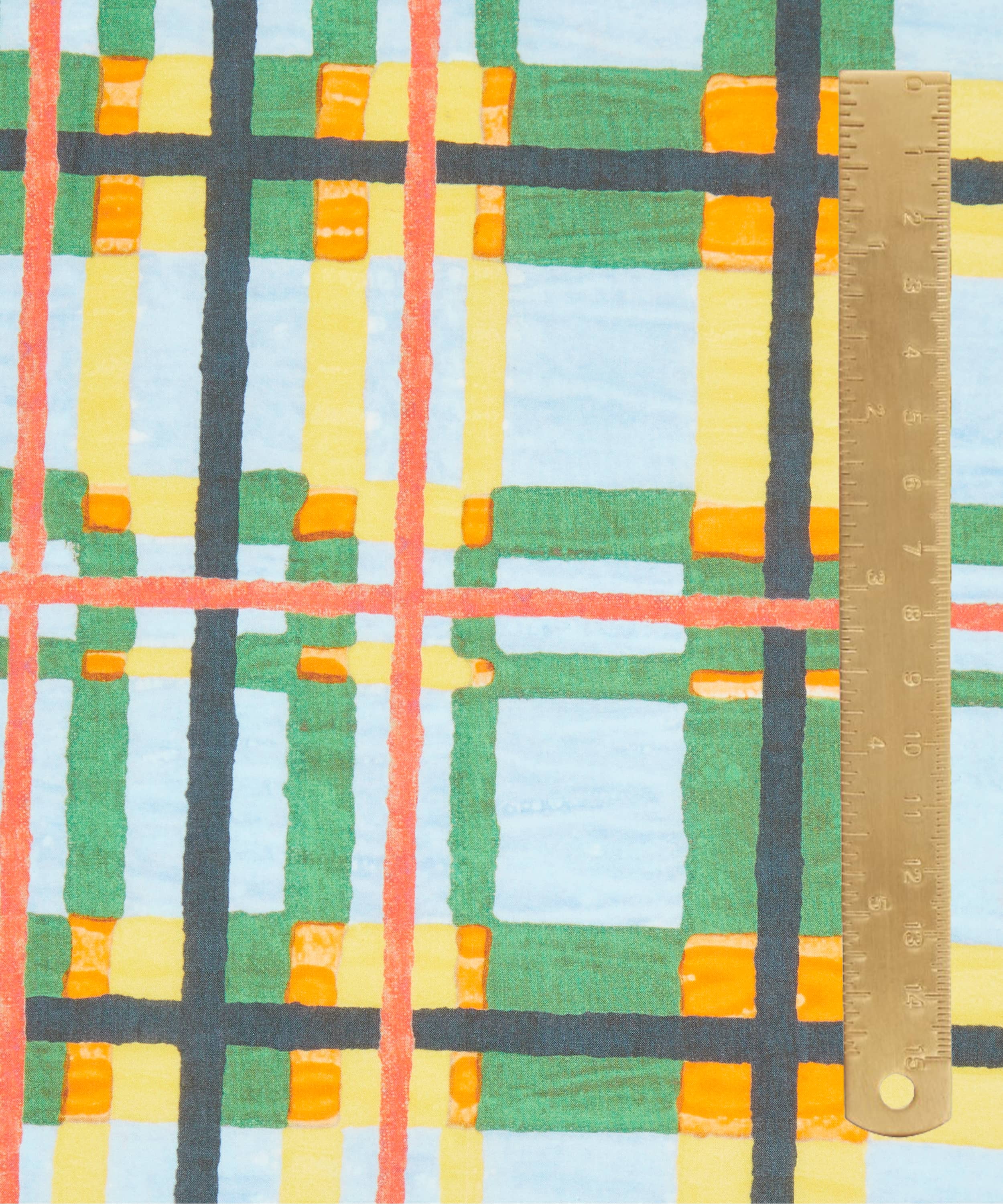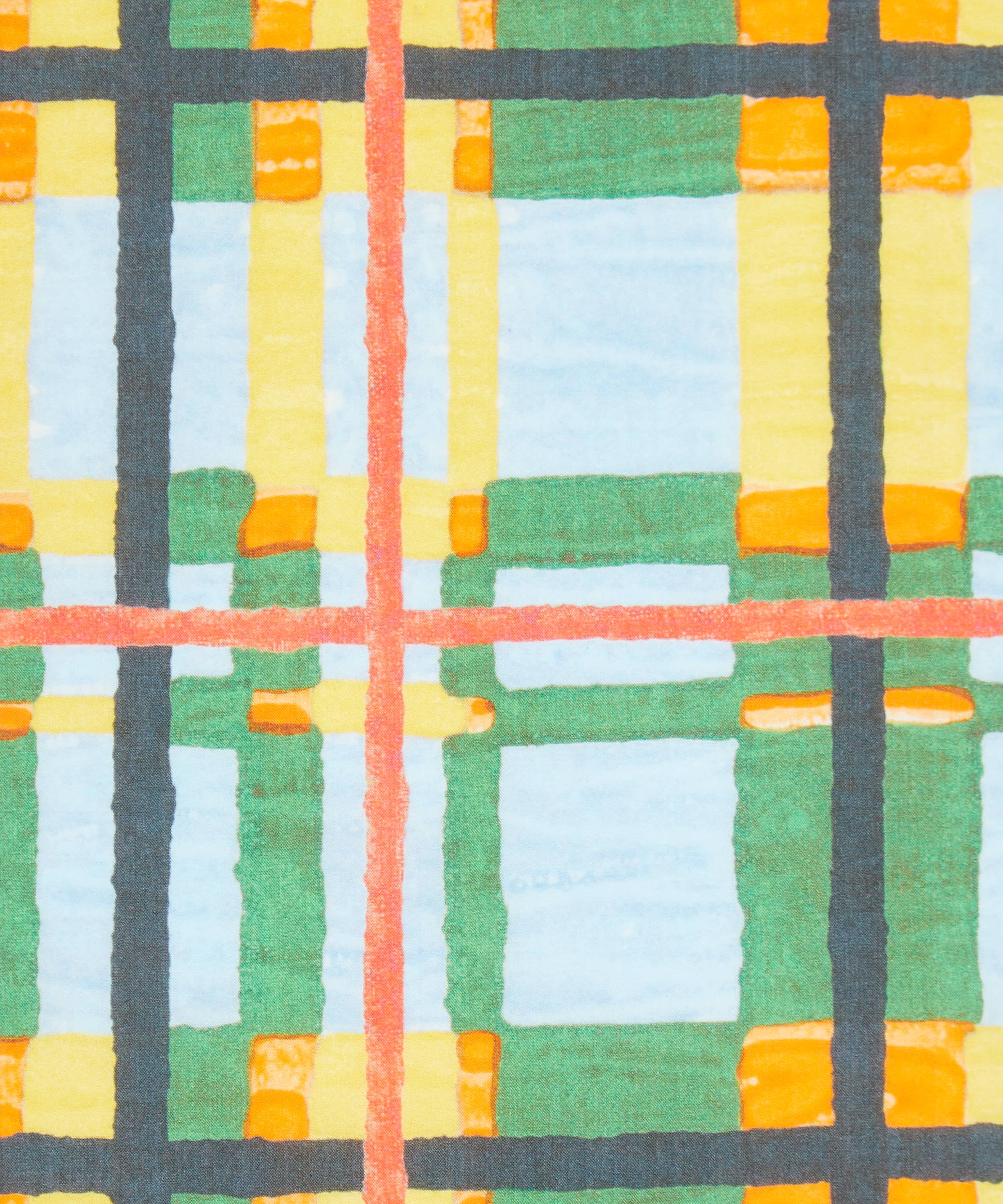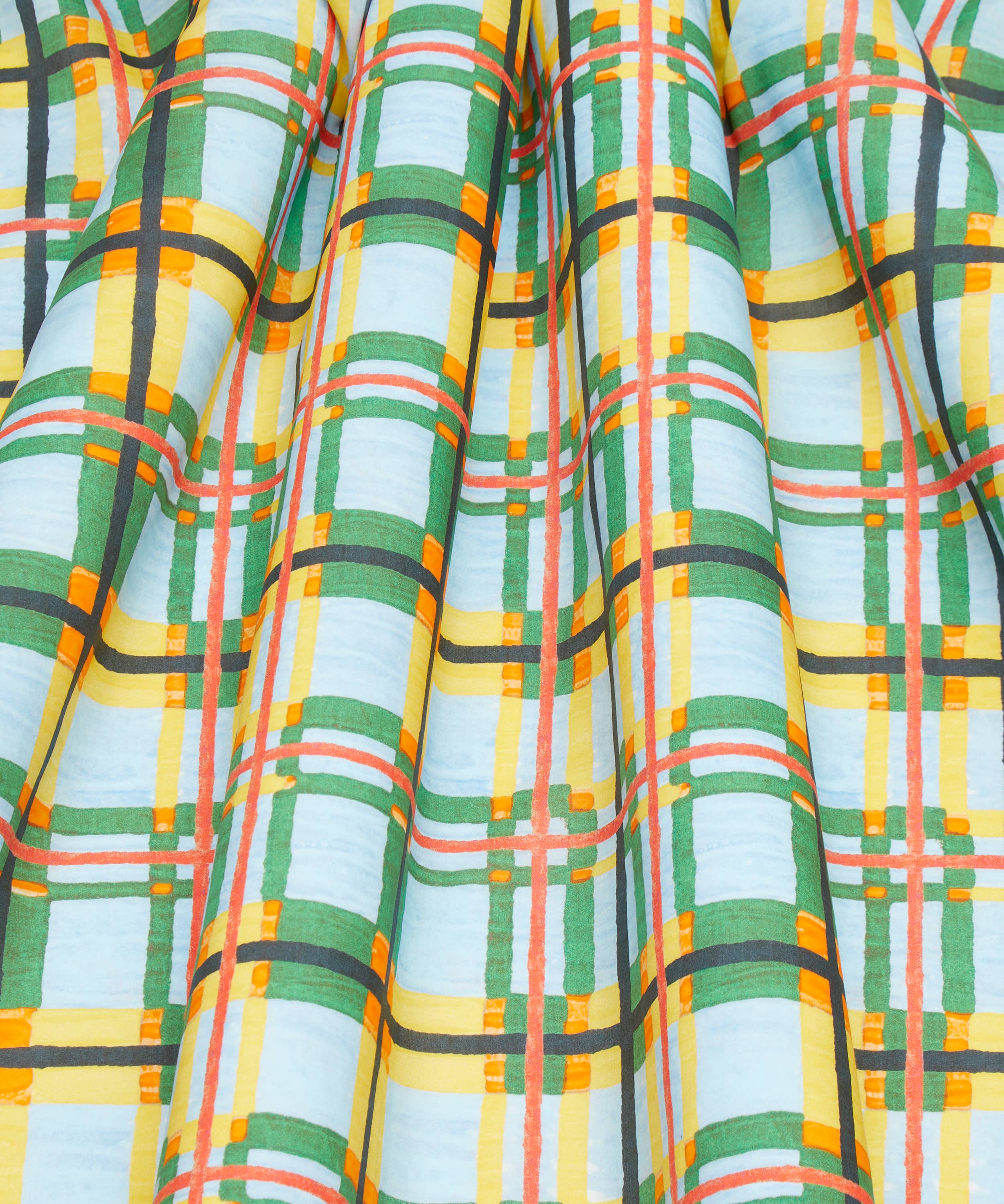 1970年のリバティプリントの試し刷り紙をベースにした「フローリー」は、絵画的でモダンなチェック柄が今コレクションの大胆な花柄と見事に調和します。オリジナルデザインのテクスチャーを丁寧に再現しながら、強い格子模様を柔らかく調整することで、より繊細で優雅な印象を与えています。