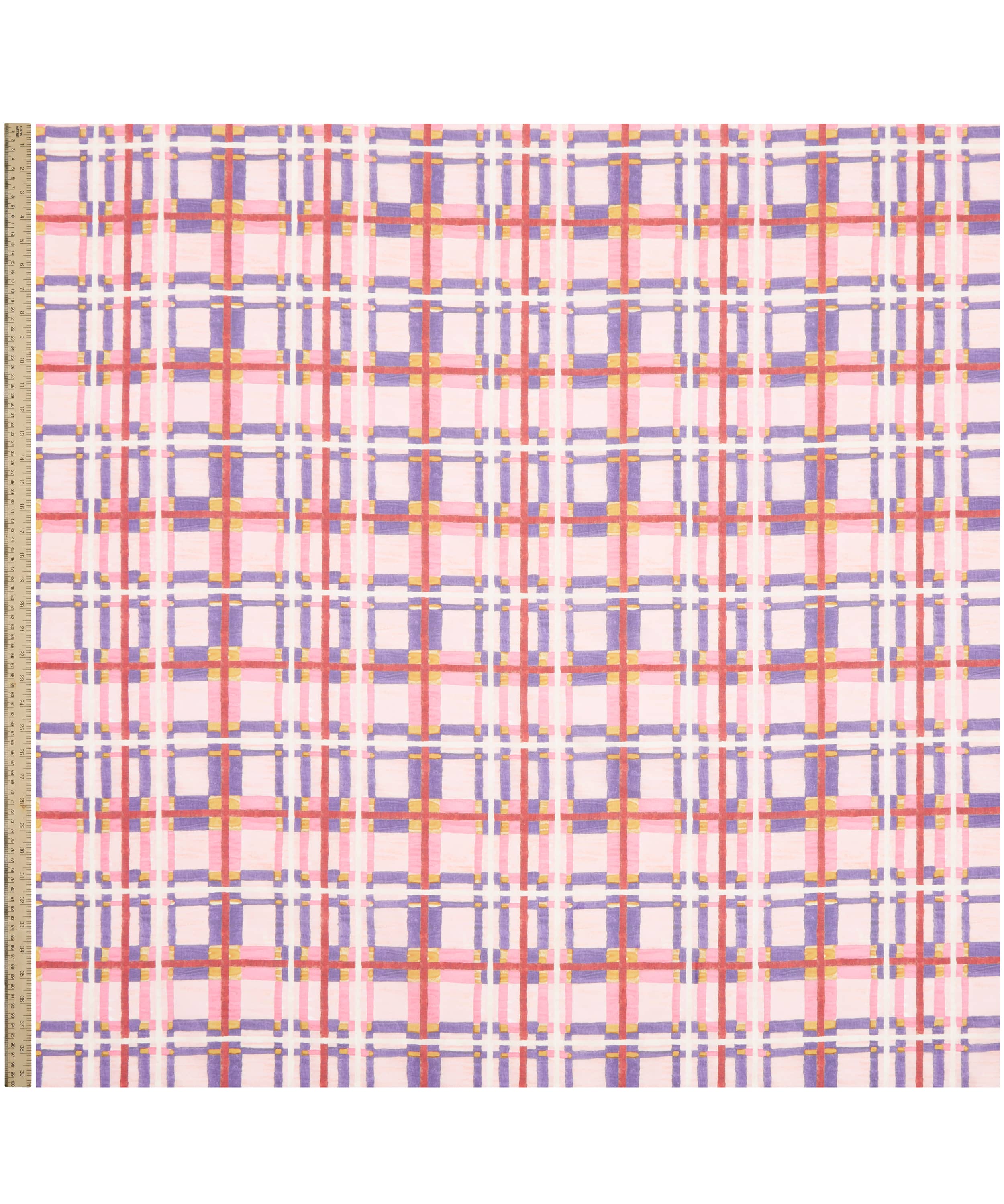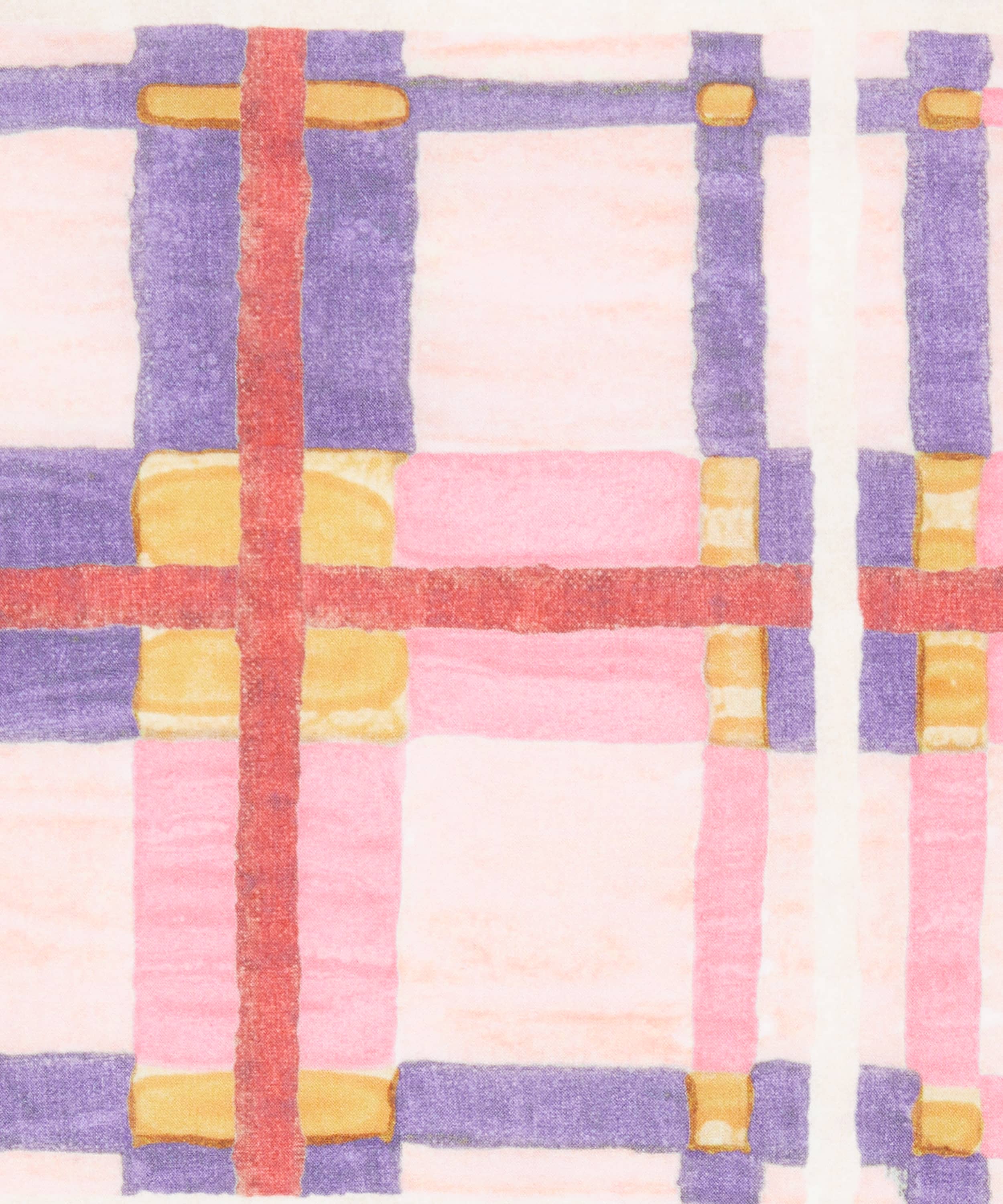 1970年のリバティプリントの試し刷り紙をベースにした「フローリー」は、絵画的でモダンなチェック柄が今コレクションの大胆な花柄と見事に調和します。オリジナルデザインのテクスチャーを丁寧に再現しながら、強い格子模様を柔らかく調整することで、より繊細で優雅な印象を与えています。