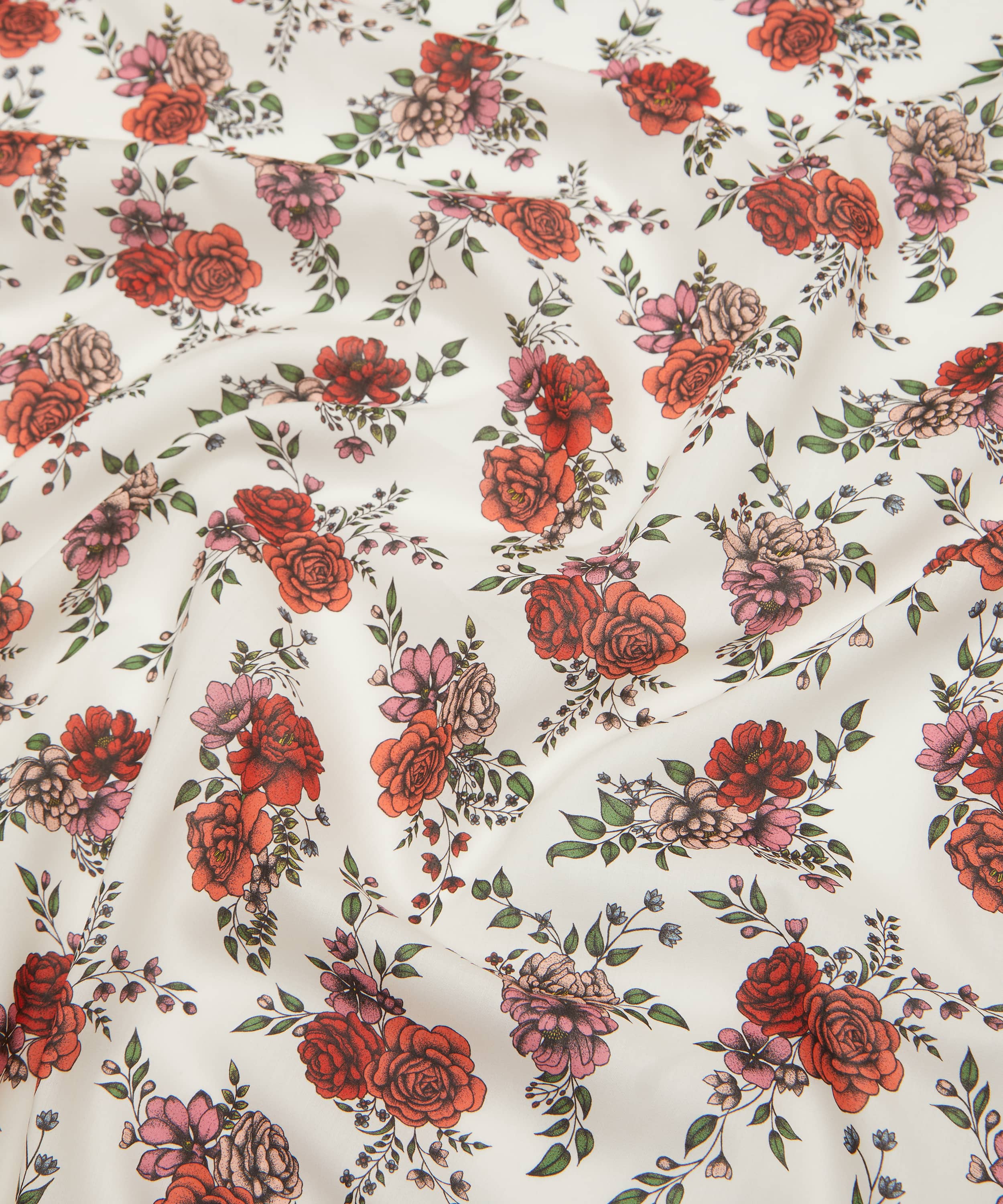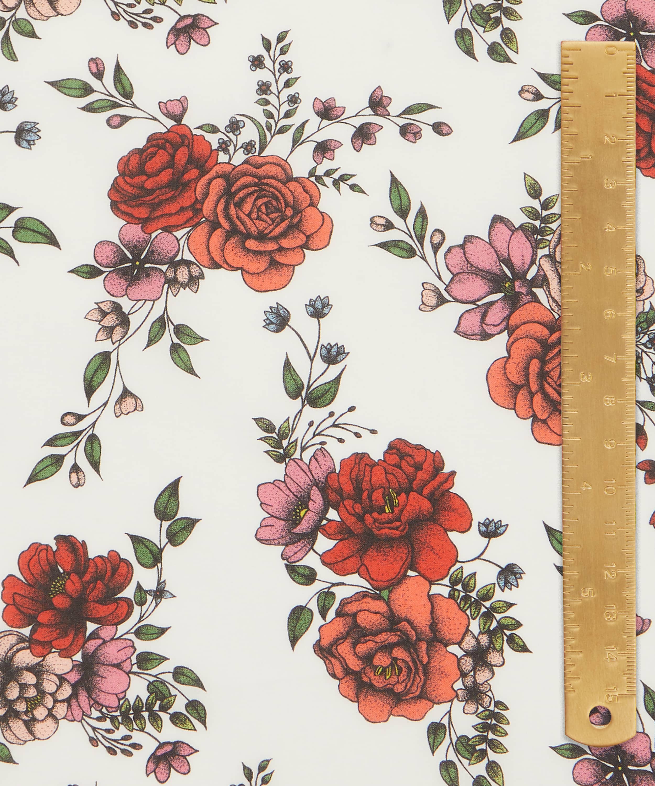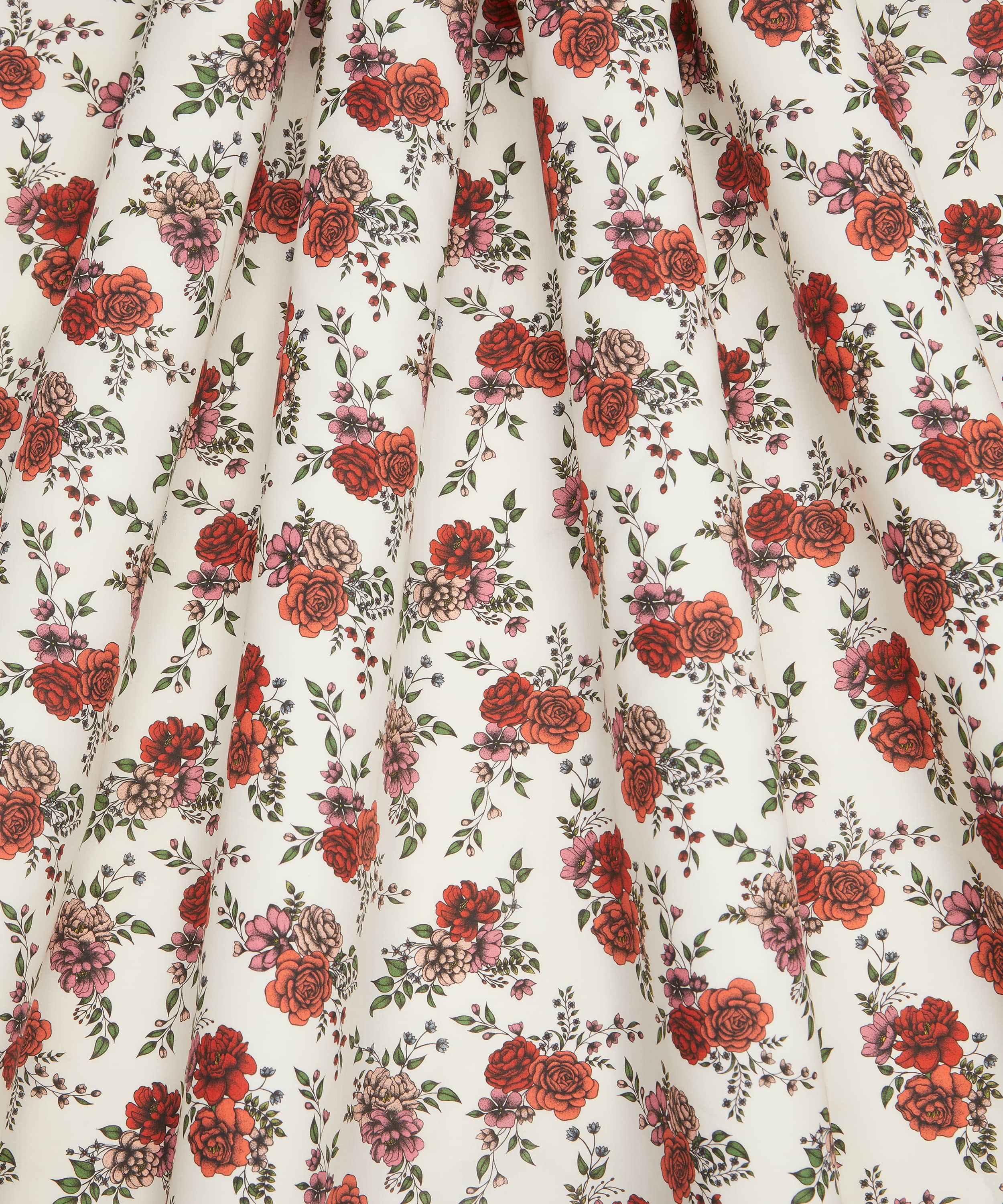 リバティデザインスタジオでファインライナーペンを使って手描きされたタトゥースタイルのつるが絡まった花柄のプリントです。タトゥーアートの繊細な針跡を彷彿とさせるこのデザインでは、バラとシャクヤクの花束が布の上を浮かぶように散りばめられ、多方向に繰り返し配置されています。