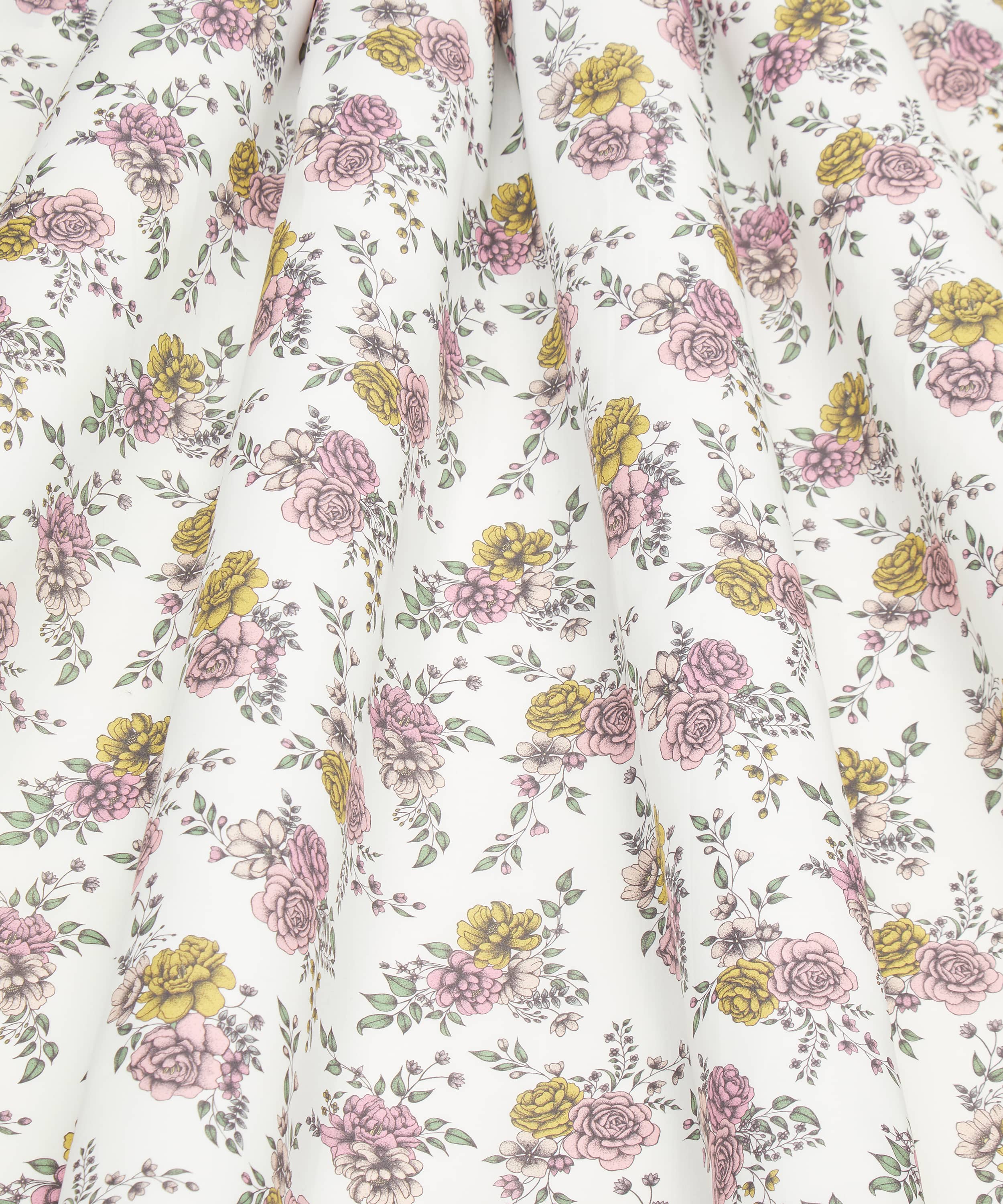 リバティデザインスタジオでファインライナーペンを使って手描きされたタトゥースタイルのつるが絡まった花柄のプリントです。タトゥーアートの繊細な針跡を彷彿とさせるこのデザインでは、バラとシャクヤクの花束が布の上を浮かぶように散りばめられ、多方向に繰り返し配置されています。