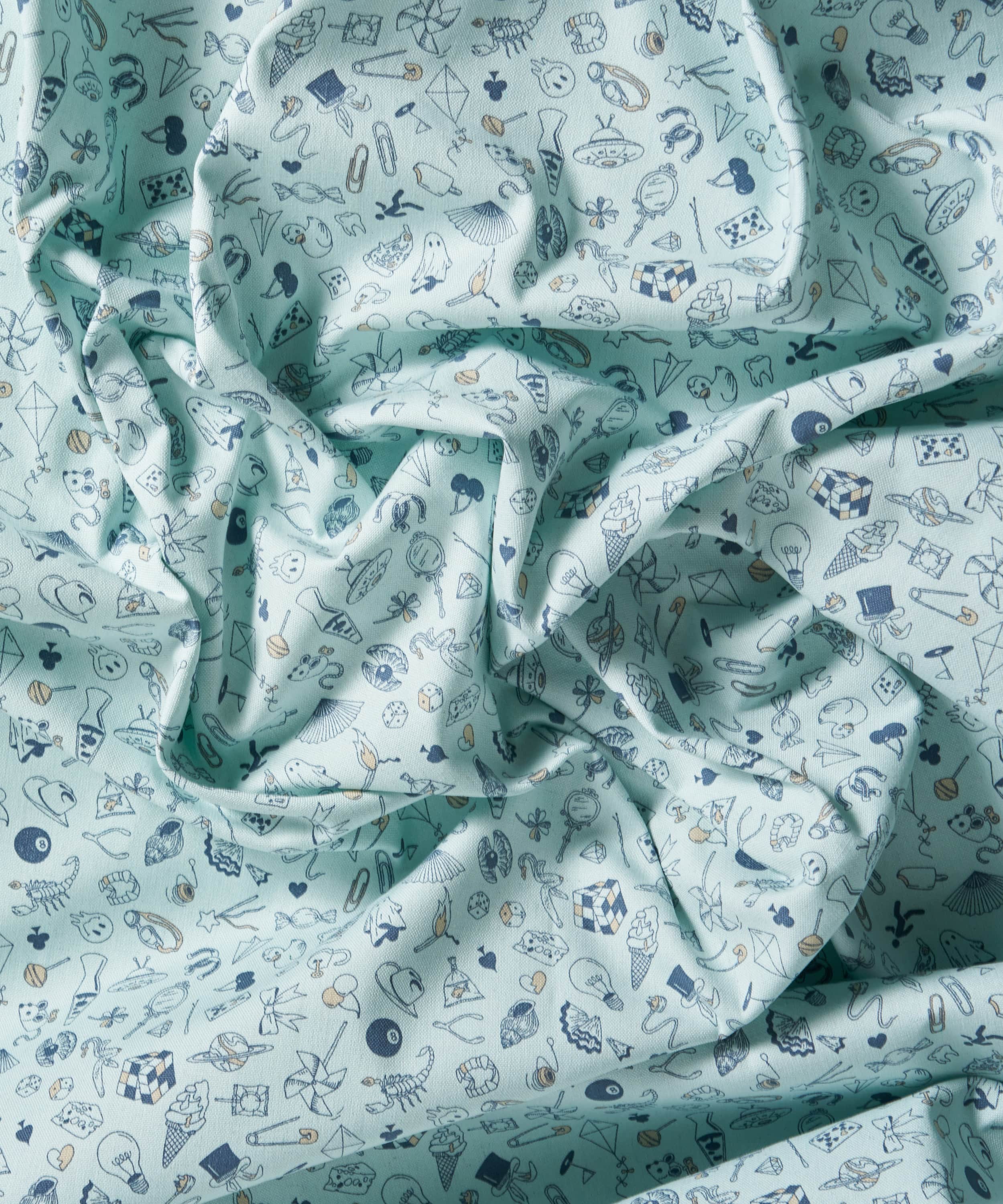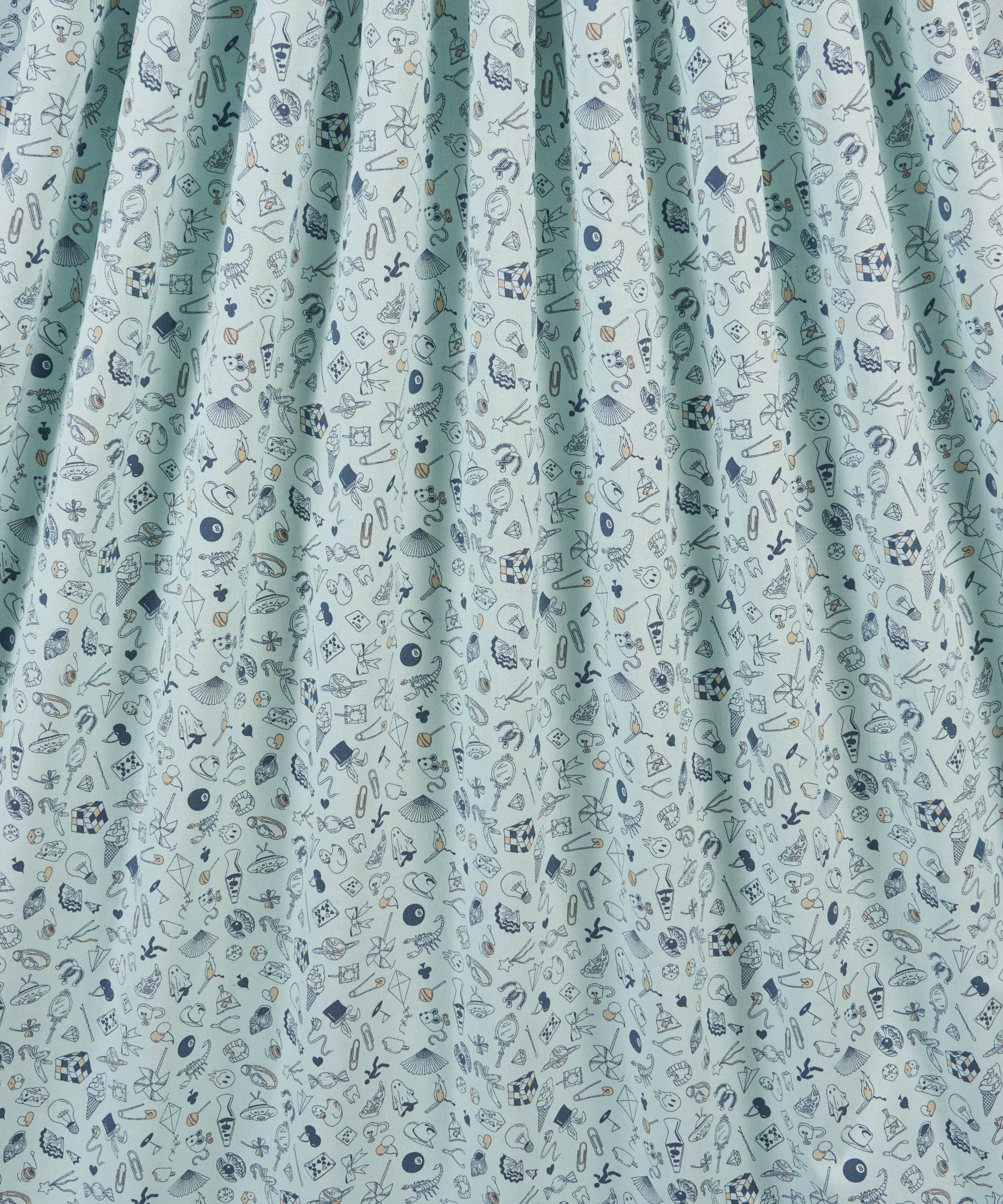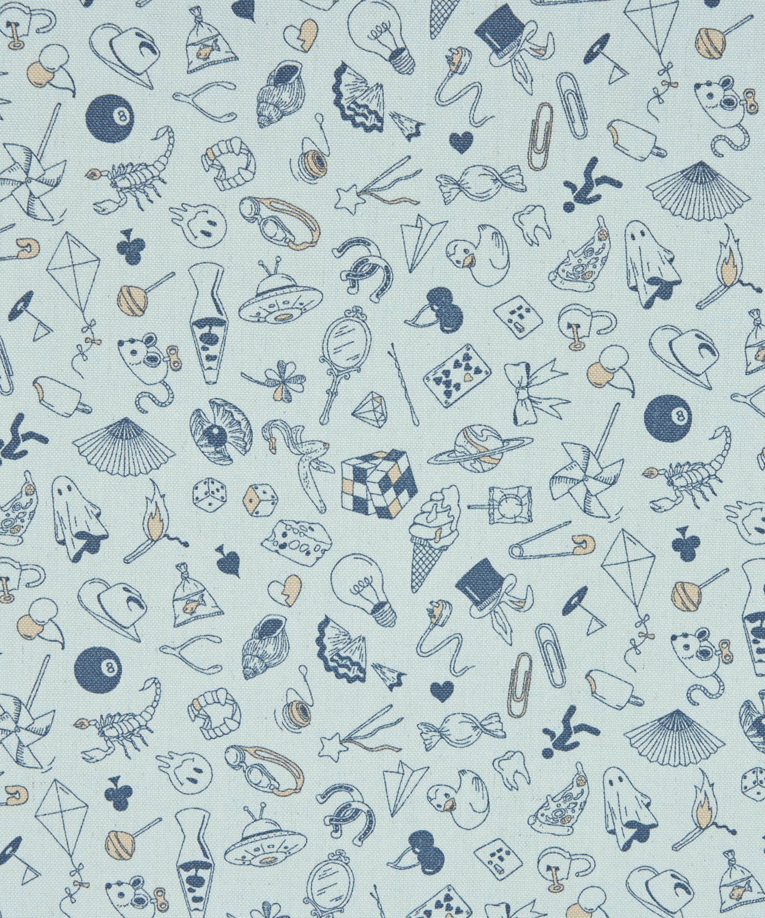 タトゥーアーティストのフラッシュシートにインスパイアされた楽しいカンバセーショナルデザインです。リバティデザインスタジオでファインライナーペンを使って作成されたこのパターンは、グラフィックのディテールの中に鮮やかな色彩が加わりさらにデザインを引き立てています。よく見ると、ラヴァランプ、サイコロ、惑星、クリップ、電球、さらにはバナナの皮といったユニークなオブジェクトの遊び心あふれる、まさにランダムさの無限の集まりです。