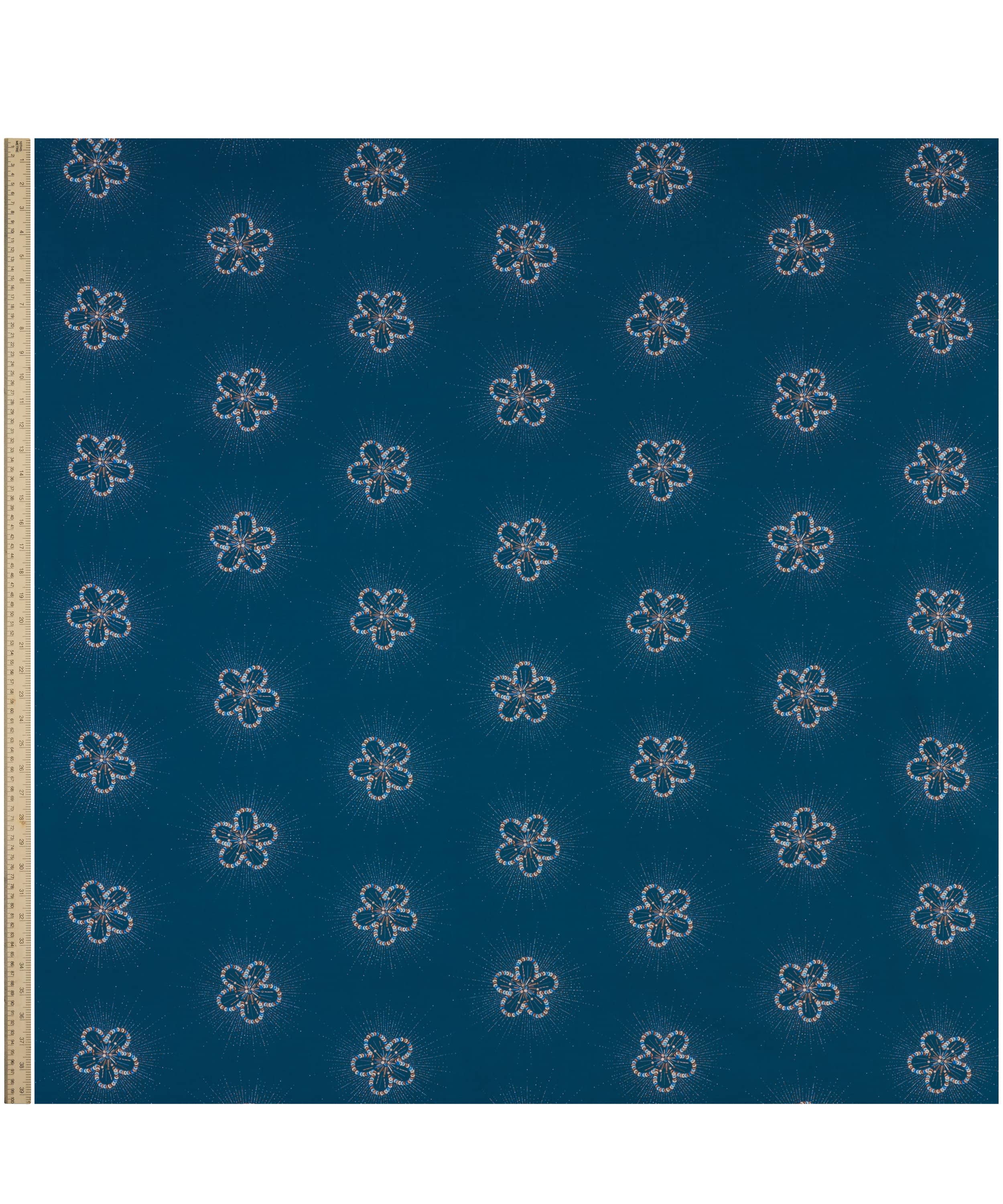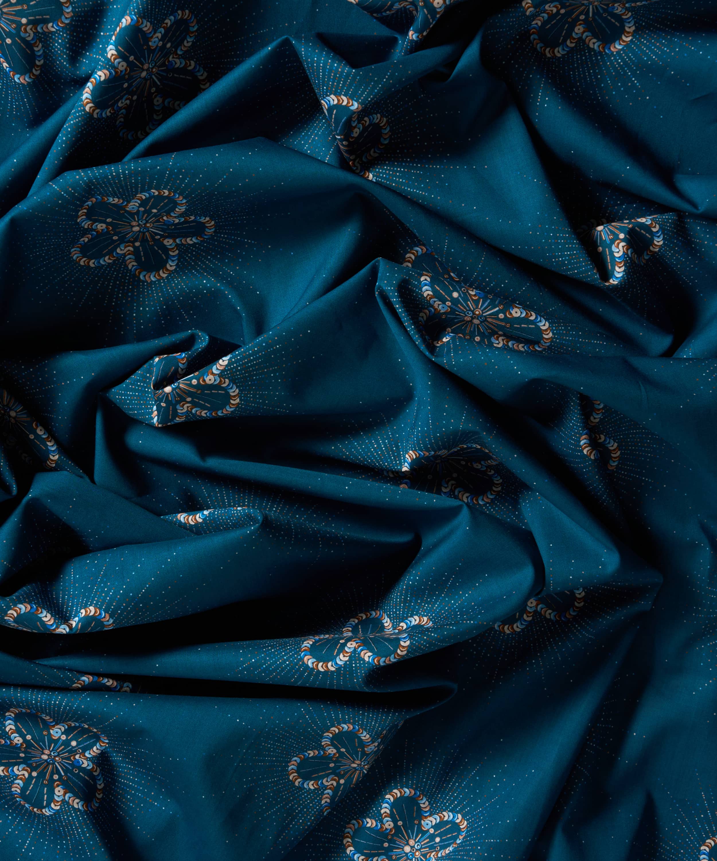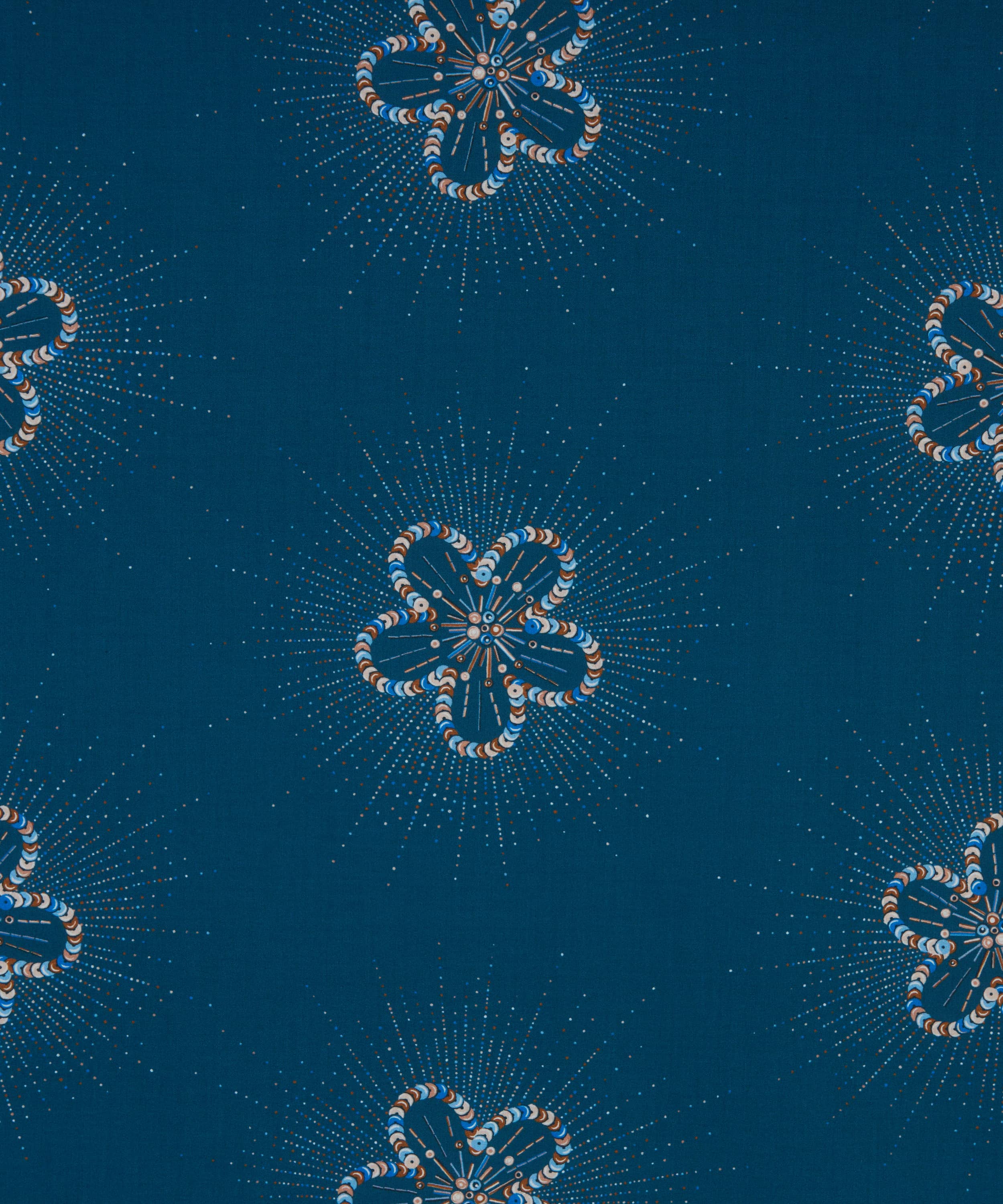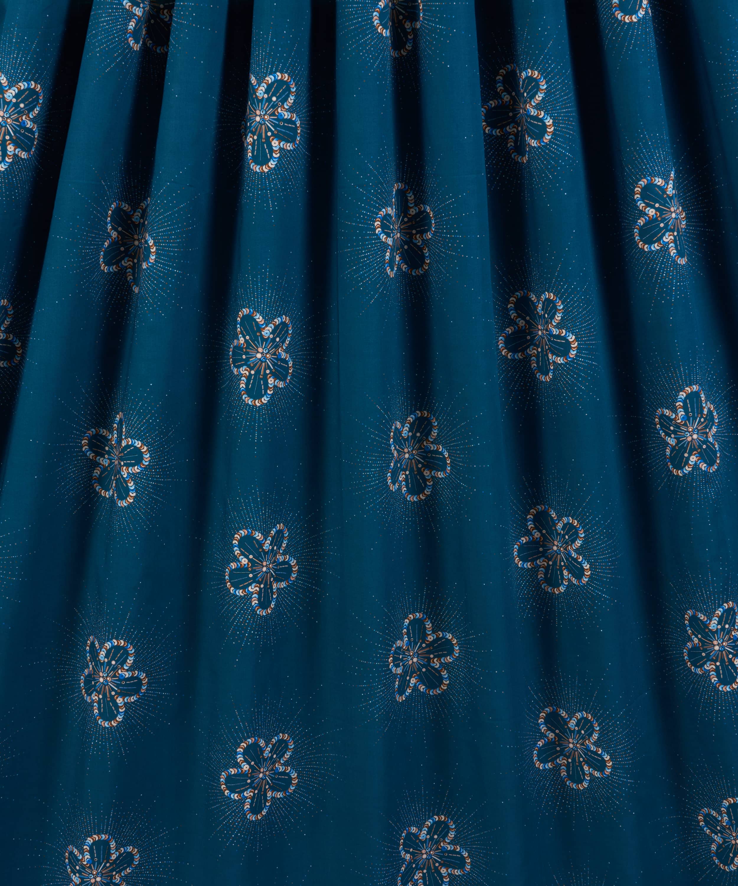 1910年代から1920年代に伝統的な制約から解放された若い女性たち、いわゆるフラッパーたちが髪をボブにし、スパンコールやビーズ、タッセルで飾られた短いドレスを着ていた時代にインスパイアを受けたこのデザインは、ガッシュで手描きされ、星のように輝く花のヘッドが暗い色の背景に散りばめられています。華やかなフラッパードレスの豪華な魅力を呼び起こす一枚です。