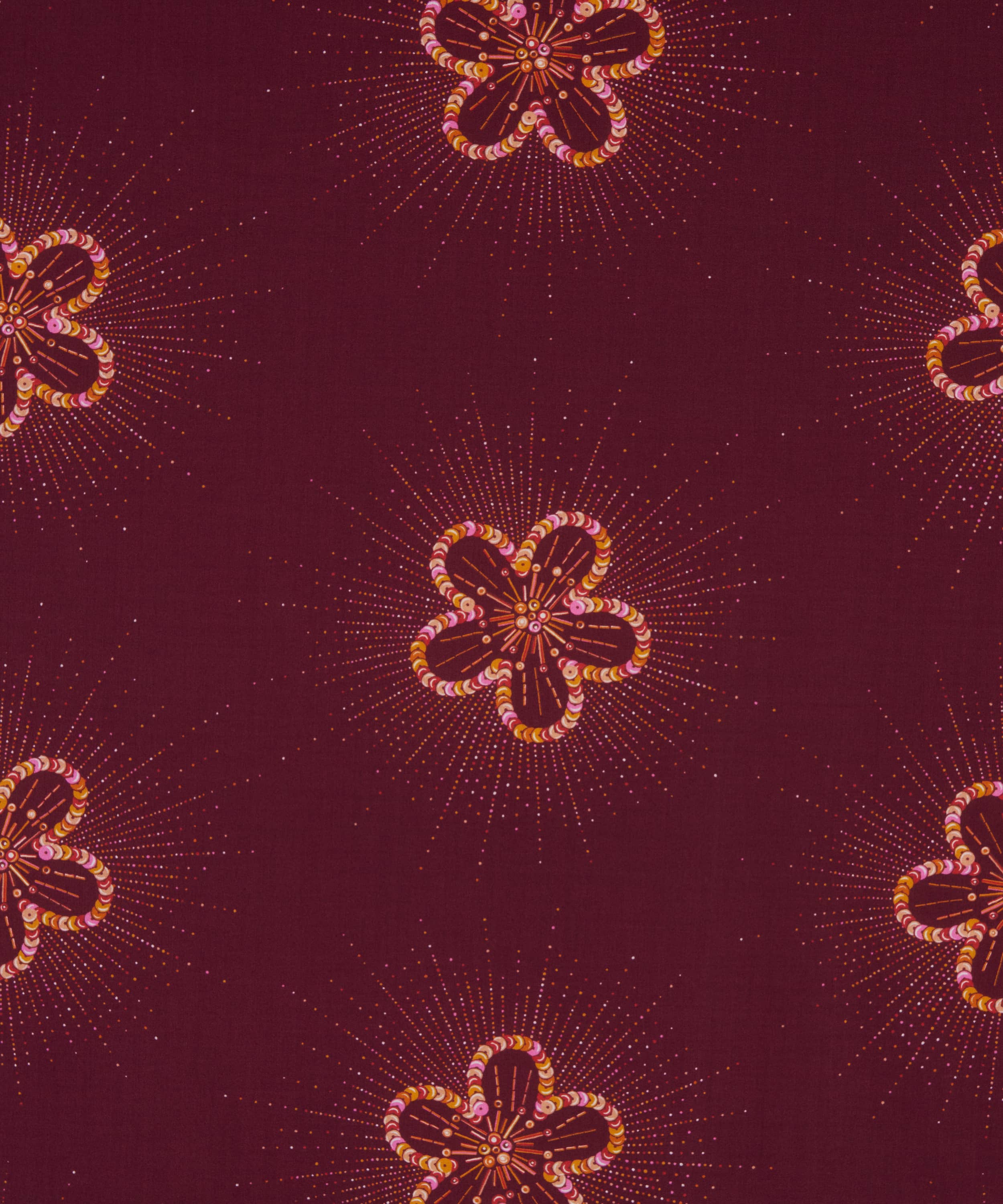 1910年代から1920年代に伝統的な制約から解放された若い女性たち、いわゆるフラッパーたちが髪をボブにし、スパンコールやビーズ、タッセルで飾られた短いドレスを着ていた時代にインスパイアを受けたこのデザインは、ガッシュで手描きされ、星のように輝く花のヘッドが暗い色の背景に散りばめられています。華やかなフラッパードレスの豪華な魅力を呼び起こす一枚です。