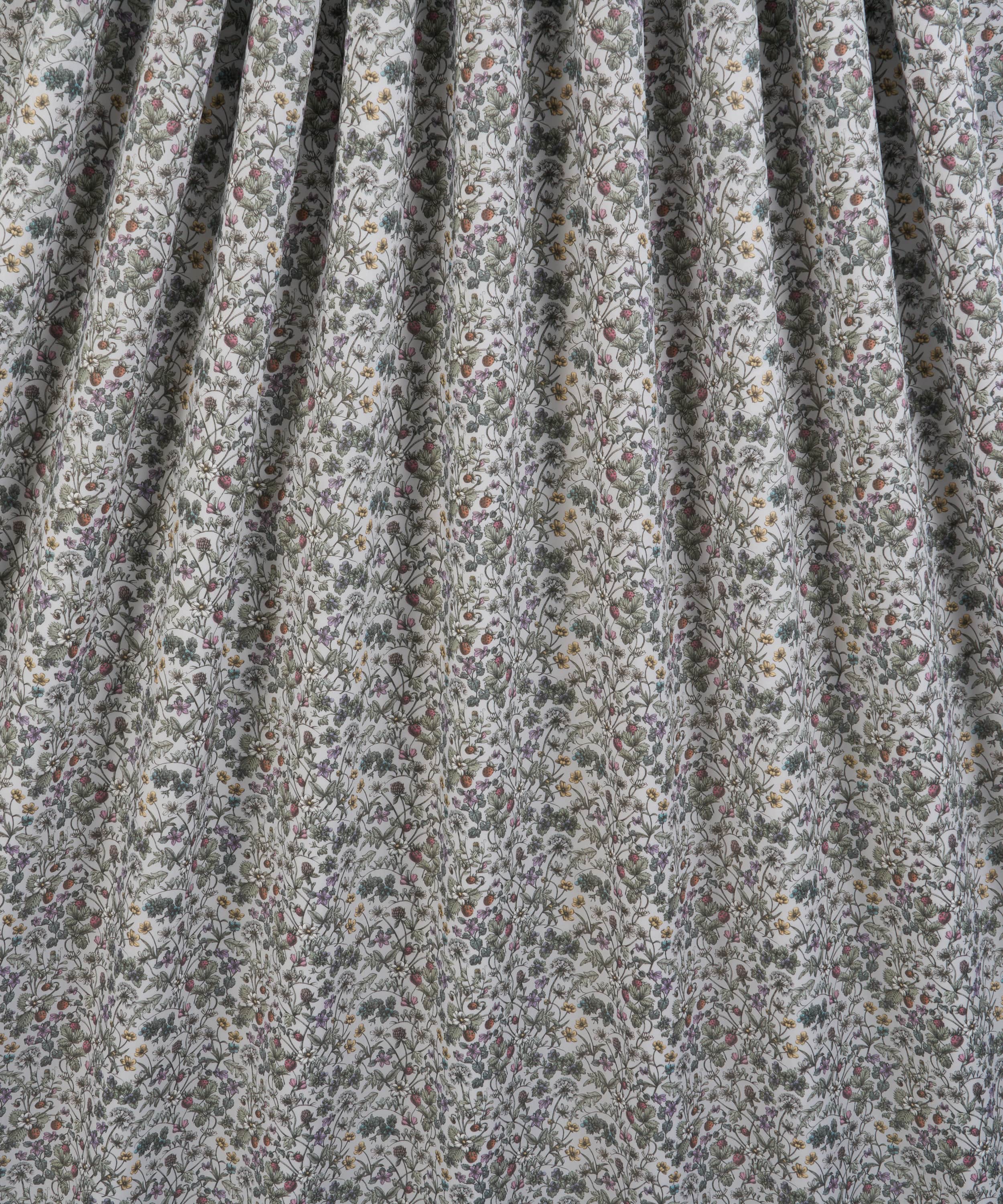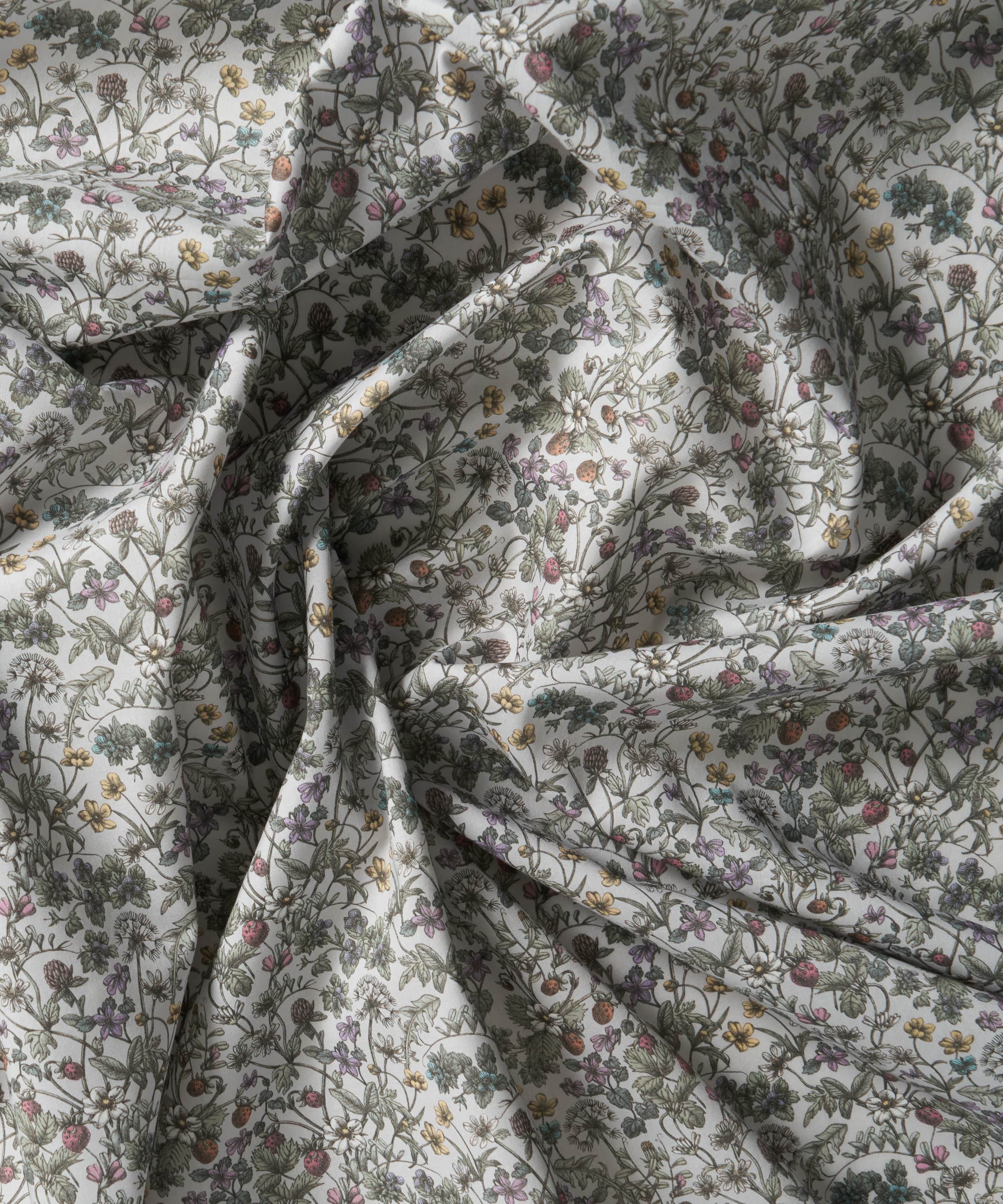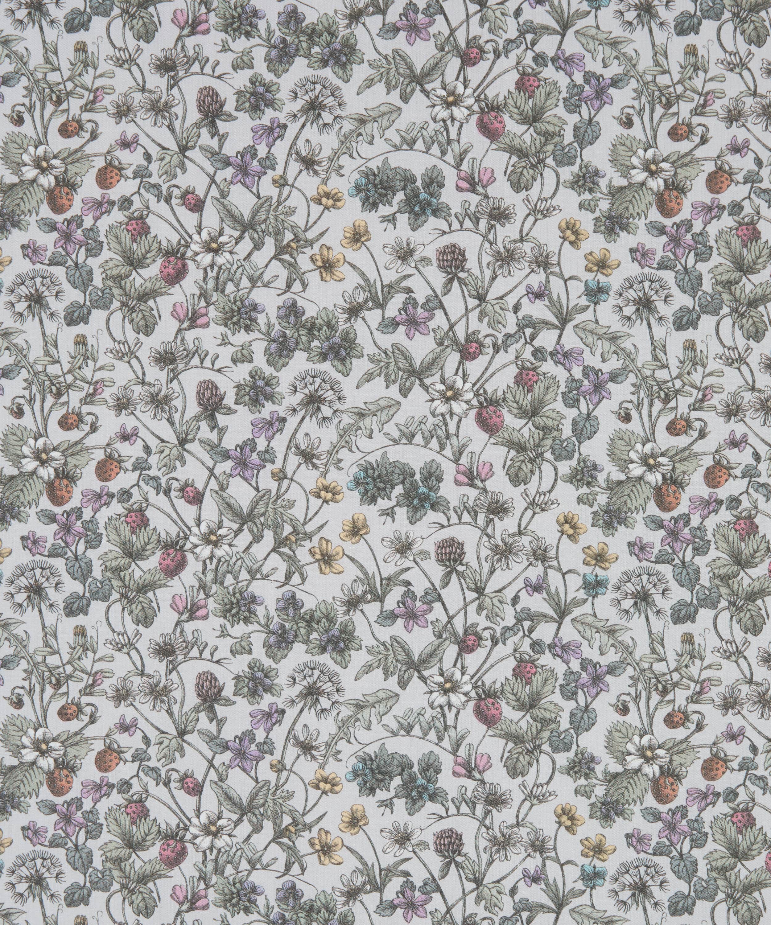 「スプリング・メモリーズ」の花のモチーフの一部を取り入れた、遊び心あふれるコーディネート柄です。花咲く草原に身を委ね、自然の生命力と静かな調和に包まれる、のびやかで心地よいひとときを想起させます。やわらかな鉛筆の濃淡によって繊細に手描きされた構成の中には、豊かな野花の庭が広がり、デイジーやキンポウゲ、クローバー、スミレ、タンポポ、ワスレナグサが咲き誇る風景の中に、熟したストロベリーがさりげなく描き込まれています。