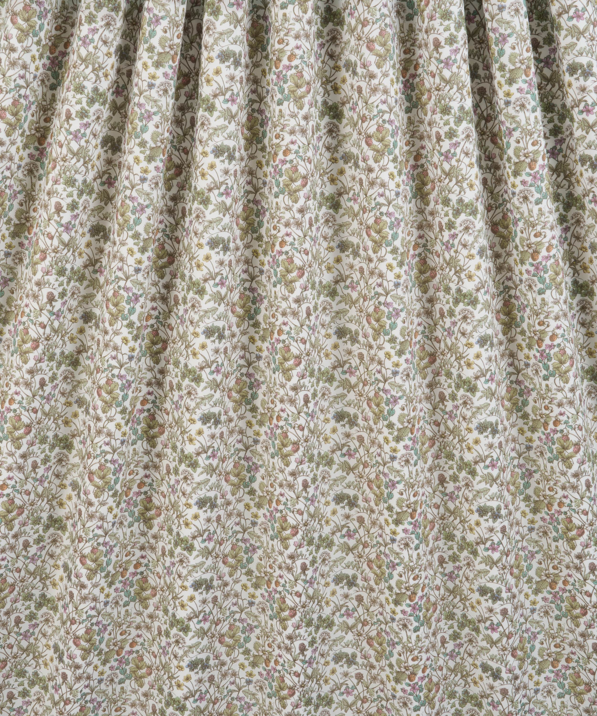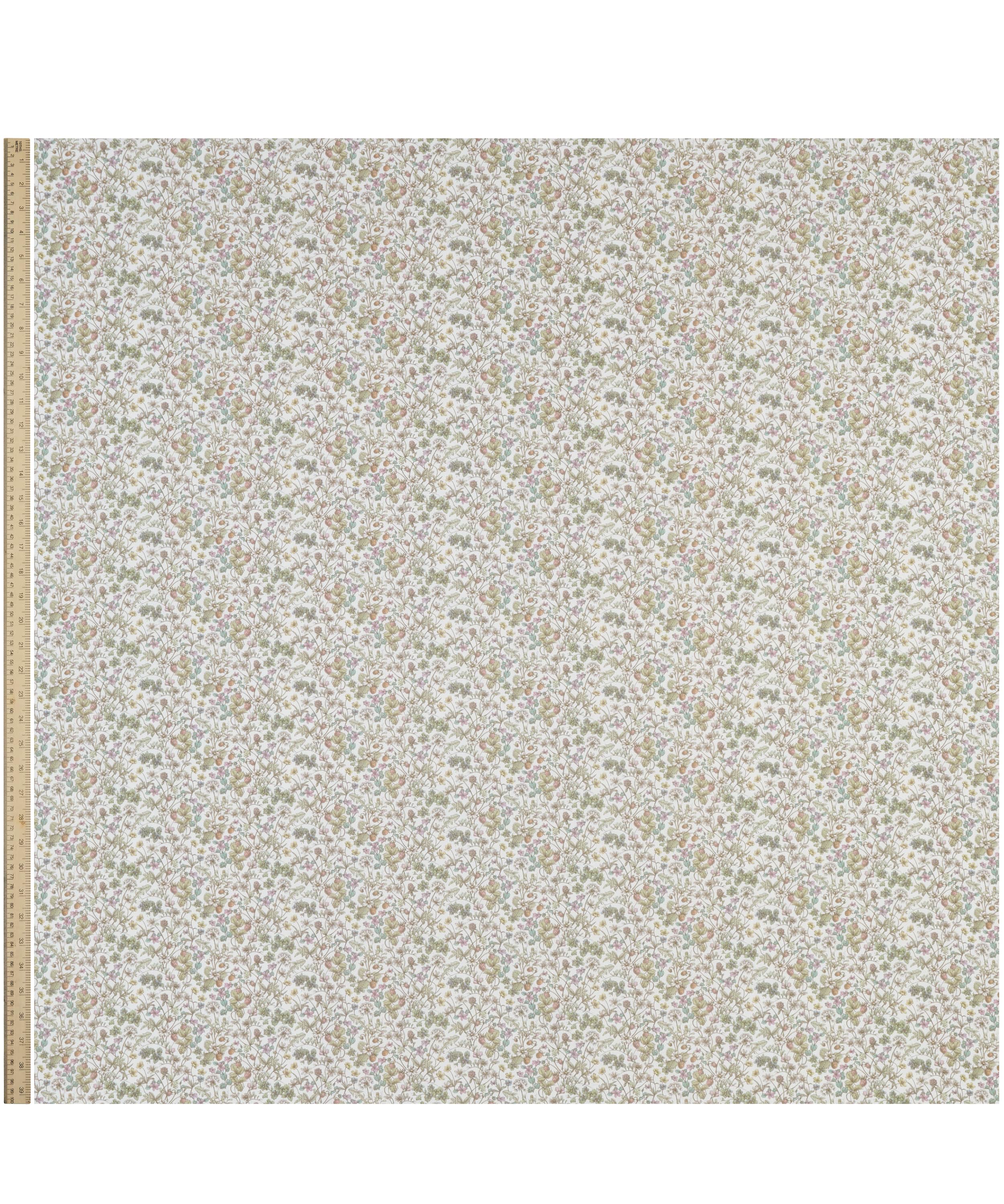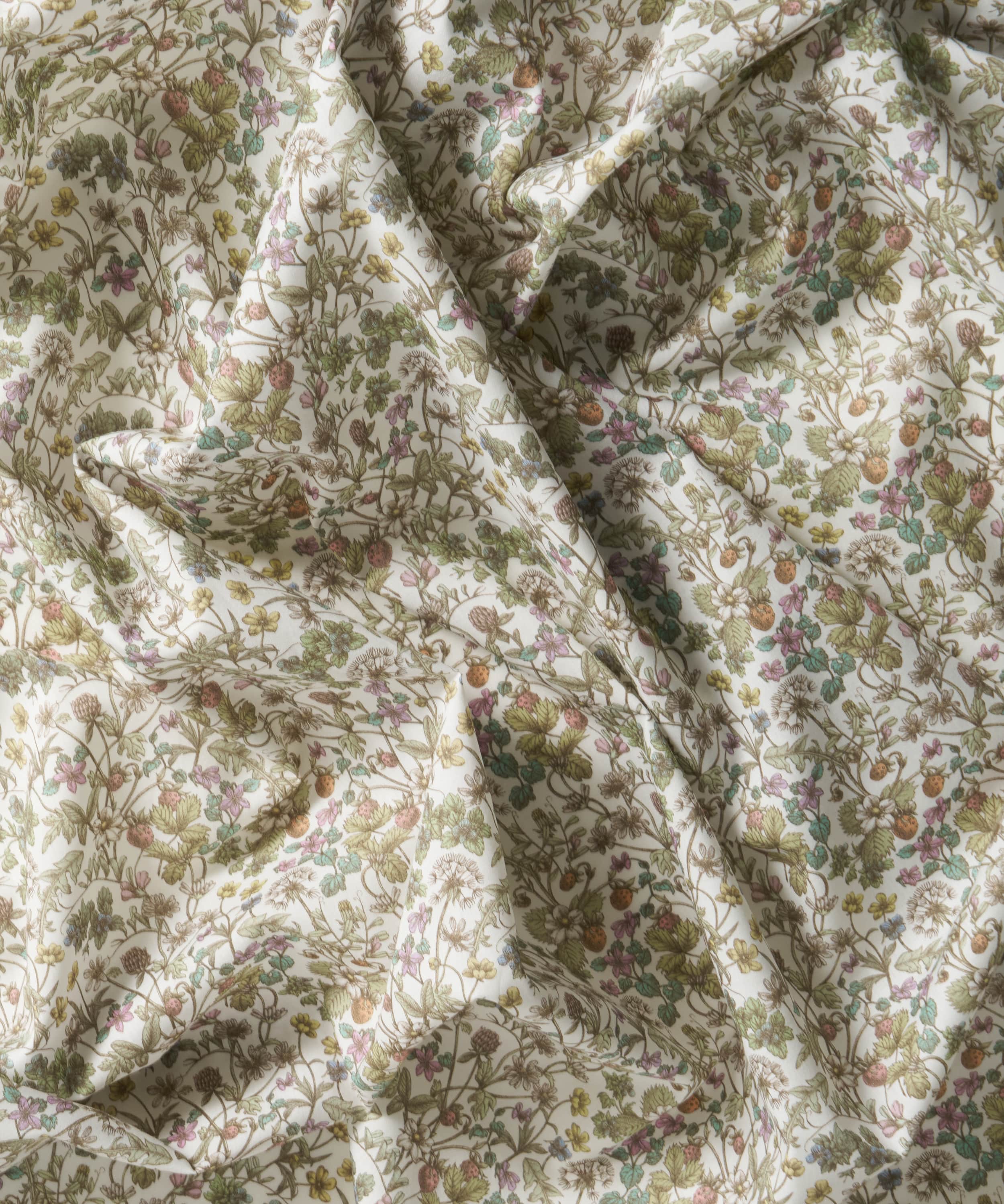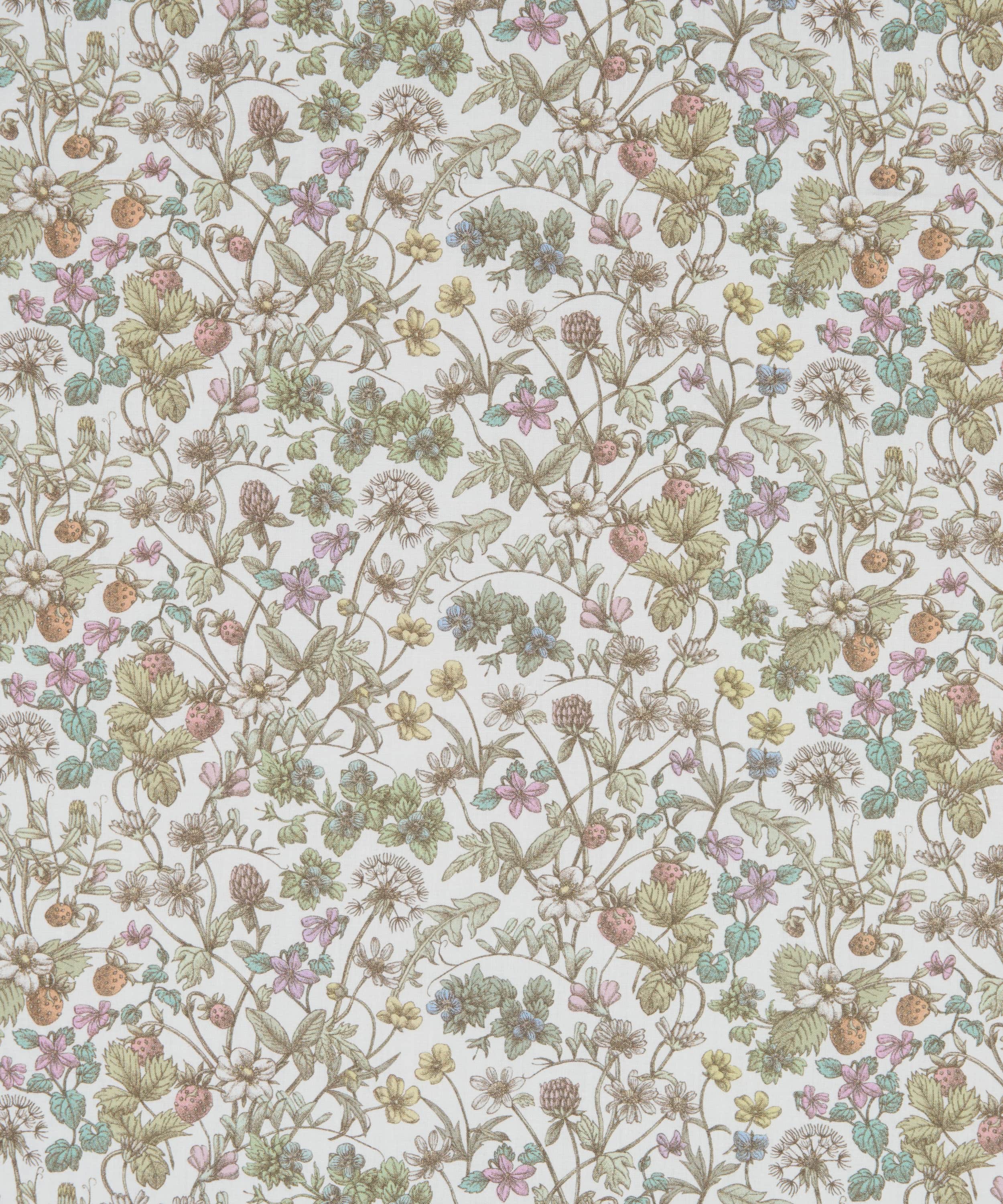 「スプリング・メモリーズ」の花のモチーフの一部を取り入れた、遊び心あふれるコーディネート柄です。花咲く草原に身を委ね、自然の生命力と静かな調和に包まれる、のびやかで心地よいひとときを想起させます。やわらかな鉛筆の濃淡によって繊細に手描きされた構成の中には、豊かな野花の庭が広がり、デイジーやキンポウゲ、クローバー、スミレ、タンポポ、ワスレナグサが咲き誇る風景の中に、熟したストロベリーがさりげなく描き込まれています。