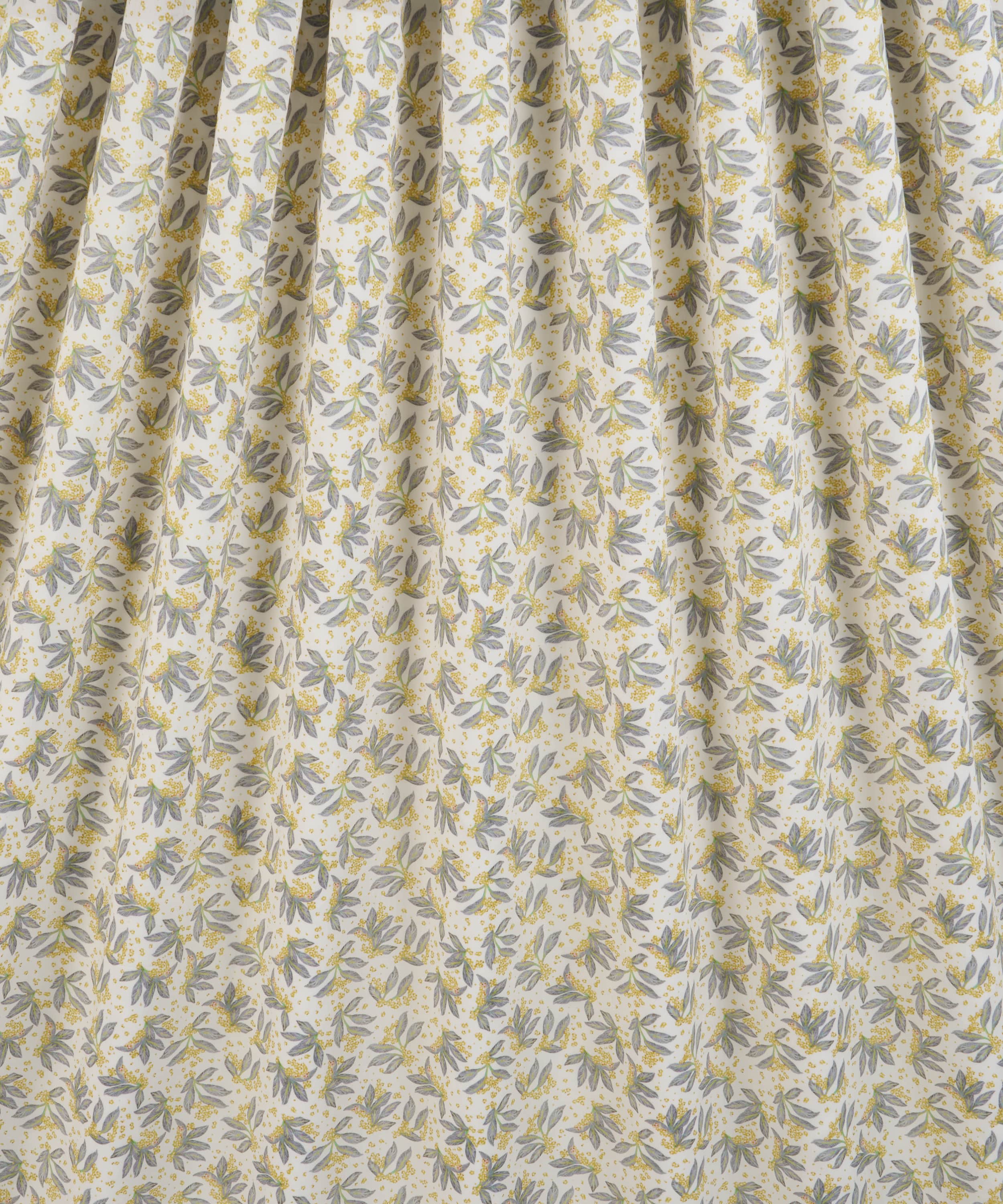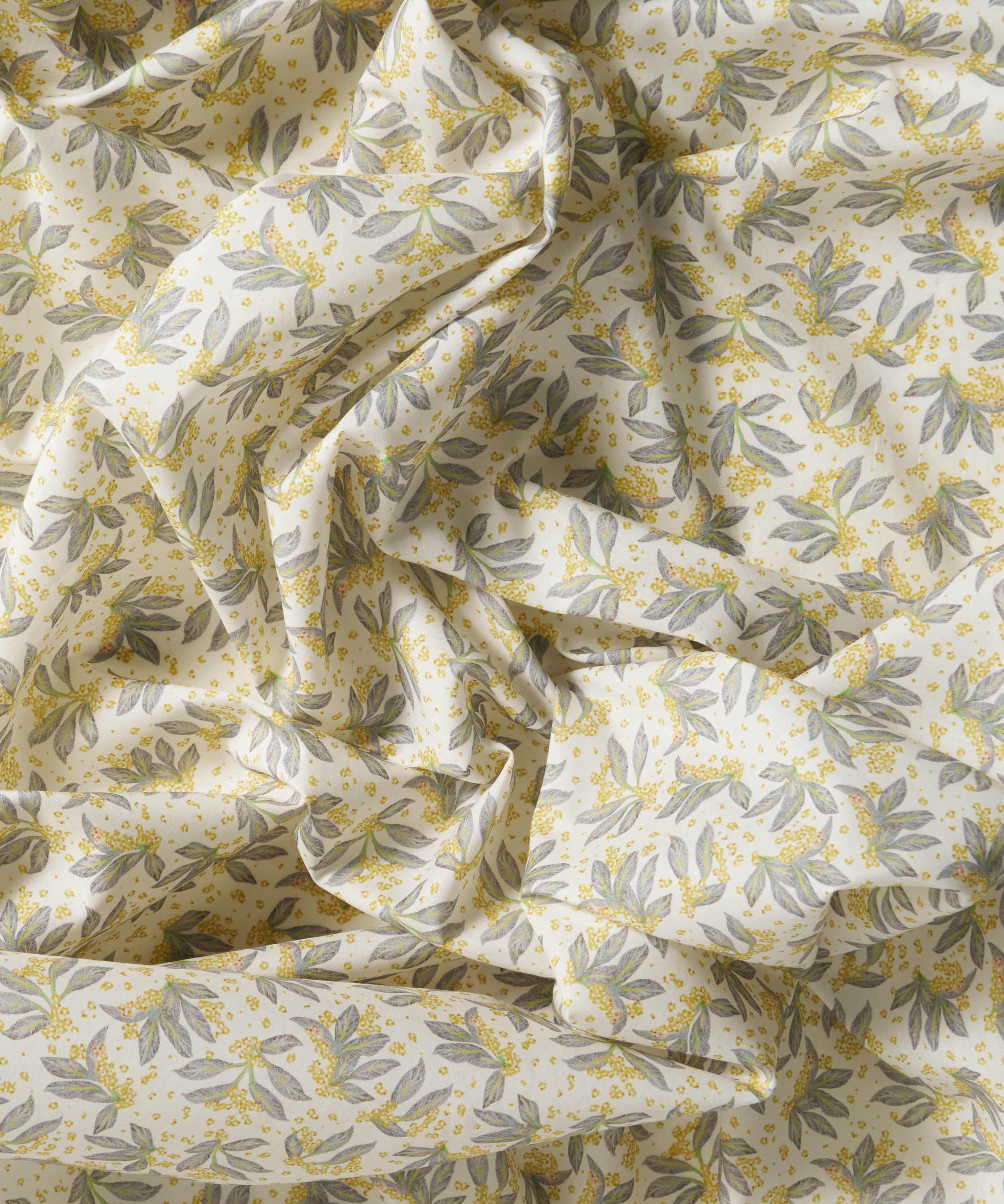 舞うように広がるボタニカルモチーフが、布一面に表情豊かに散りばめられた「ポーセリン・キャノピー」。リバティのスタジオで手描きされたこのデザインは、多方向に構成された葉の流れと、きらめくように描かれたワスレナグサが印象的です。陶芸家フェリシティ・エイリフの繊細な水彩表現から着想を得ており、軽やかさと奥行きを併せ持つ佇まいを生み出しています。明るいカラーパレットからシックなダークトーンまで、美しく映える、汎用性とタイムレスな魅力を備えたデザインです。