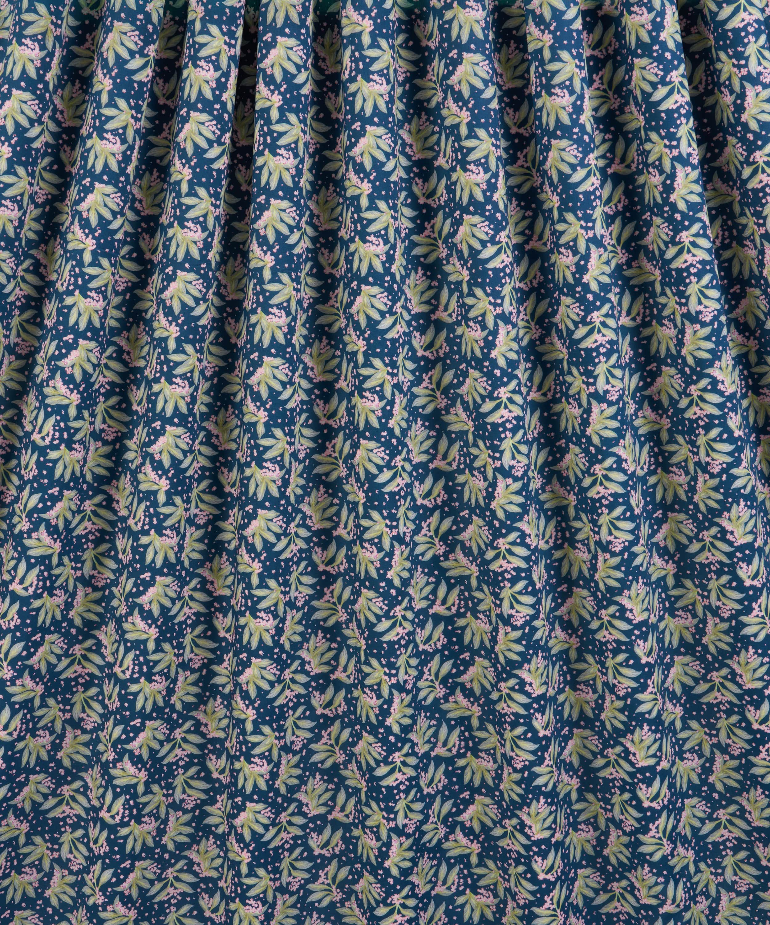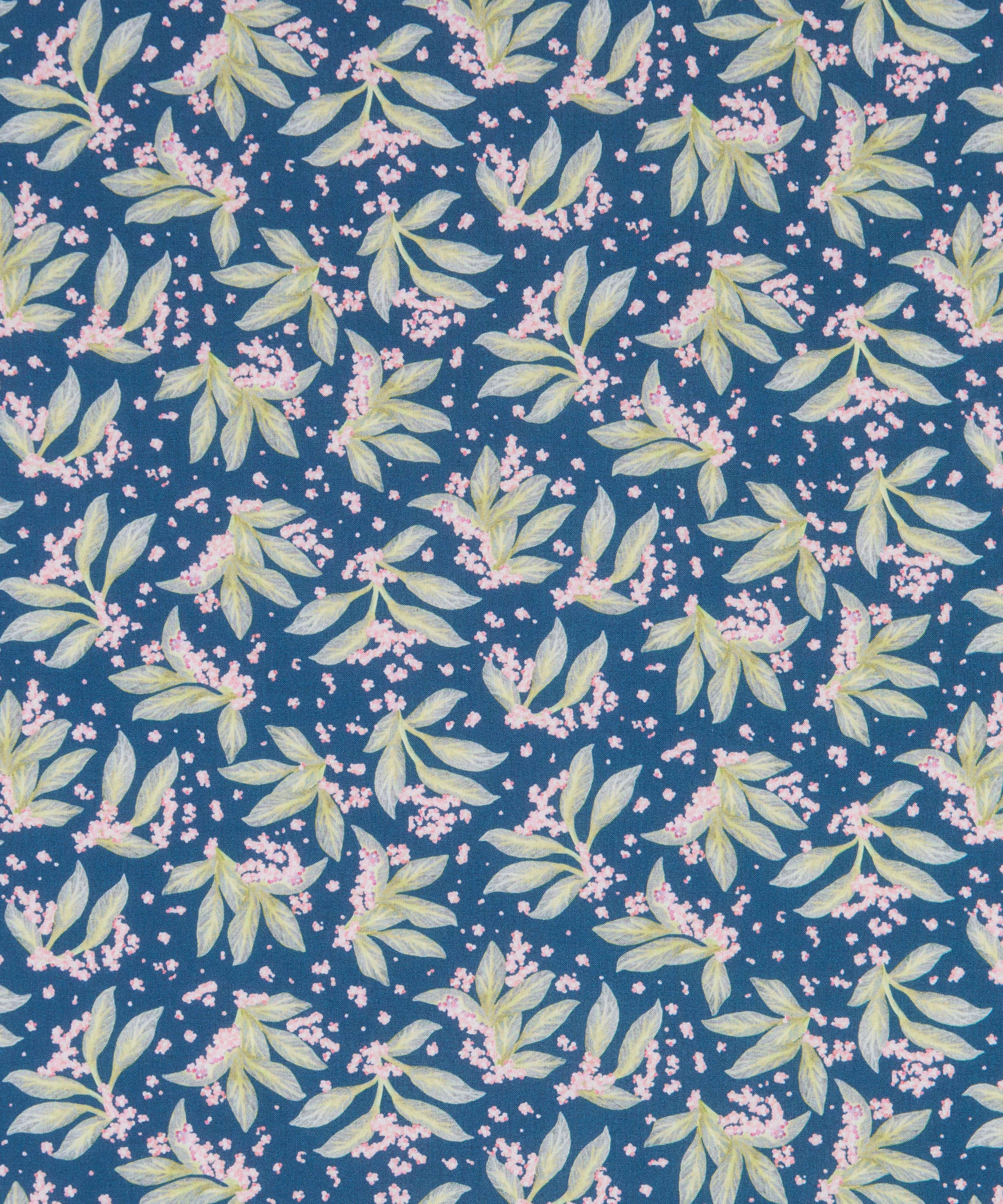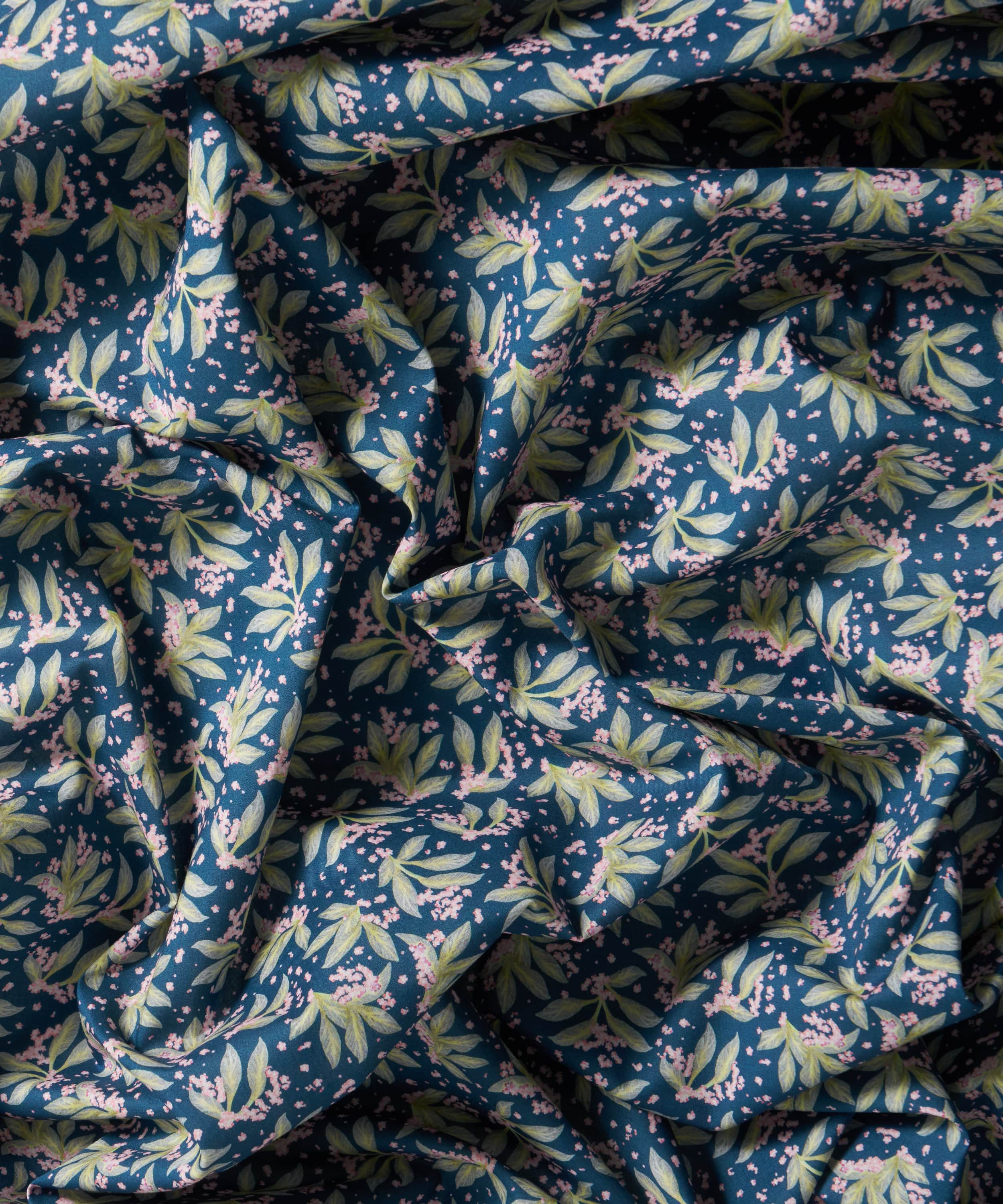 舞うように広がるボタニカルモチーフが、布一面に表情豊かに散りばめられた「ポーセリン・キャノピー」。リバティのスタジオで手描きされたこのデザインは、多方向に構成された葉の流れと、きらめくように描かれたワスレナグサが印象的です。陶芸家フェリシティ・エイリフの繊細な水彩表現から着想を得ており、軽やかさと奥行きを併せ持つ佇まいを生み出しています。明るいカラーパレットからシックなダークトーンまで、美しく映える、汎用性とタイムレスな魅力を備えたデザインです。