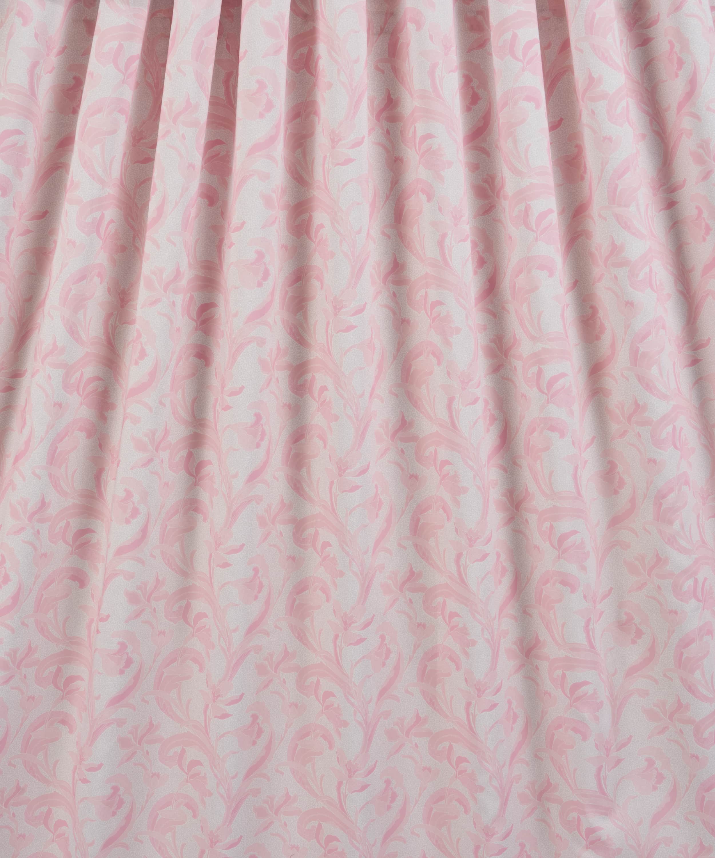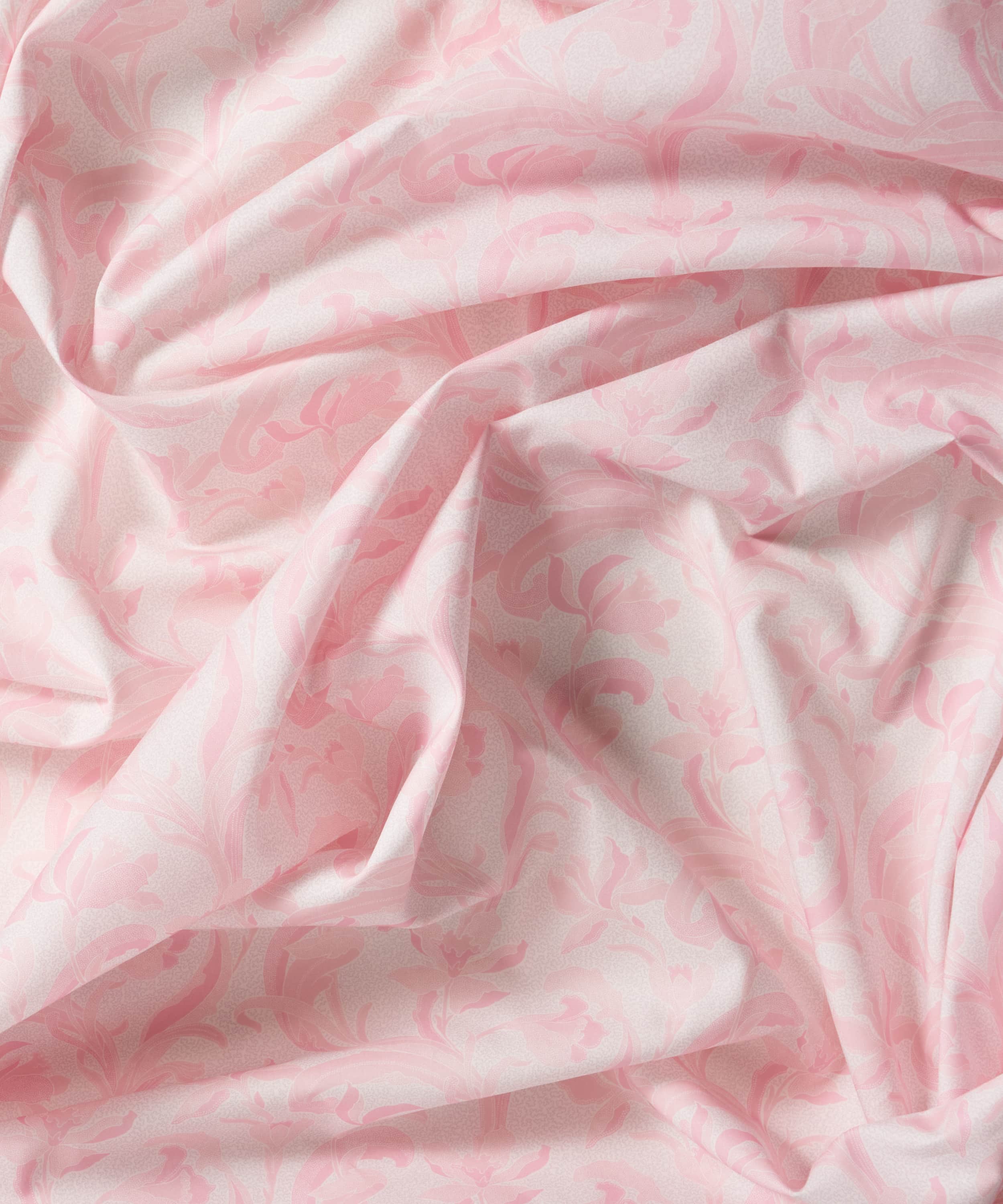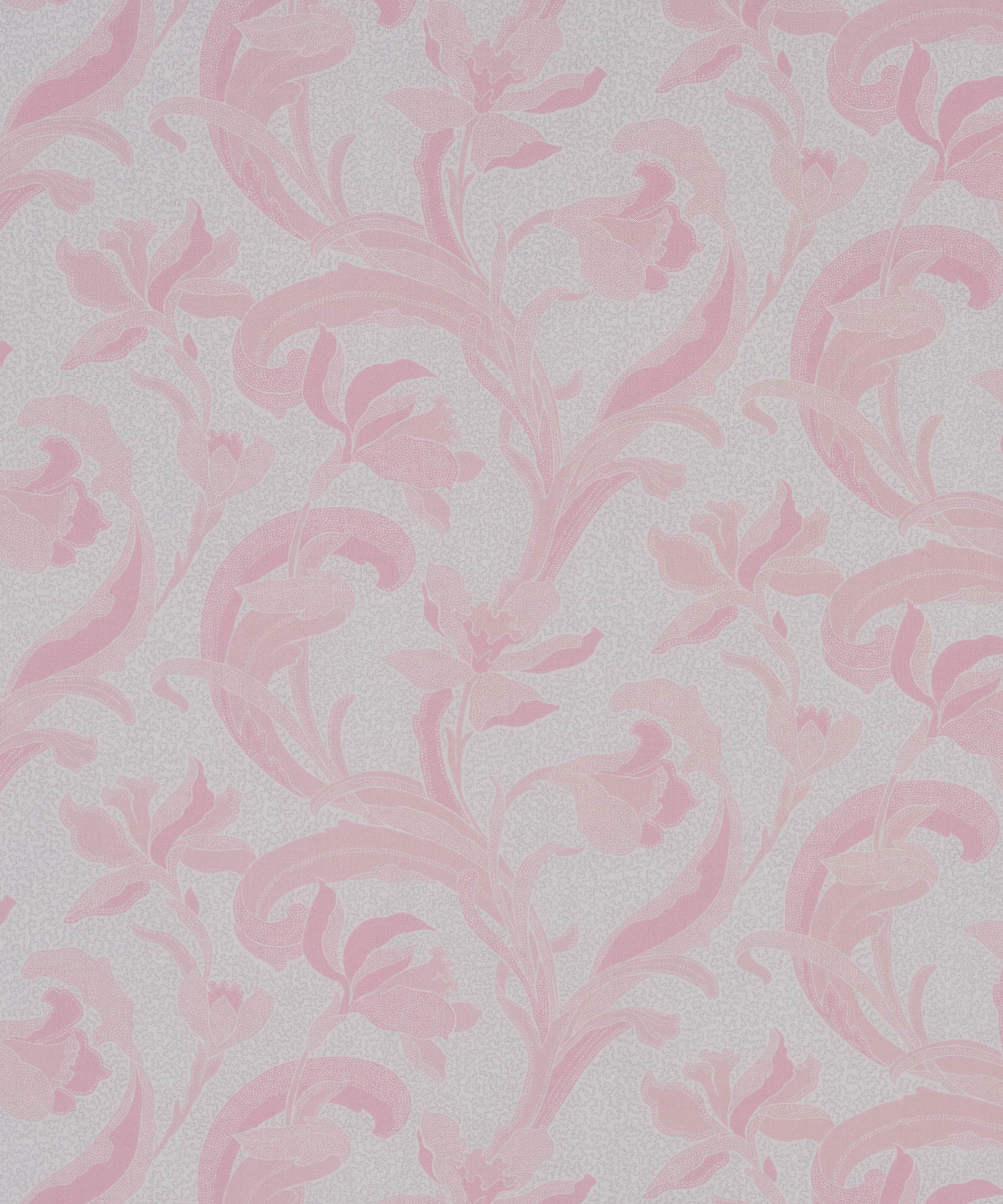 リバティのアーカイブで発見された手描き作品をもとに、同名の歴史ある陶磁器の伝統に着想を得た「セラドン」。細部に至るまで丁寧に描き直し、配色を刷新することで、装飾性に満ちた豊かな表情が引き出されています。様式化されたスイセンと流れるような葉のモチーフが、アール・ヌーヴォーを思わせる優雅さで、しなやかな縦のラインを描きながら立ち上がります。さらに、繊細な線で描かれたスクイグル状の地模様が、さりげない奥行きと質感を添えています。