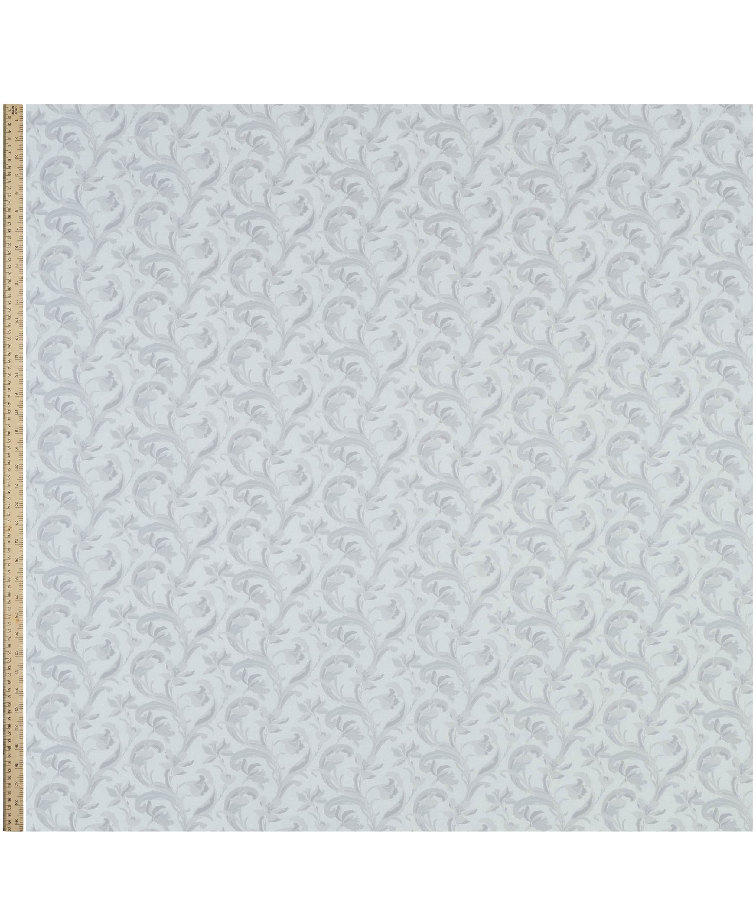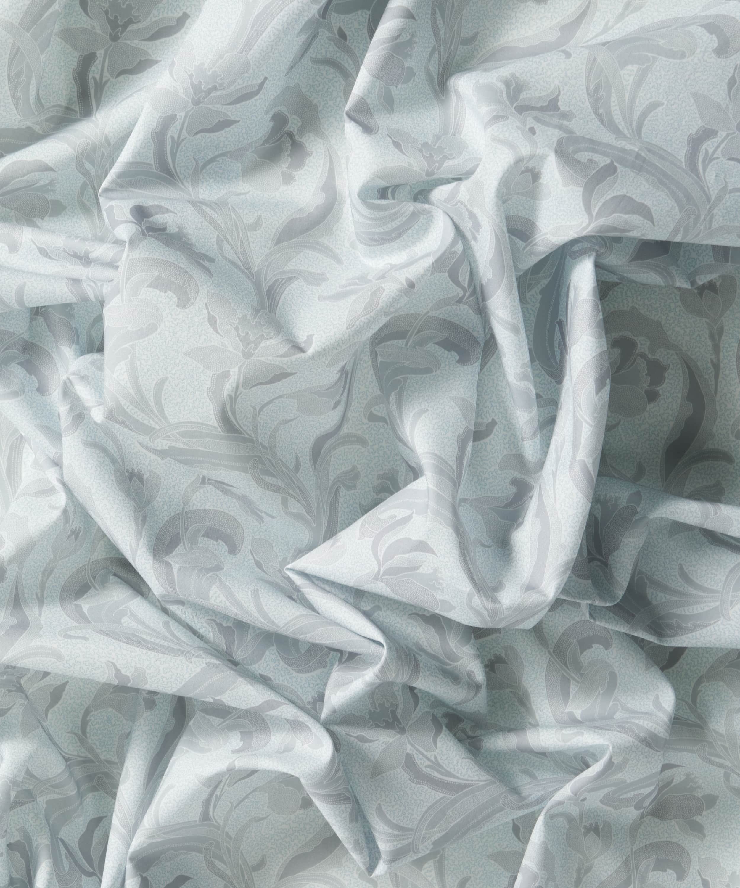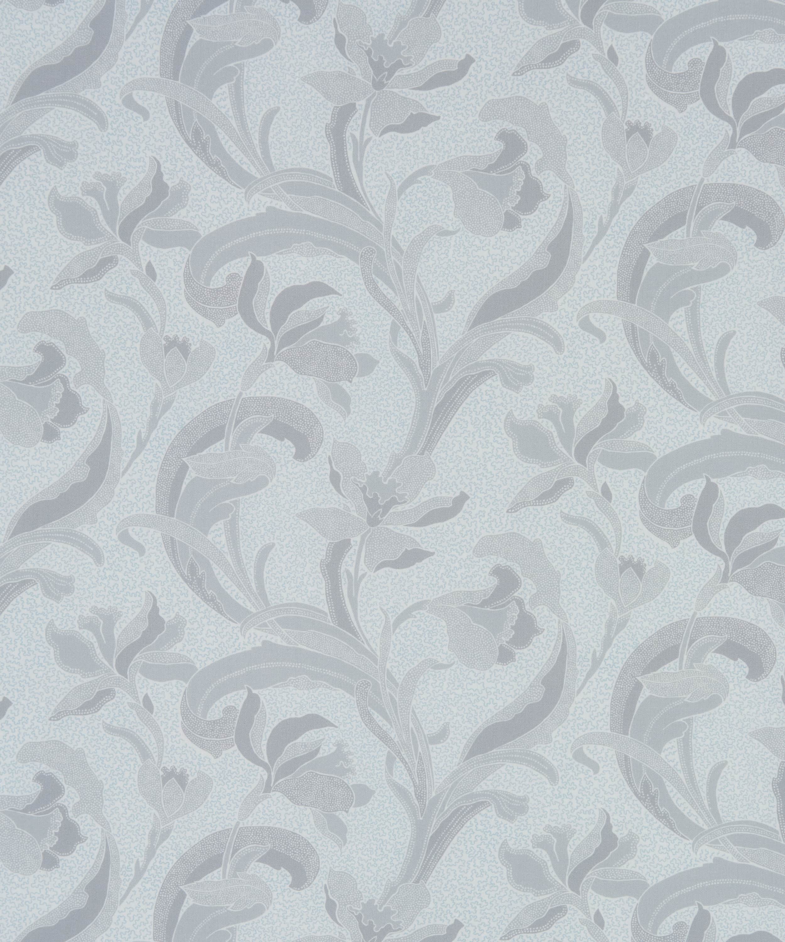 リバティのアーカイブで発見された手描き作品をもとに、同名の歴史ある陶磁器の伝統に着想を得た「セラドン」。細部に至るまで丁寧に描き直し、配色を刷新することで、装飾性に満ちた豊かな表情が引き出されています。様式化されたスイセンと流れるような葉のモチーフが、アール・ヌーヴォーを思わせる優雅さで、しなやかな縦のラインを描きながら立ち上がります。さらに、繊細な線で描かれたスクイグル状の地模様が、さりげない奥行きと質感を添えています。