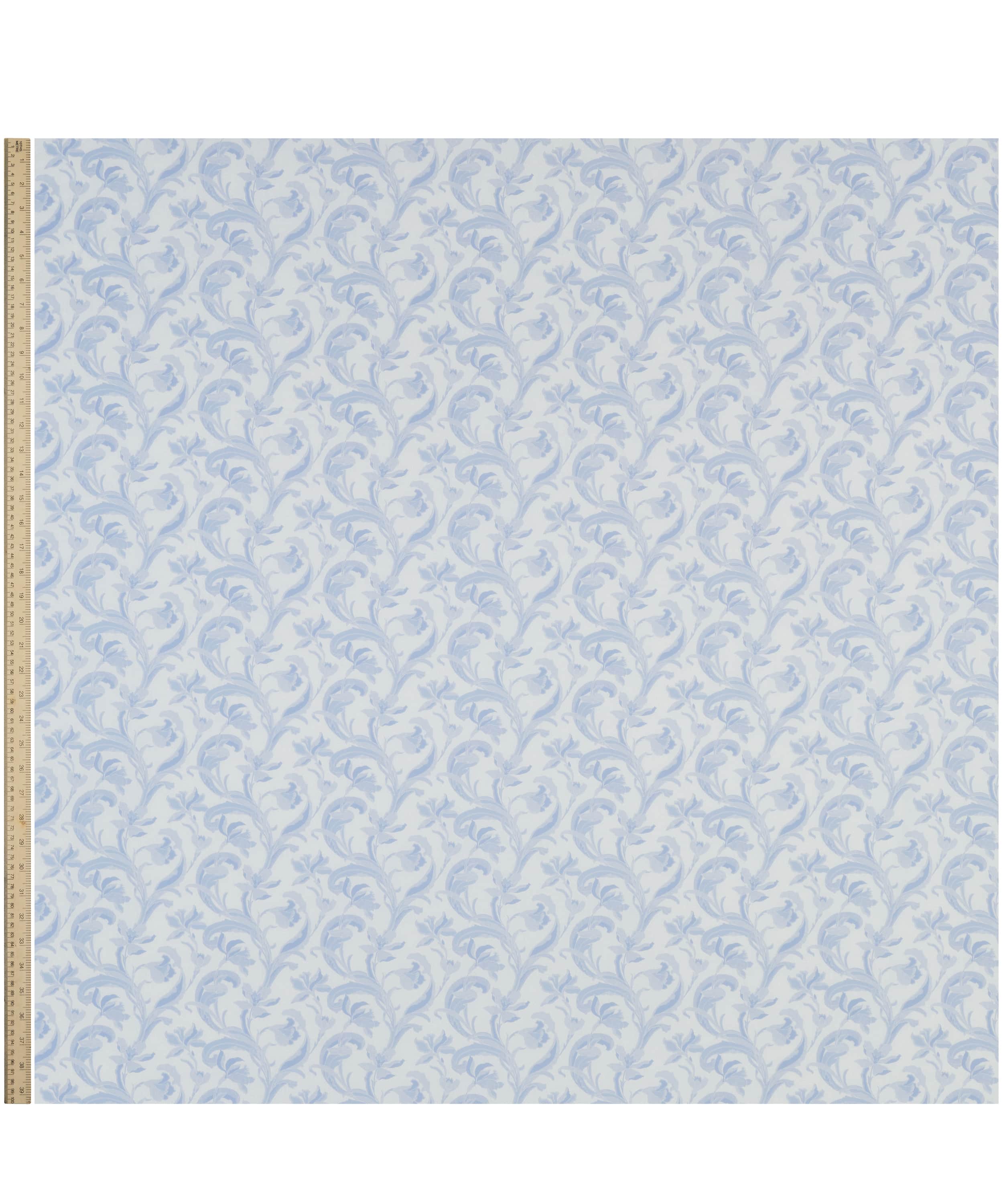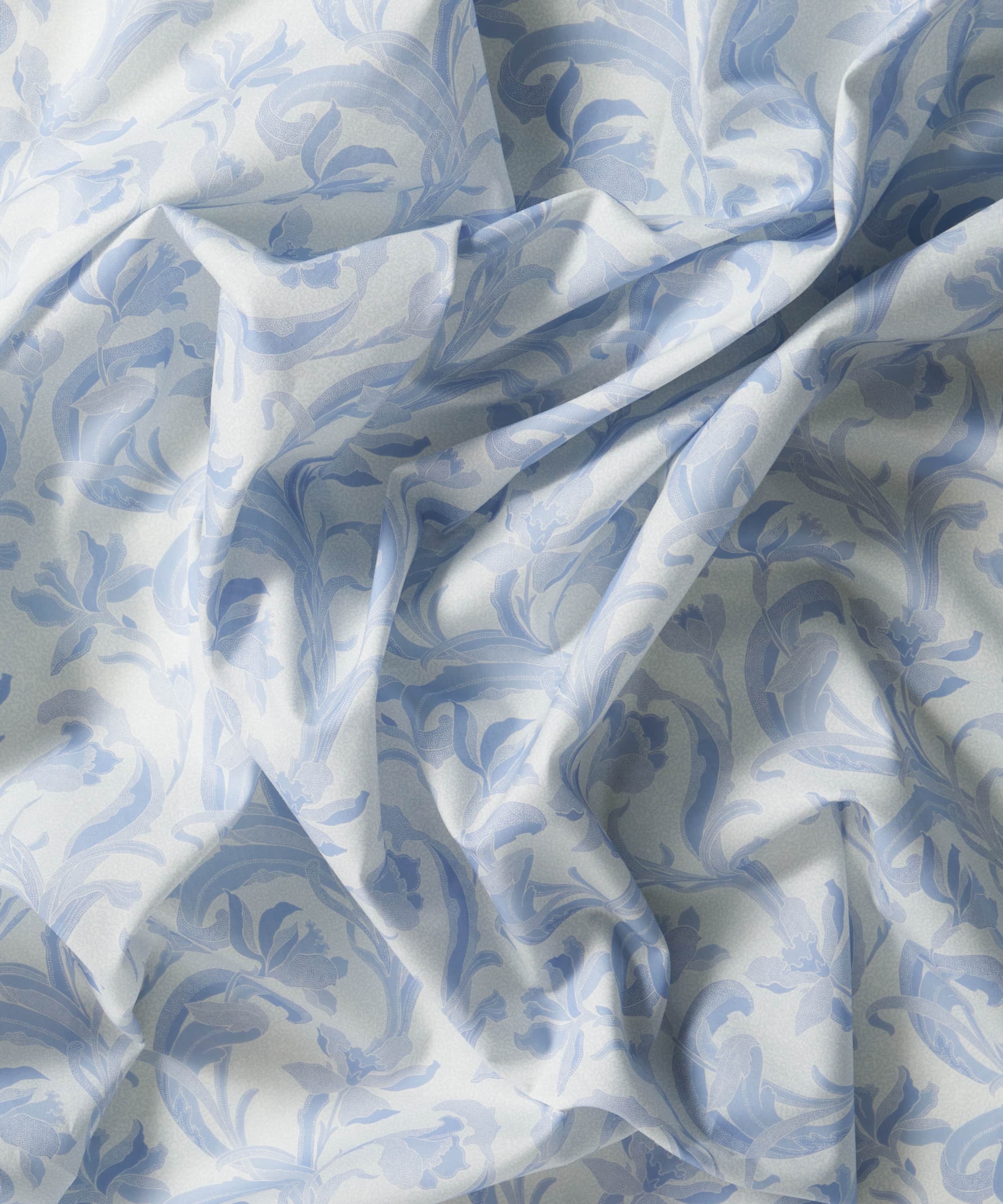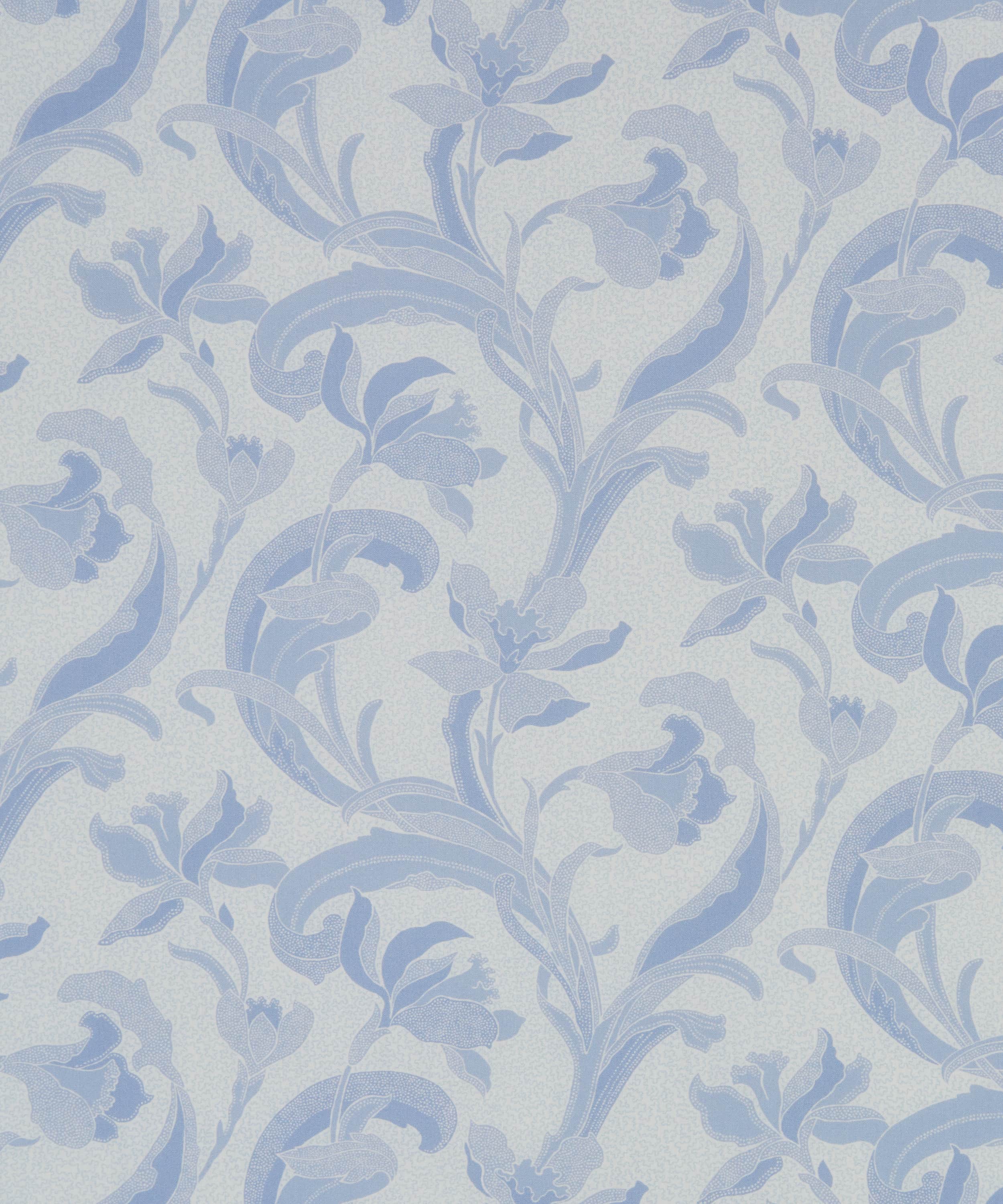 リバティのアーカイブで発見された手描き作品をもとに、同名の歴史ある陶磁器の伝統に着想を得た「セラドン」。細部に至るまで丁寧に描き直し、配色を刷新することで、装飾性に満ちた豊かな表情が引き出されています。様式化されたスイセンと流れるような葉のモチーフが、アール・ヌーヴォーを思わせる優雅さで、しなやかな縦のラインを描きながら立ち上がります。さらに、繊細な線で描かれたスクイグル状の地模様が、さりげない奥行きと質感を添えています。