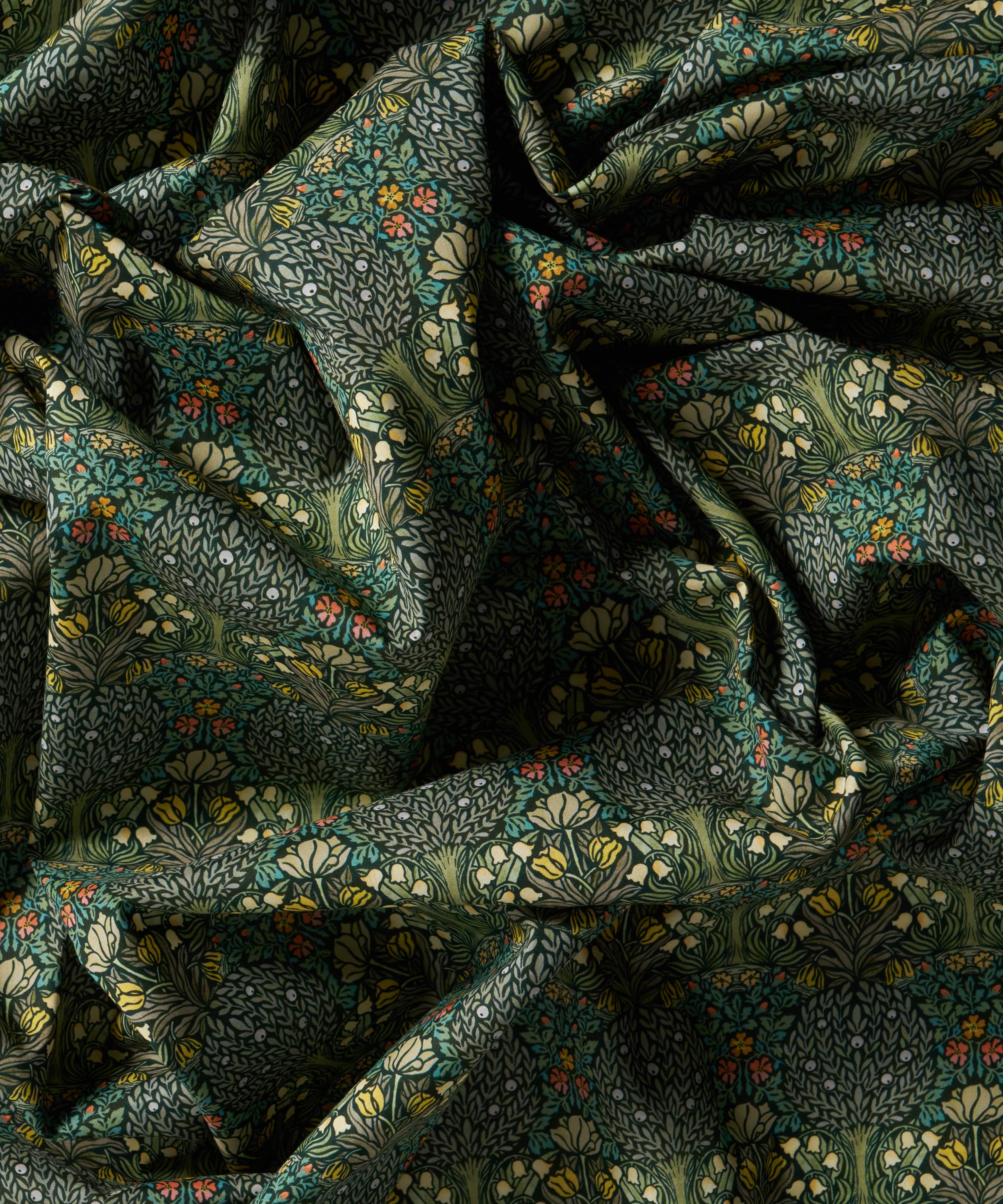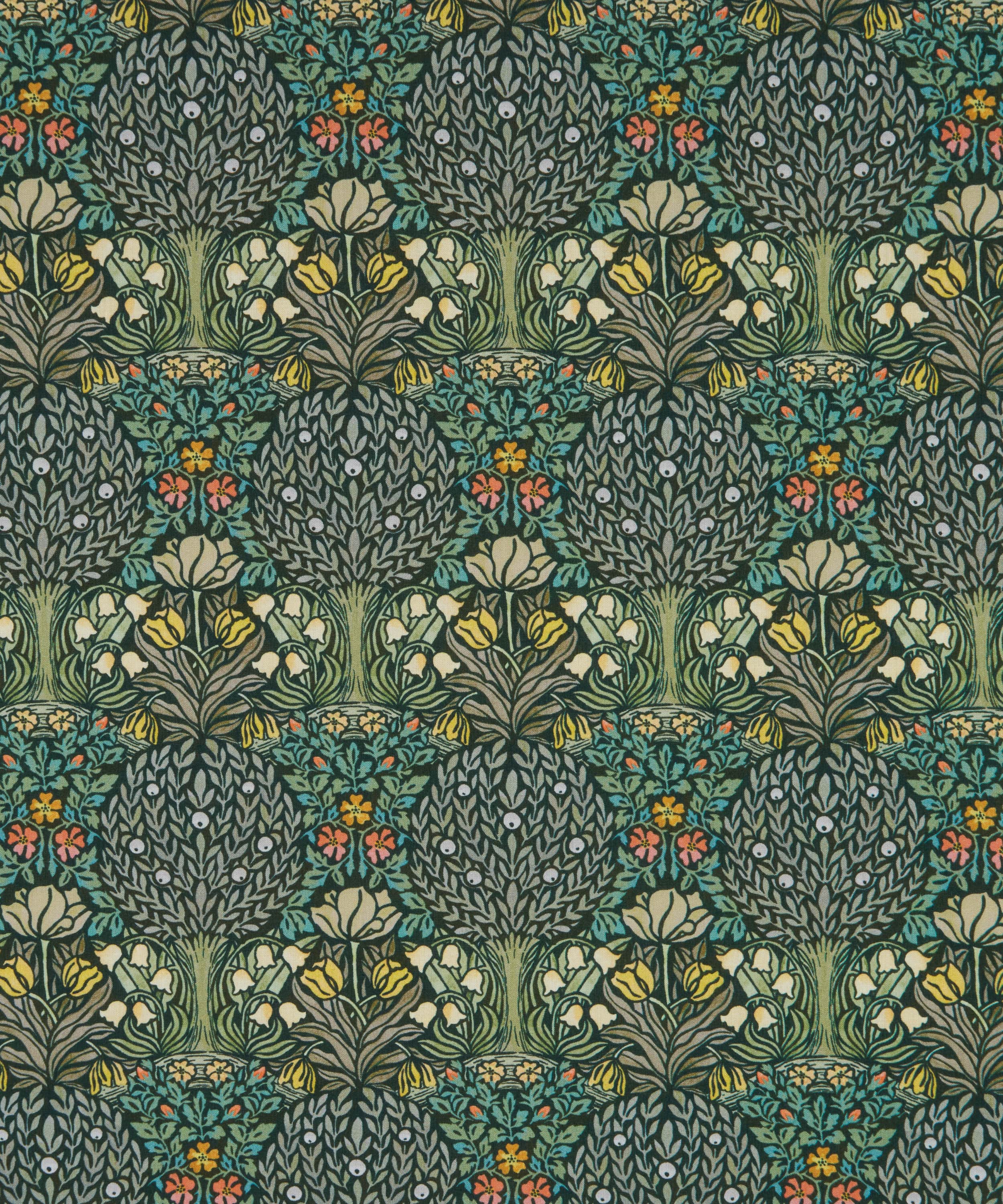 リバティのアーカイブで発見された手描き作品を起点とする、アール・ヌーヴォーの魅力を色濃く映した「ハンリー・フォレスト」。様式化された果樹や花々が、左右対称の構成で広がり、密度の高いグラフィカルな表情を生み出しています。ムーアクロフト陶器に通じる独自のスタイルとの親和性からセレクトされ、繊細な水彩で描き起こすことで、大胆な線描をやわらかく和らげ、全体に心地よいバランスをもたらしています。
