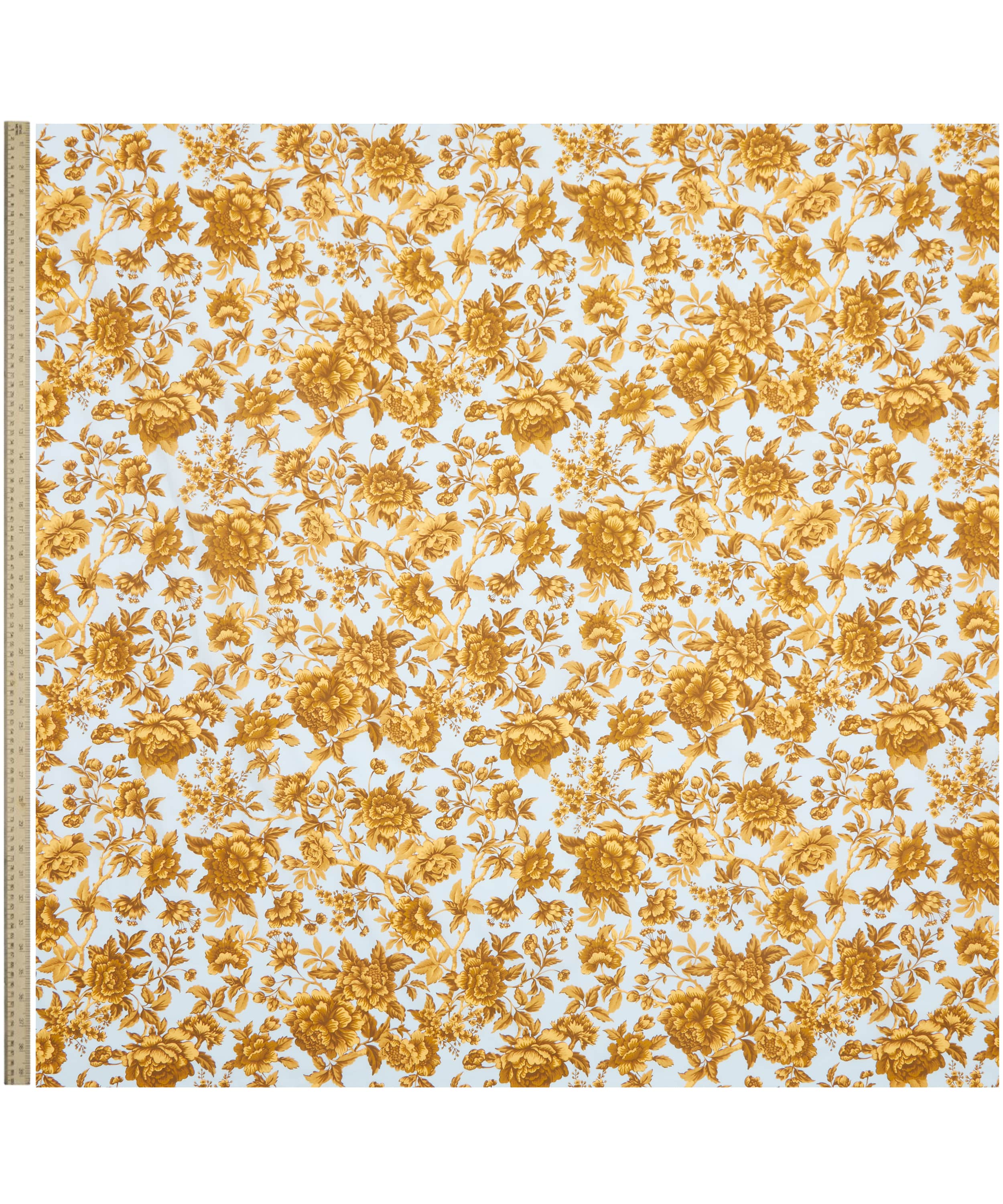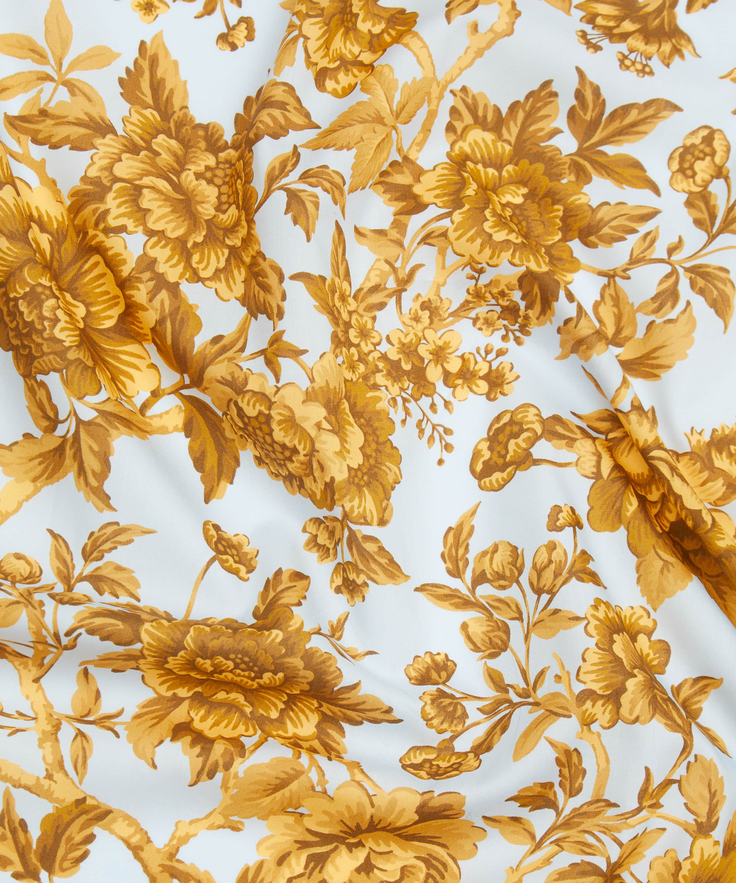 「レジェンシー・トレイル」は、リバティが誇る〈ツリー・オブ・ライフ〉様式の系譜に敬意を表し、1969年に手描きされたアートワークに着想を得て生まれたデザインです。丹念に再構築された構図には、流れるように伸びる枝葉の間に、堂々と咲くピオニー、キク、カーネーション、可憐な花々、フクシアが配され、豊かな枝葉とともに描かれています。濃淡のある色調の重なりがコントラストと奥行き、そして輪郭の美しさを生み出し、柄全体を神秘性と洗練に満ちた雰囲気で包み込んでいます。
