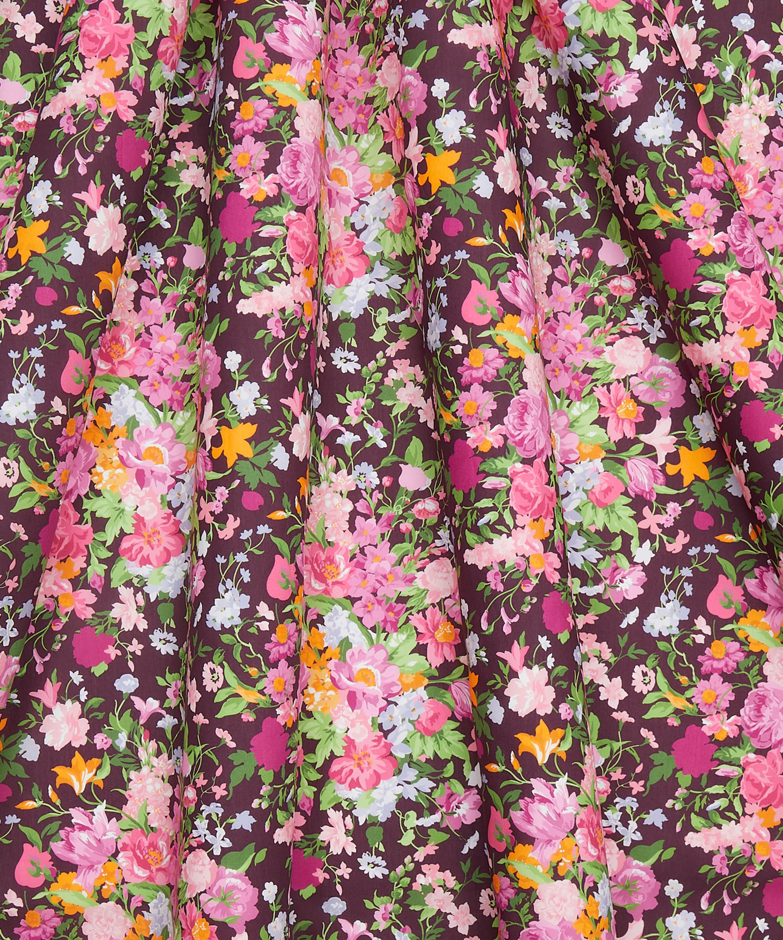 ローズ、アネモネ、チューリップ、デルフィニウム、リリー、カメリアが咲き重なり、華やかで躍動感のあるフローラルの世界を描き出しています。鮮やかな色彩とフォルムに満ちた「ブーケ・カーニバル」は、リバティのタイムレスなアーカイブ作品に着想を得て、新鮮な構成へと昇華されたデザインです。丁寧に構成されたブーケにフォーカスした、深みのある色調が印象的なこのダイナミックなプリントは、フォーマルなソワレからガーデンパーティまで華やかなシーンを演出します。