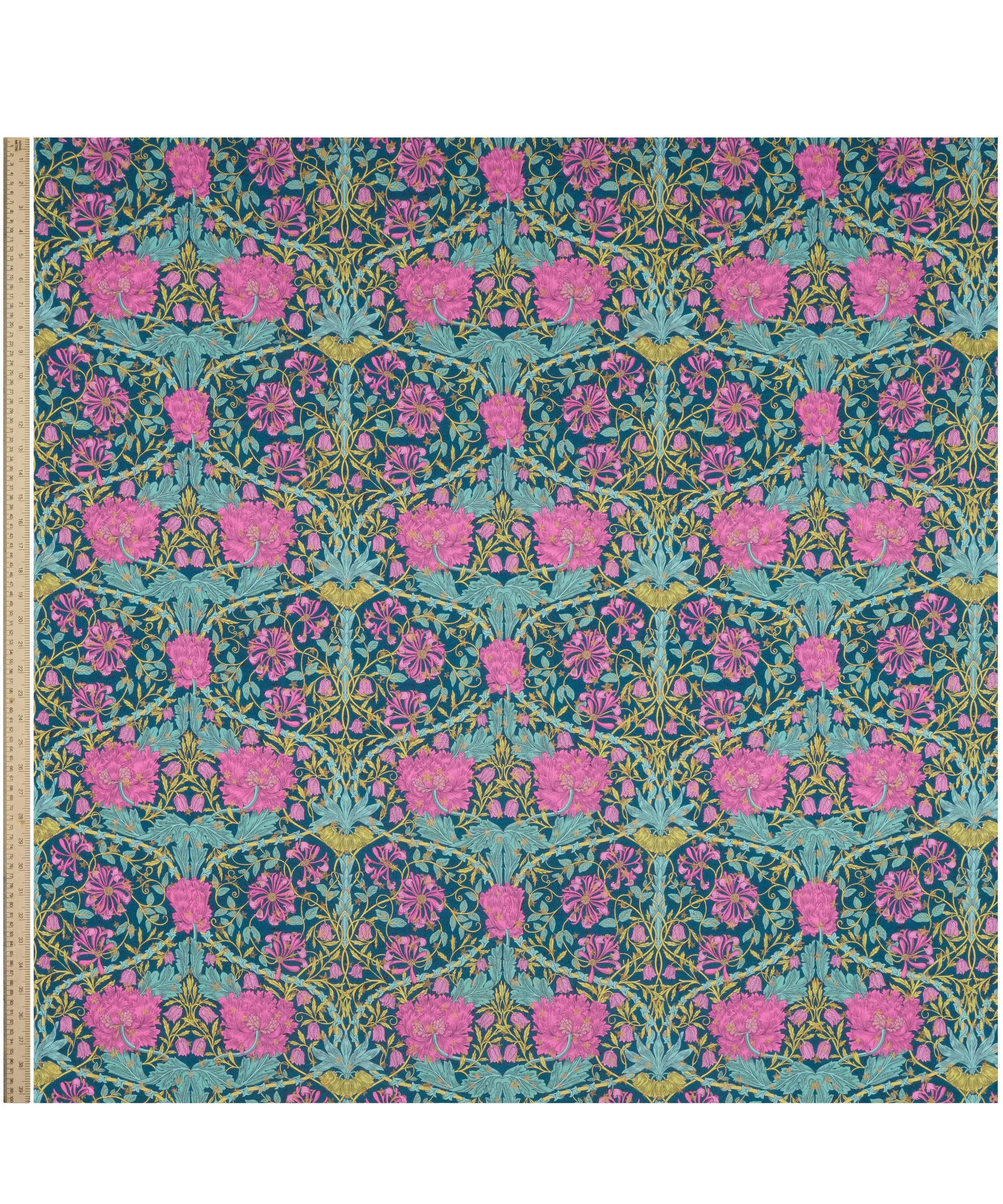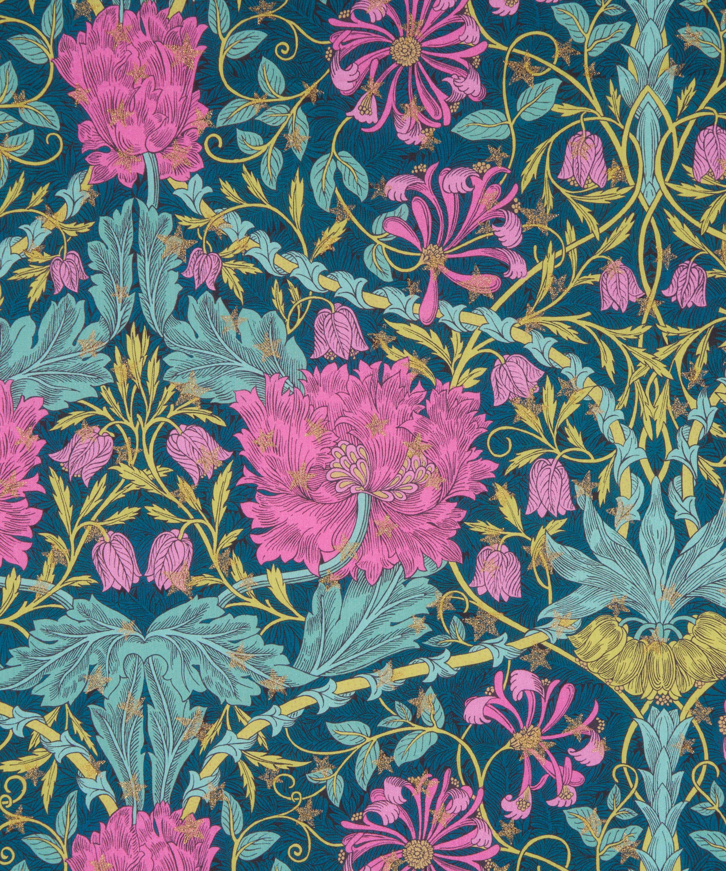 ウィリアム・モリスが1876年に手がけた人気のプリント「ハニーサックル」に着想を得たリバティの伝統的な宝物「マーチ」。フェスティブシーズンに向けて再解釈された「マーチ・スパークル」は、チューリップや咲き誇るハニーサックル、緻密で豊かな葉の流れを描いた花模様の上に、繊細なメタリックの星をあしらっています。時代を超えて愛される魅力と、アーツ&クラフツならではの洗練された美しさを兼ね備えたこの壮麗なパターンは、自然の美しさを称えるデザインです。