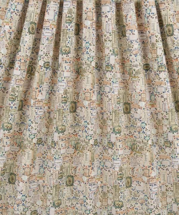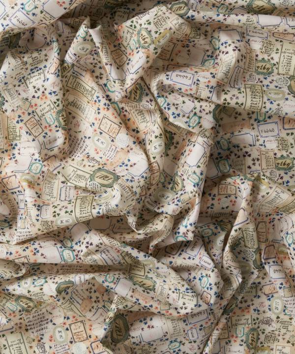 生地スワッチのブックが沢山保管されているリバティのアーカイブ。一冊の本から見つけた小さな葉のデザインをグランドに配し、その上に沢山の本のラベルをレイアウトすることでこのコレクションへの称賛を表現しています。リバティのデザインスタジオがこれらの要素をまとめ素晴らしいデザインへ昇華させました。