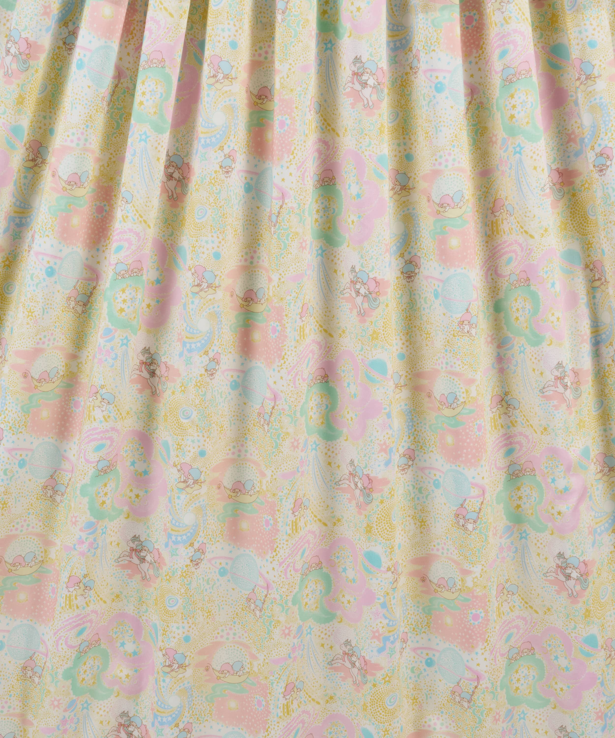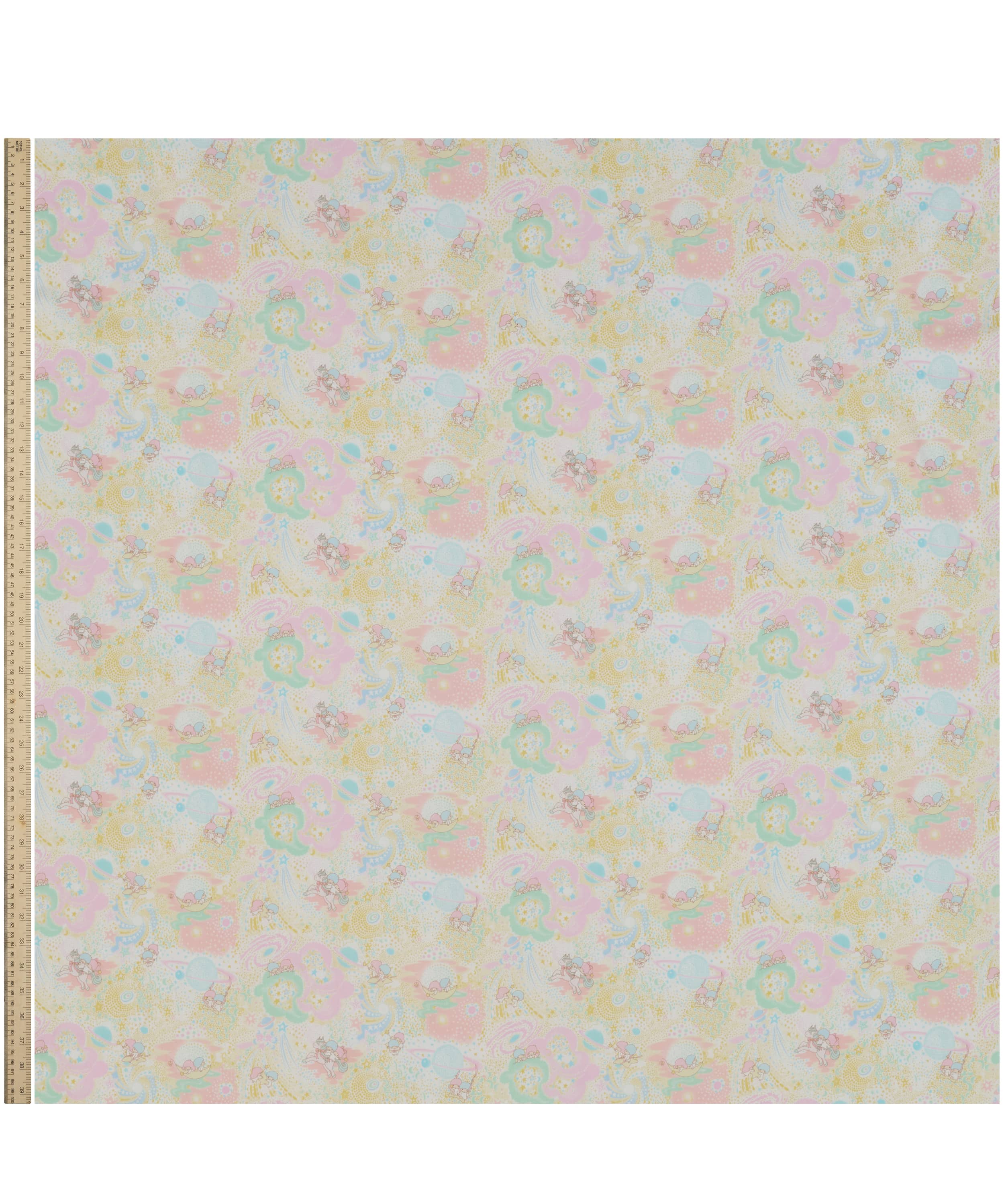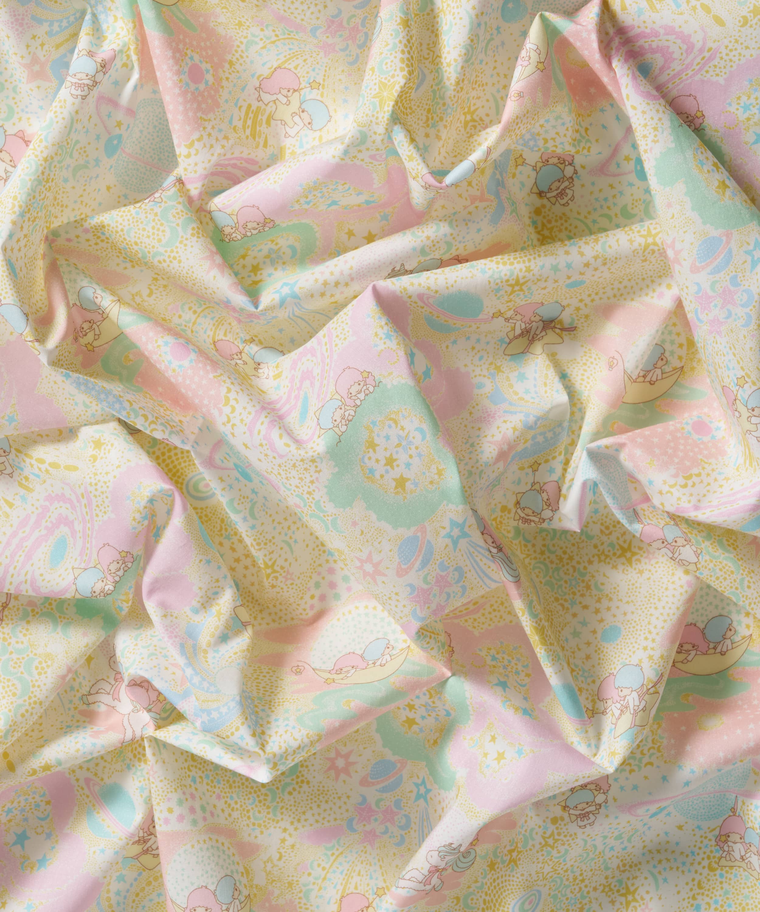 輝く彗星や光る月、踊る惑星、渦巻く彗星のきらめきや月の光、惑星のリズム、銀河のうねりが重なり合い、キキとララの夢のような宇宙の旅を美しく表現しています。ユニコーンに乗り、高く舞い上がる二人は、光と動きに満ちた果てしない宇宙を飛び回ります。繊細なラインで手描きされた原画に、水彩の柔らかな色調を重ねた、リバティらしい幻想的なデザインです。