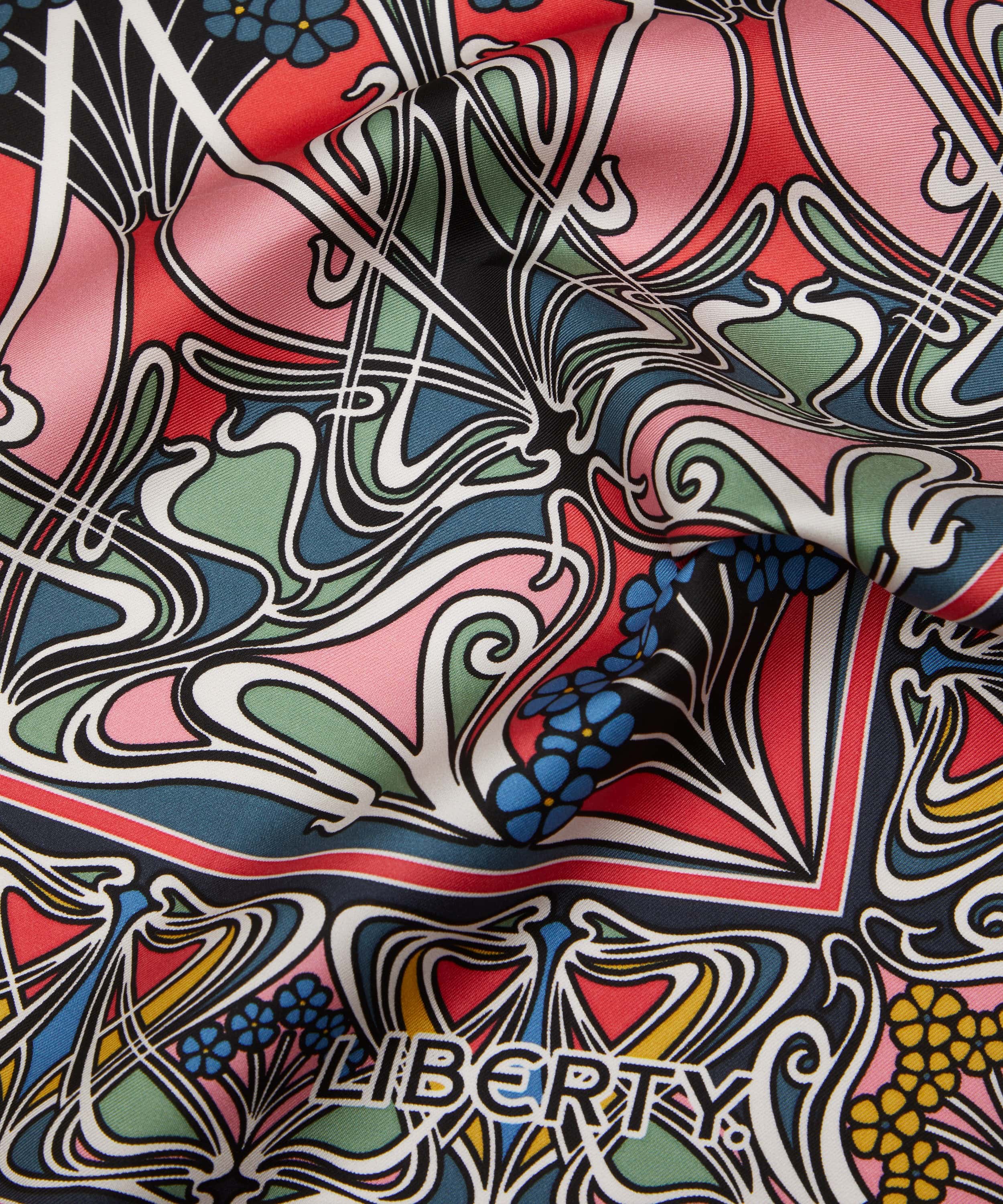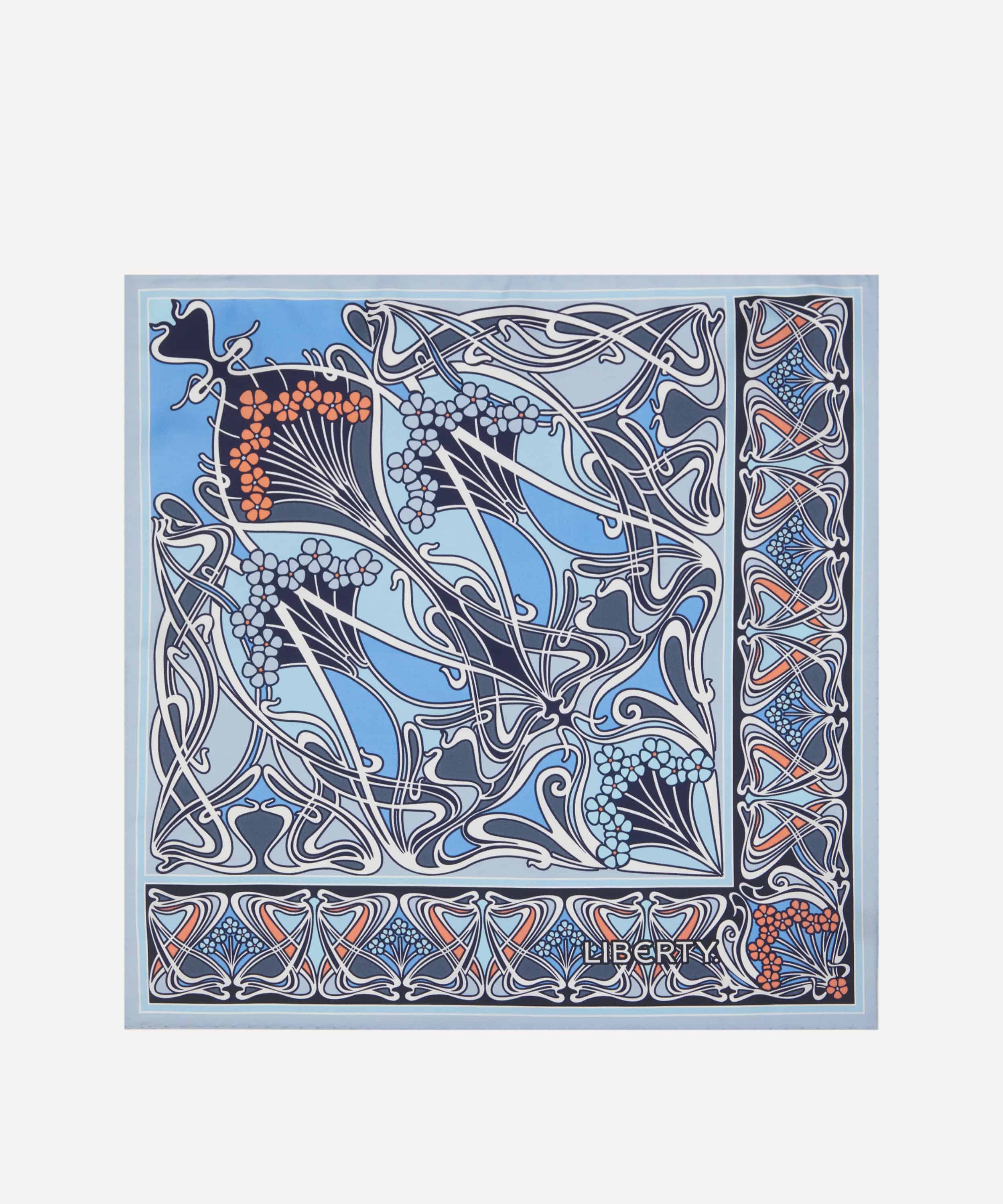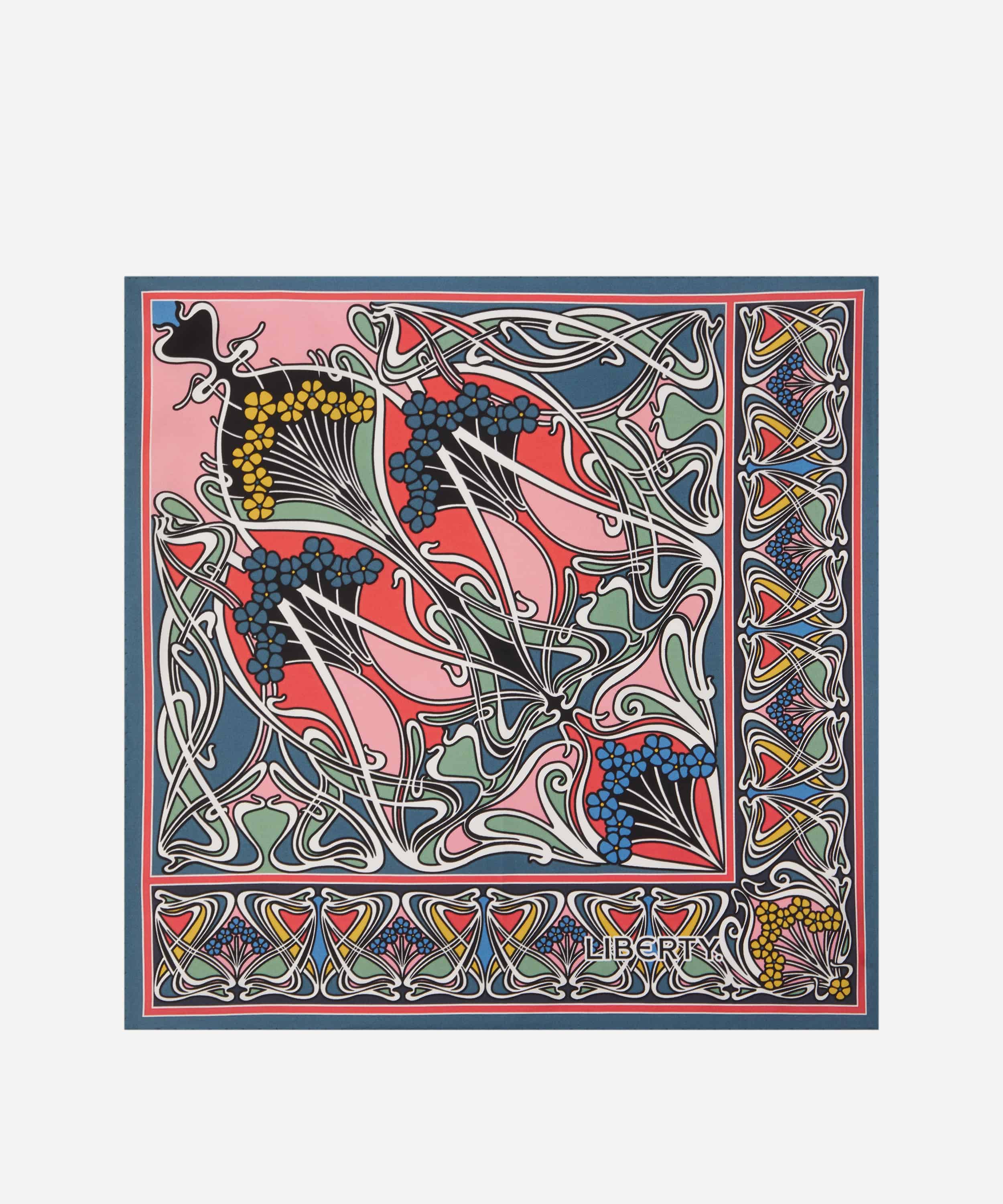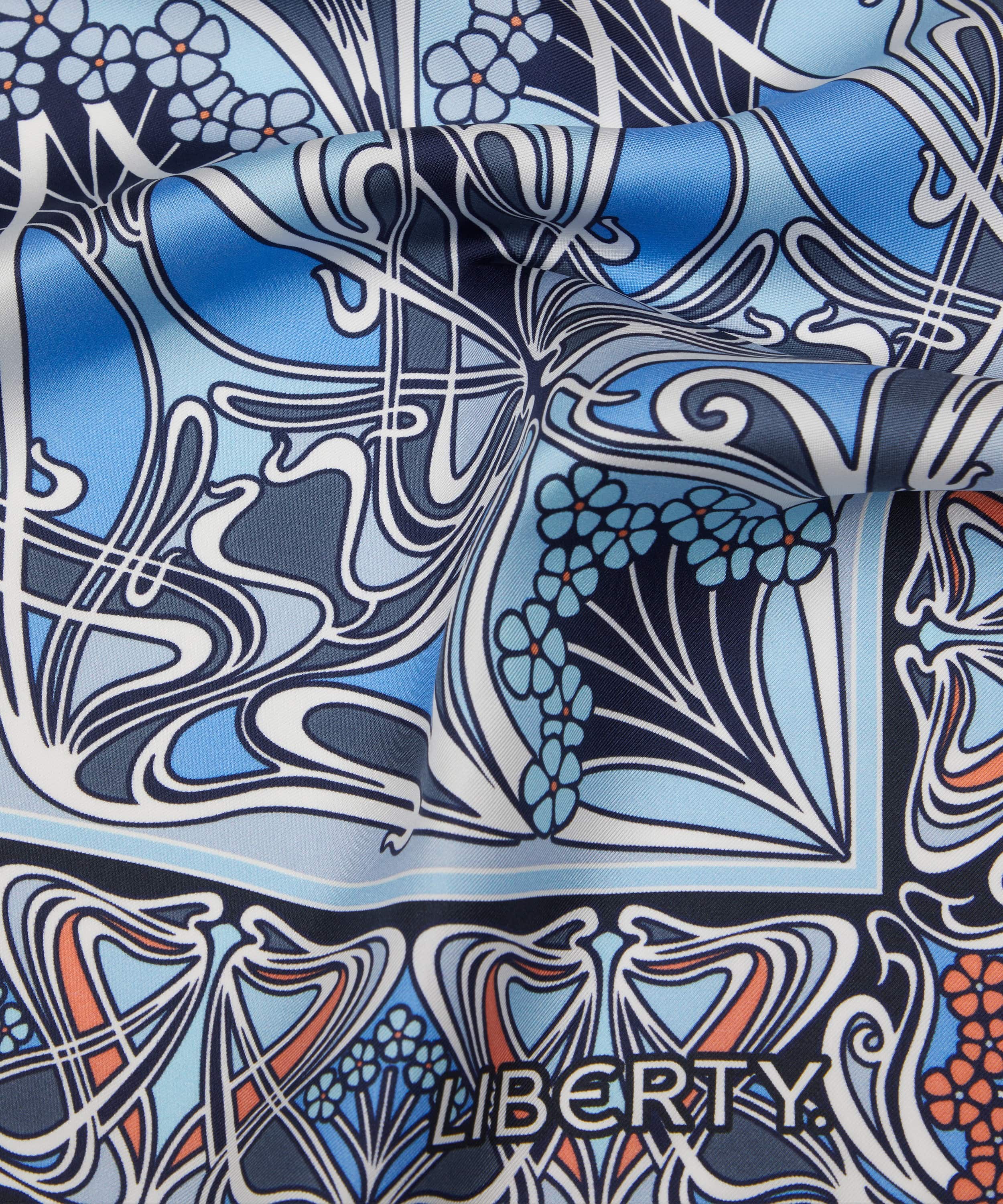 シルクツイルスカーフ / アイアンシ プリント / ロール仕上げのエッジ / イタリア・コモにてプリント / コーナーにリバティロゴ / リバティのインハウスデザインスタジオにて設計