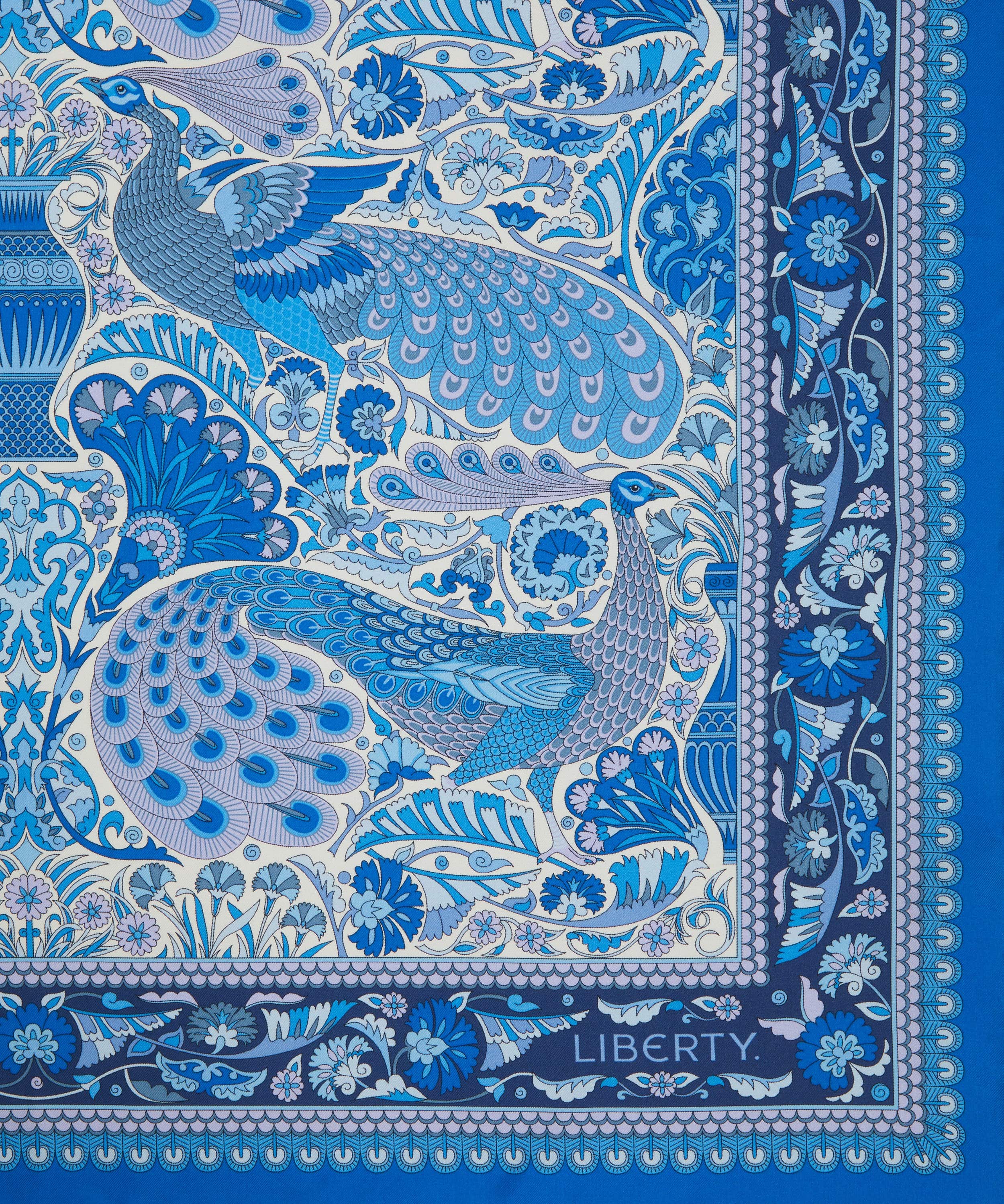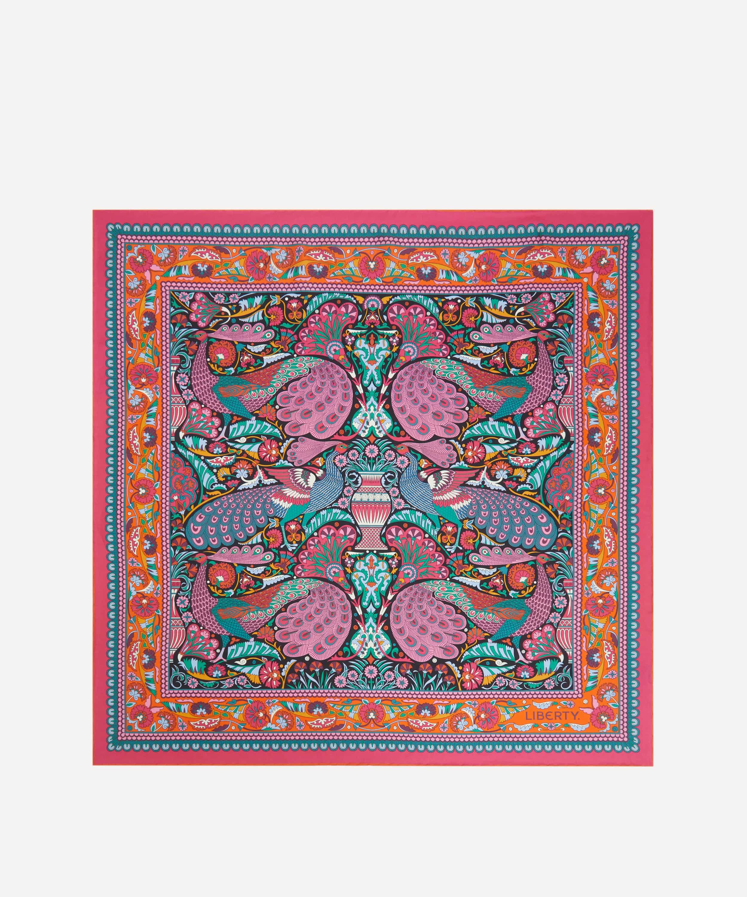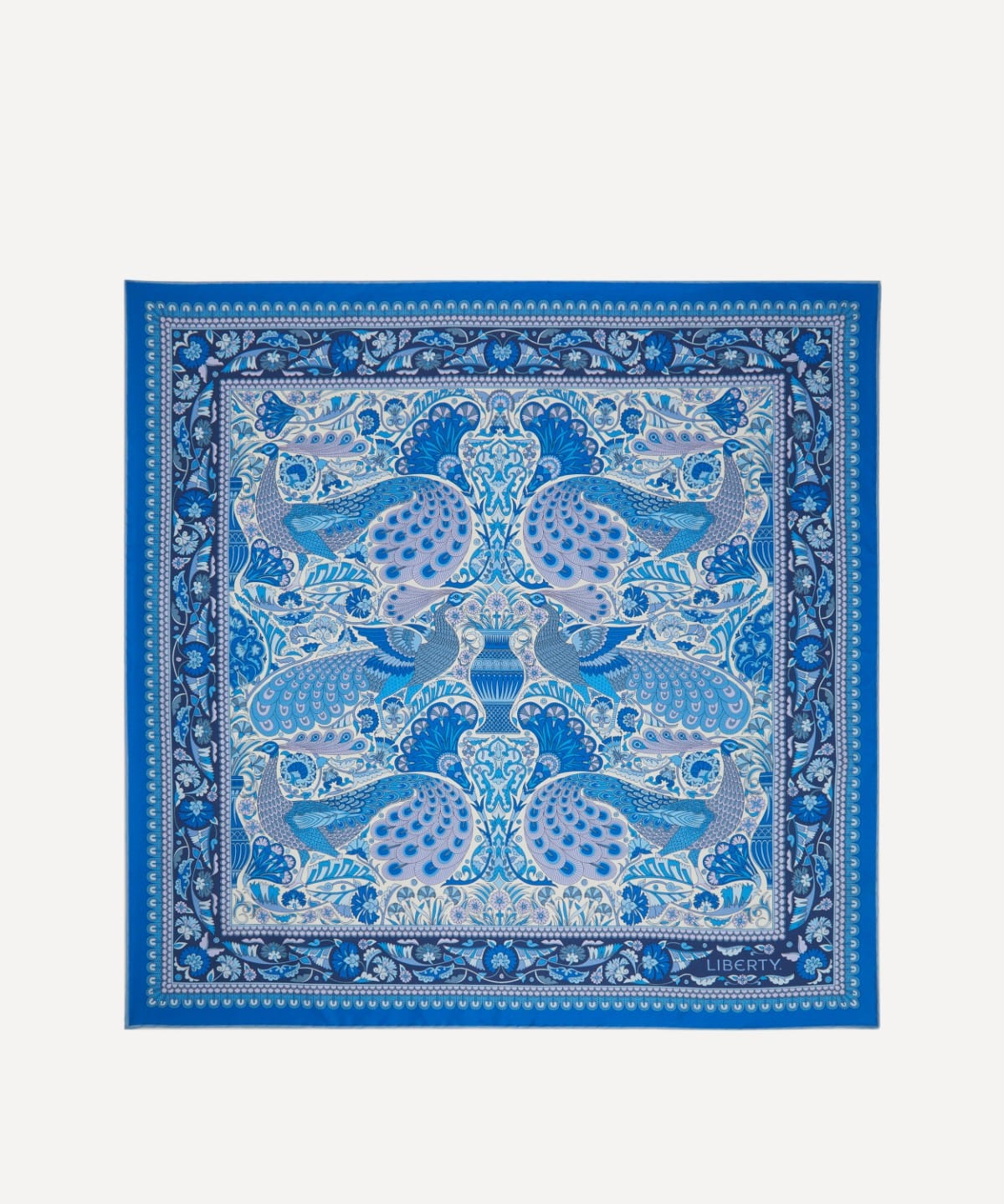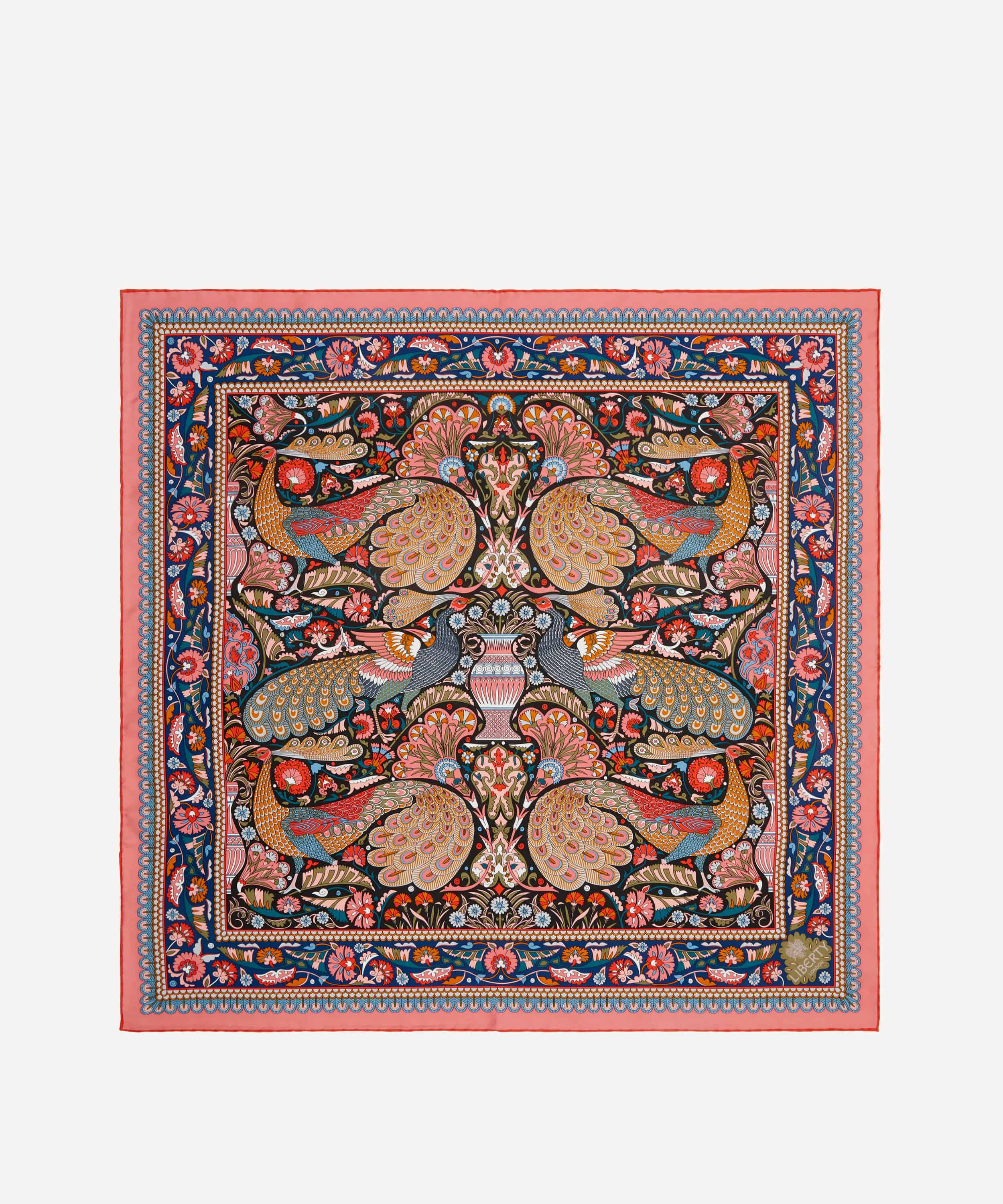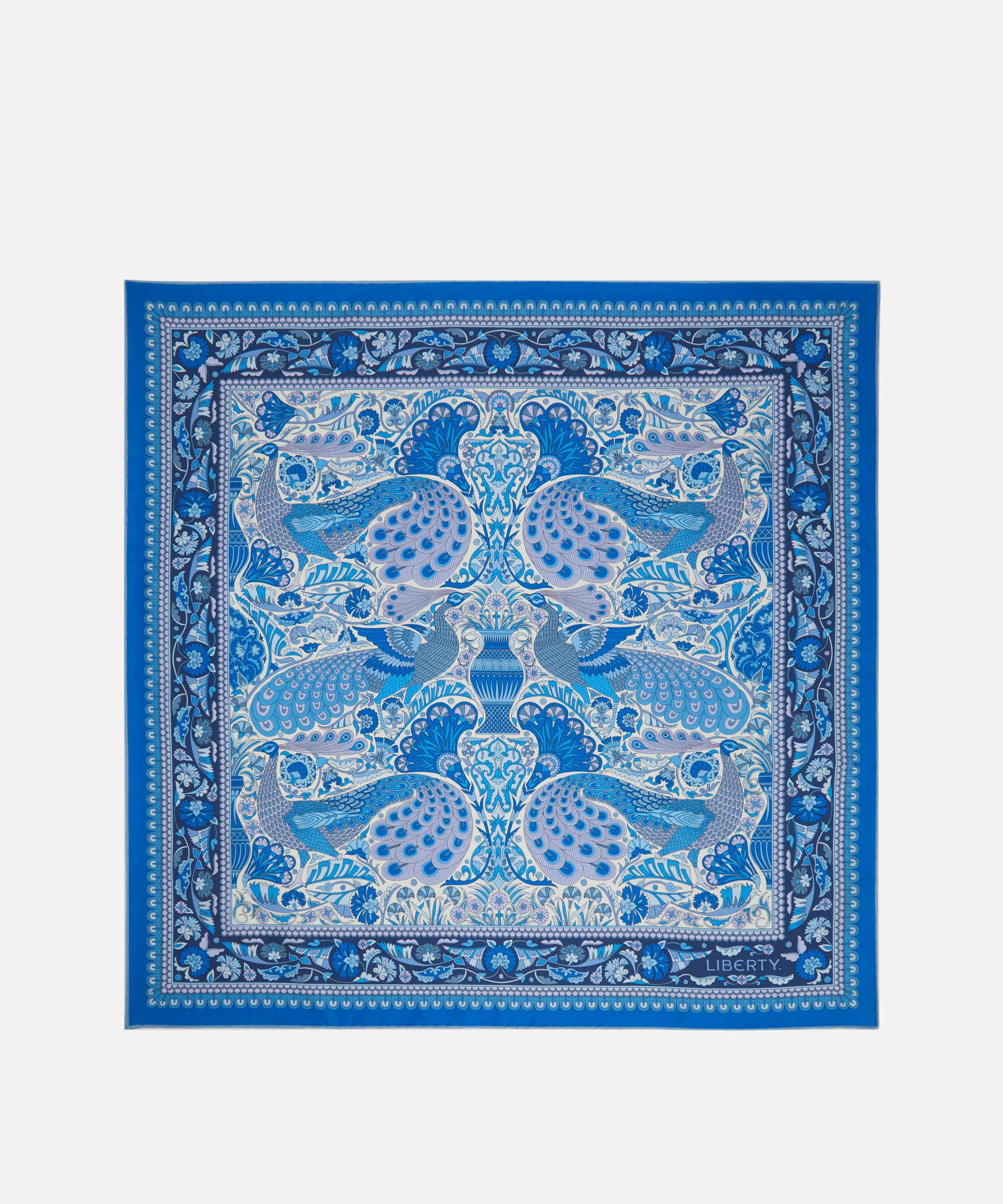 「ピーコック ガーデン シルクツイルスカーフ」は、リバティの代表的なプリントを美しく表現した一枚です。