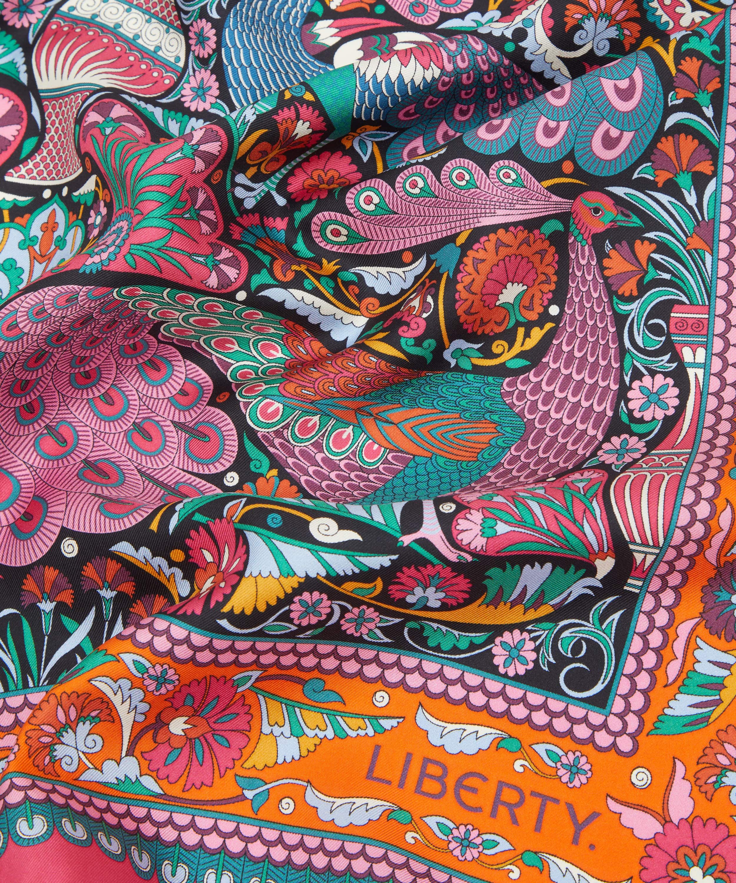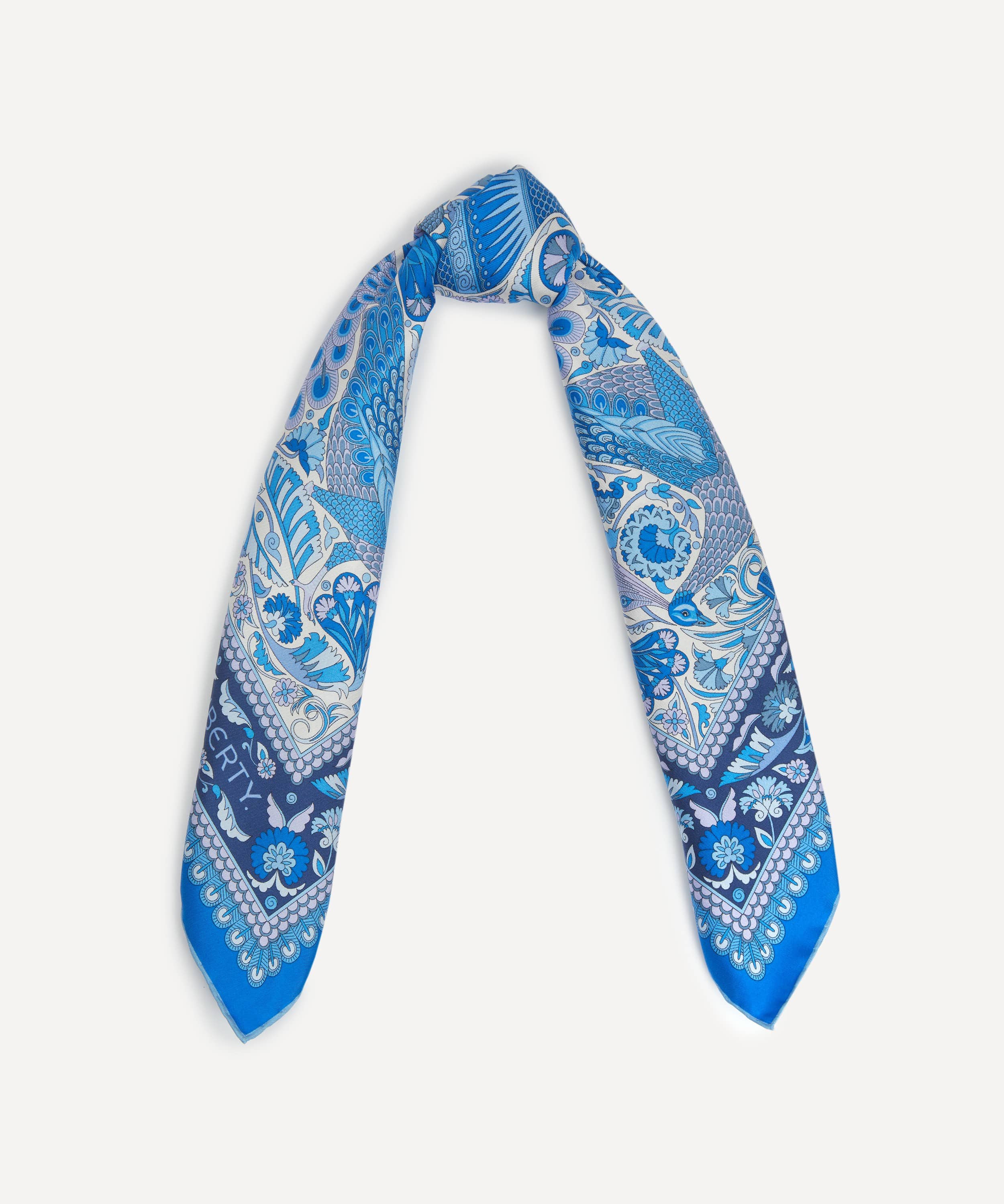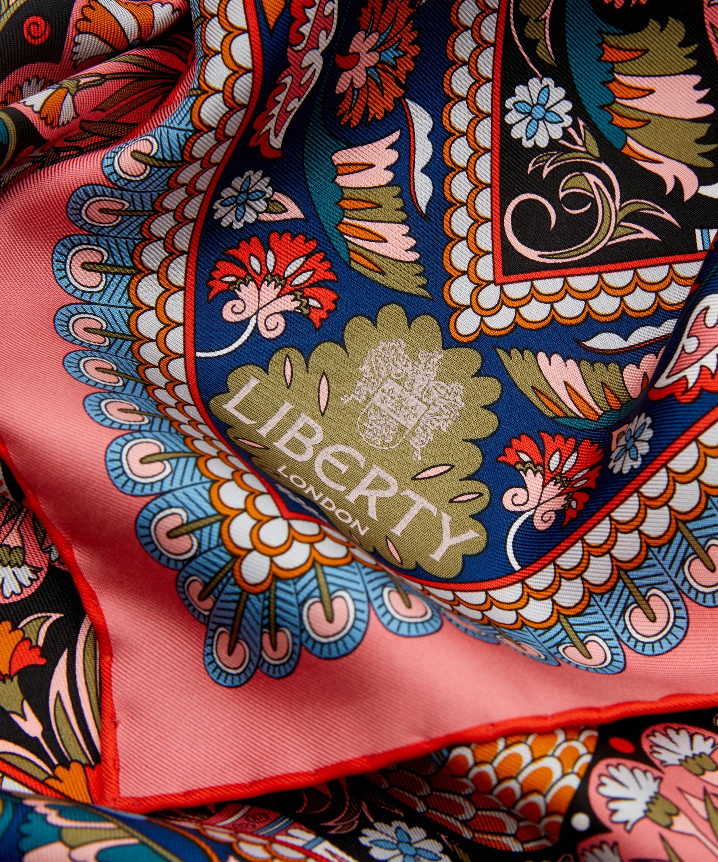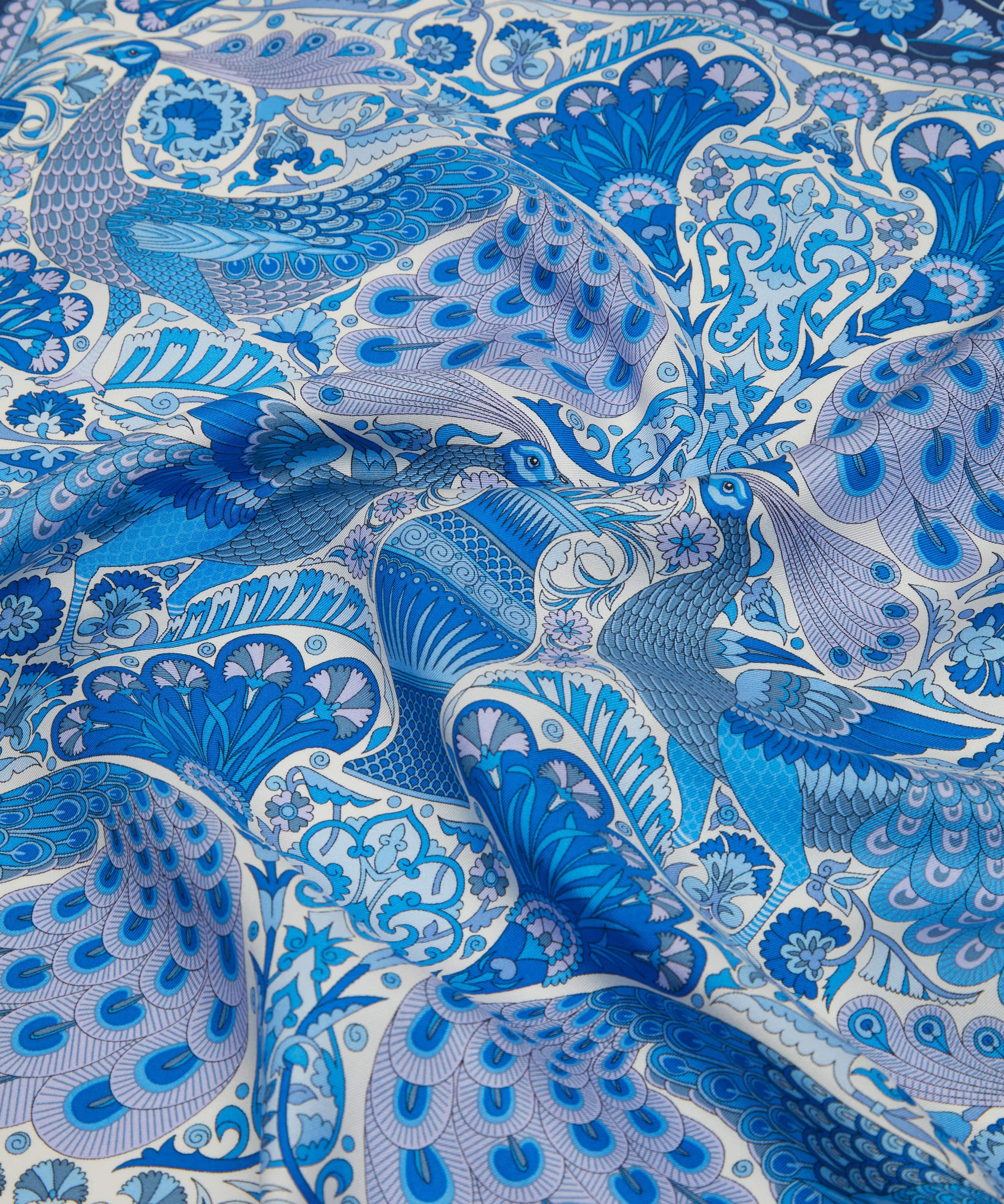 「ピーコック ガーデン シルクツイルスカーフ」は、リバティの代表的なプリントを美しく表現した一枚です。