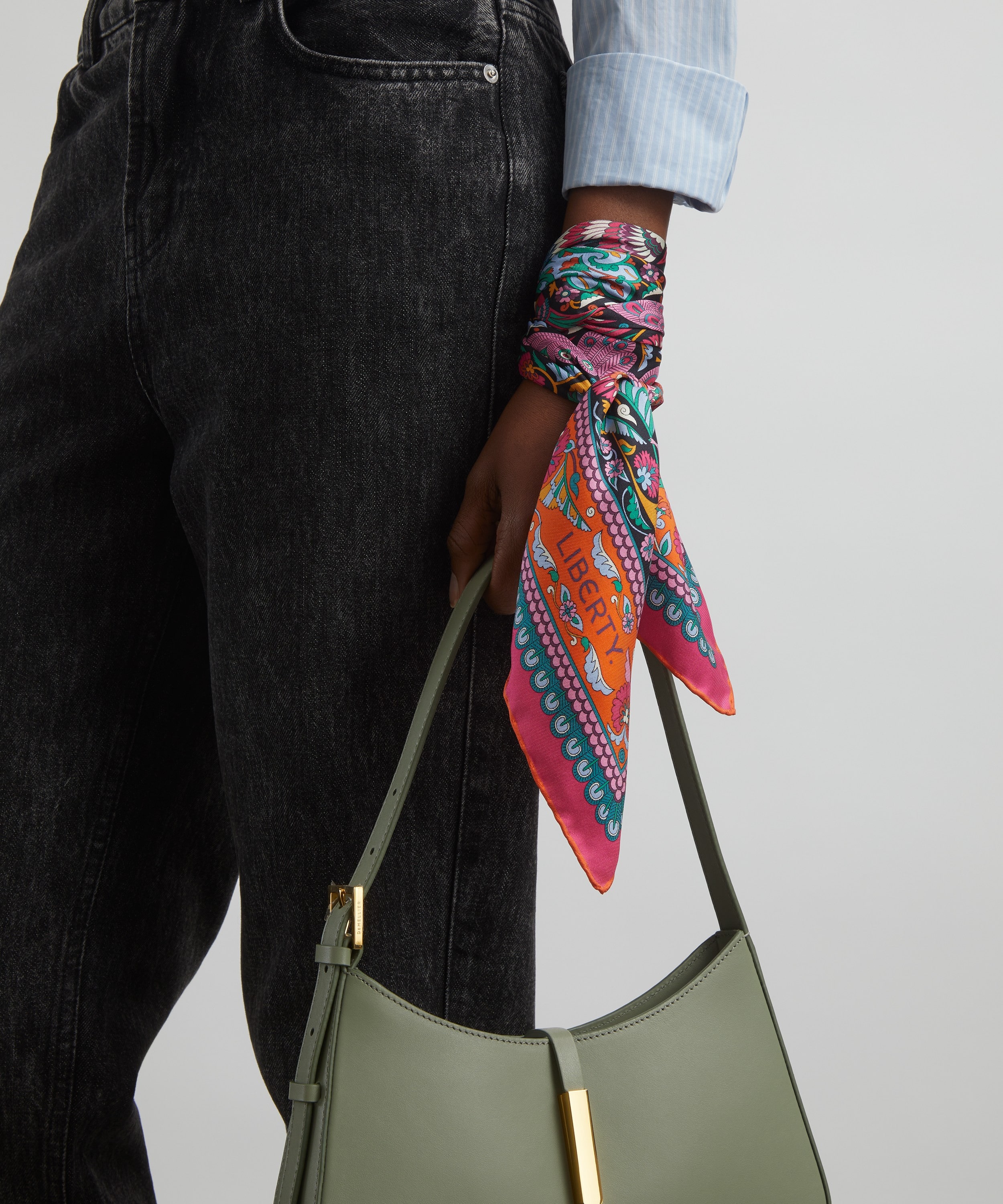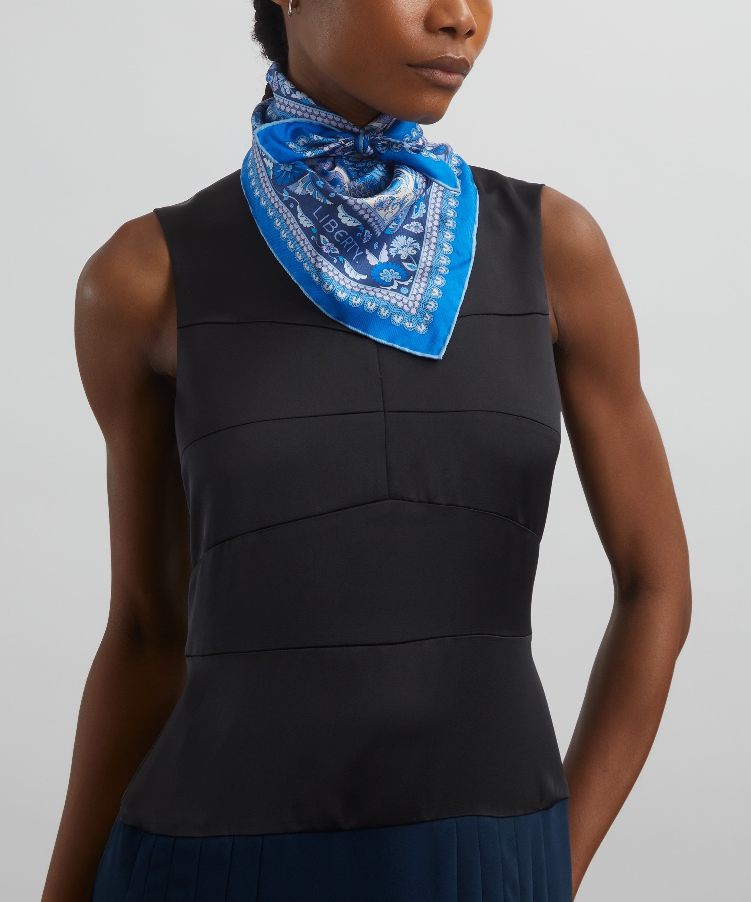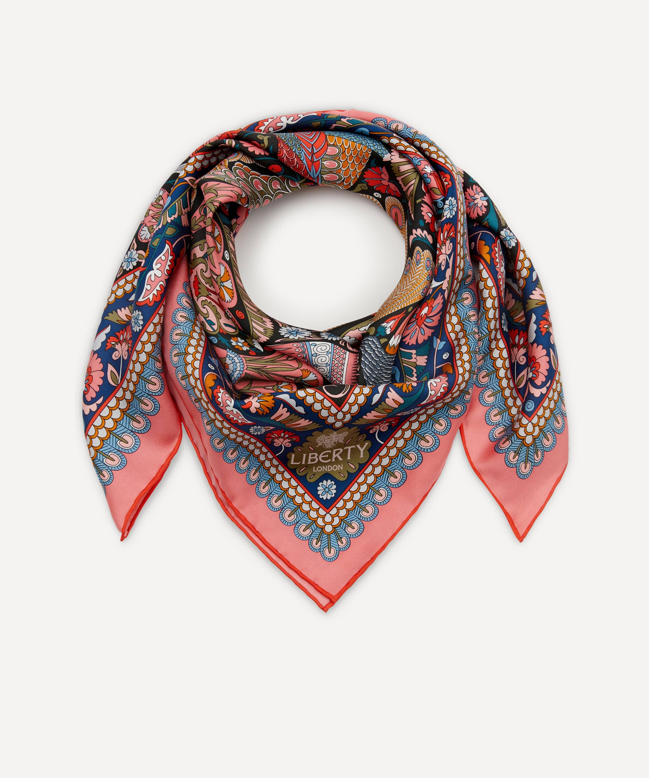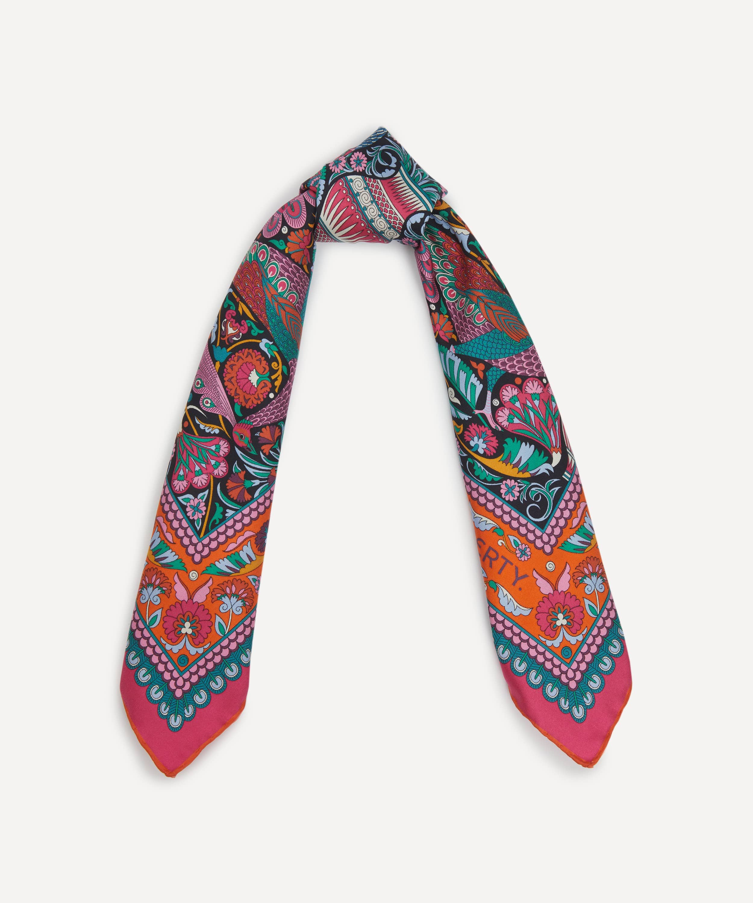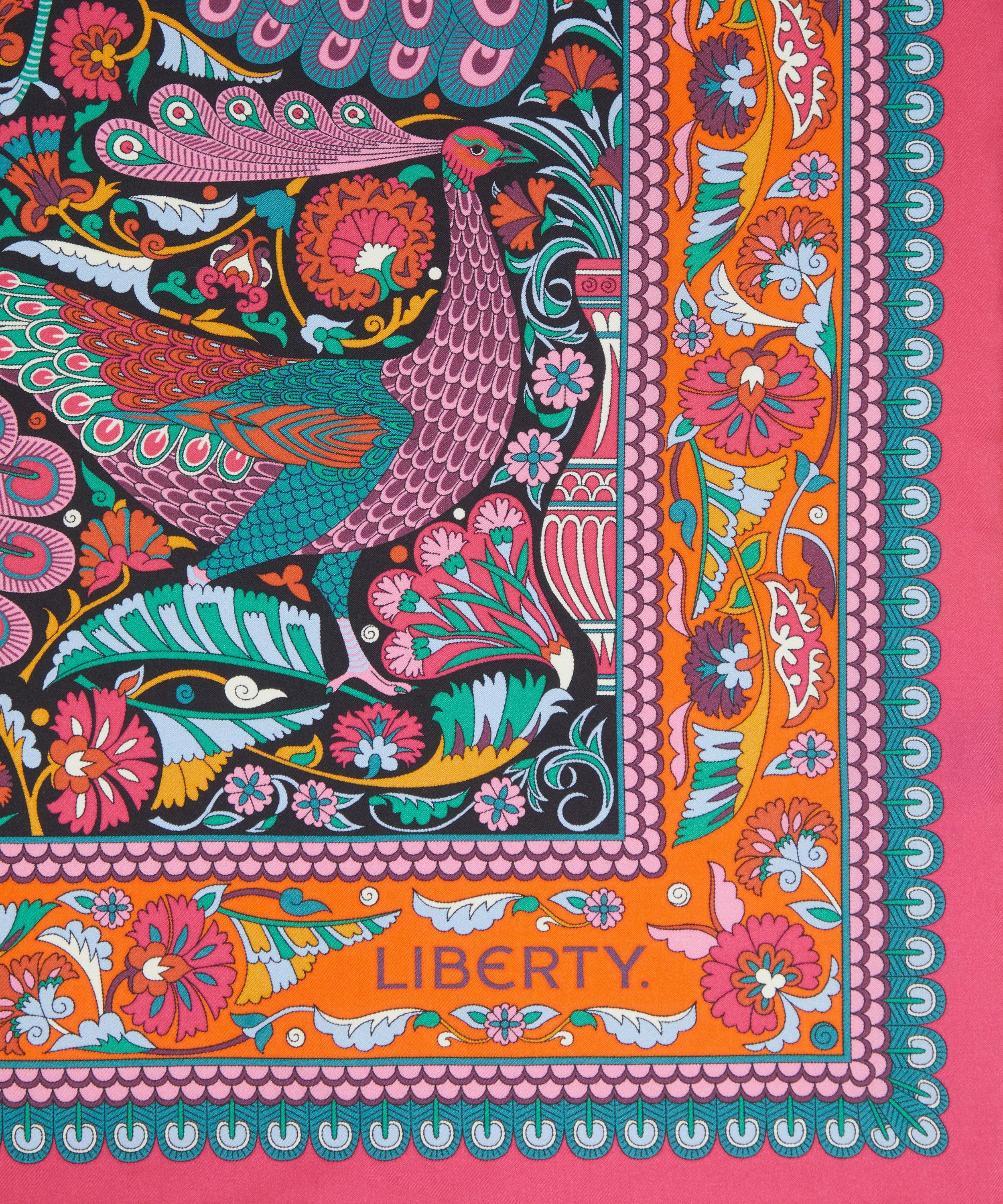 「ピーコック ガーデン シルクツイルスカーフ」は、リバティの代表的なプリントを美しく表現した一枚です。