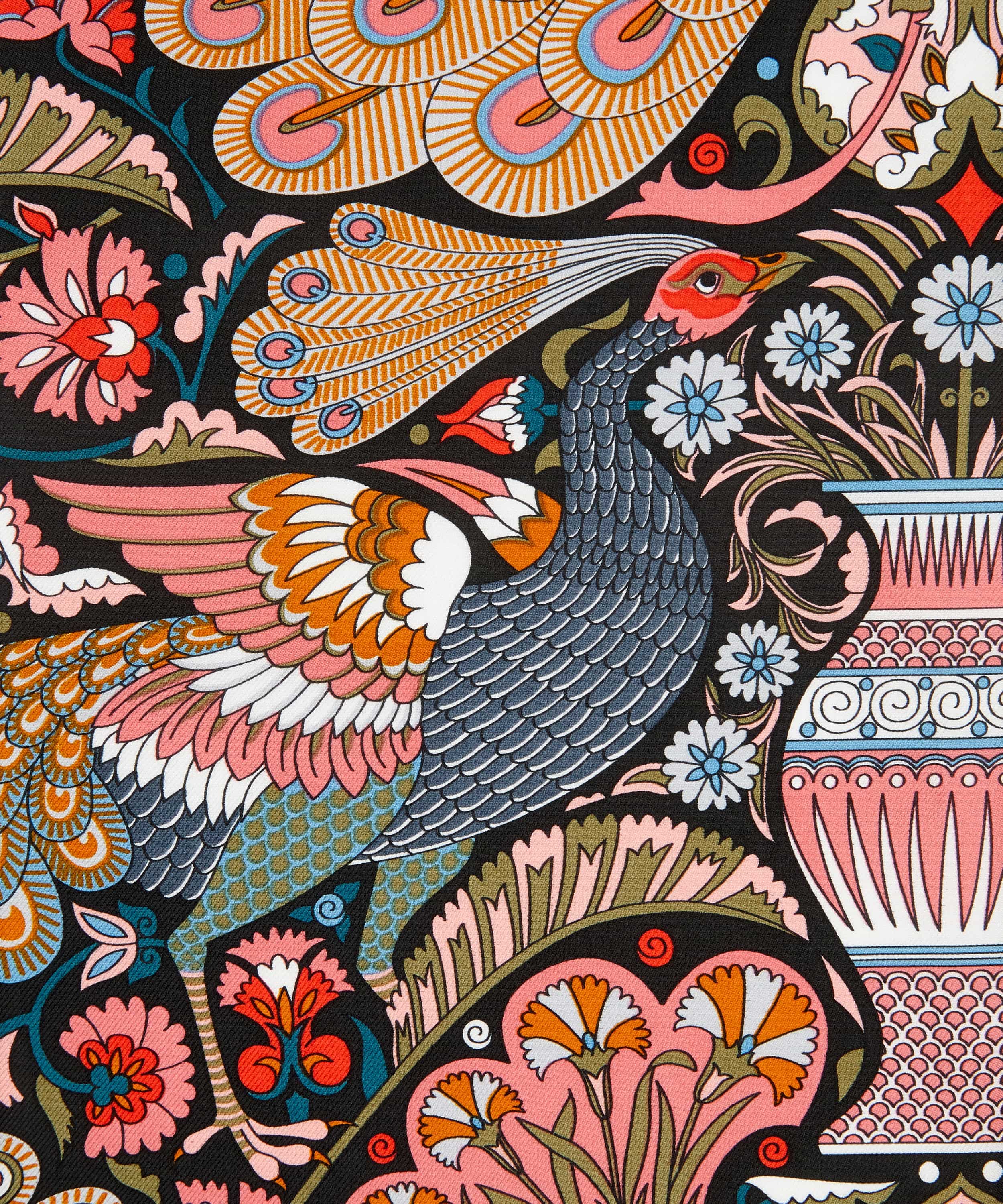 1990年に生まれたオリジナルデザインは、ウィリアム・ド・モーガンによるタイルモザイクに着想を得たもの。本作ではシルクツイルに再構成され、オリエンタルな雰囲気の中に花器や孔雀、花々が豊かに描かれています。さらに2013年には、孔雀をモチーフにしたボーダーが加えられ、装飾性をより際立たせるデザインへとアップデートされました。