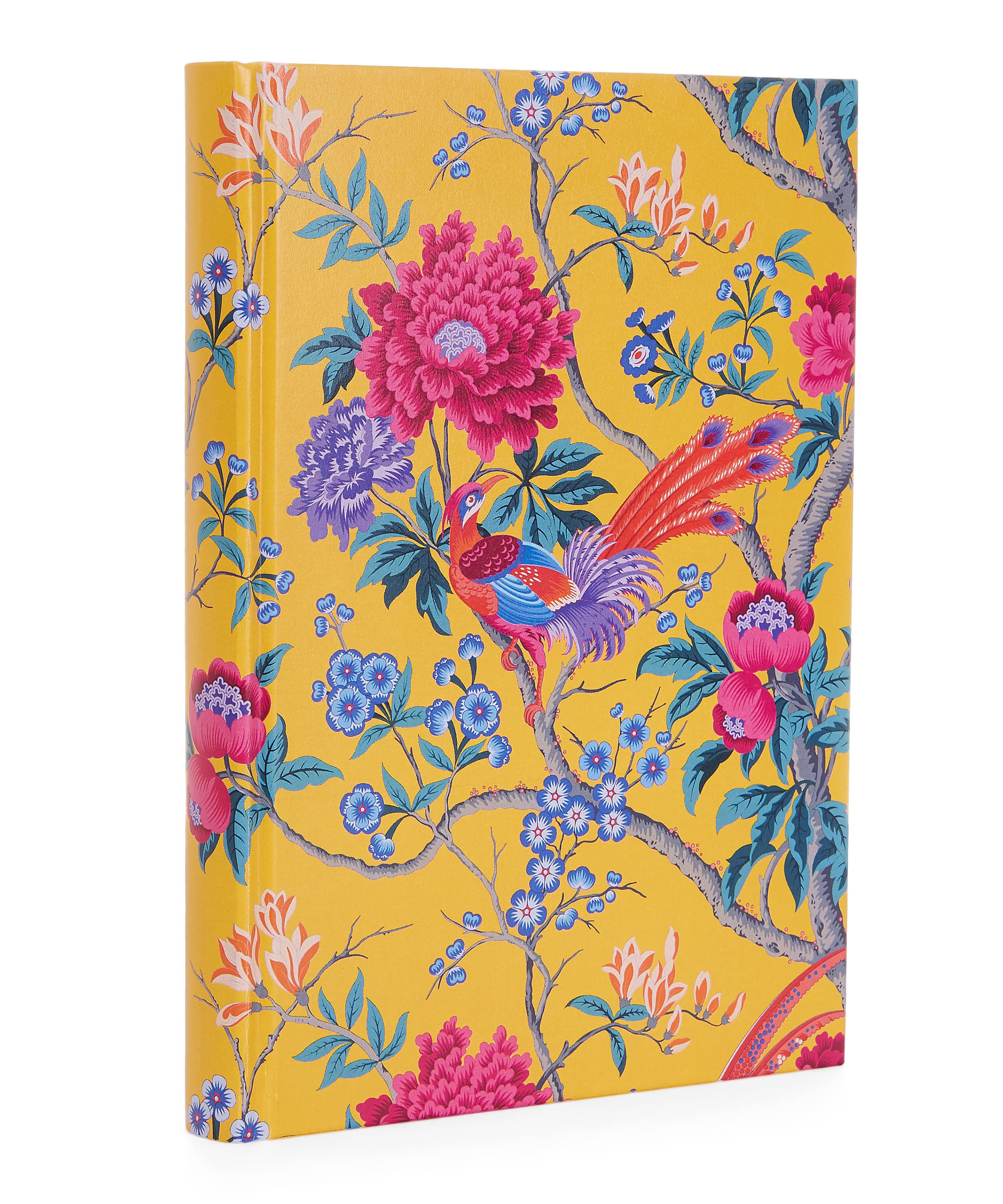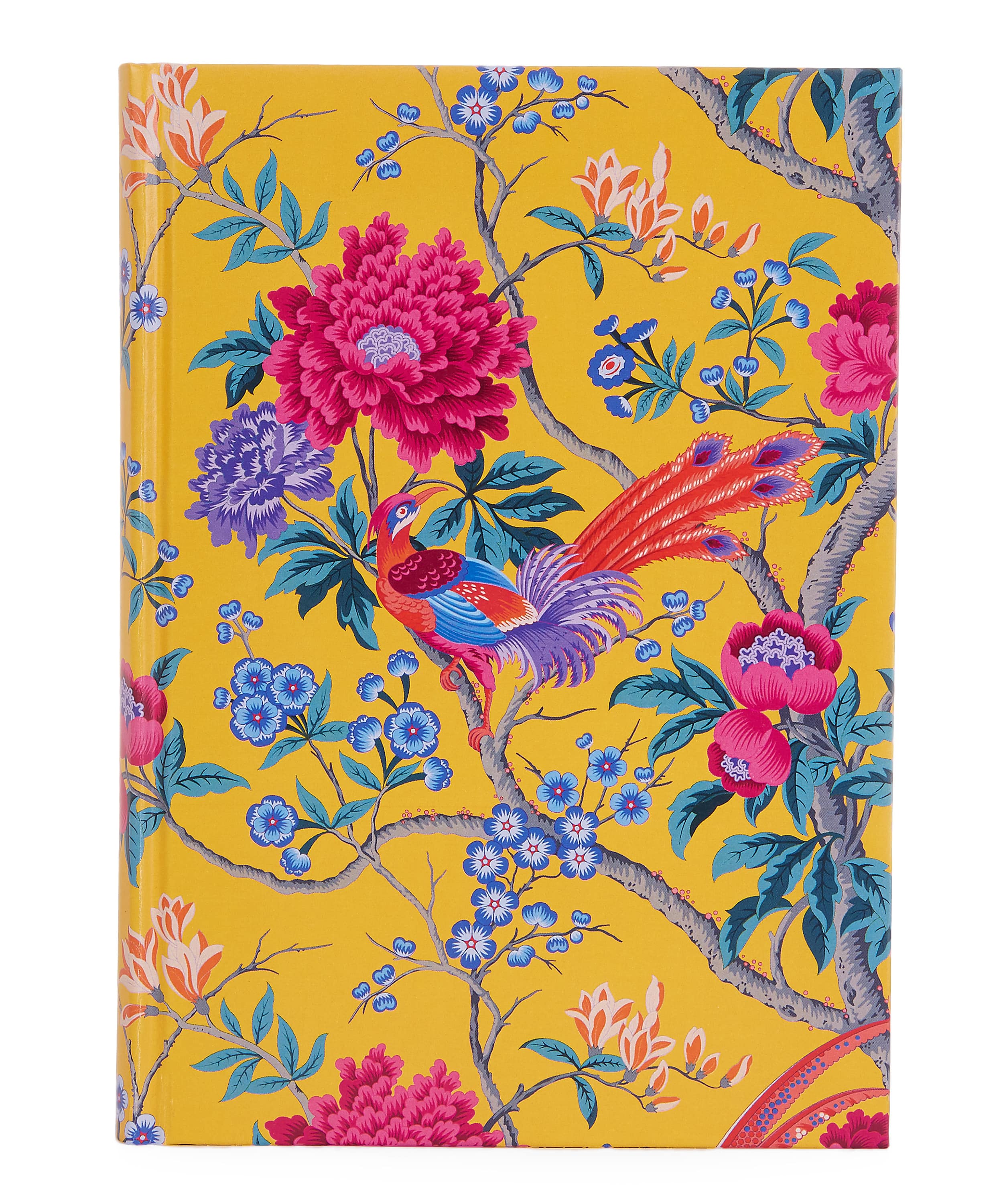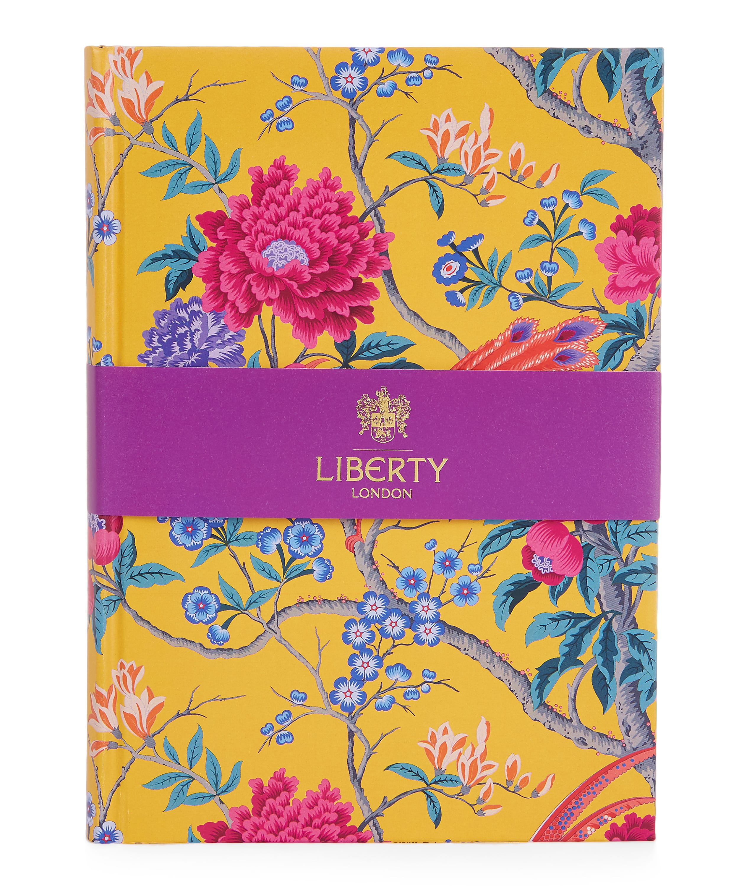 ハンドバッグにも入れやすいA5サイズのハードカバーで、さっとメモを書き留めるにも使いやすい横罫の「リバティ」のノートです。家具用生地の為にハンドペイントされたデザインをベースに、菊や花が咲き誇る枝葉の間に鳥が描かれたオリエンタルな「エリジアン パラダイス」の表紙が美しいノートは、ご自身でお使いになるのはもちろんギフトにもぴったりなアイテムです。