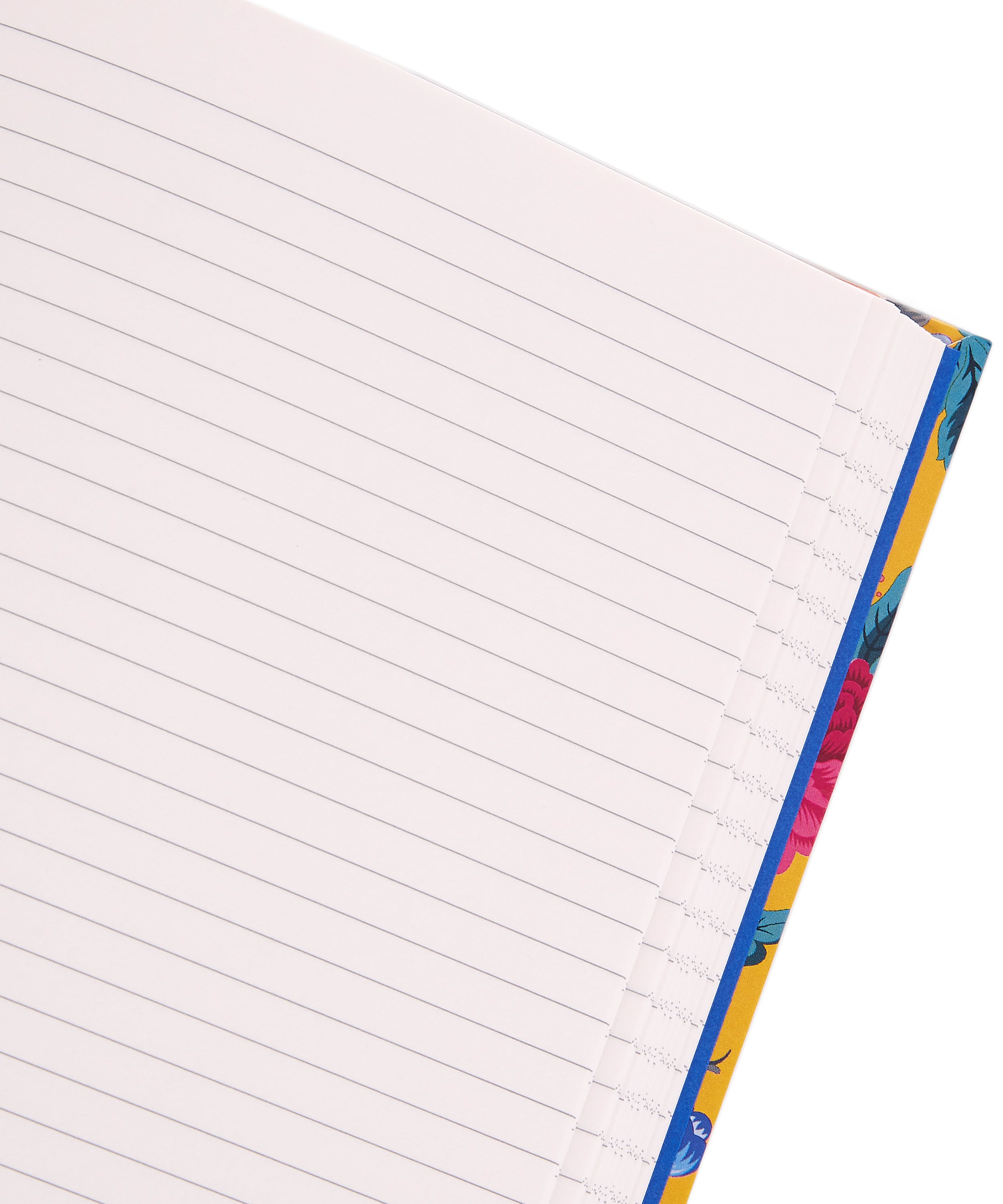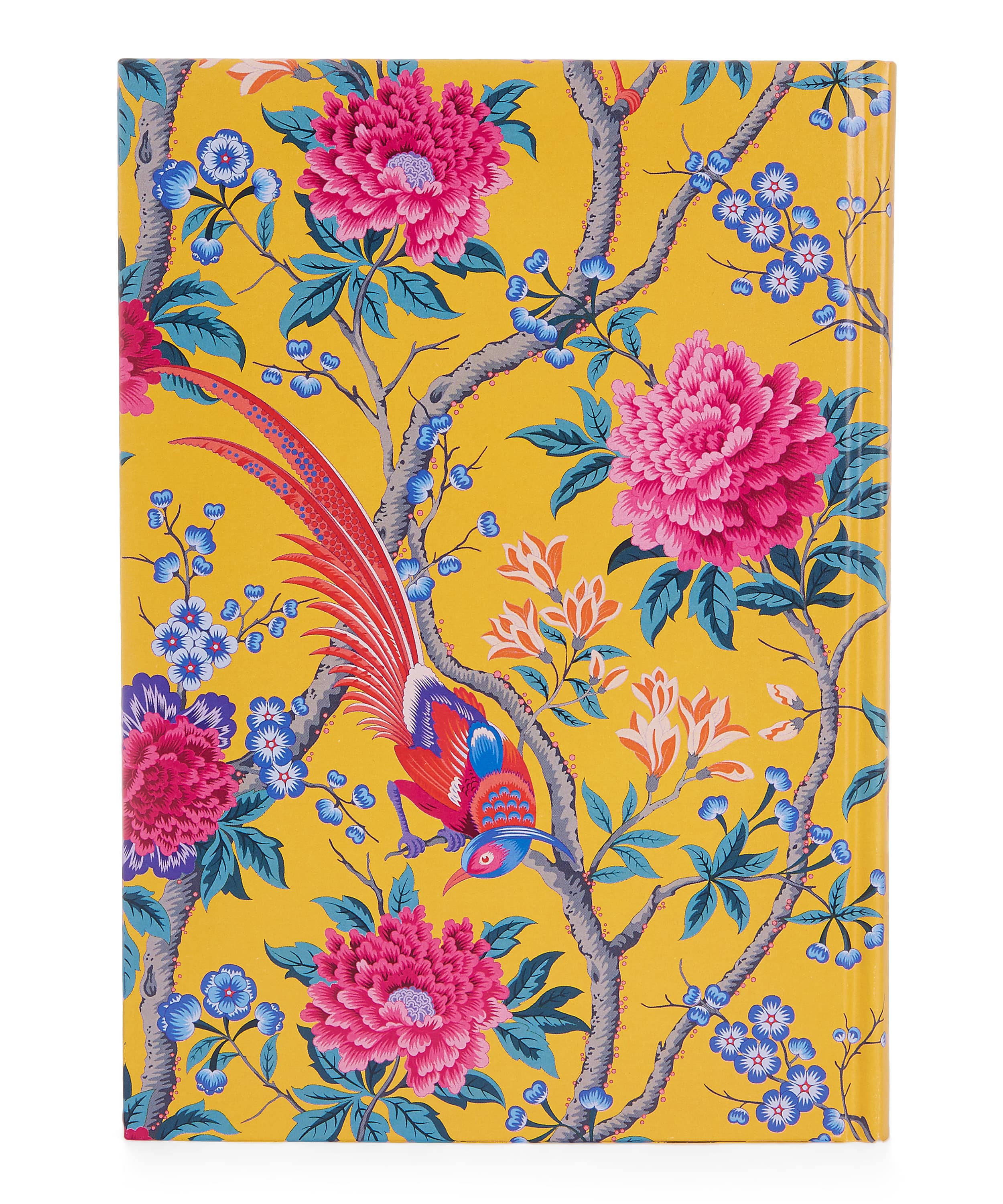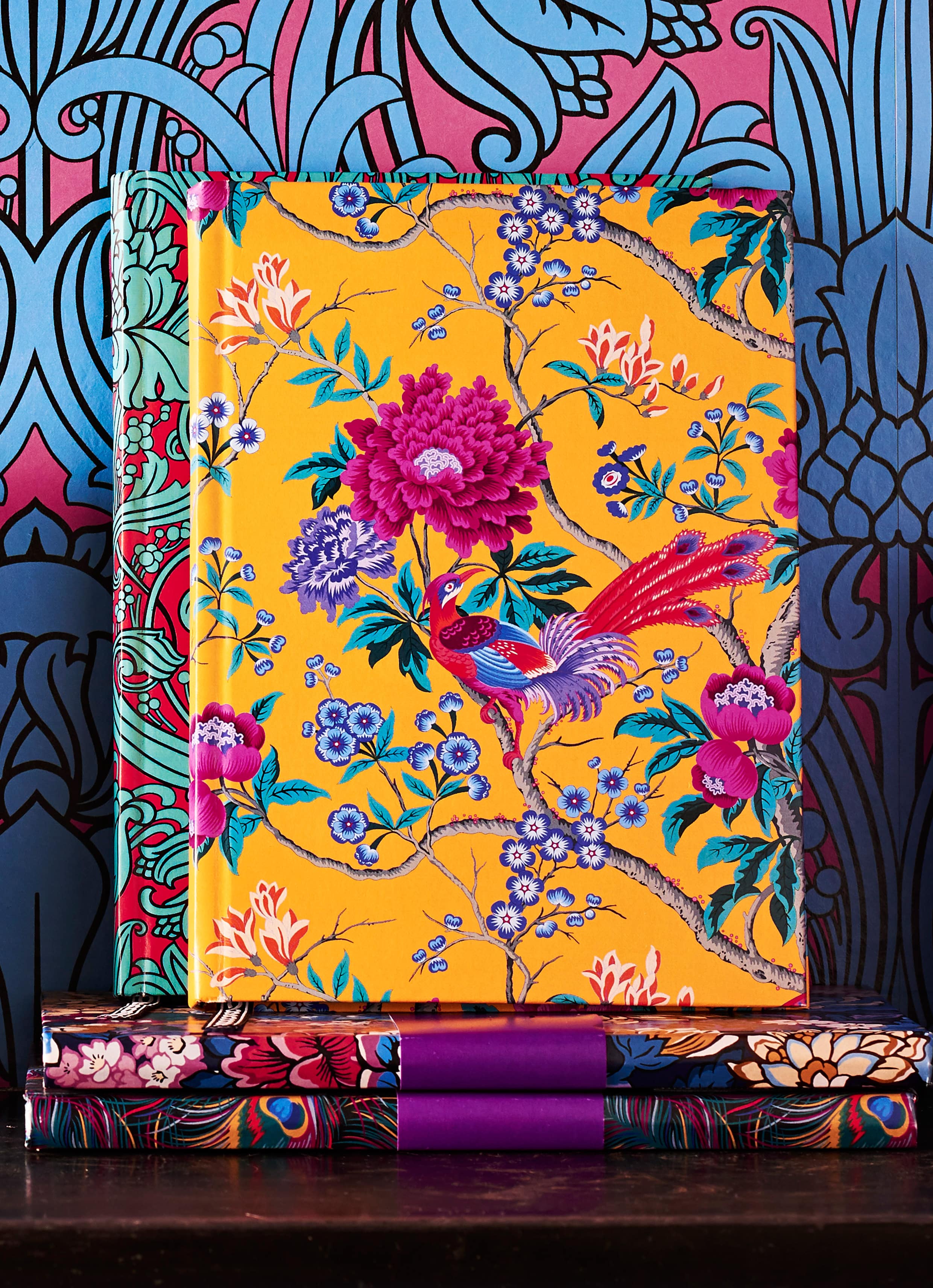 ハンドバッグにも入れやすいA5サイズのハードカバーで、さっとメモを書き留めるにも使いやすい横罫の「リバティ」のノートです。家具用生地の為にハンドペイントされたデザインをベースに、菊や花が咲き誇る枝葉の間に鳥が描かれたオリエンタルな「エリジアン パラダイス」の表紙が美しいノートは、ご自身でお使いになるのはもちろんギフトにもぴったりなアイテムです。