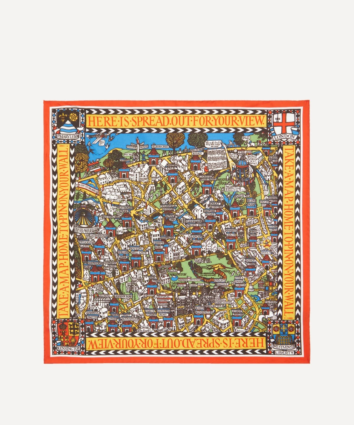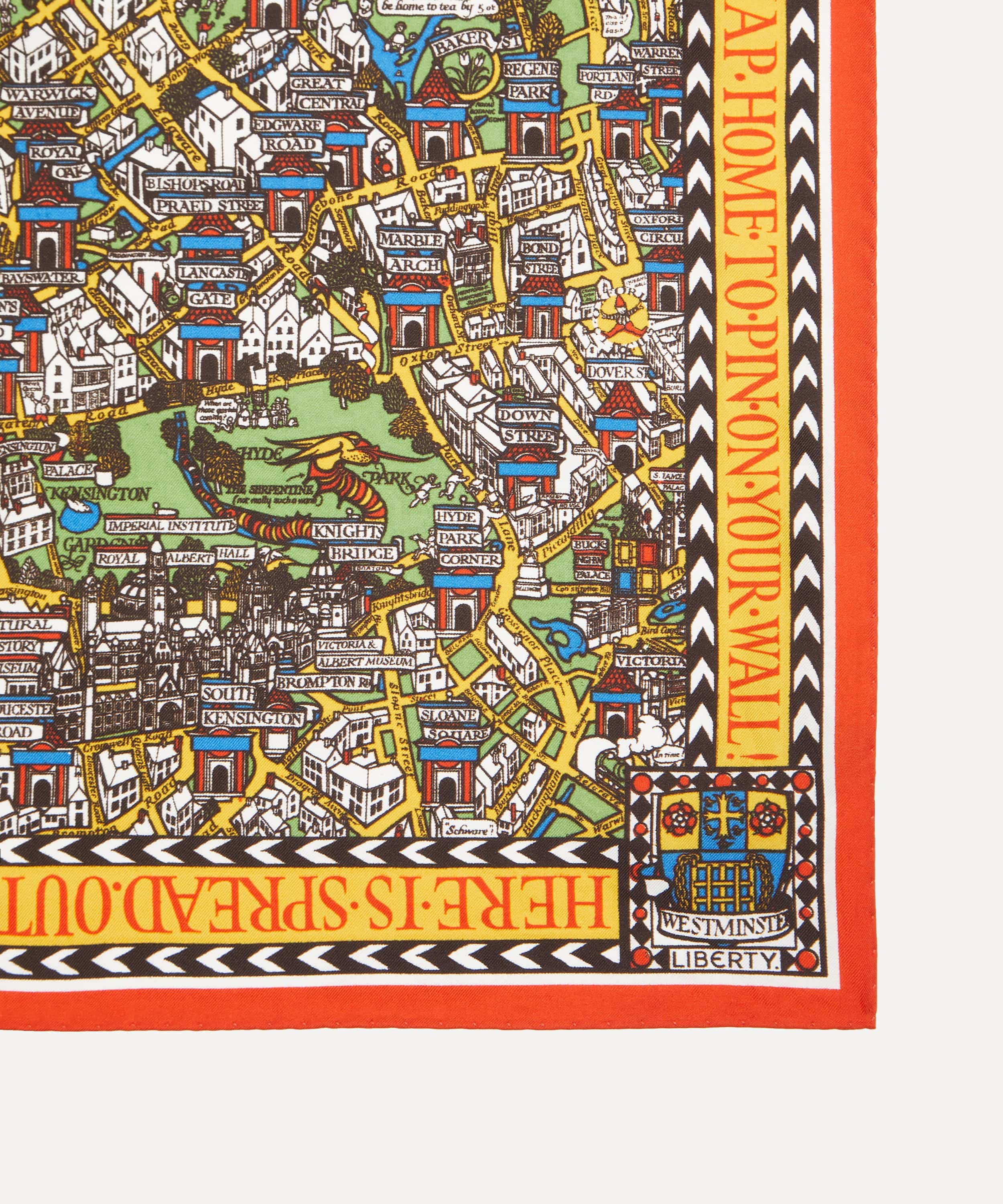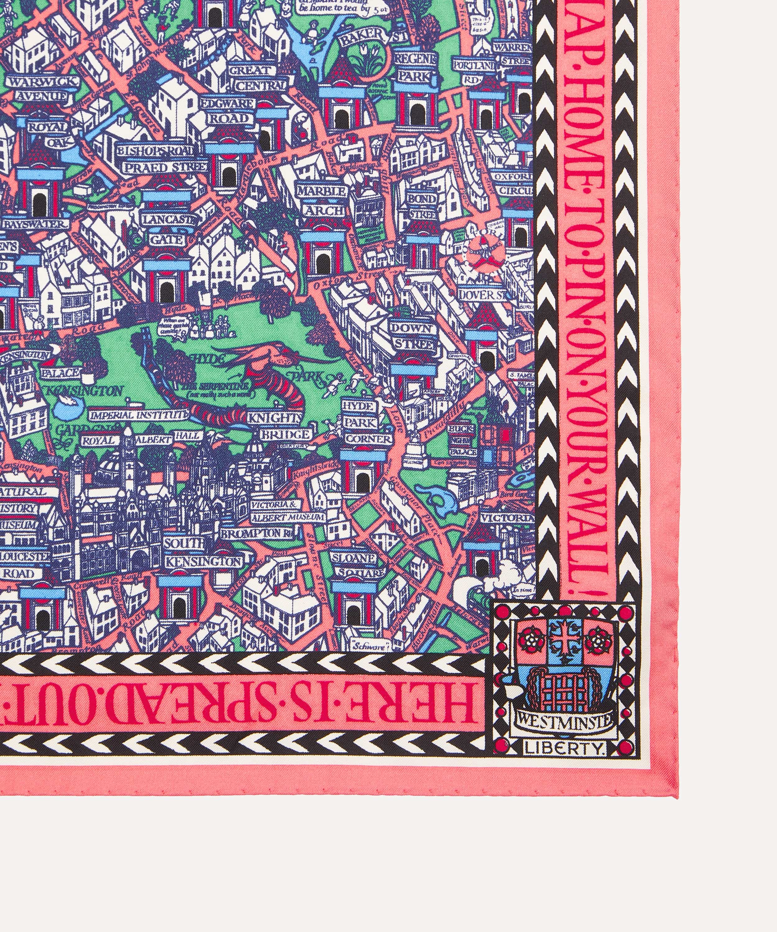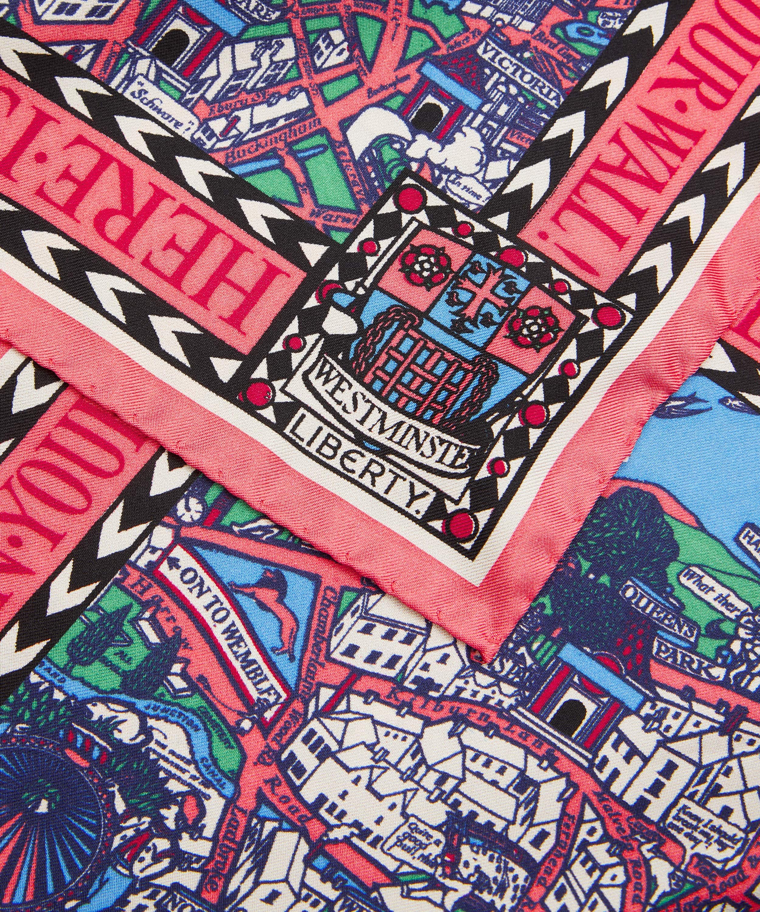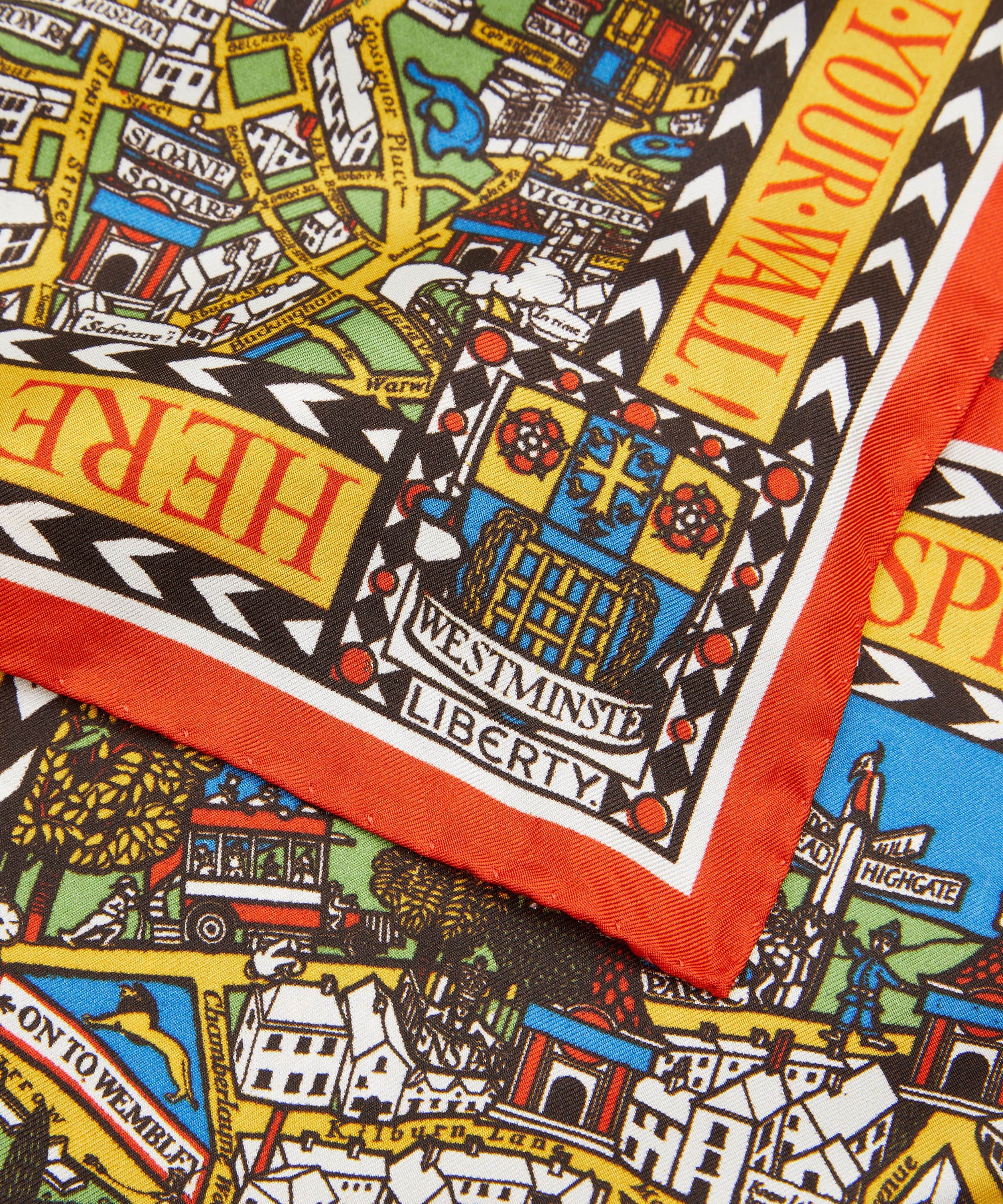 なめらかなシルクツイルに施された「ビッグ スモーク」プリントは、グラフィックアーティストのマクドナルド・ギルによる、ロンドンの名所を描いたユーモラスで魅力あふれる地図作品(1914年)に着想を得たもの。街の個性や物語を感じさせるデザインが特徴です。