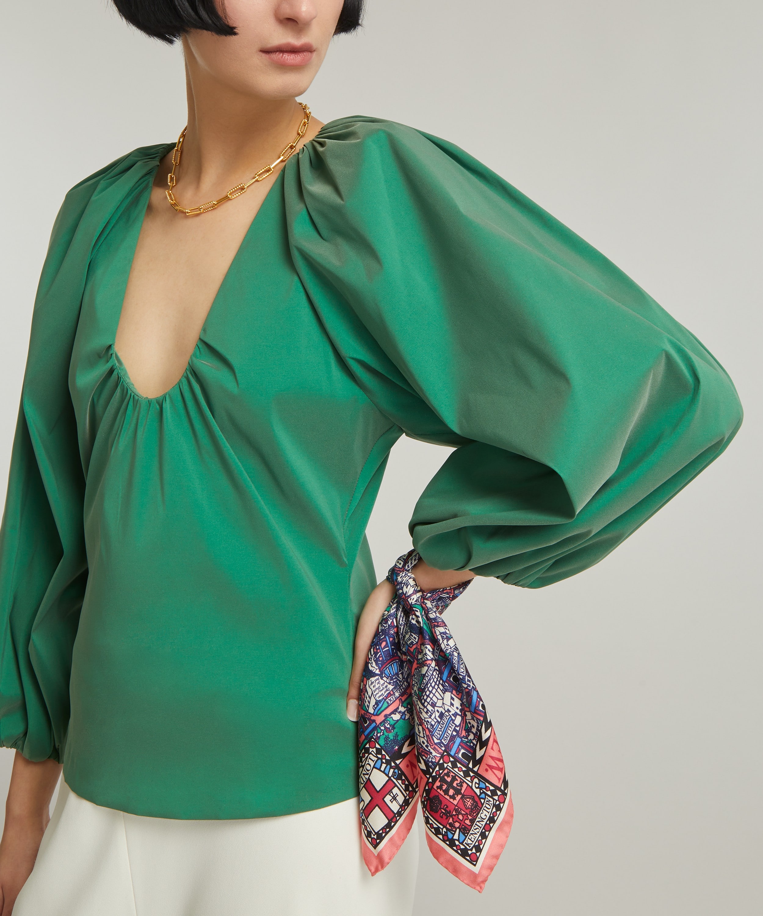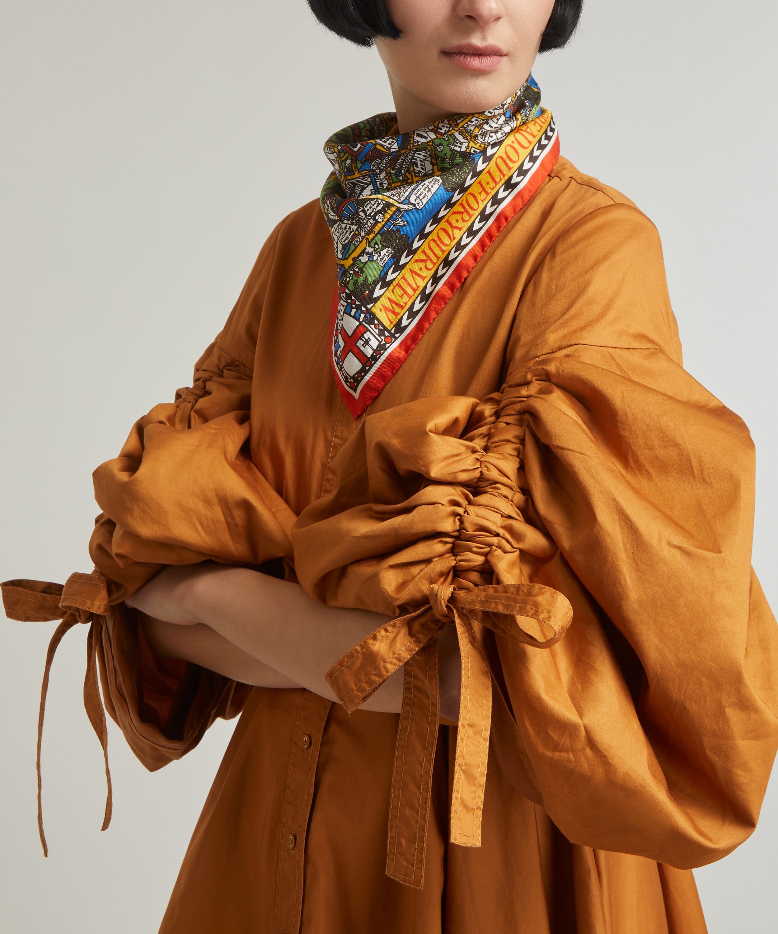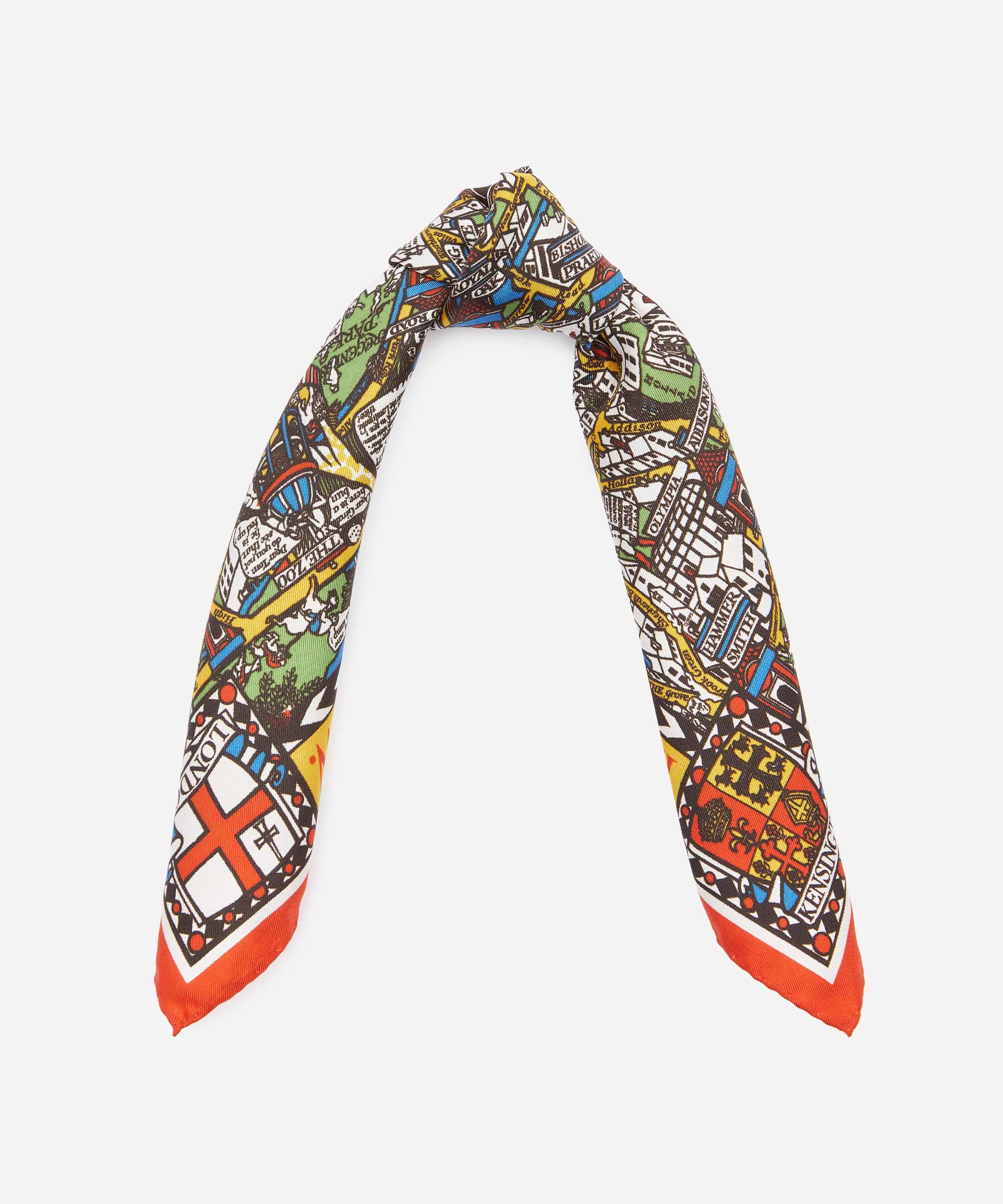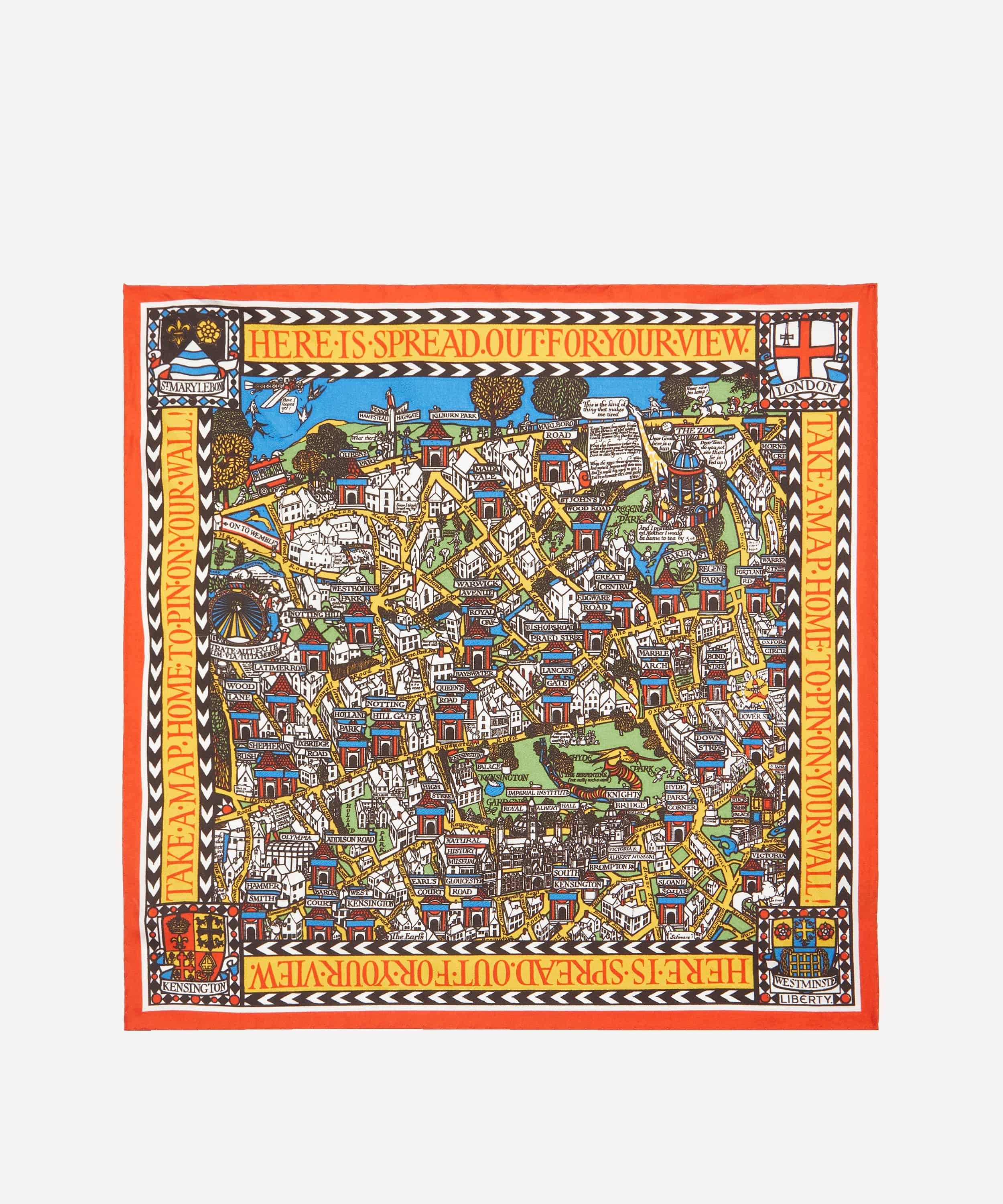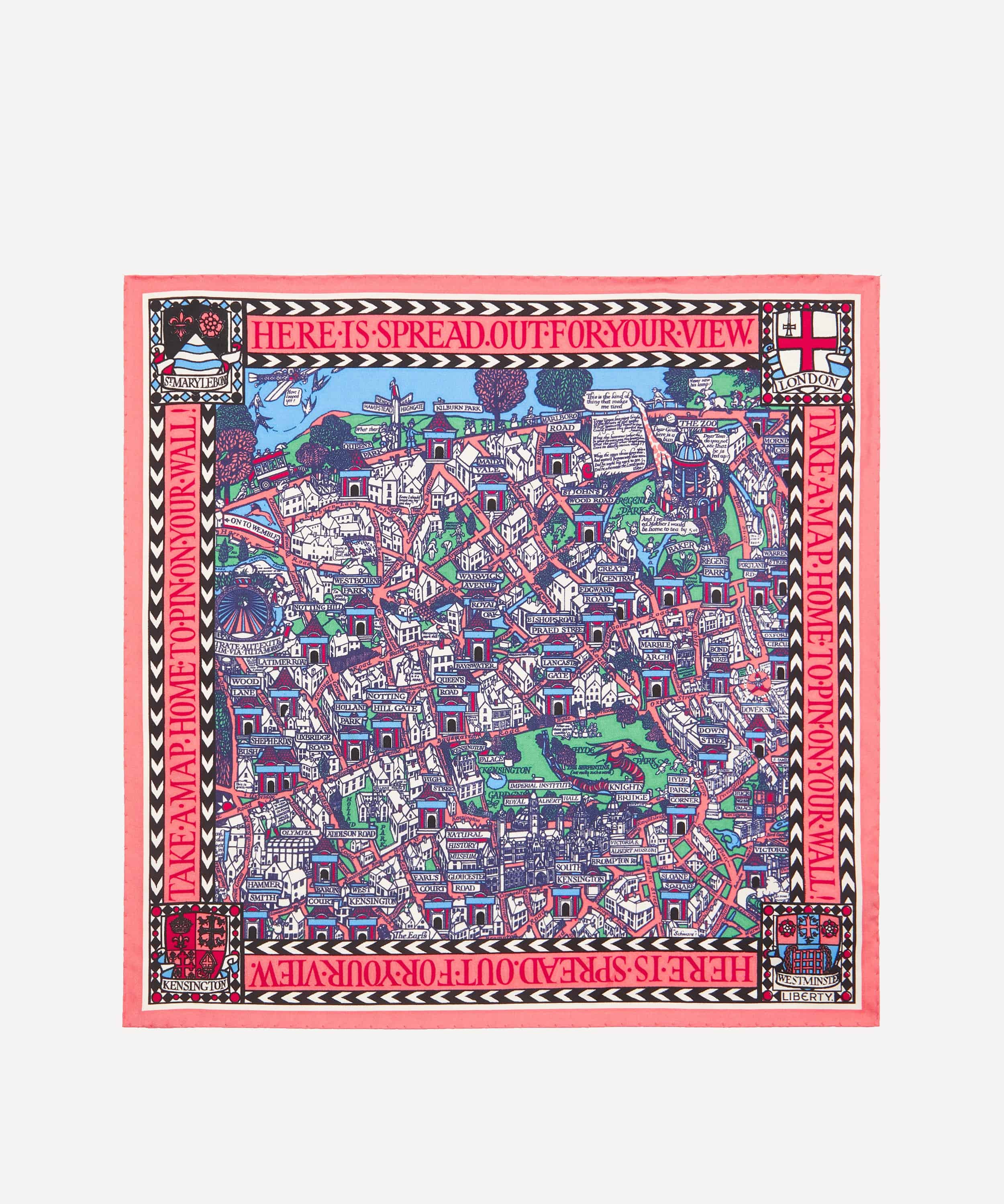 なめらかなシルクツイルに施された「ビッグ スモーク」プリントは、グラフィックアーティストのマクドナルド・ギルによる、ロンドンの名所を描いたユーモラスで魅力あふれる地図作品(1914年)に着想を得たもの。街の個性や物語を感じさせるデザインが特徴です。