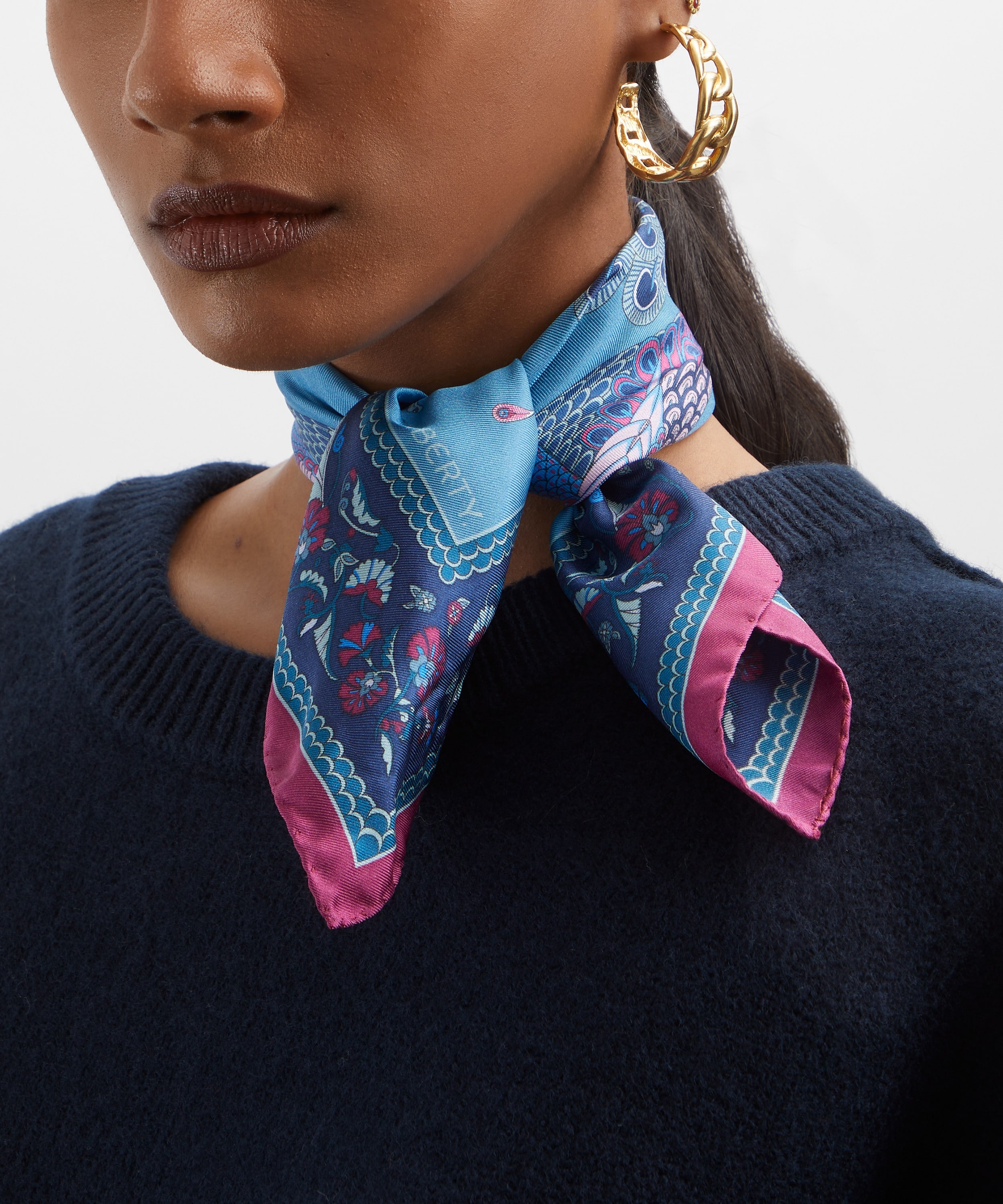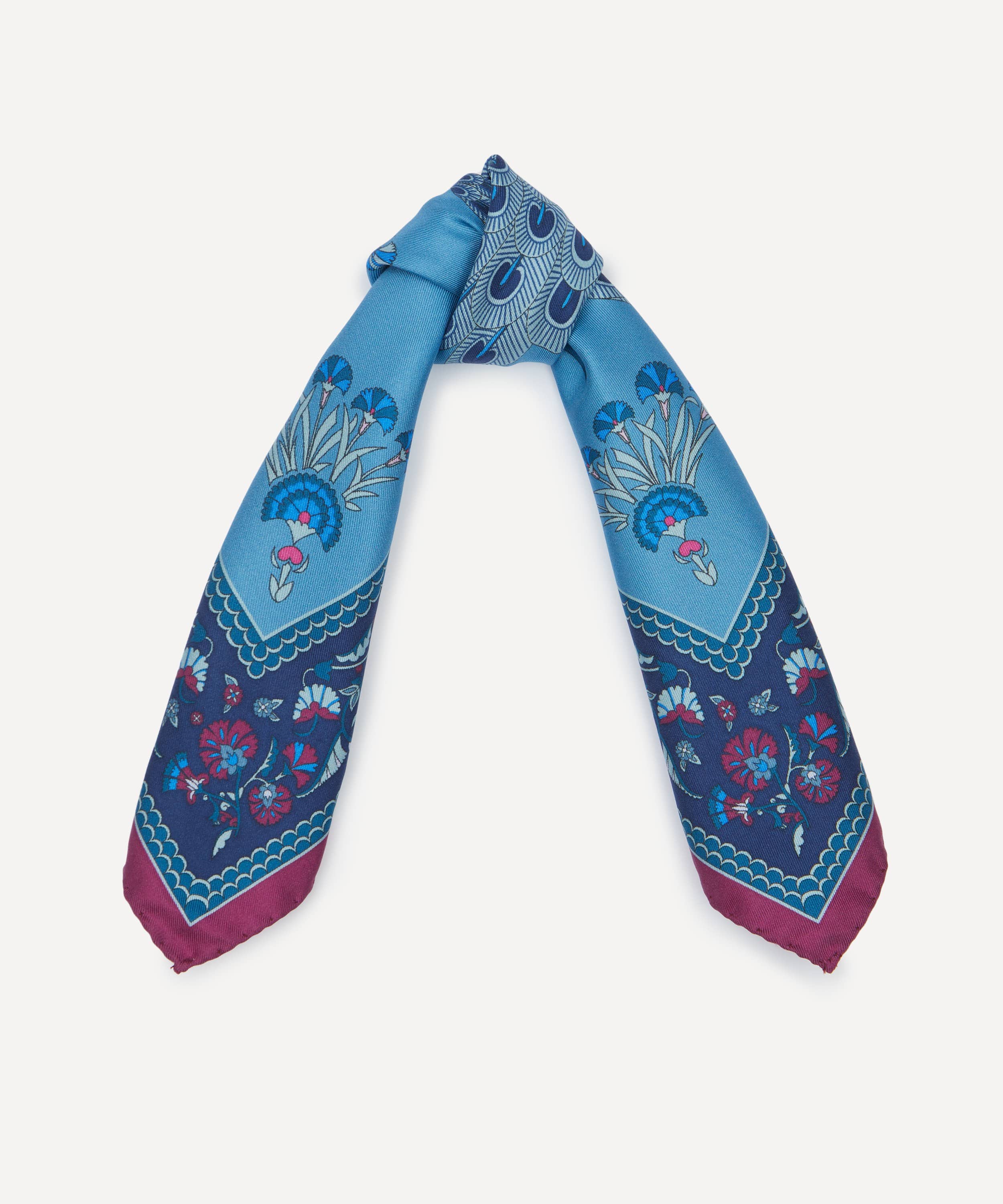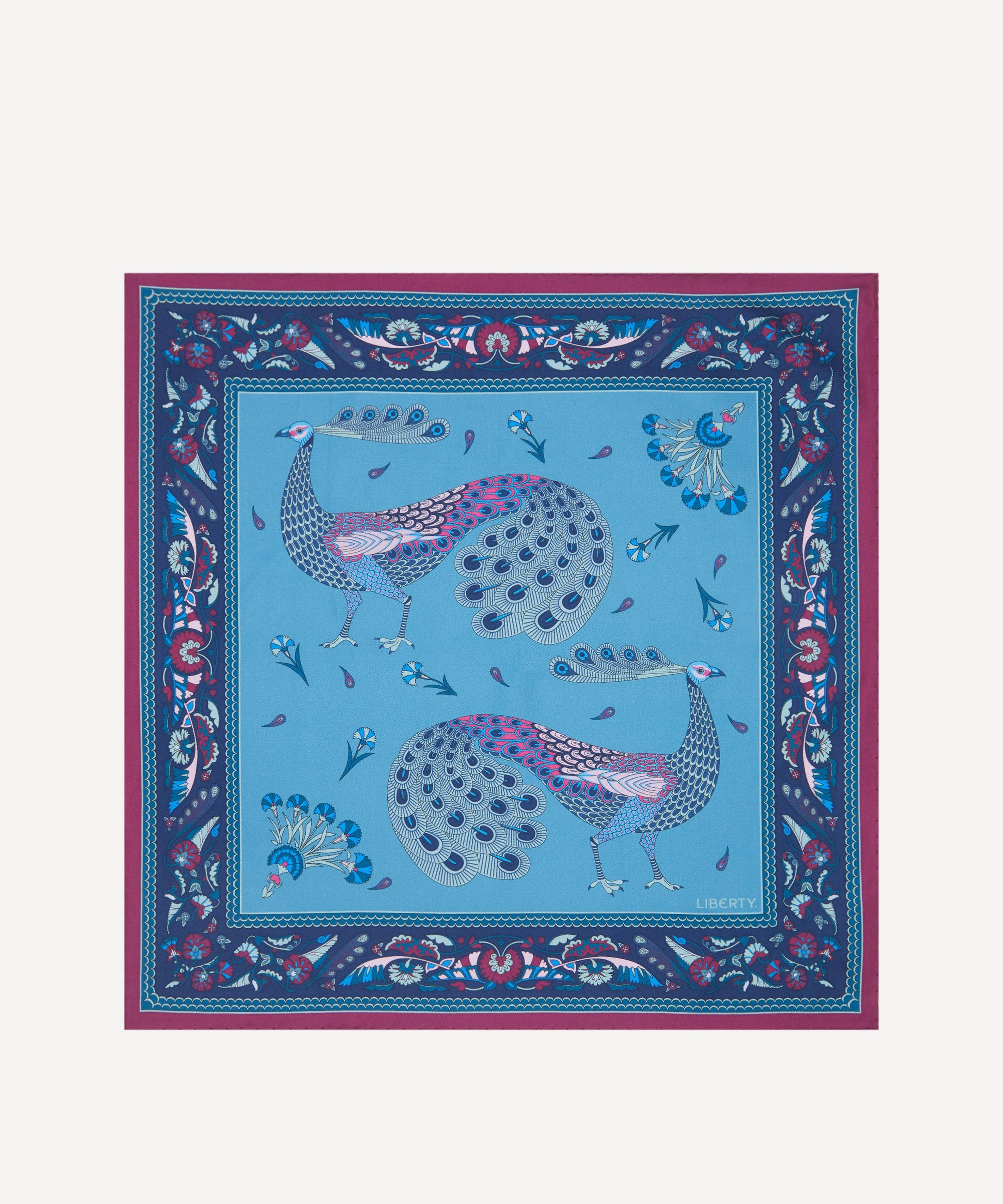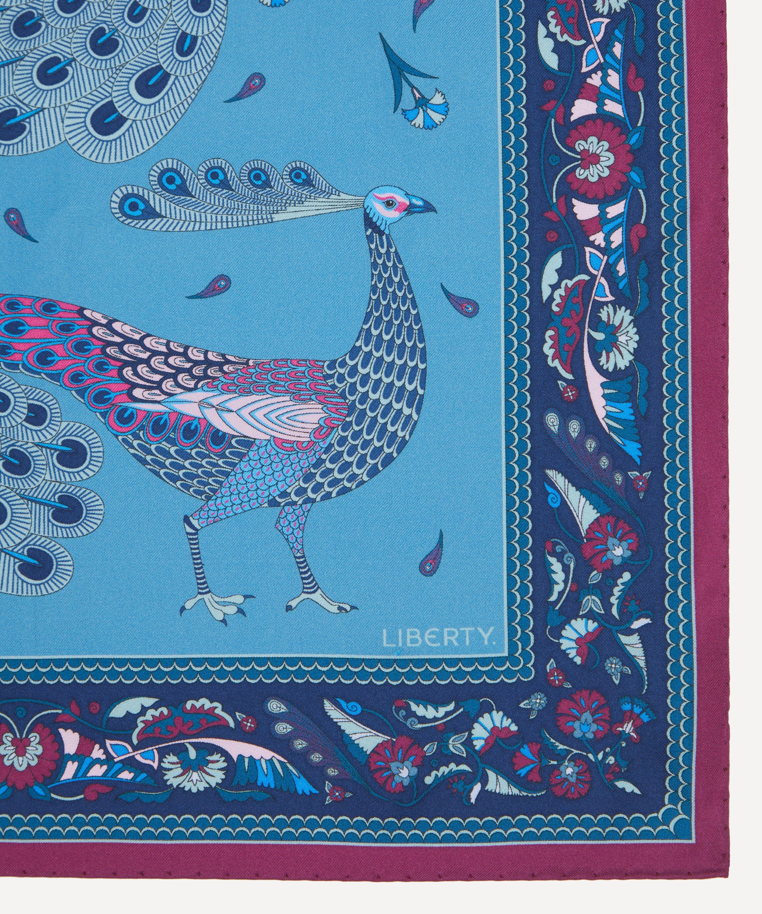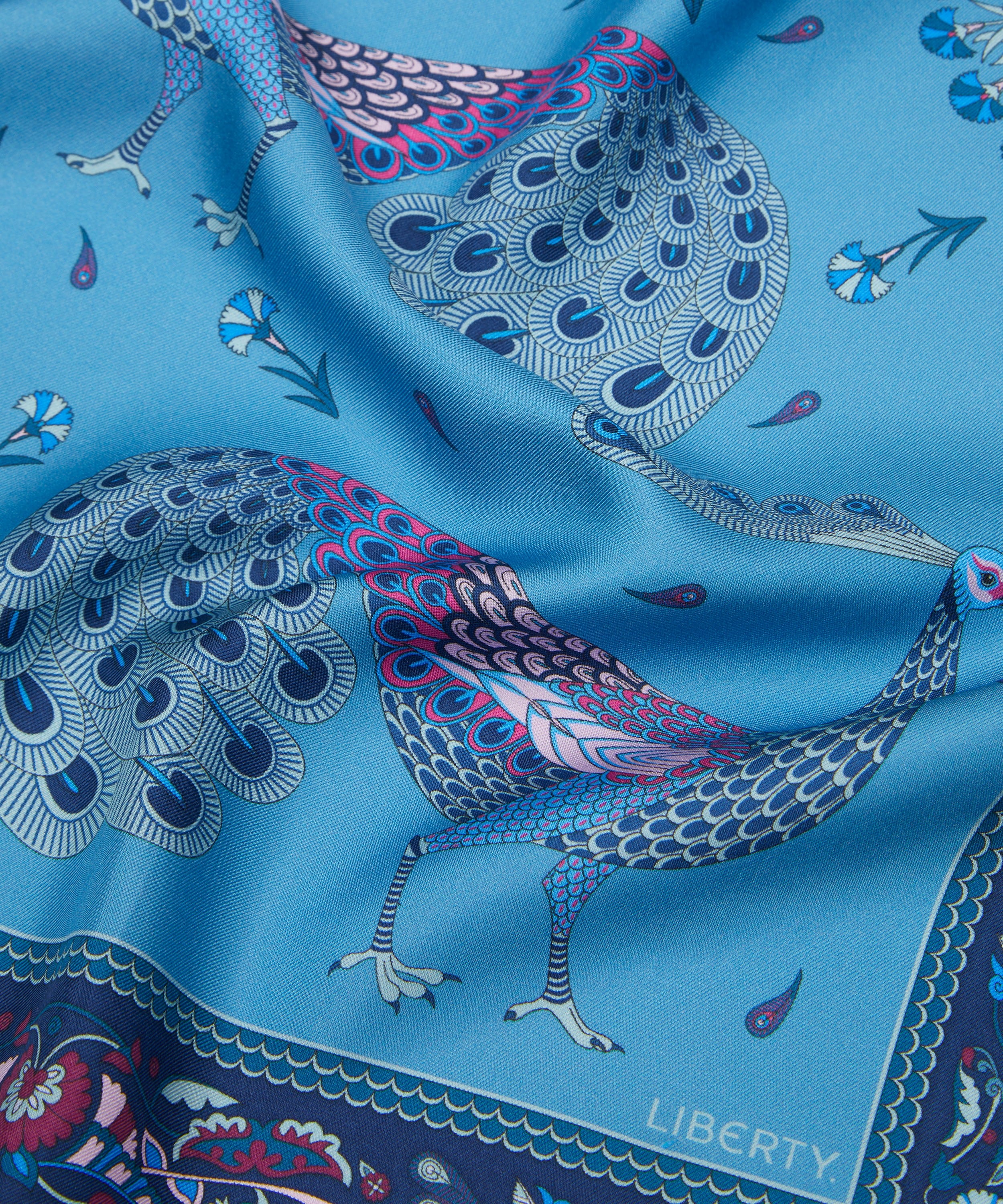イタリアで丁寧に仕立てられた上質でなめらかなシルクに、ウィリアム・ド・モーガンによるタイルモザイクに着想を得た「ピーコック パレード」プリントを表現。コントラストの効いた背景に、精緻に描かれた孔雀が映える、存在感のあるデザインです。