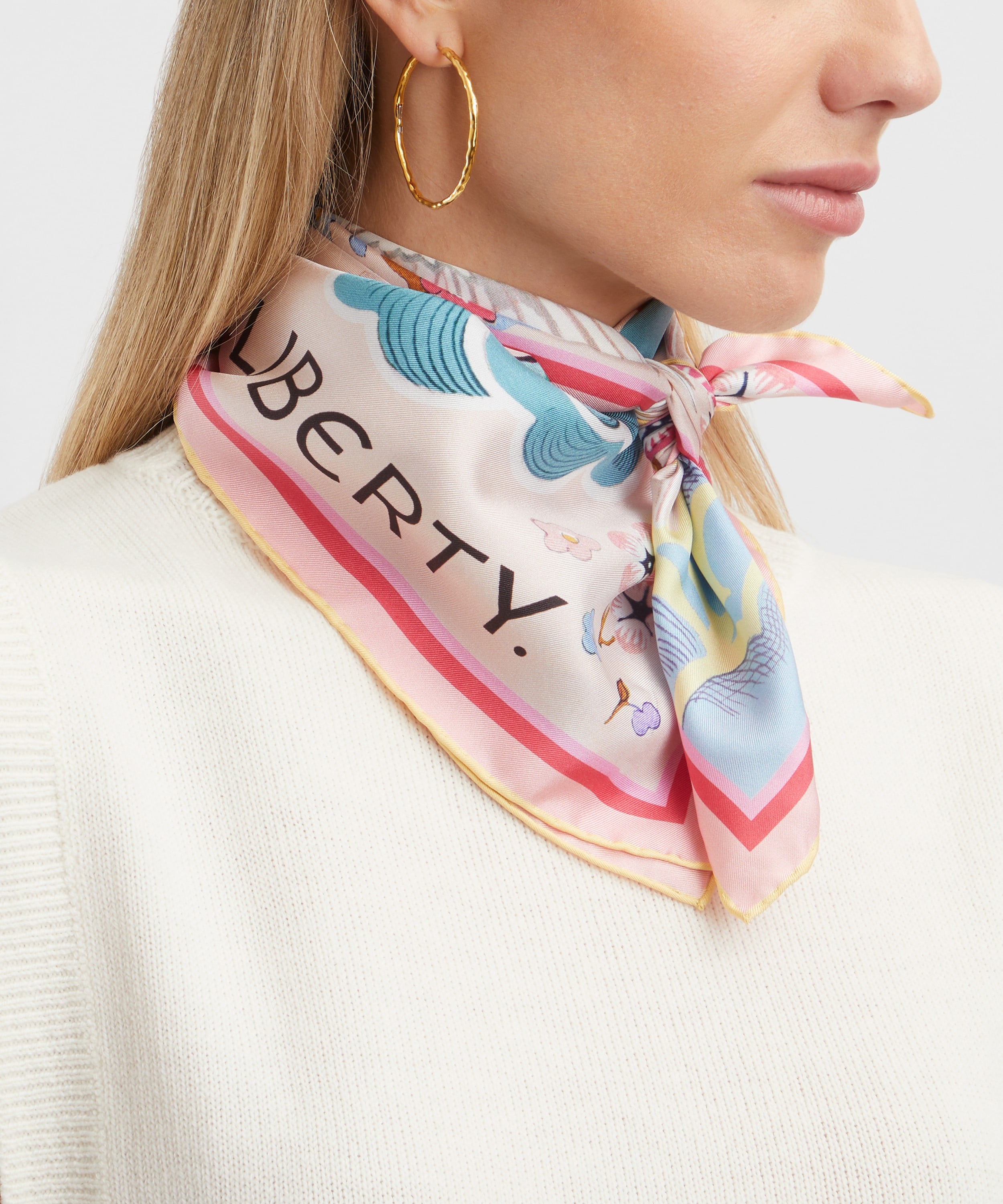 上質でなめらかなシルクツイルに、リバティのデザイナーによるハンドペイントのアートワークをもとにした「ピース ラブ アンド リバティ」プリントを表現。スカーフを“想いを伝える小さなキャンバス”として捉えてきた歴史に着想を得て、愛情や喜び、つながりといったメッセージを込めたデザインに仕上げられています。