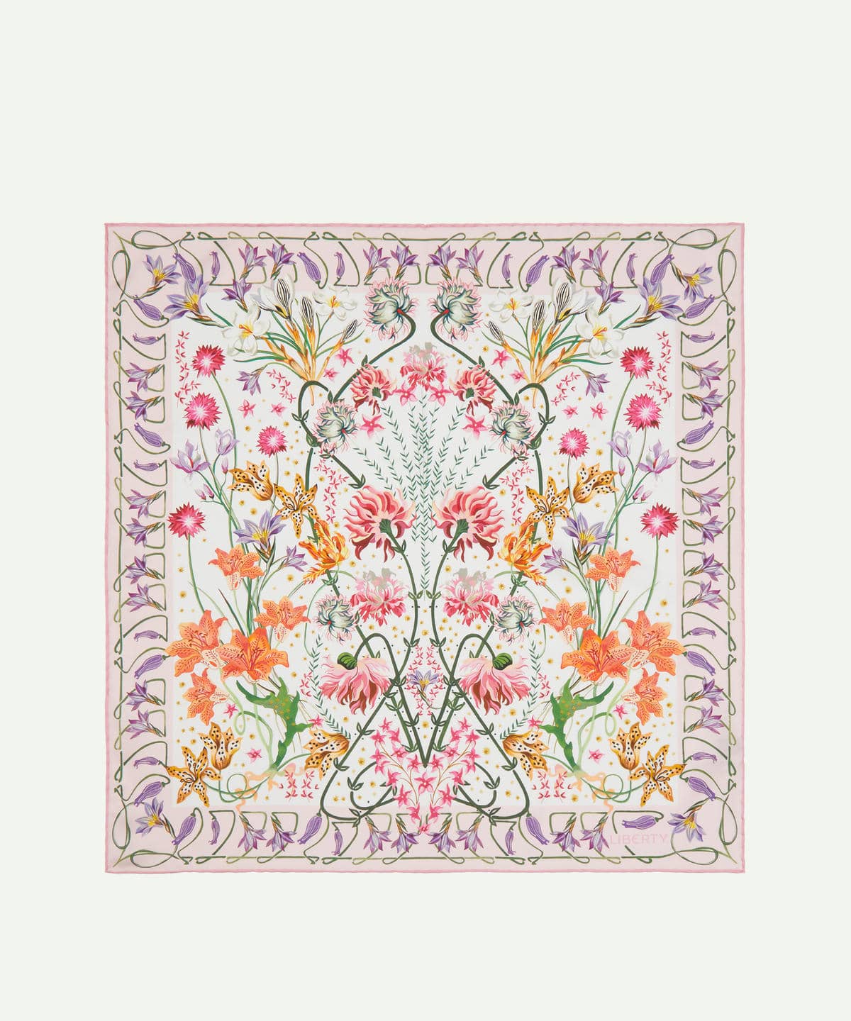 この季節の装いを上品に彩る「アイアンシ ガーデン シルクスカーフ」は、リバティが誇るアート性とクラフツマンシップ、そして受け継がれてきたデザインの伝統を称える一枚です。